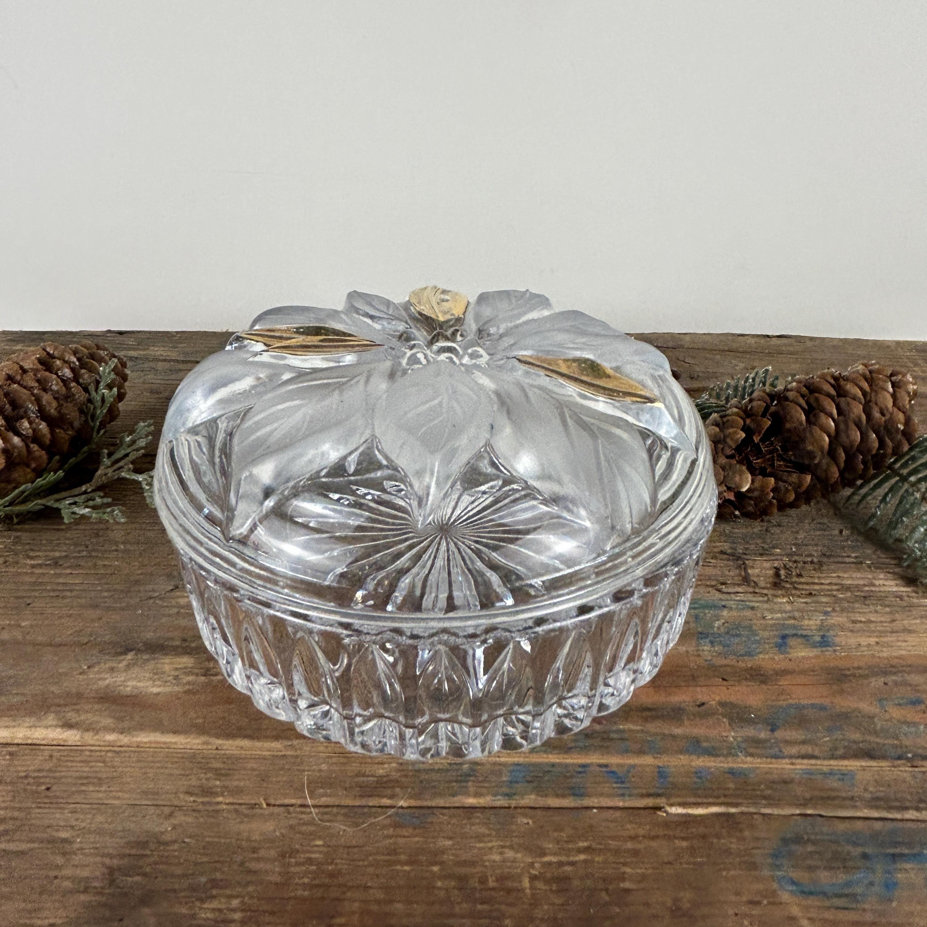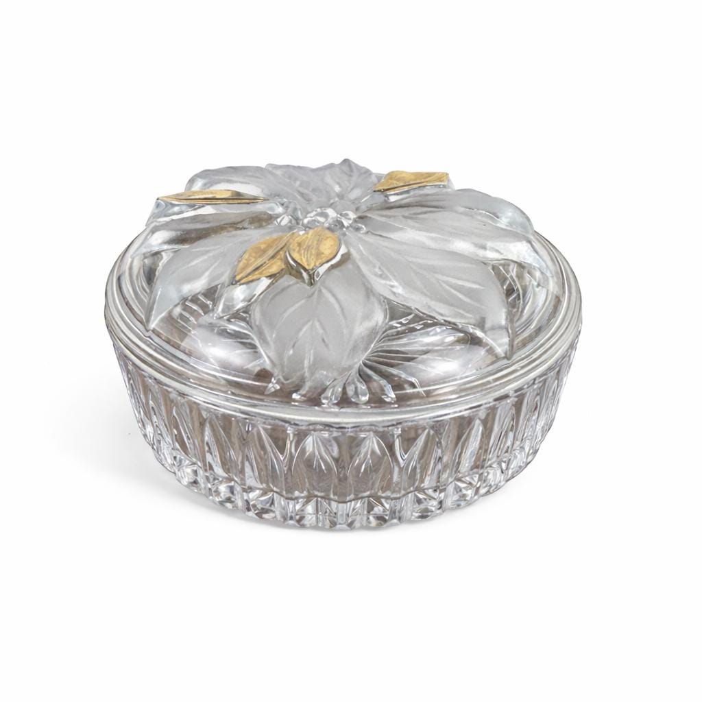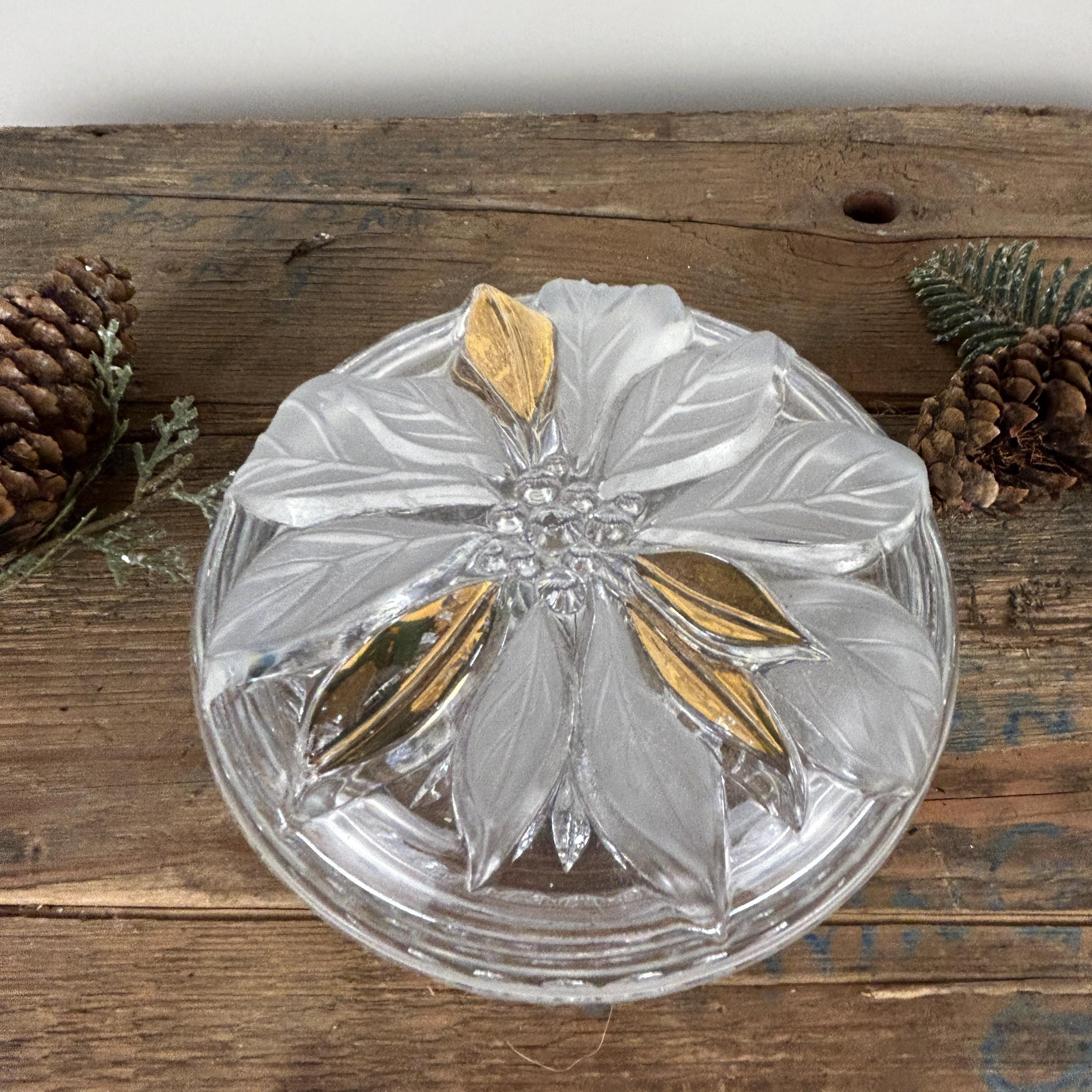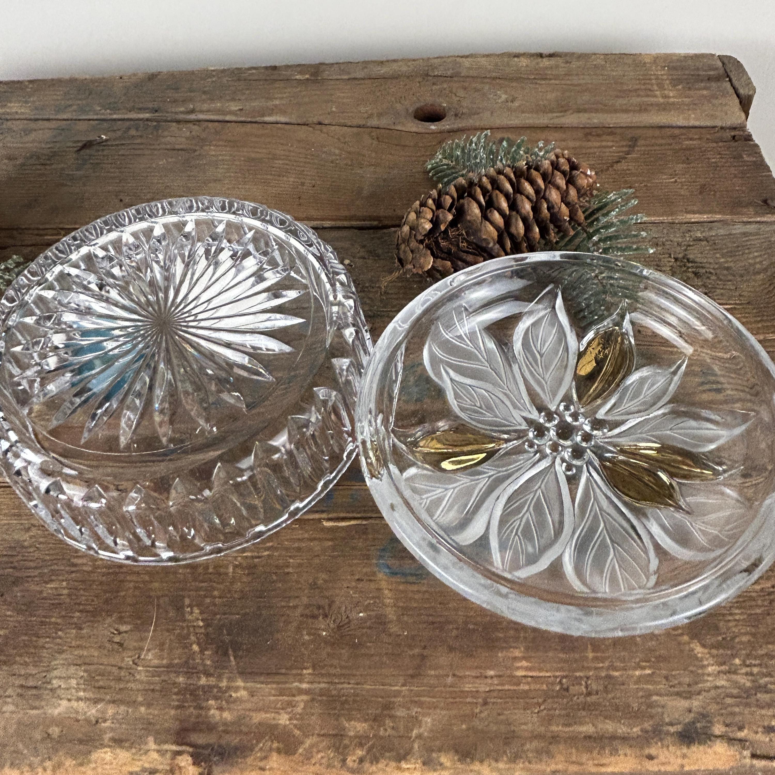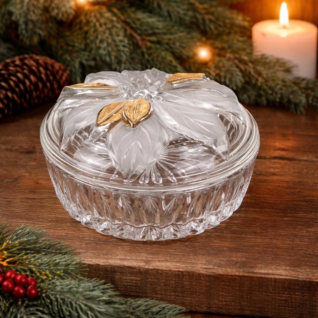 Beautiful lidded trinket box featuring a poinsettia. Flower has some frosted petals and some gold. It is in excellent condition with no chips or cracks. Some of the gold shows a little wear. Beautiful cut starburst pattern on the bottom. Please review all the pictures closely as part of the description. Beautiful dish to display Christmas candy!