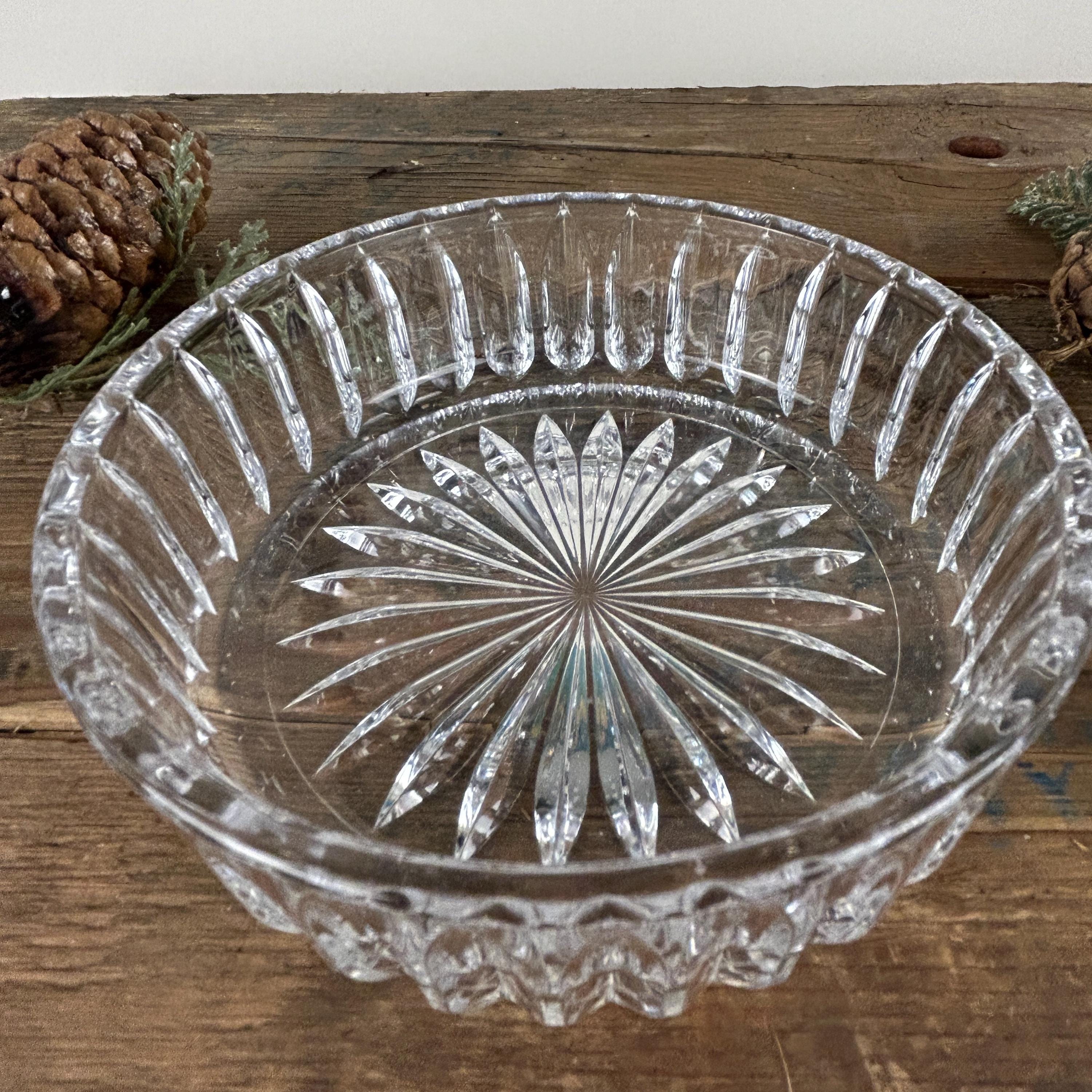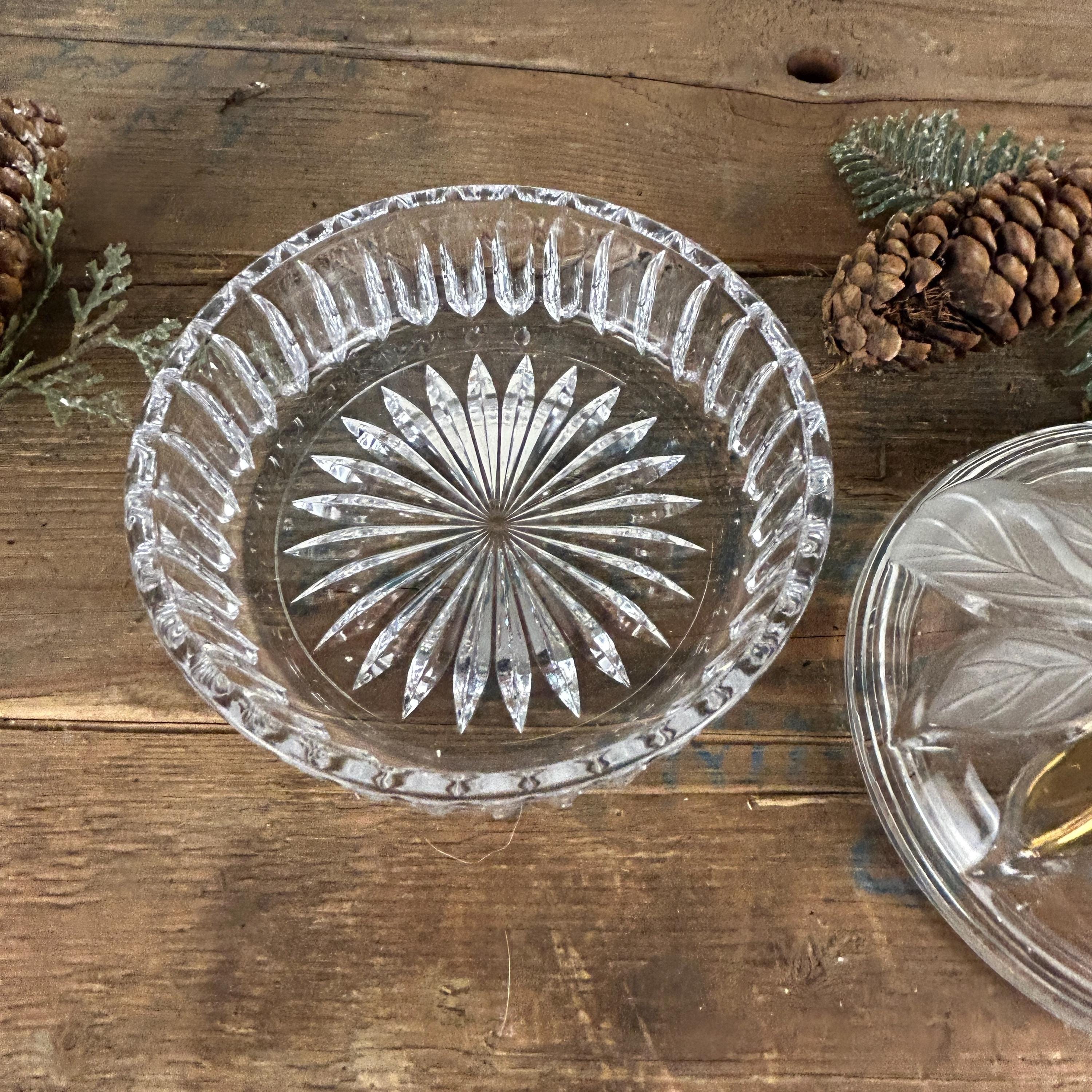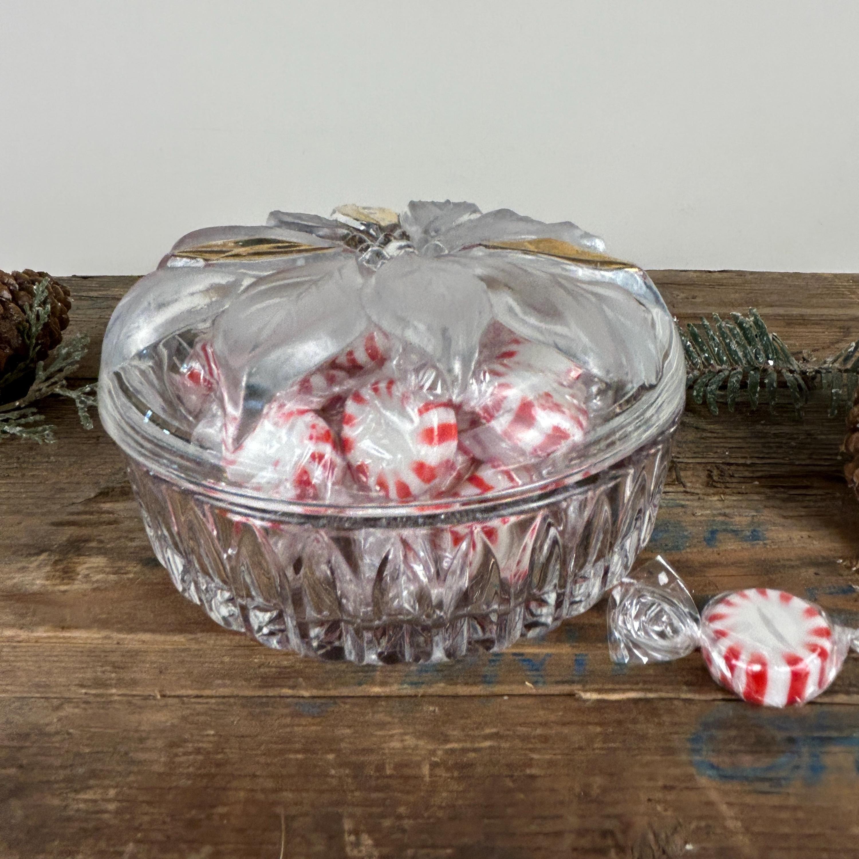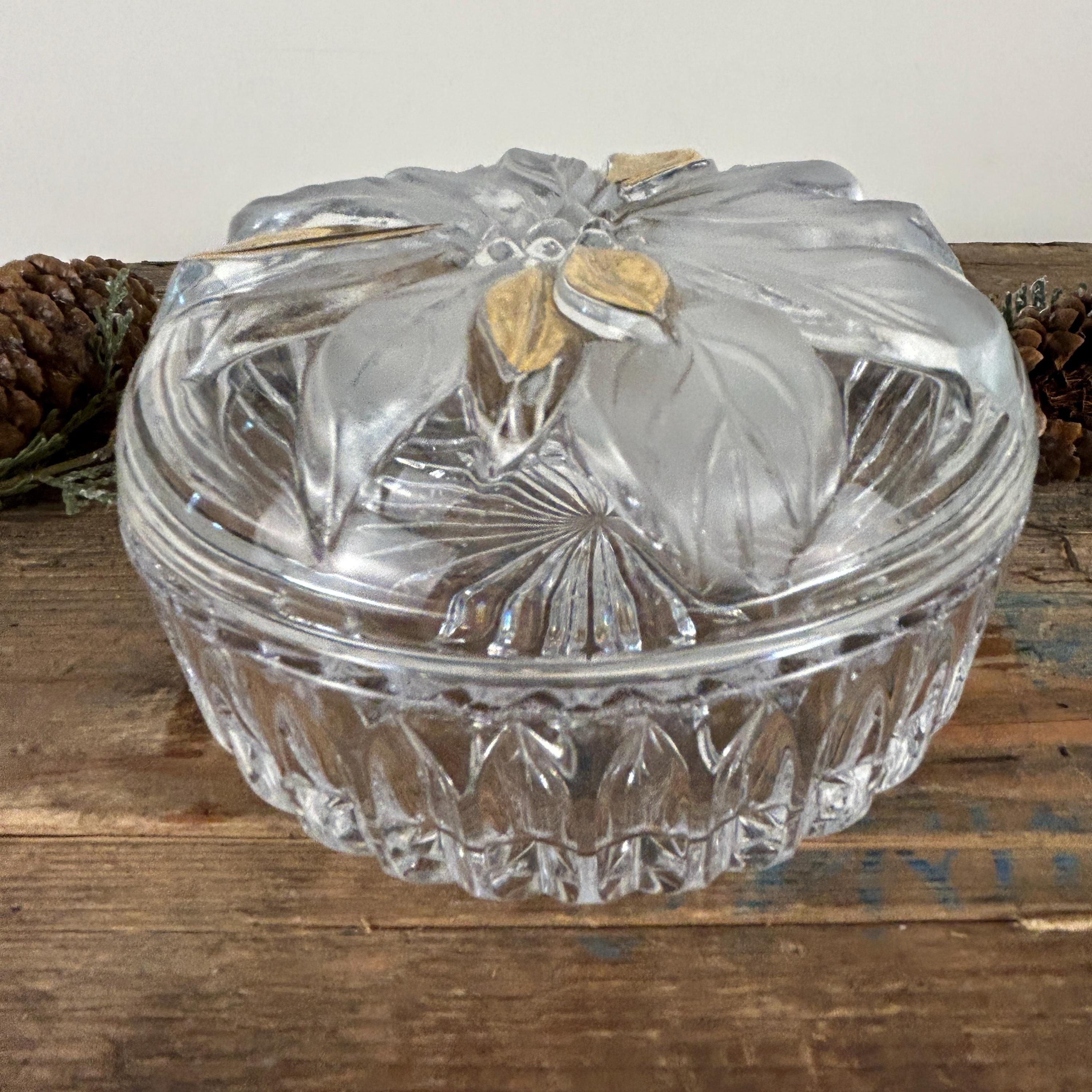 Beautiful lidded trinket box featuring a poinsettia. Flower has some frosted petals and some gold. It is in excellent condition with no chips or cracks. Some of the gold shows a little wear. Beautiful cut starburst pattern on the bottom. Please review all the pictures closely as part of the description. Beautiful dish to display Christmas candy!