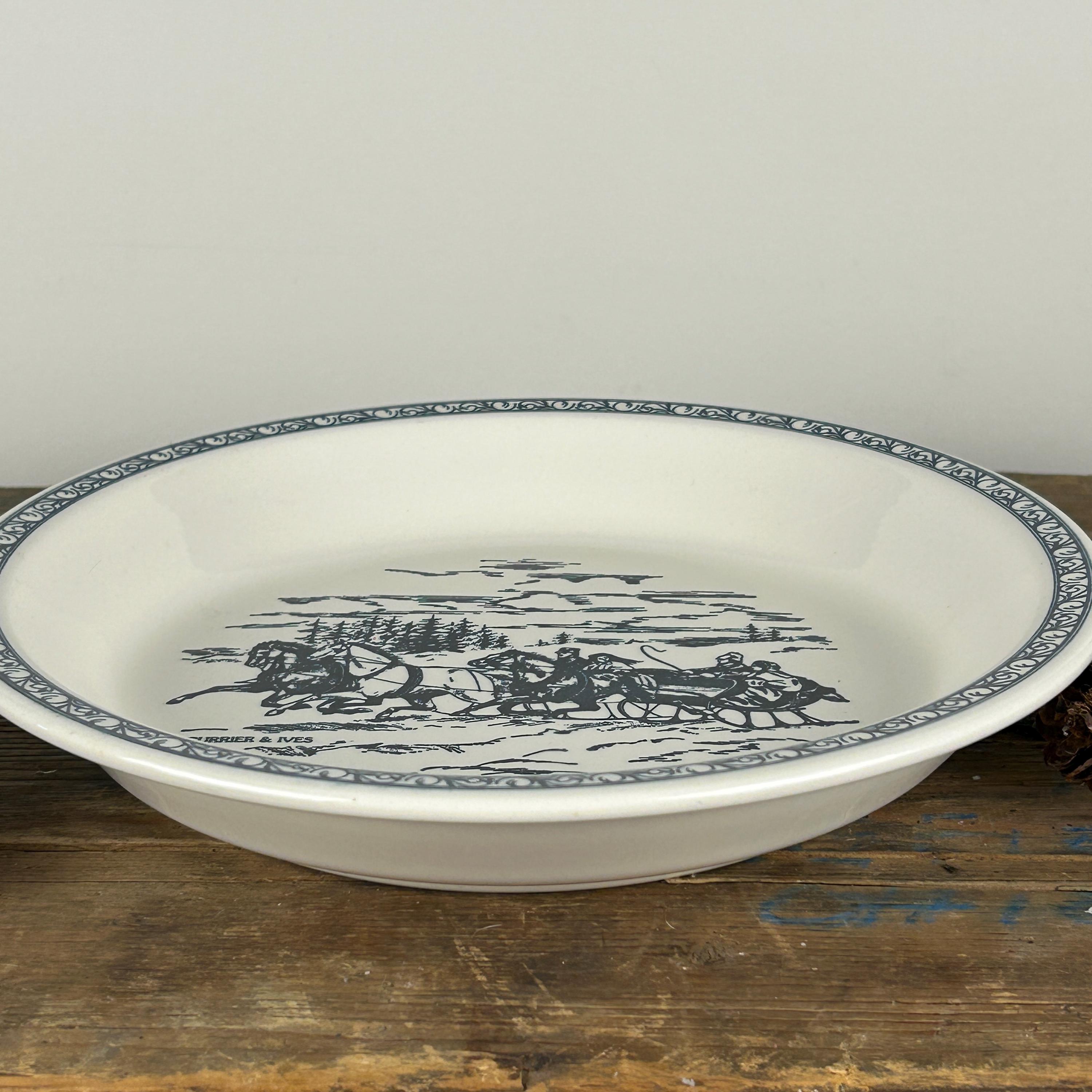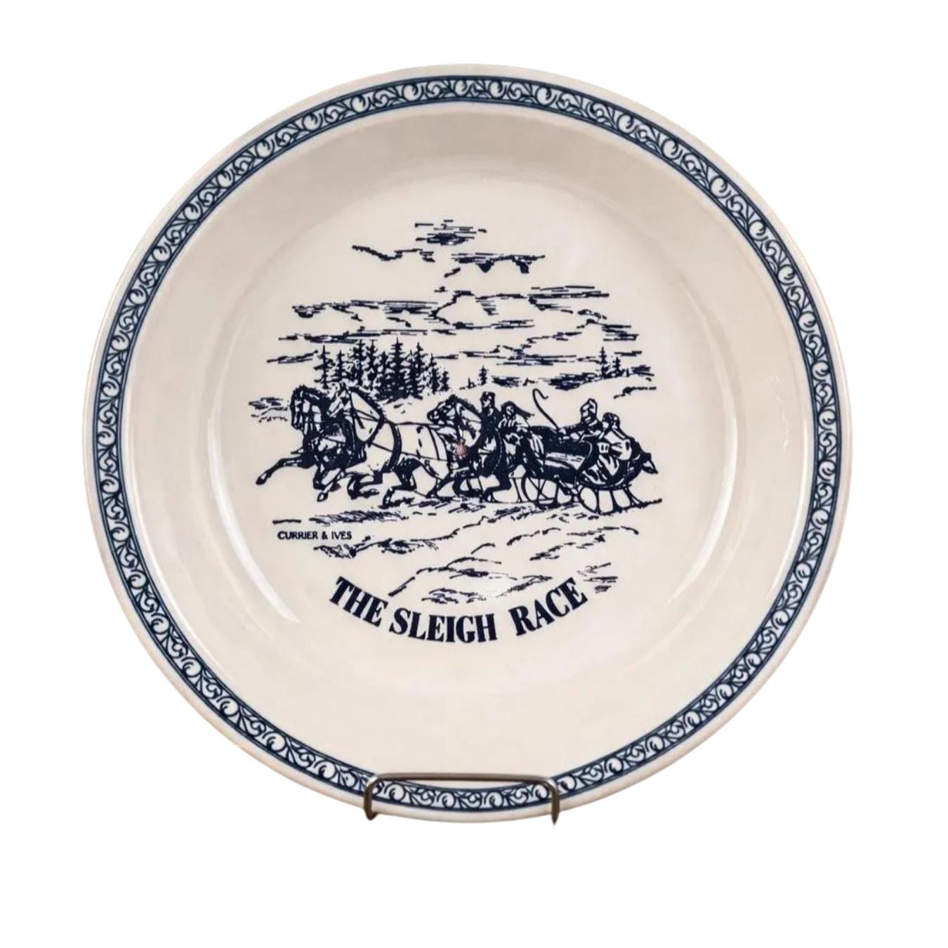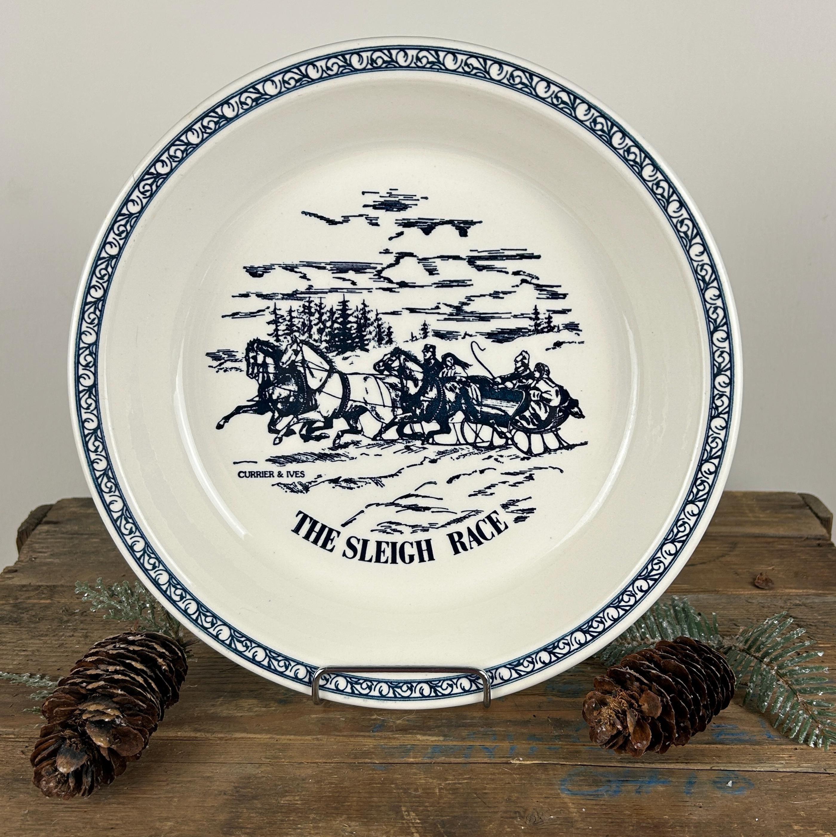Vintage Currier & Ives Blue Transferware 'The Sleigh Race' Pie Plate. This Beautiful Round Pie Plate /Dish measures 10" in diameter. It has a gorgeous blue and white Pattern around the outside edge of the dish along with The Sleigh Race / Winter Scene in the center. Has makers mark on the back. Excellent condition with No chips, cracks or Breaks ! It would be a perfect piece to add to your collection and would make a great gift as well!
