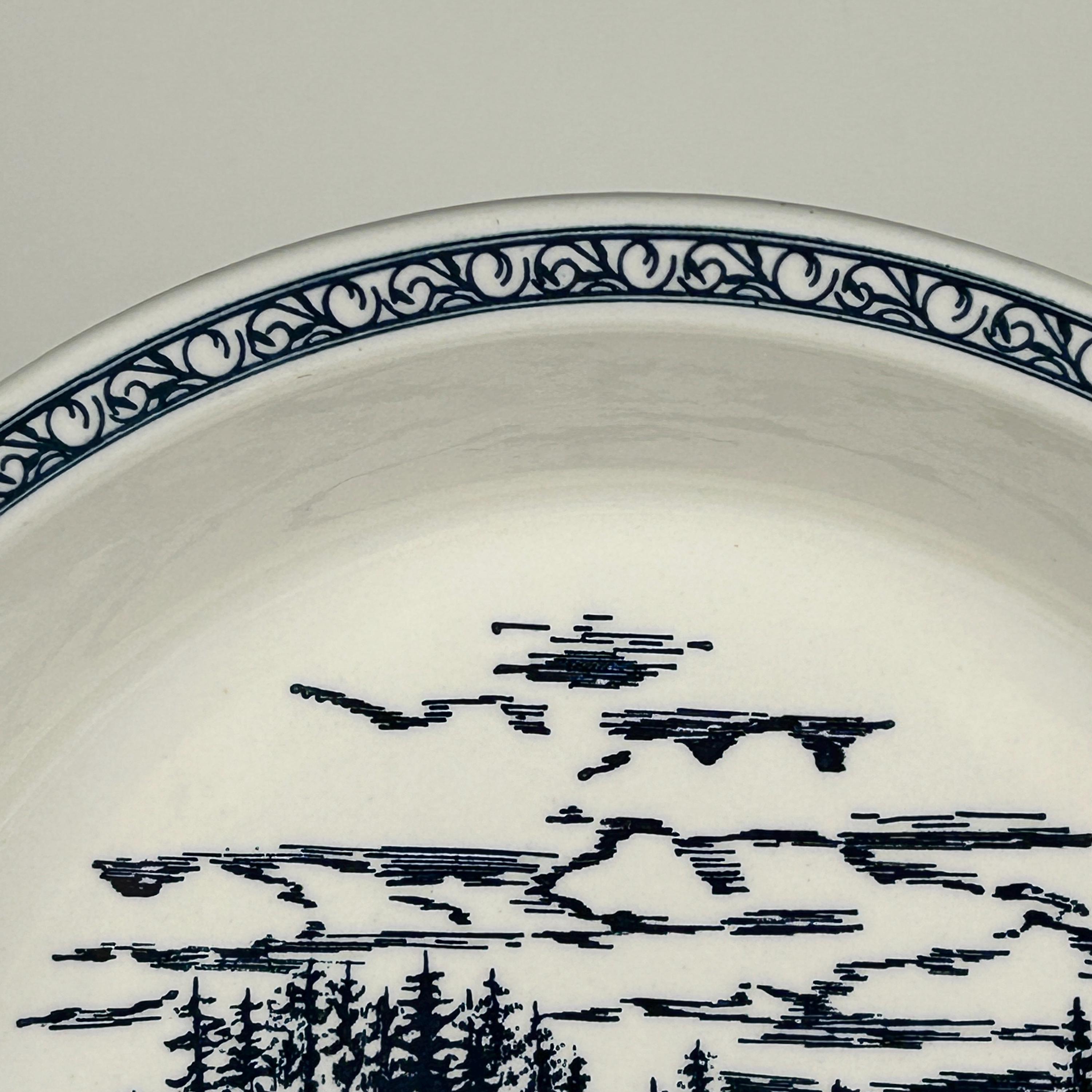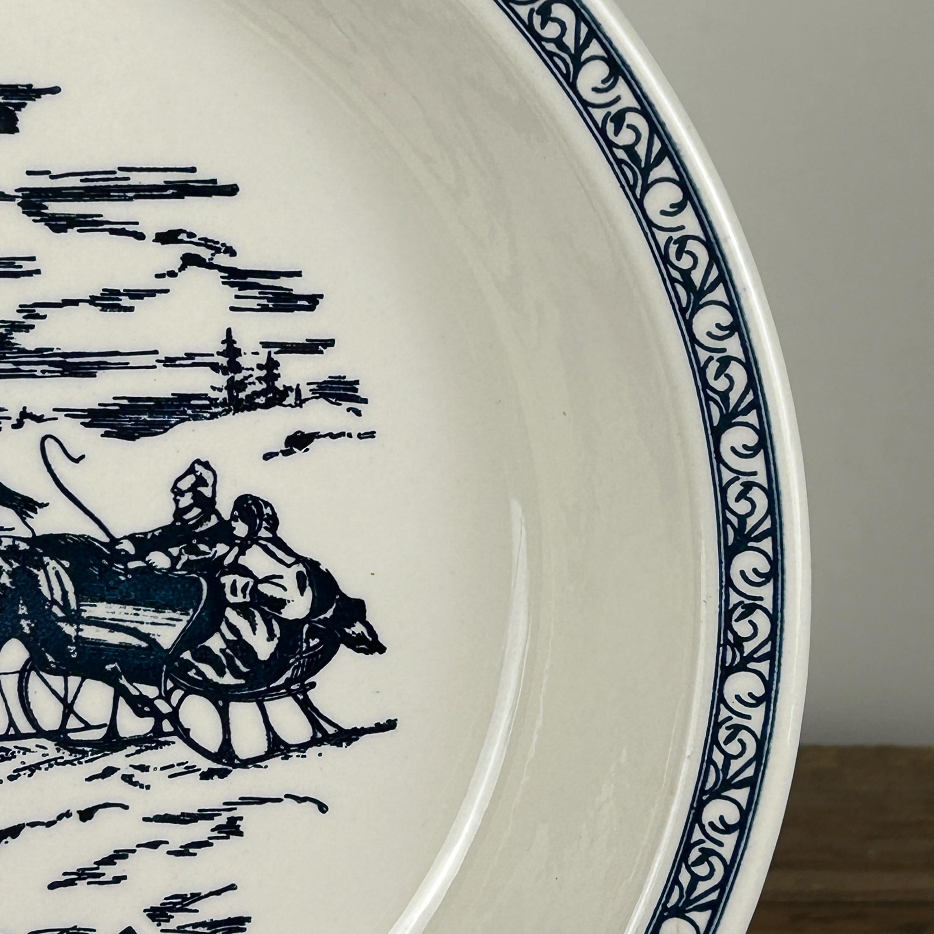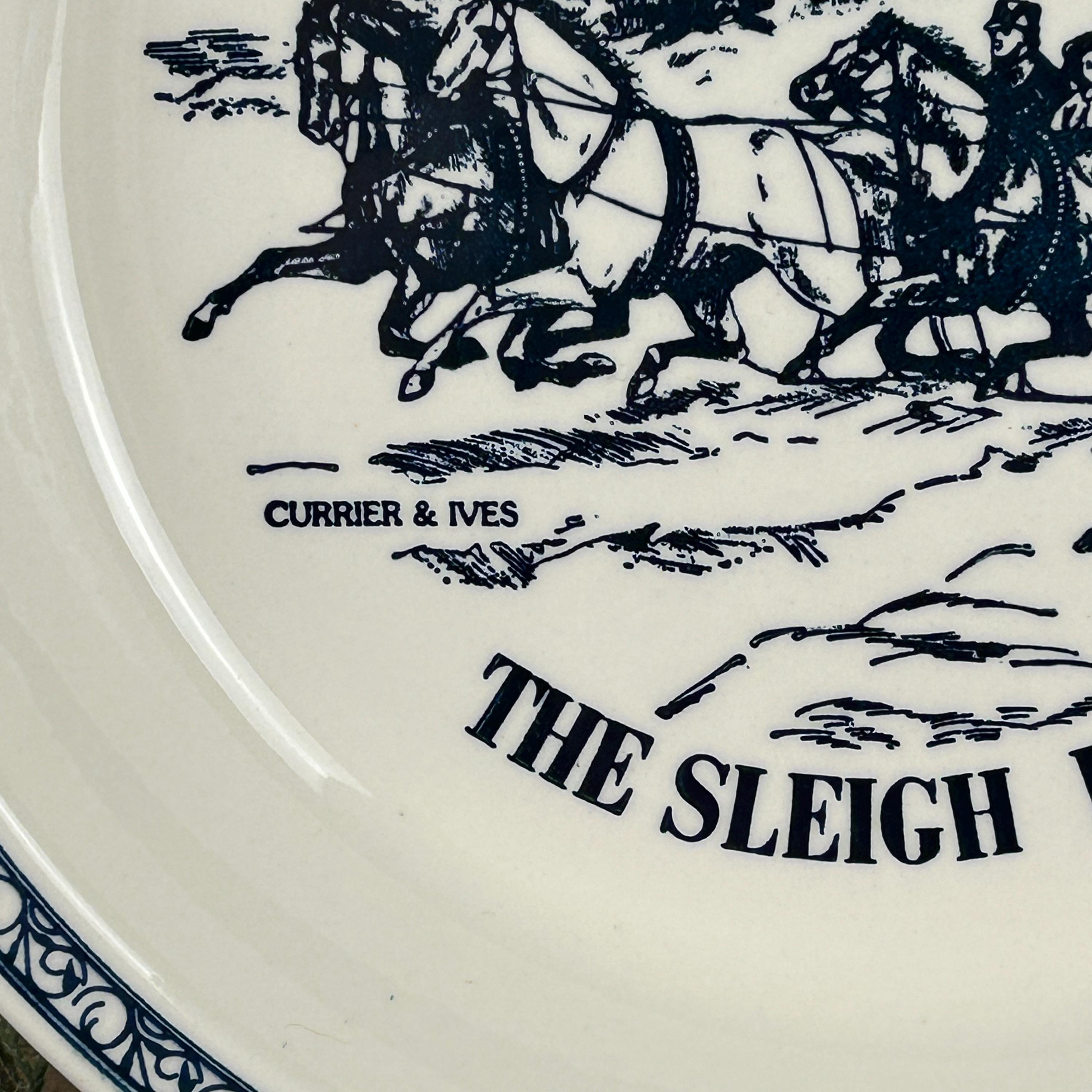 Vintage Currier & Ives Blue Transferware 'The Sleigh Race' Pie Plate. This Beautiful Round Pie Plate /Dish measures 10" in diameter. It has a gorgeous blue and white Pattern around the outside edge of the dish along with The Sleigh Race / Winter Scene in the center. Has makers mark on the back. Excellent condition with No chips, cracks or Breaks ! It would be a perfect piece to add to your collection and would make a great gift as well!