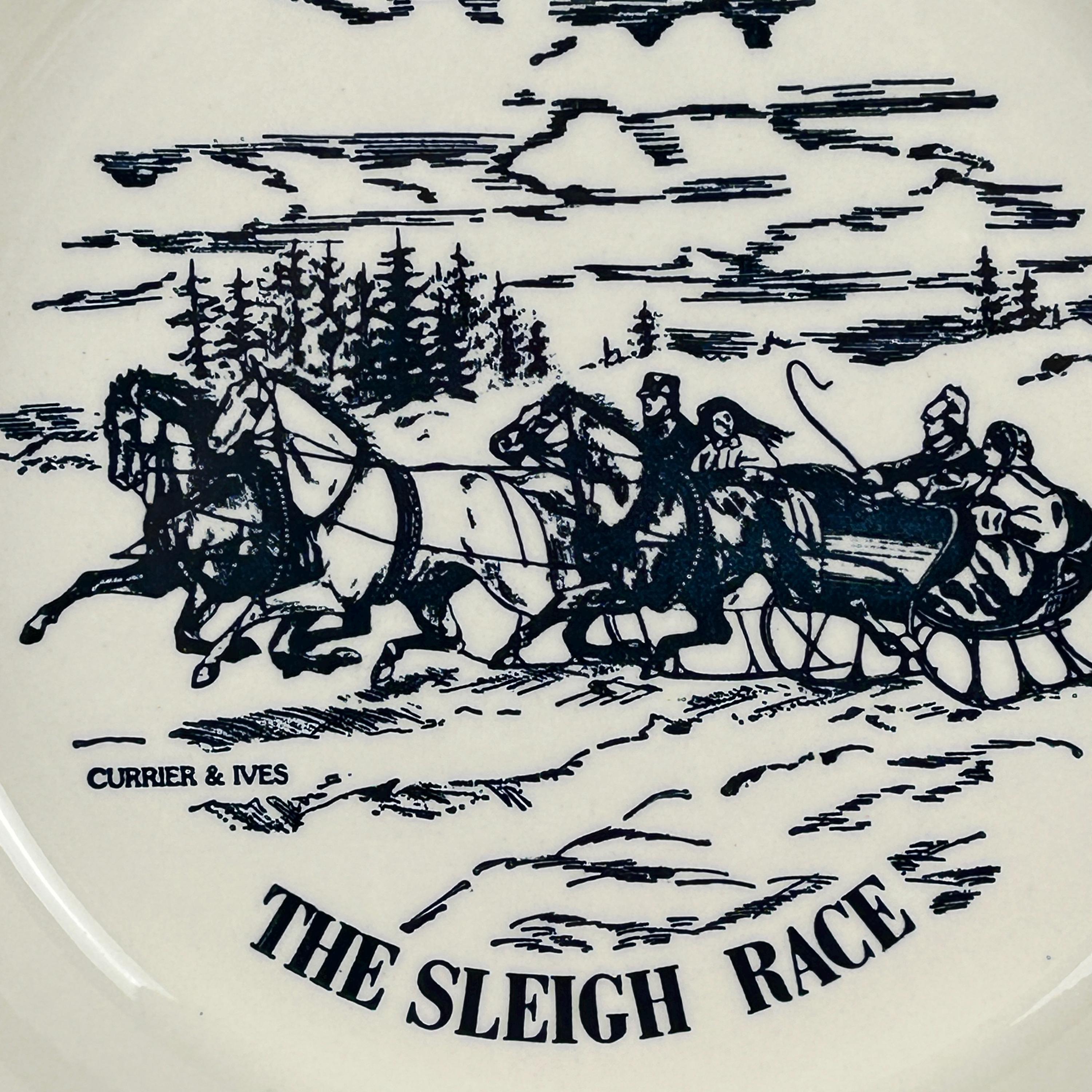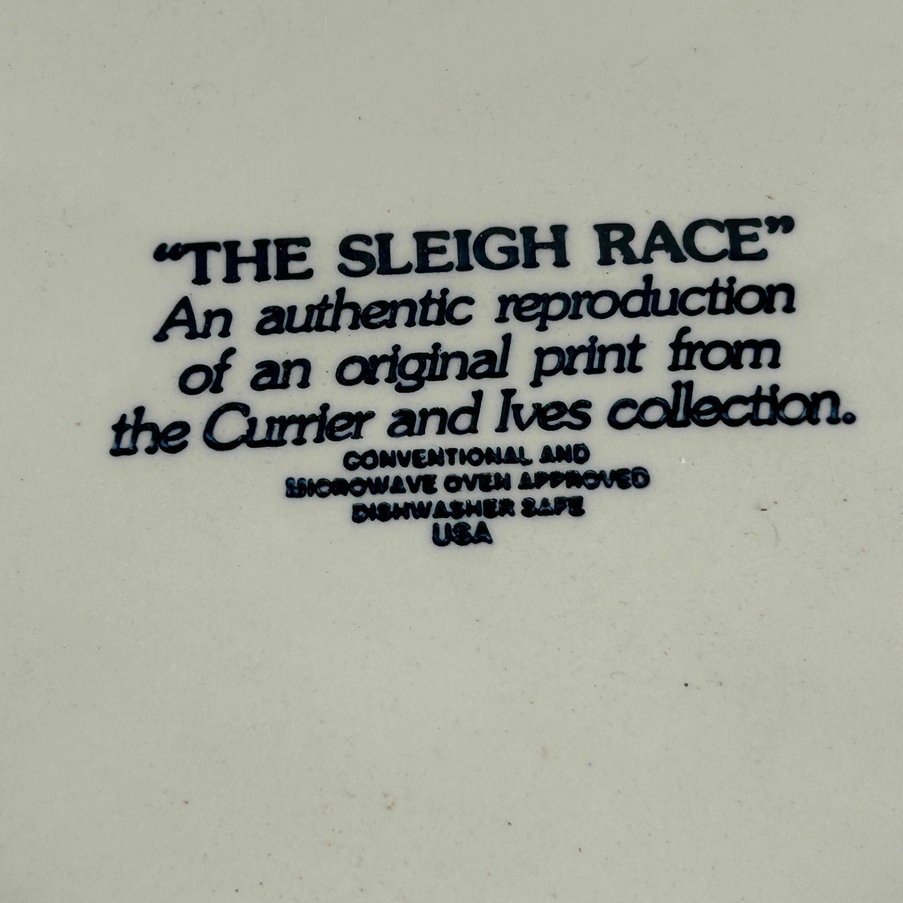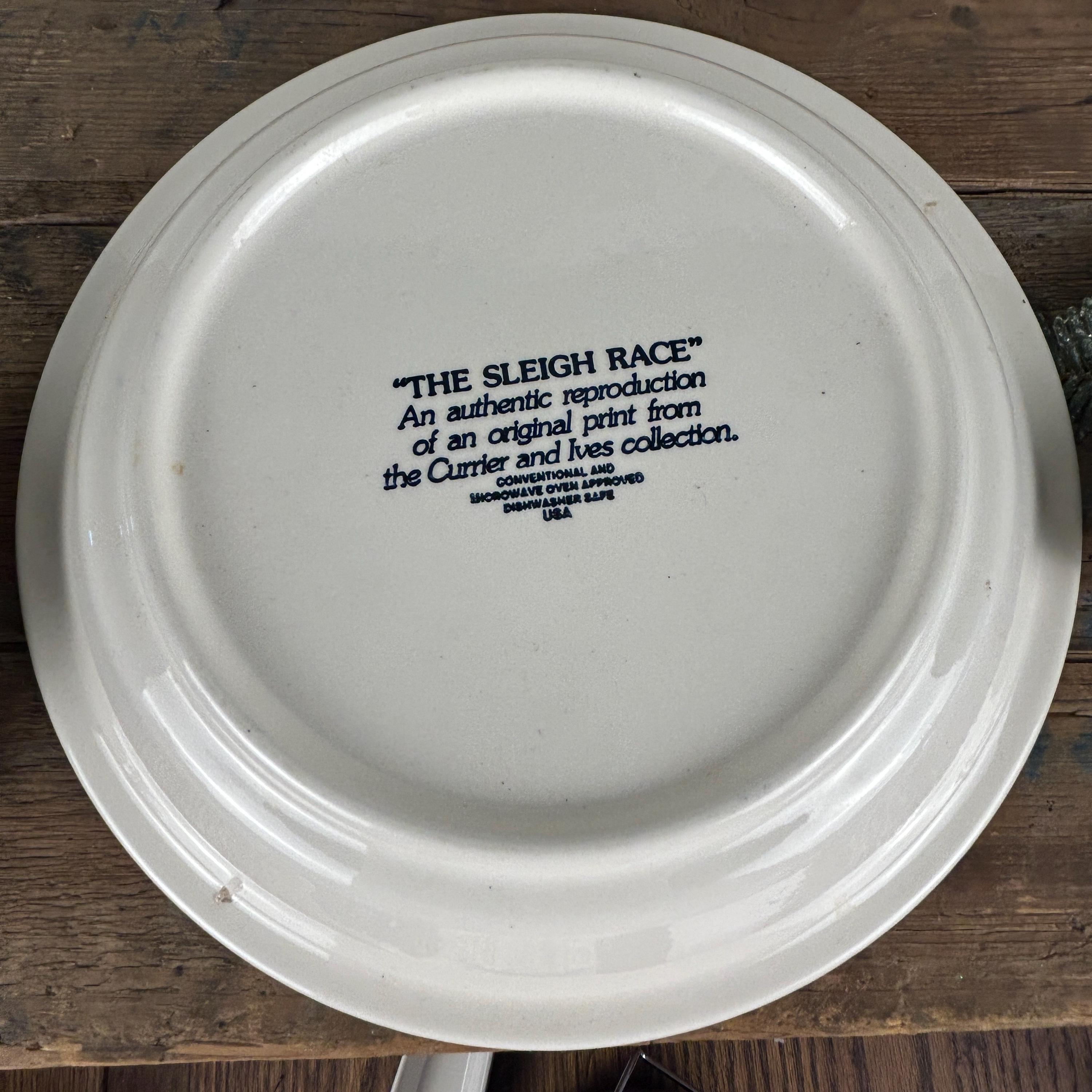 This is a vintage Royal China pie plate featuring the Currier & Ives "The Sleigh Race" lithograph.