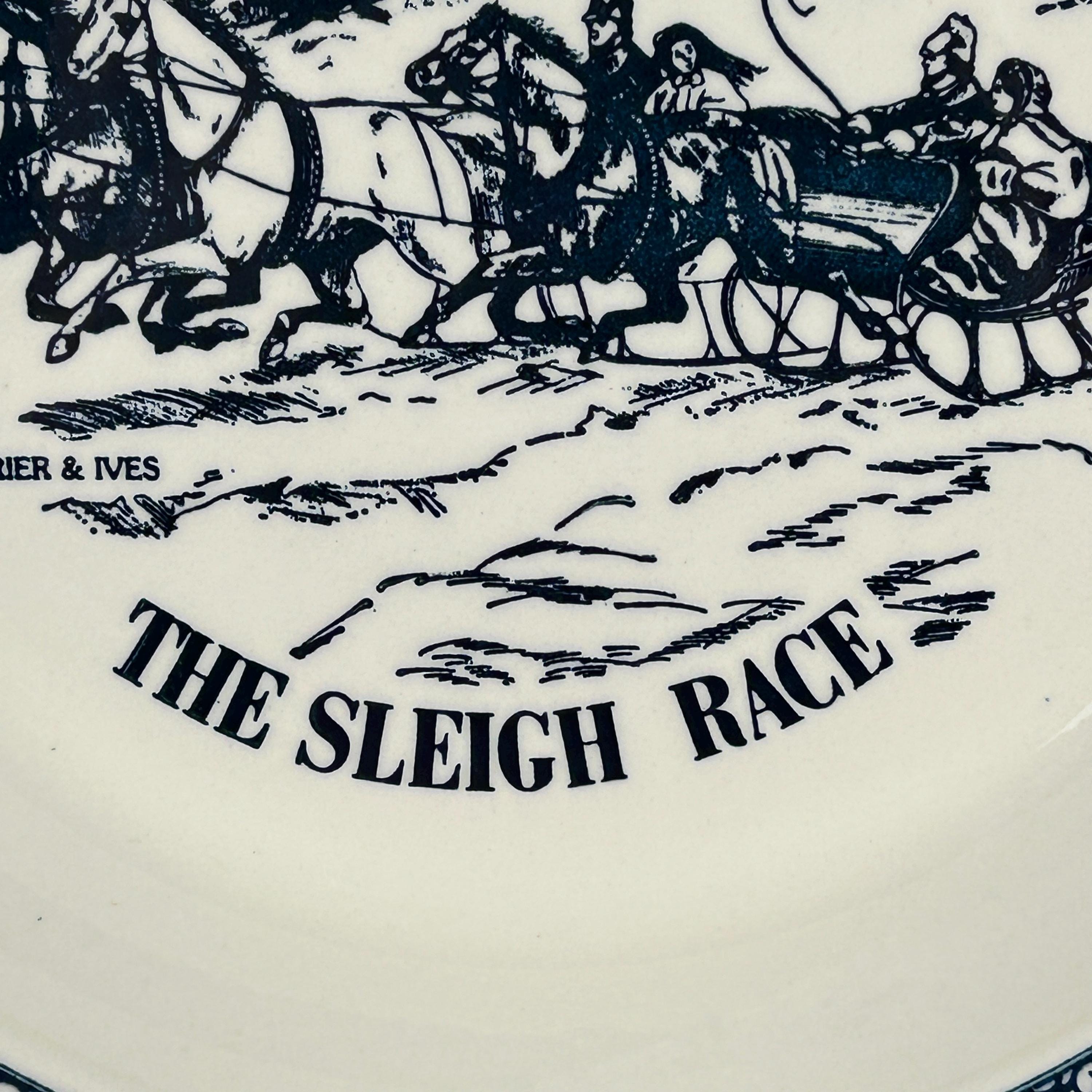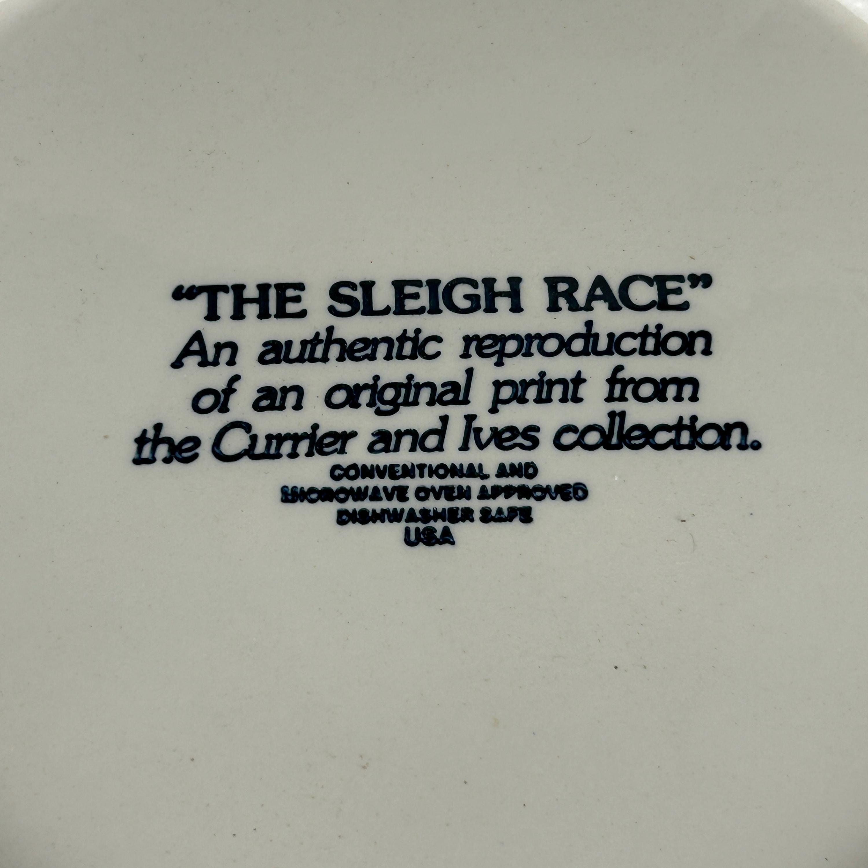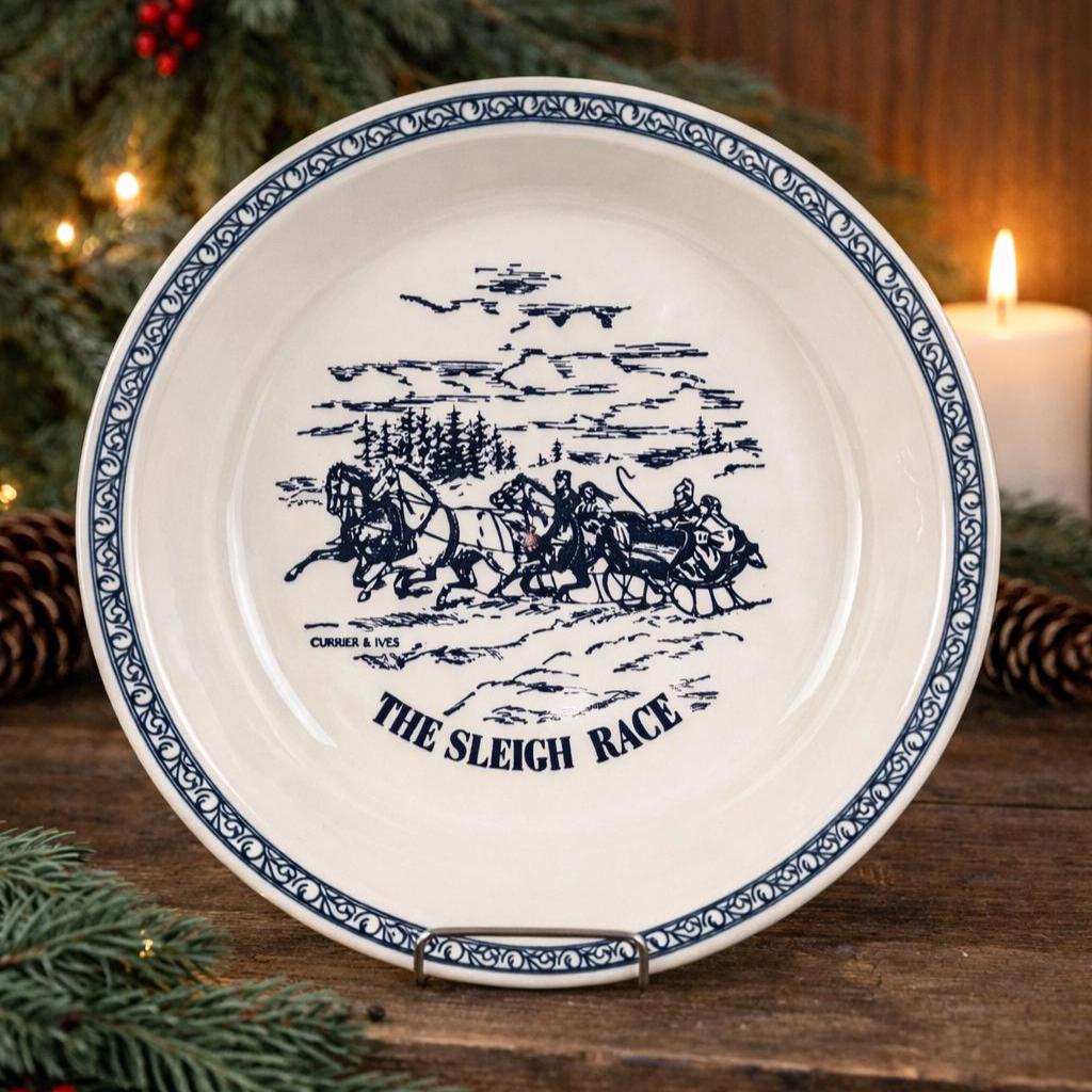 This is a vintage Royal China pie plate featuring the Currier & Ives "The Sleigh Race" lithograph.