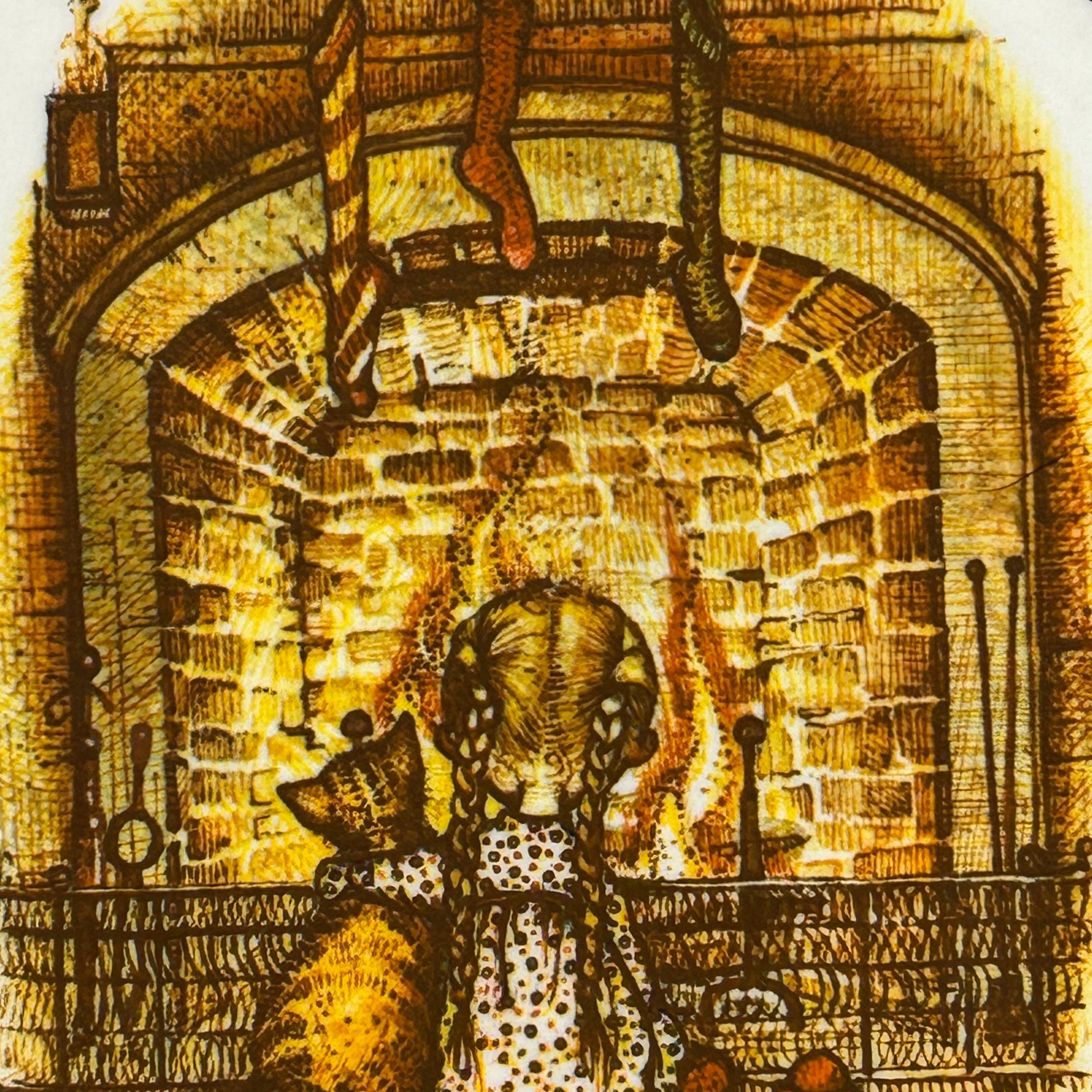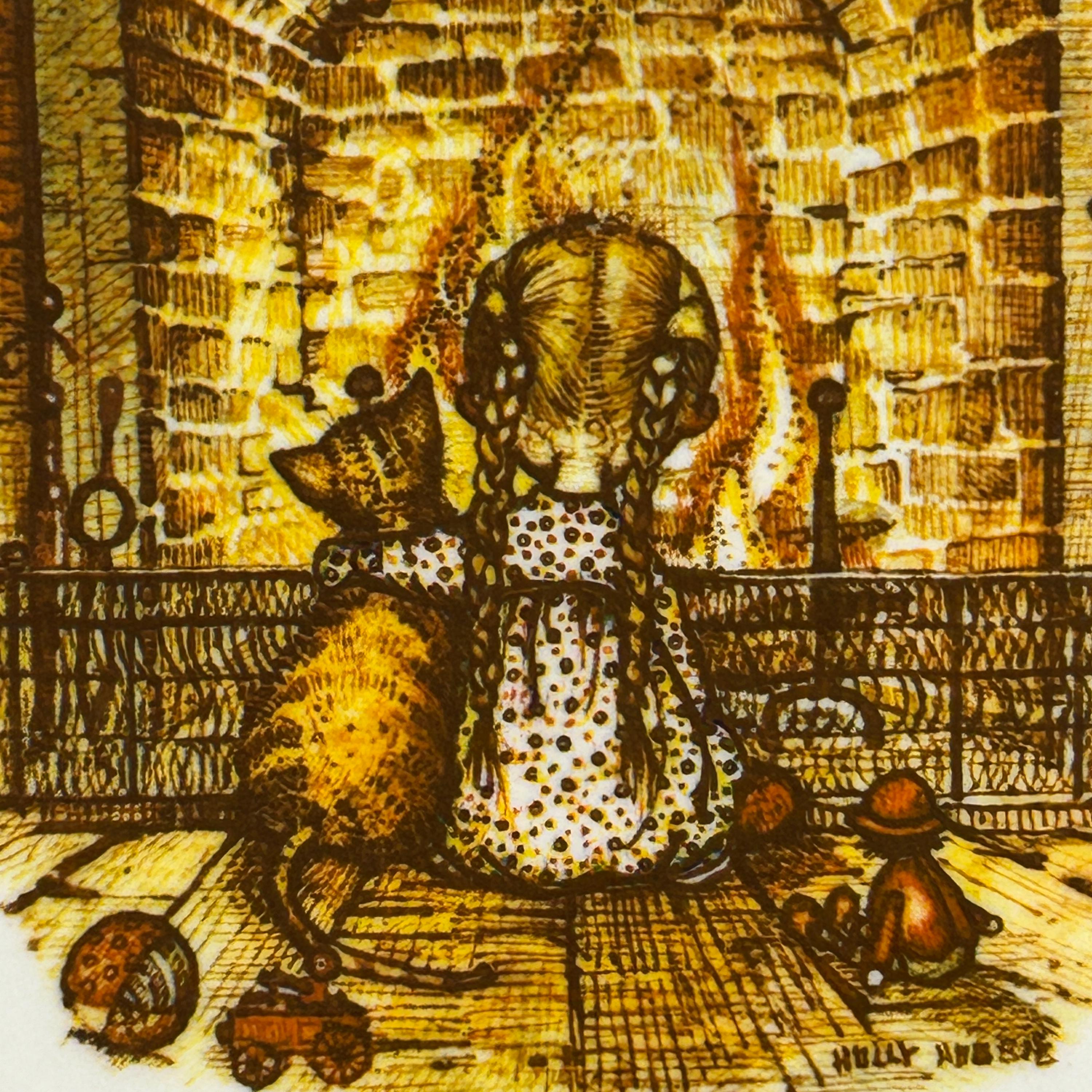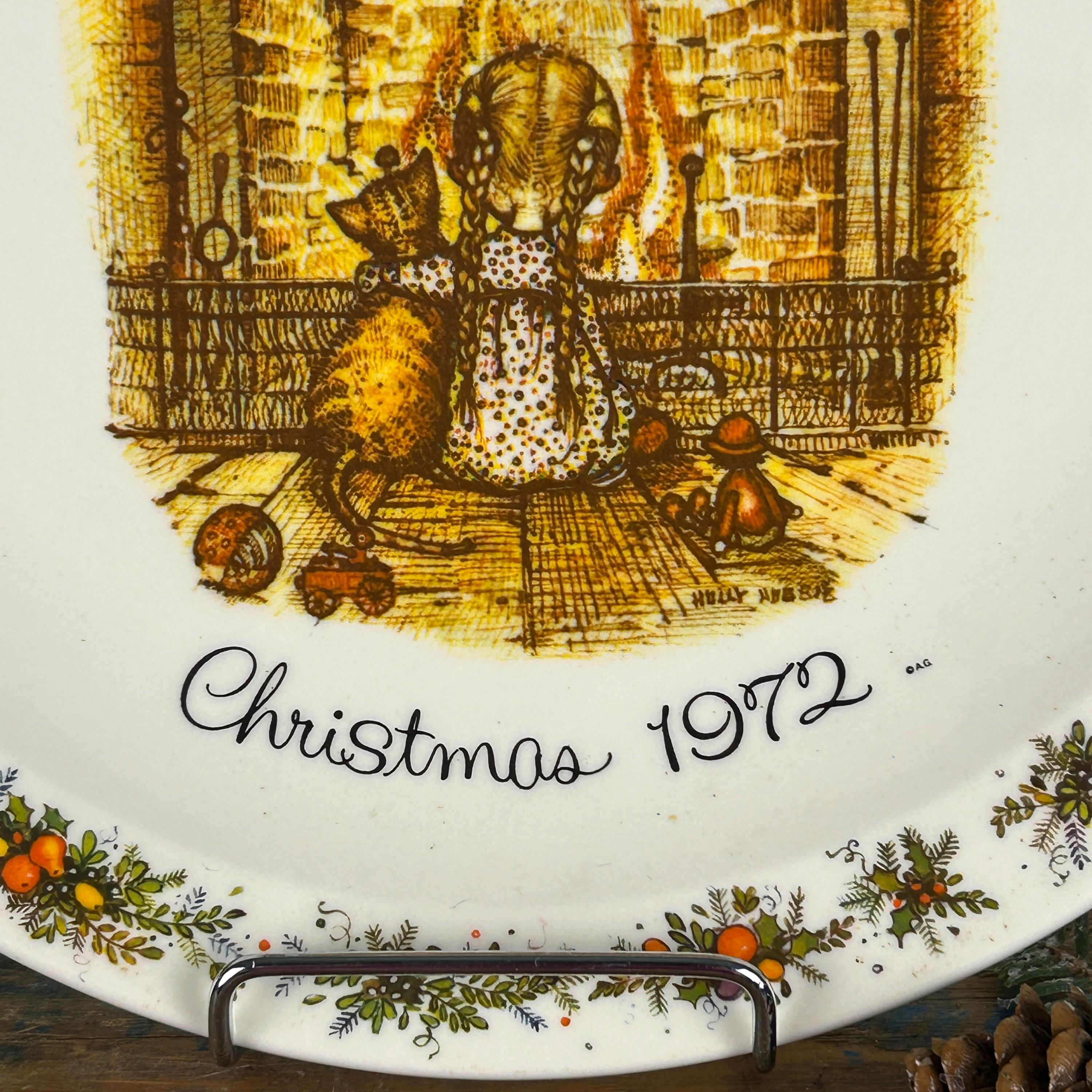 The plate features a depiction of Holly Hobbie and her cat sitting in front of a fireplace with stockings hanging above. Such a cozy little scene.