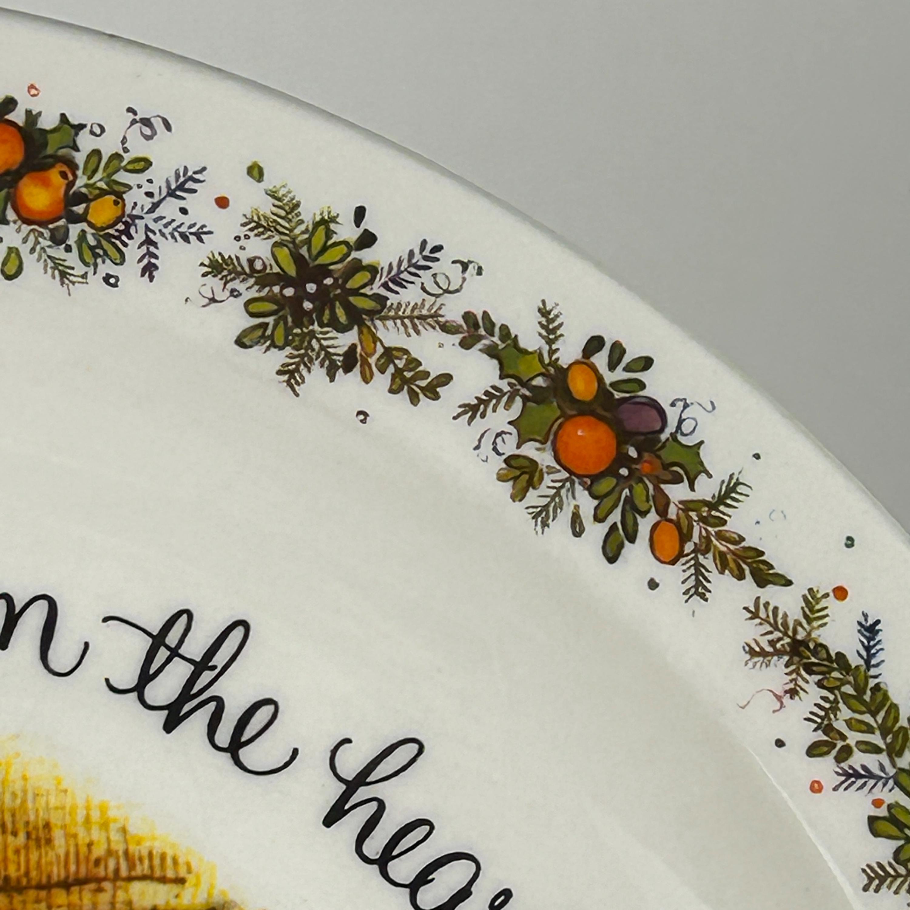 The plate has a border of holiday garland with holly leaves, small fruit, and pine spikes.