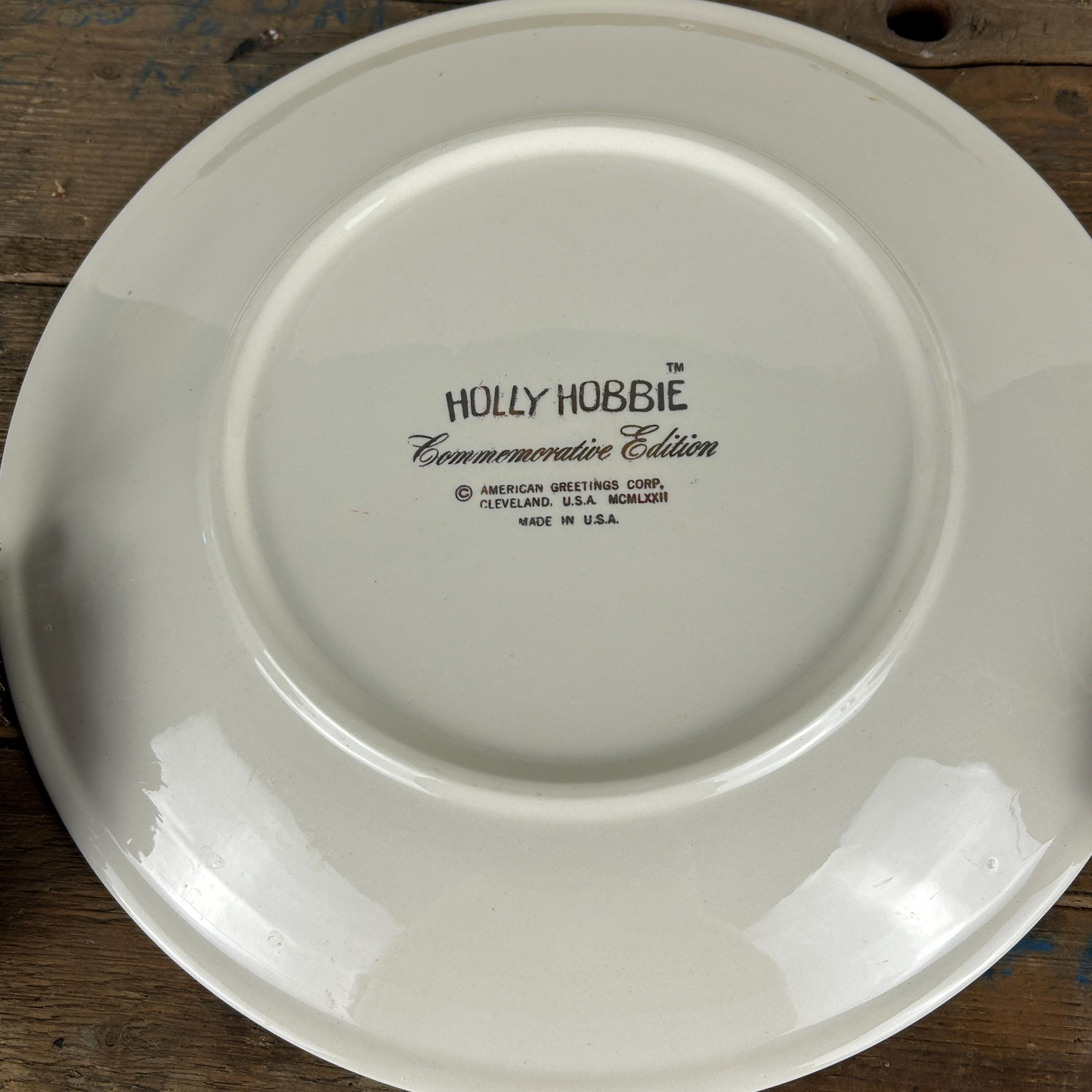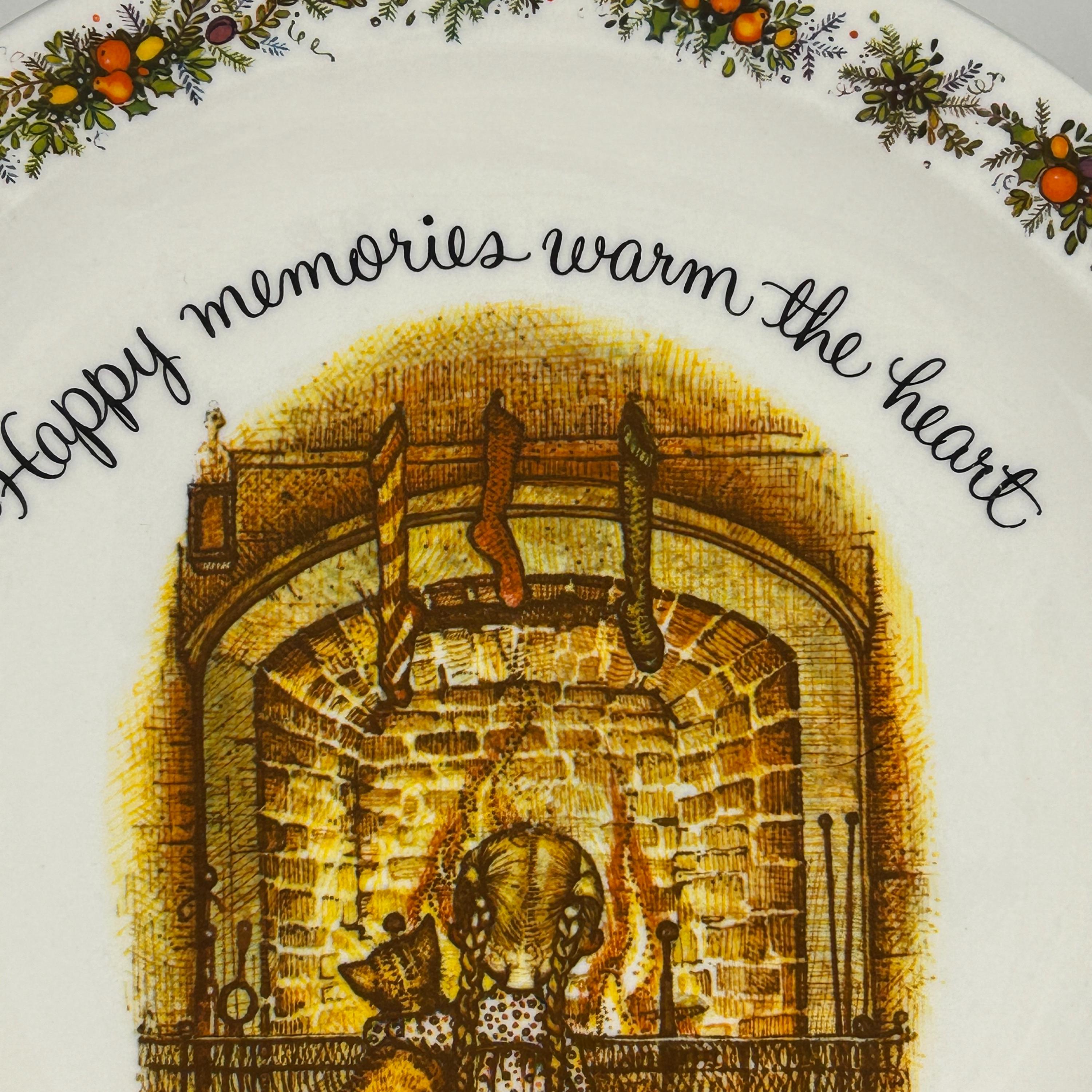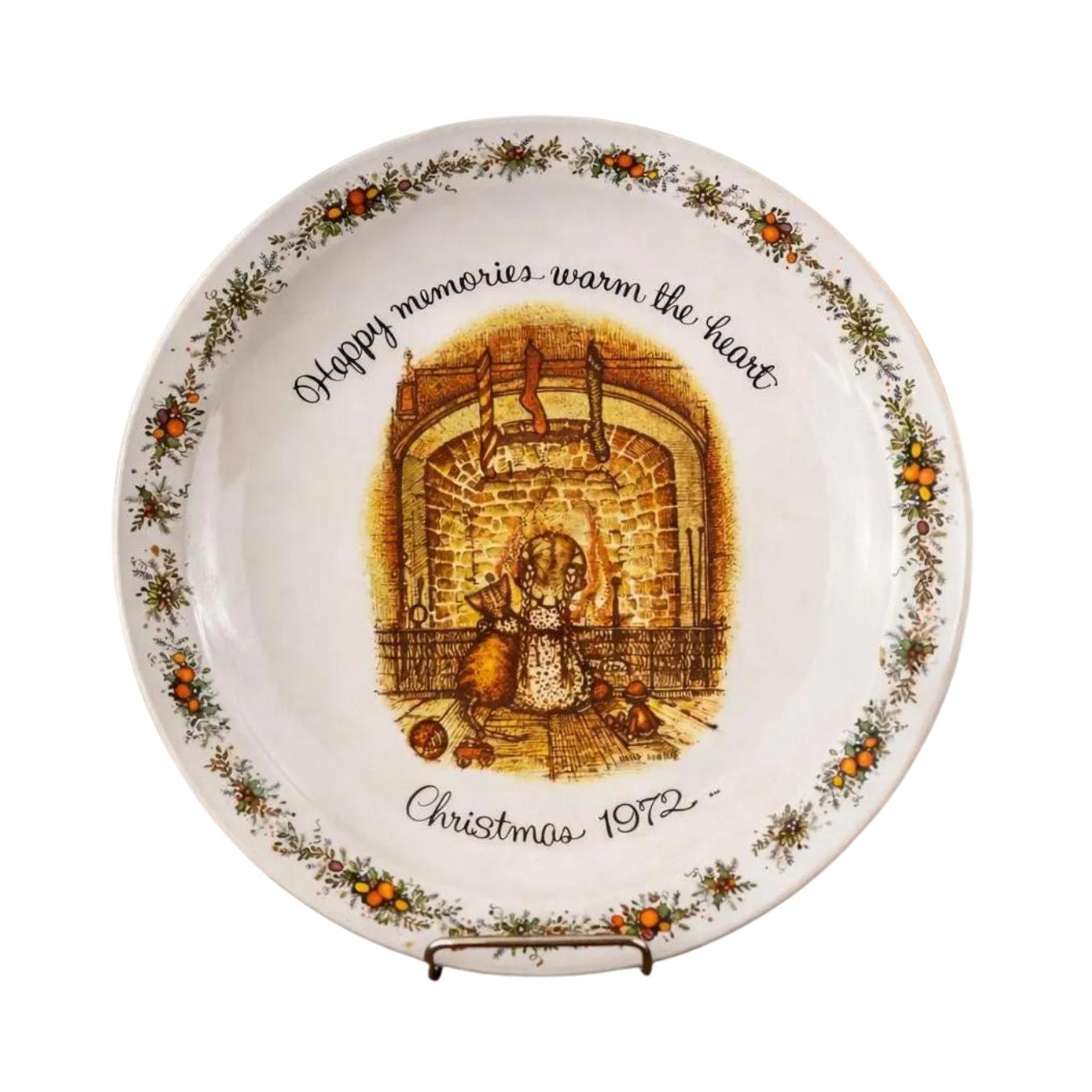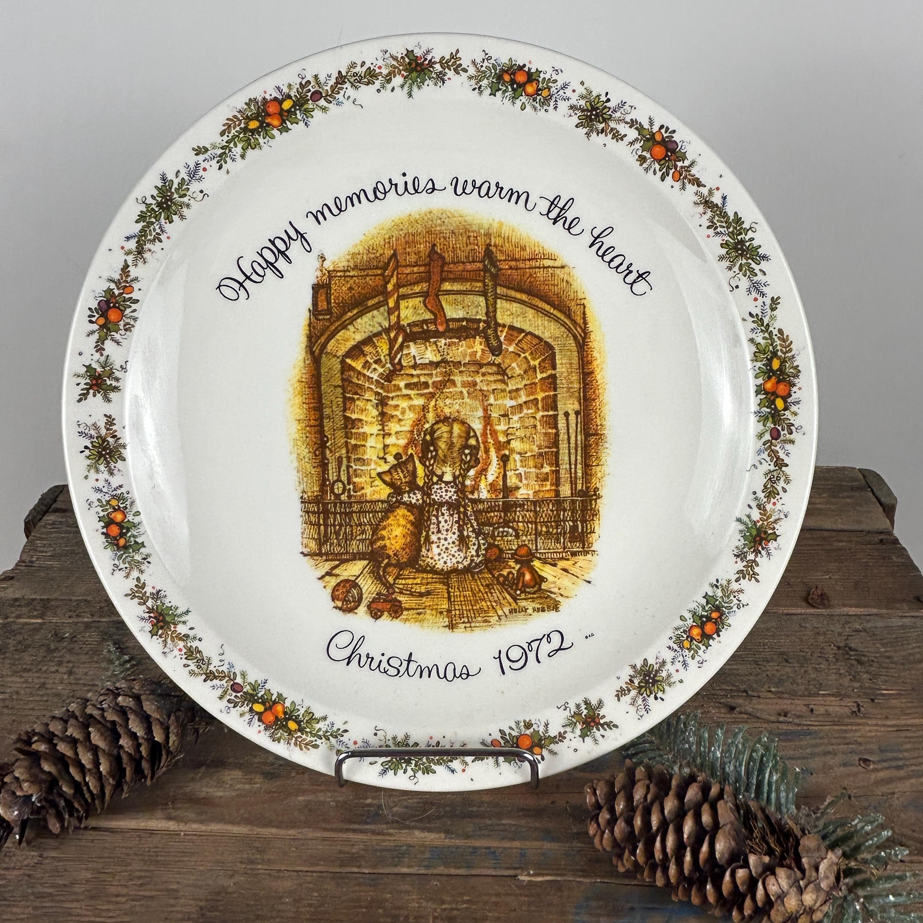 This is a vintage 1972 Holly Hobbie Christmas plate titled "Happy memories warm the heart," which was made by American Greetings.