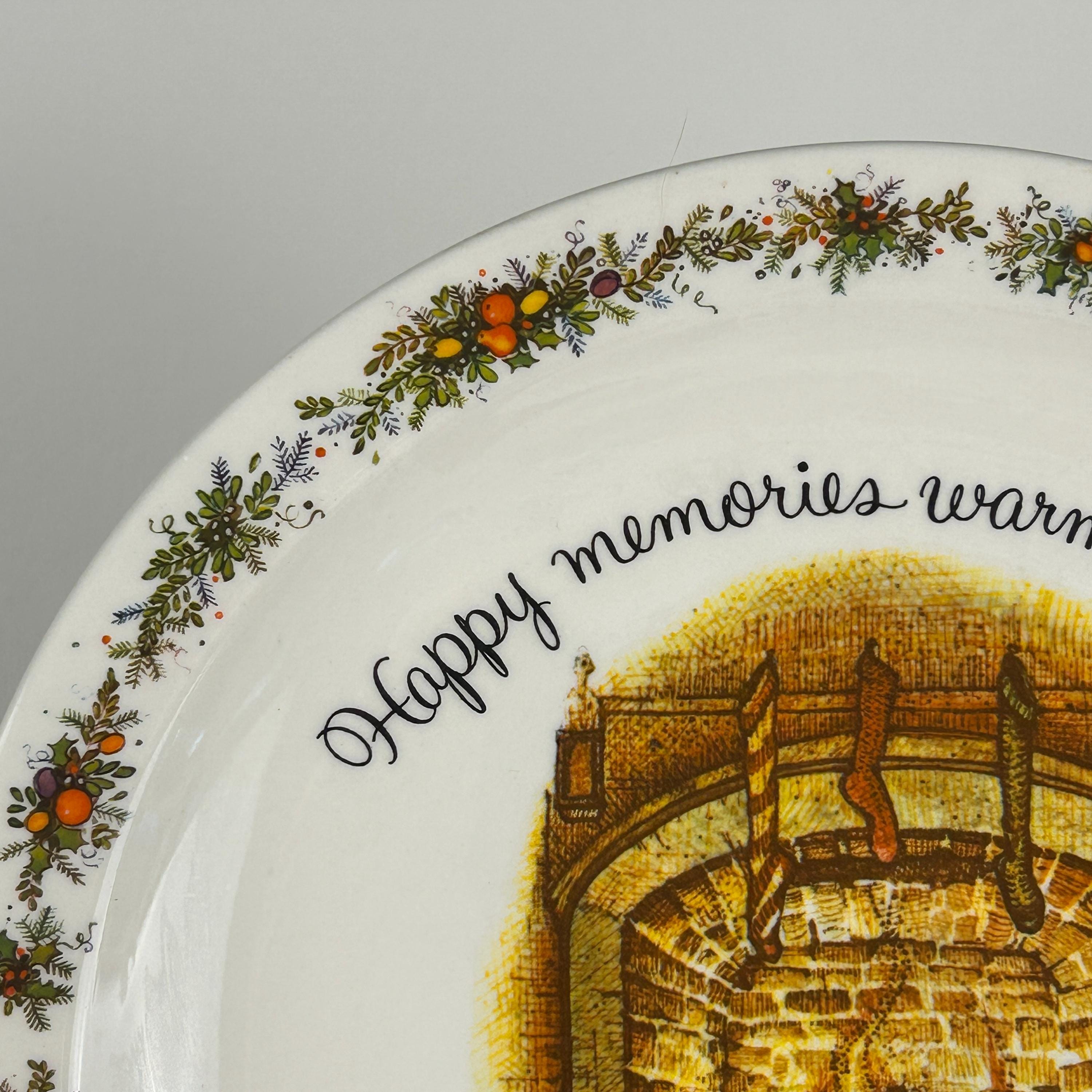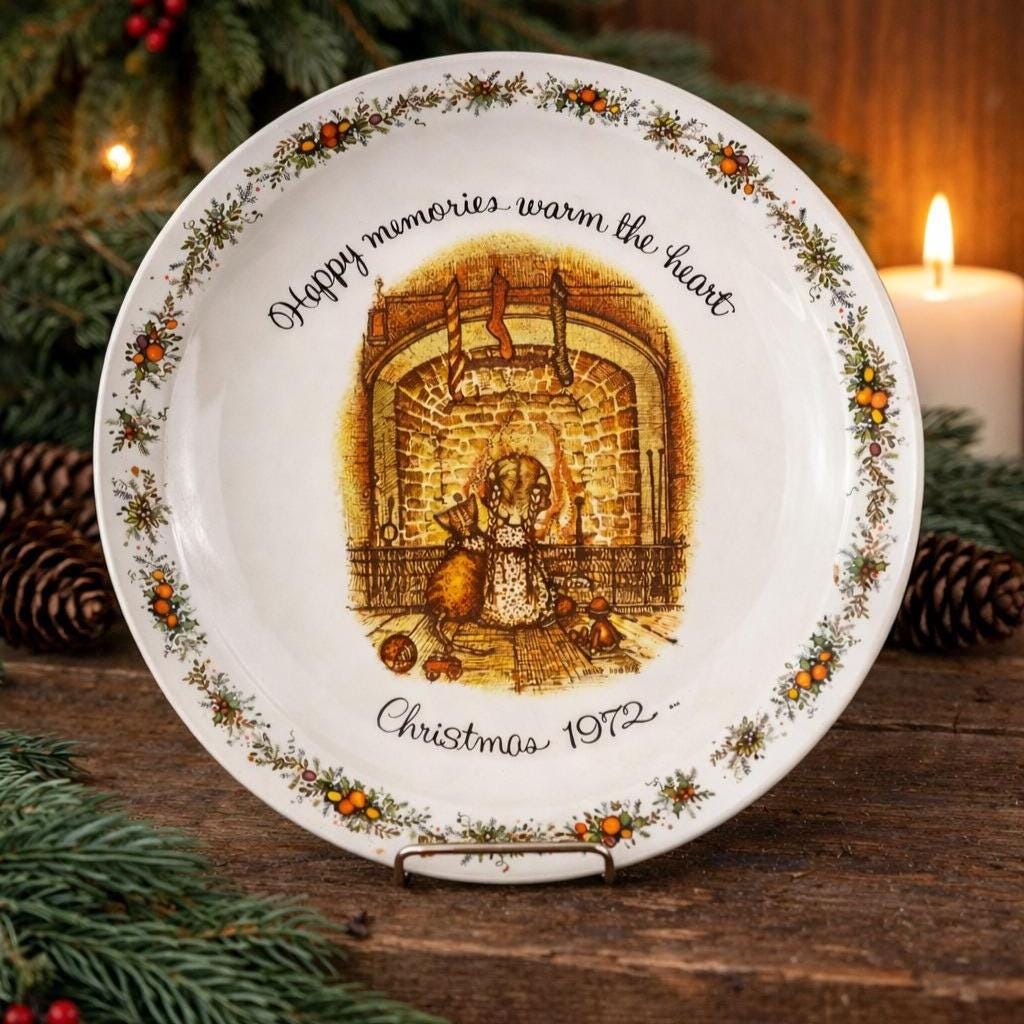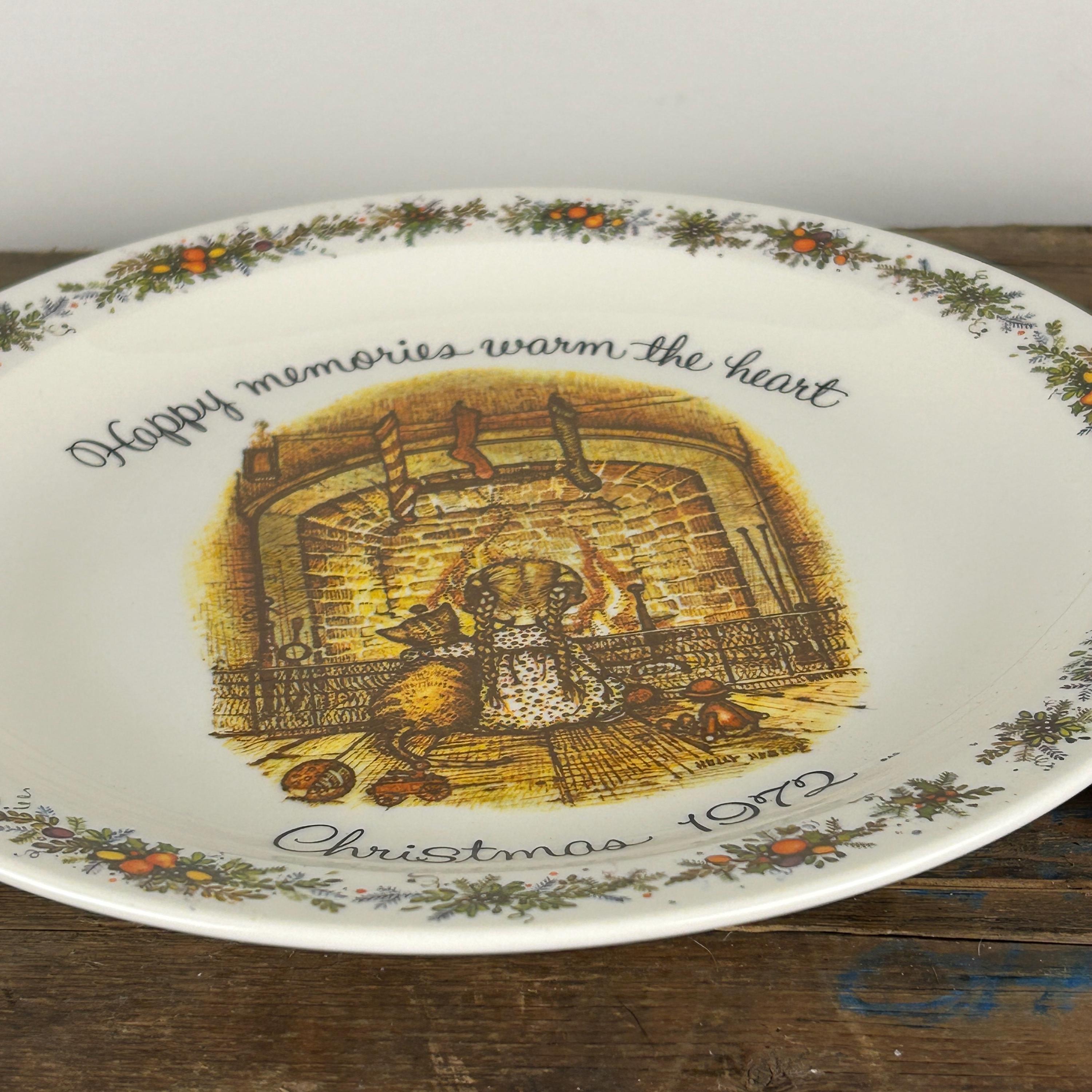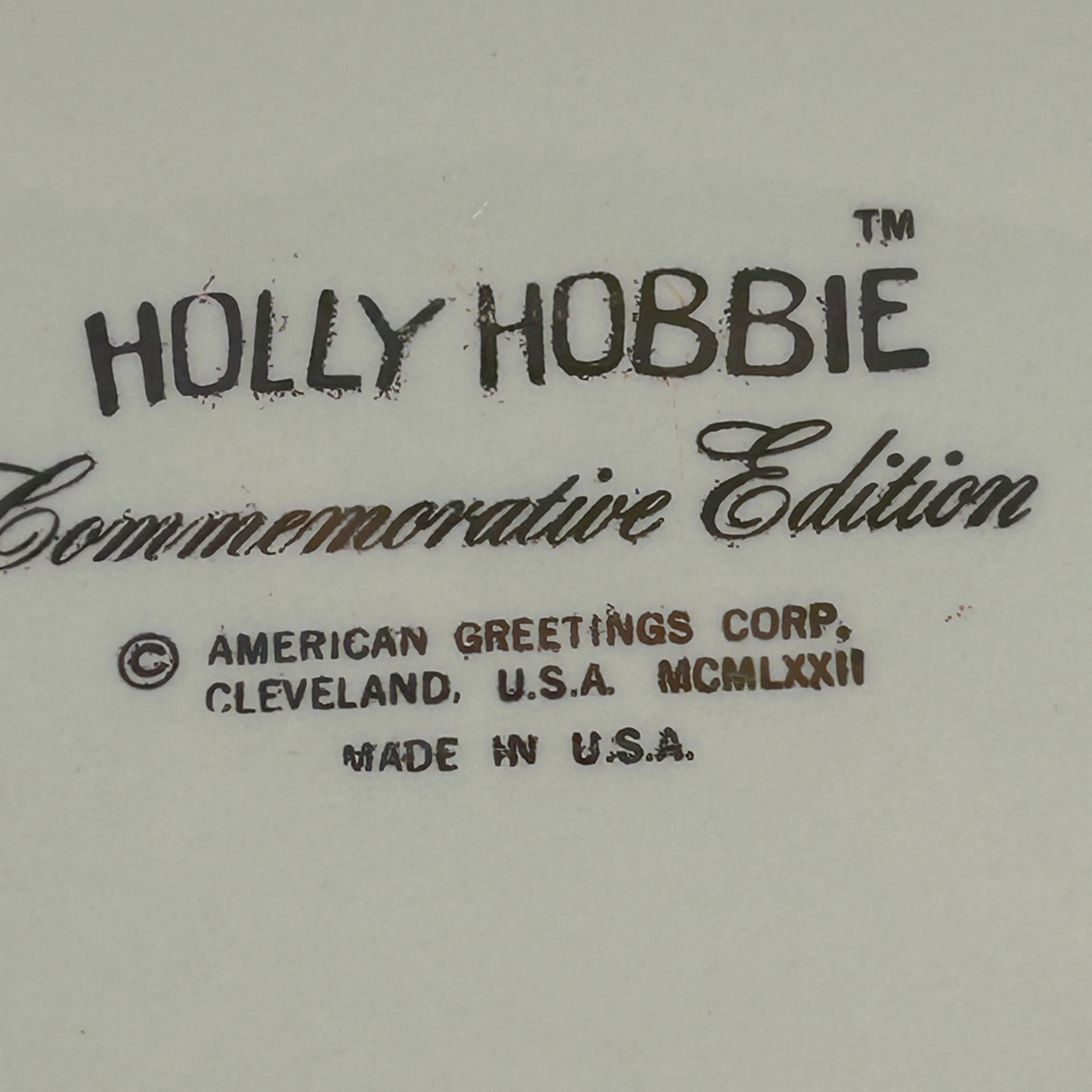 This is a vintage 1972 Holly Hobbie Christmas plate titled "Happy memories warm the heart," which was made by American Greetings.