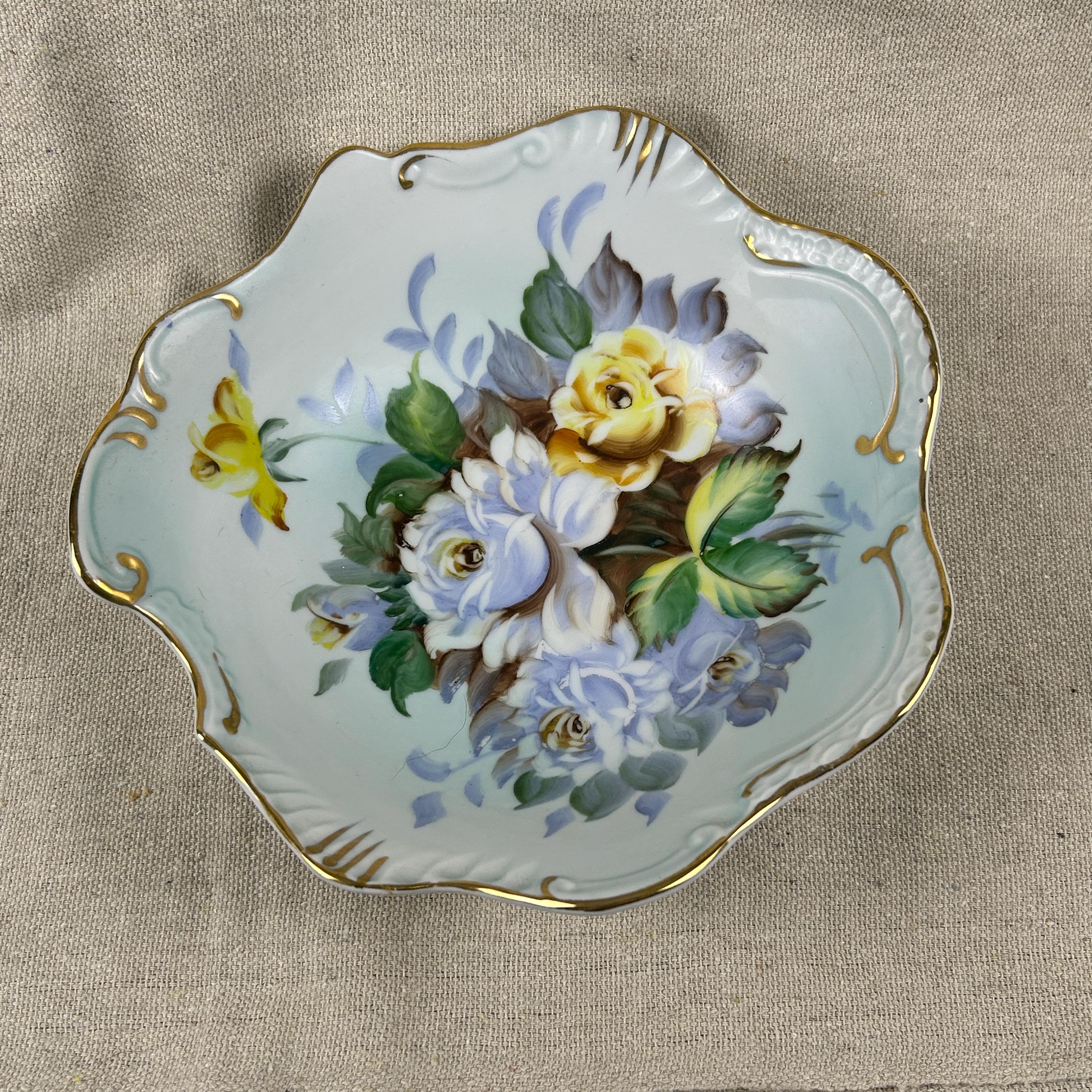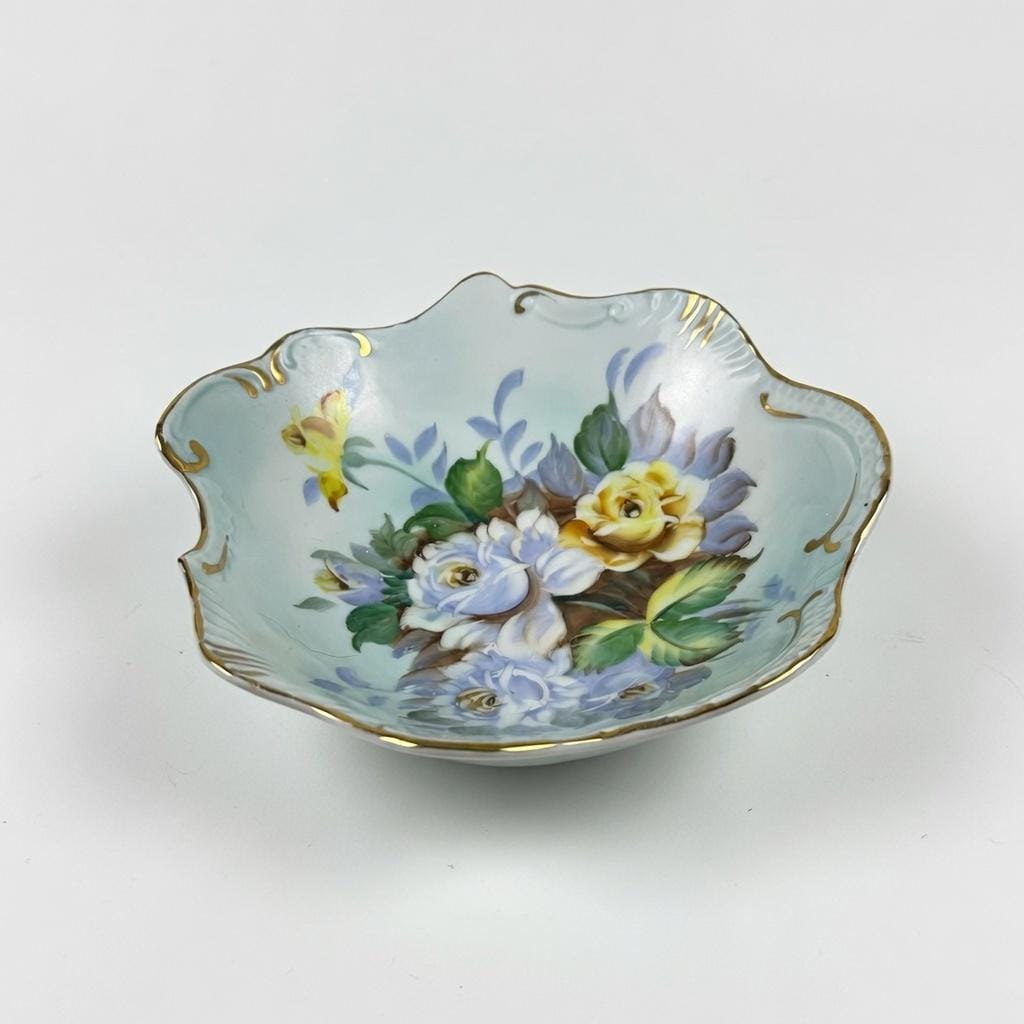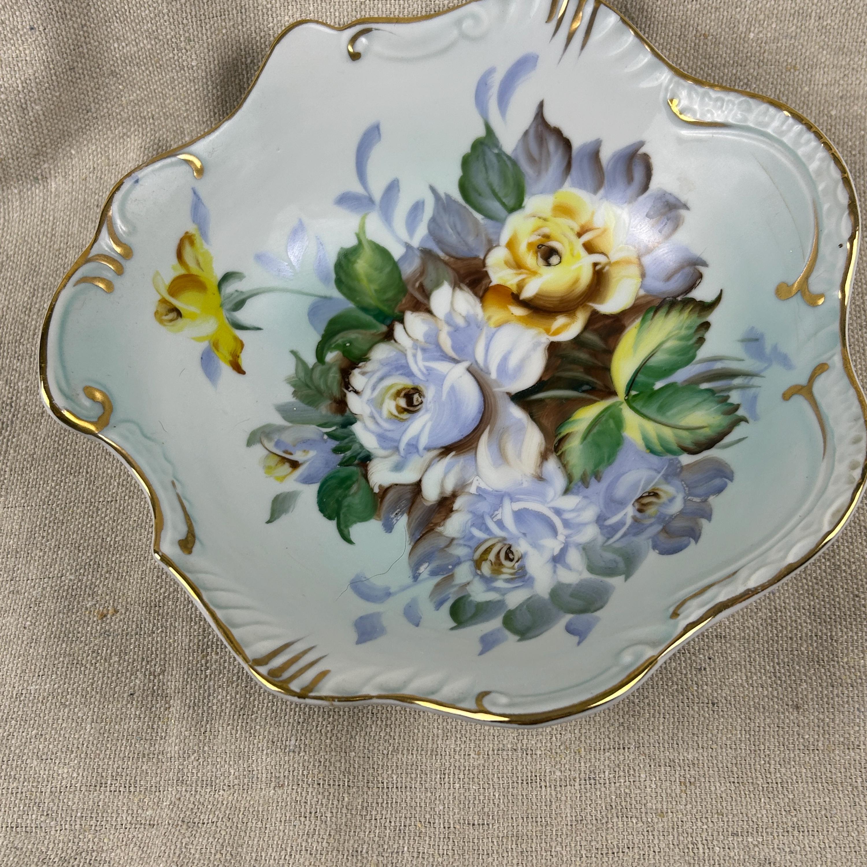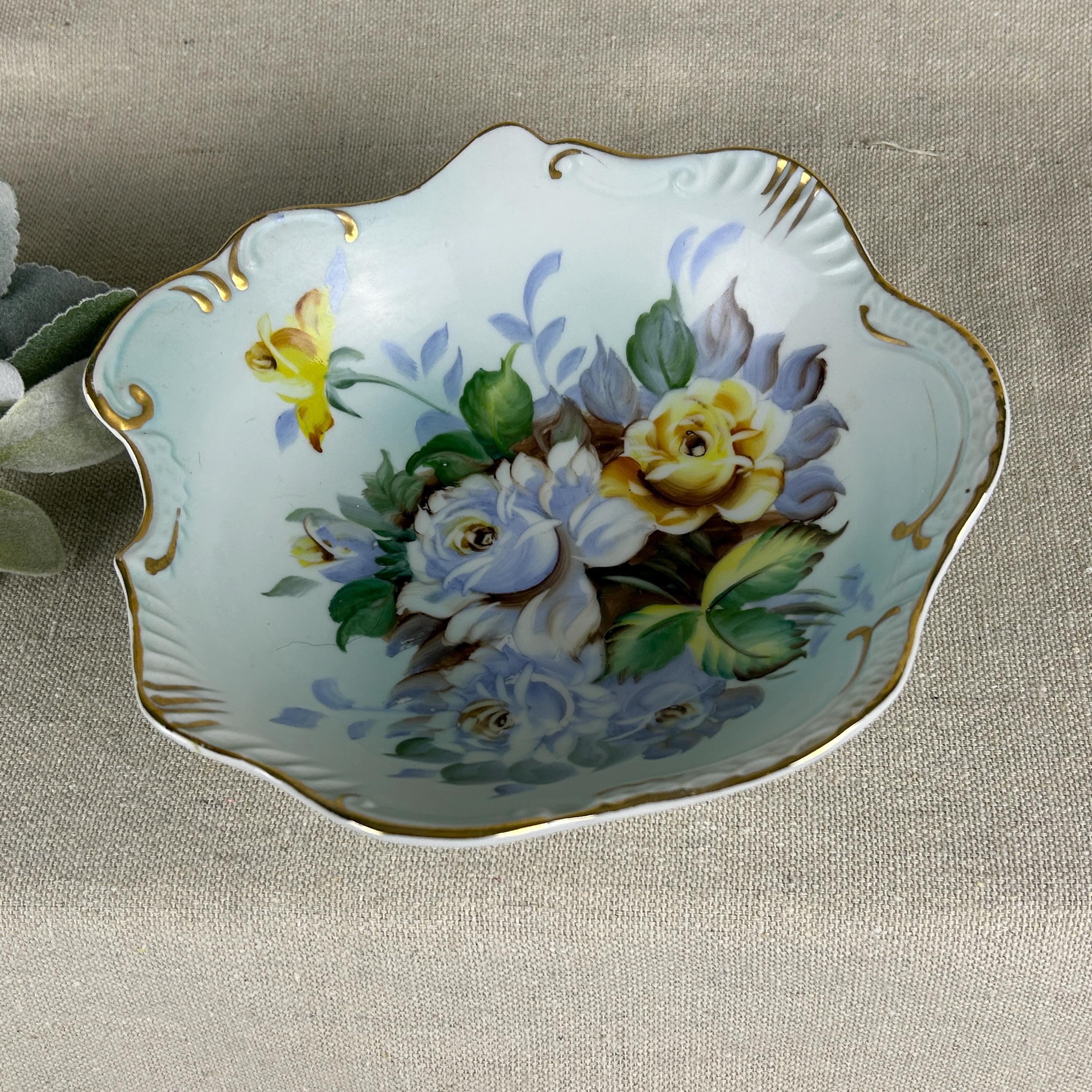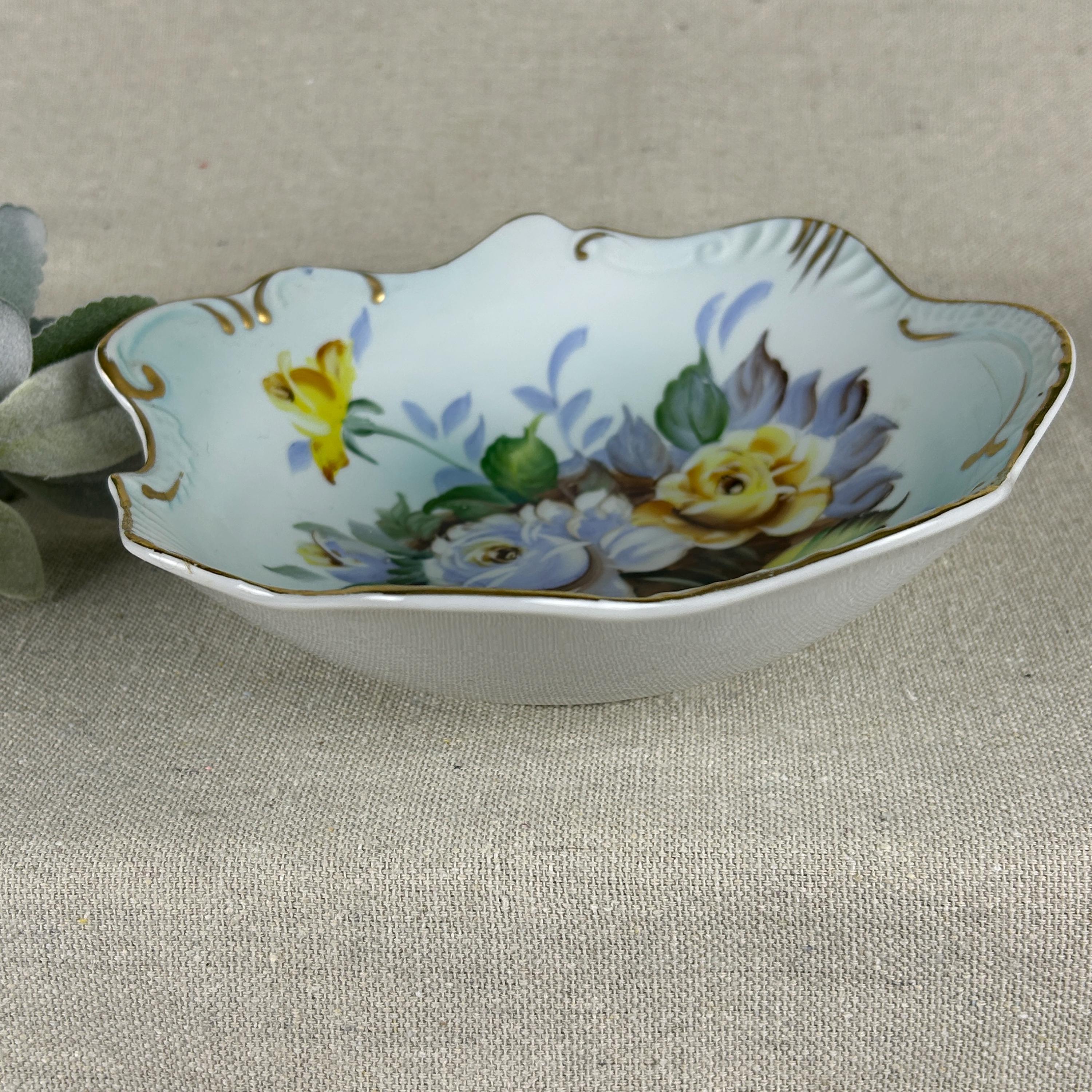 This is a vintage hand-painted ceramic bowl, made by Ucagco Ceramics in Japan. The bowl features a floral design with blue and yellow roses and has a gilded, ruffled rim. The edges are trimmed in gold with a few gold accents around the ruffled rim. An interesting edge to the bowl as well. In absolutely beautiful condition with no chips, cracks, crazing, or paint loss. The paint colors are clear and vibrant. The original Ucagco Ceramics stickers remains on the bottom of the bowl.