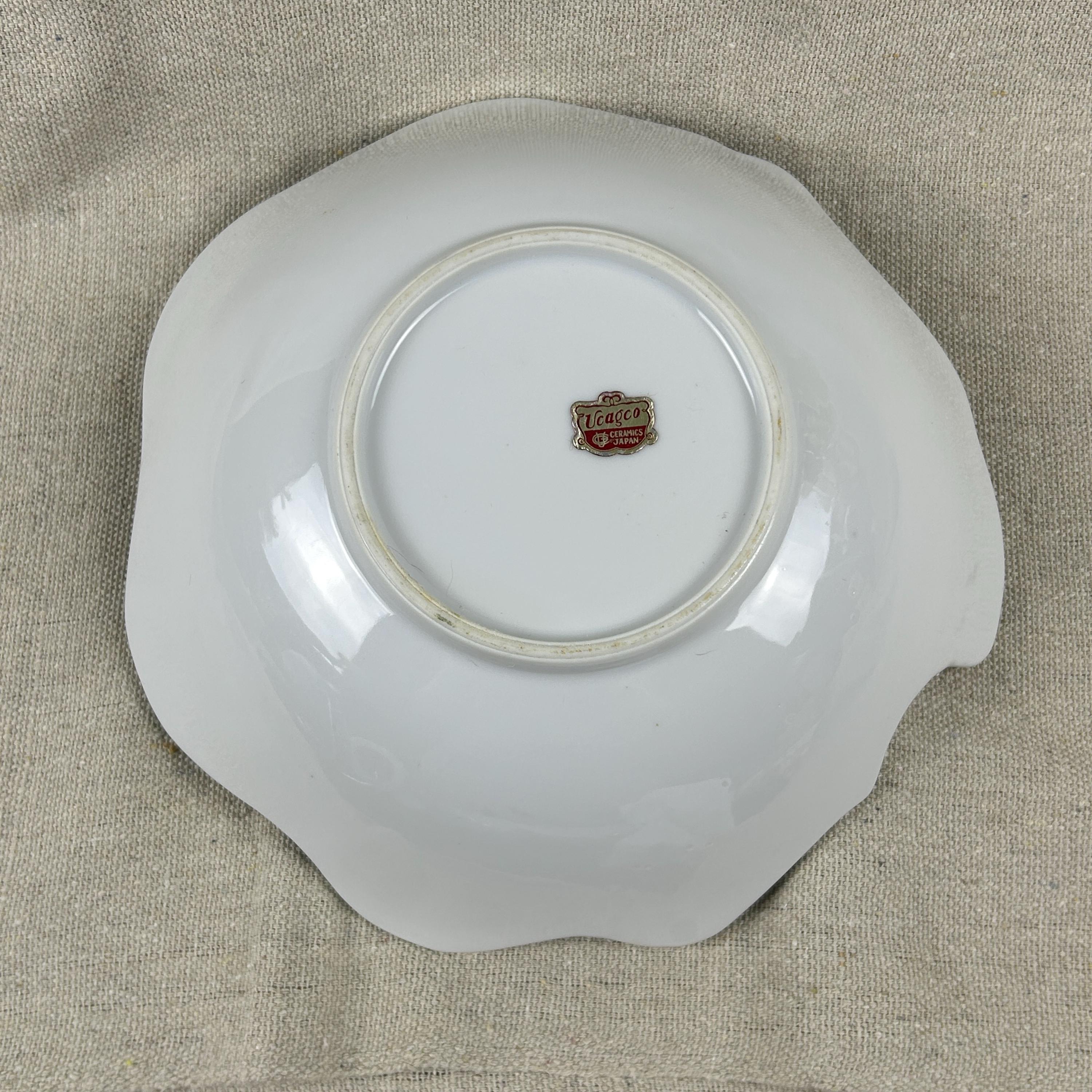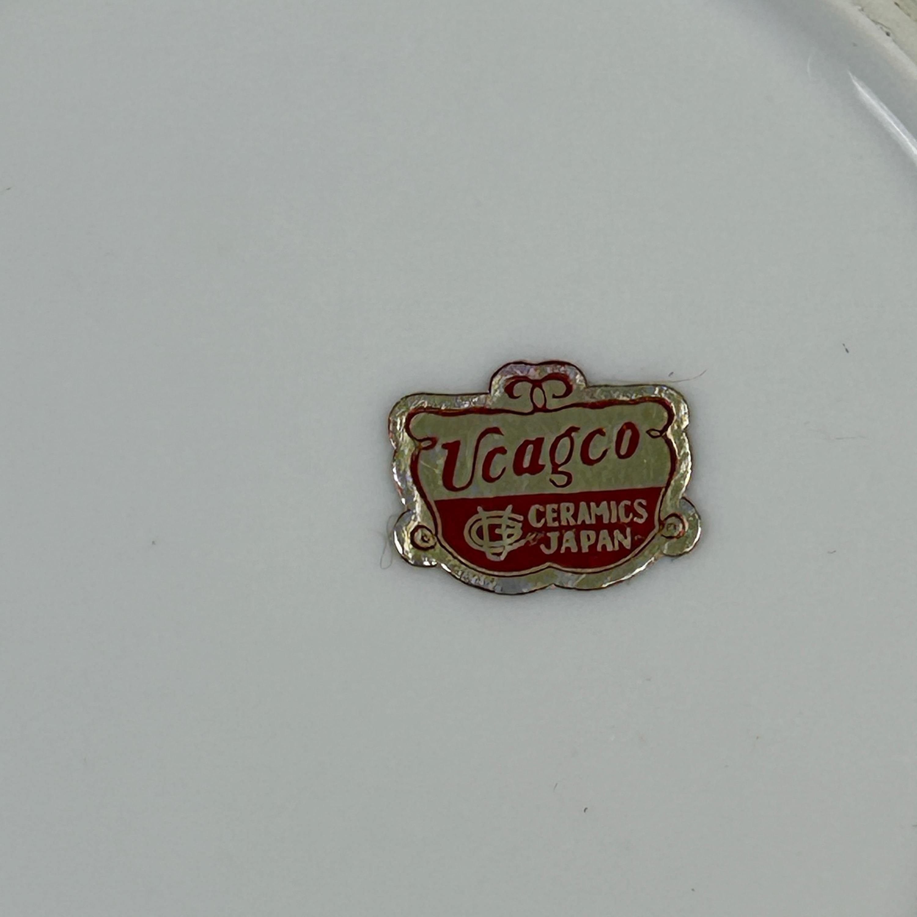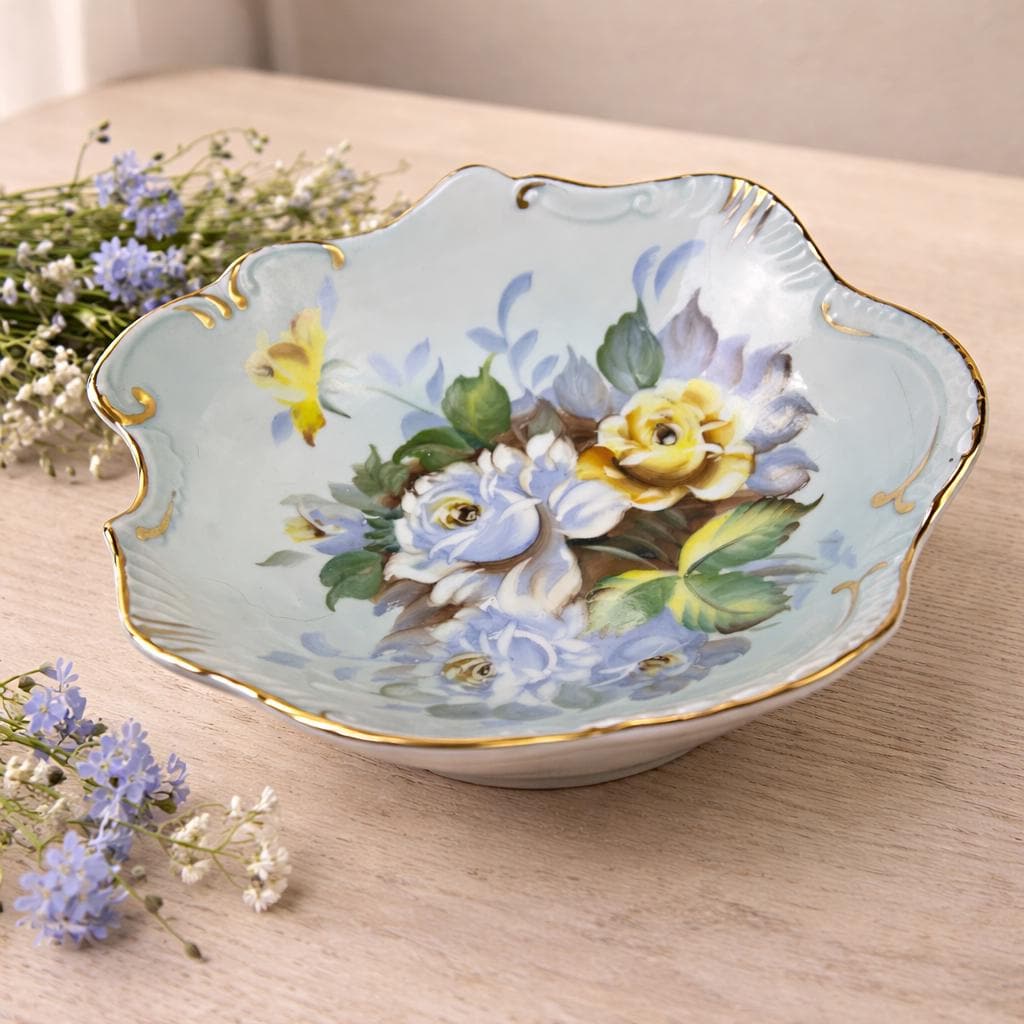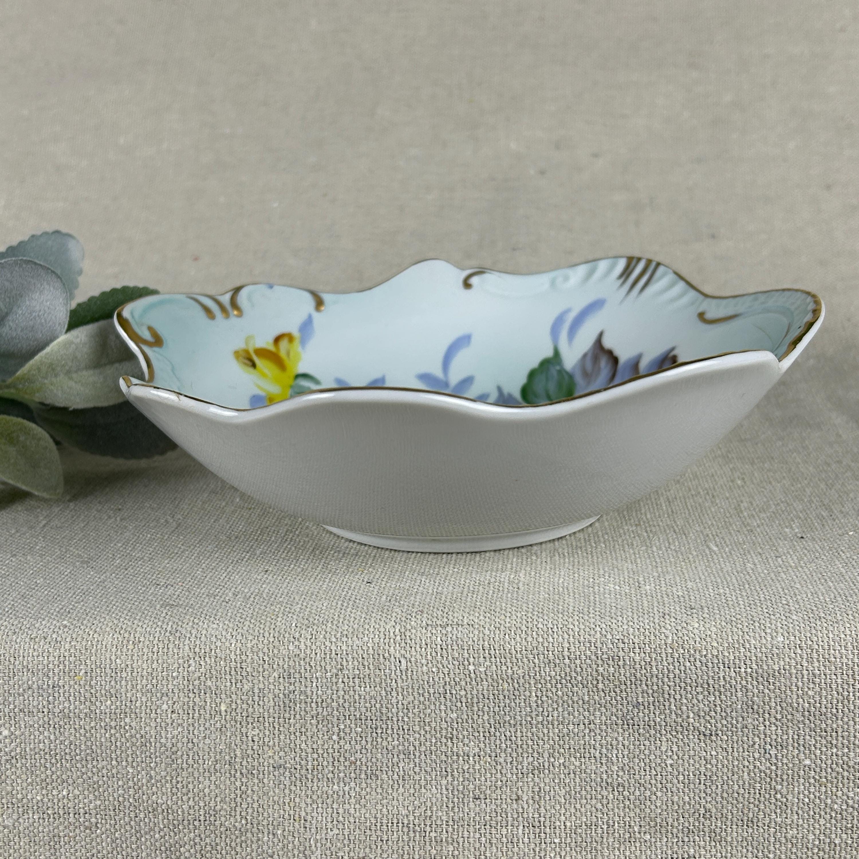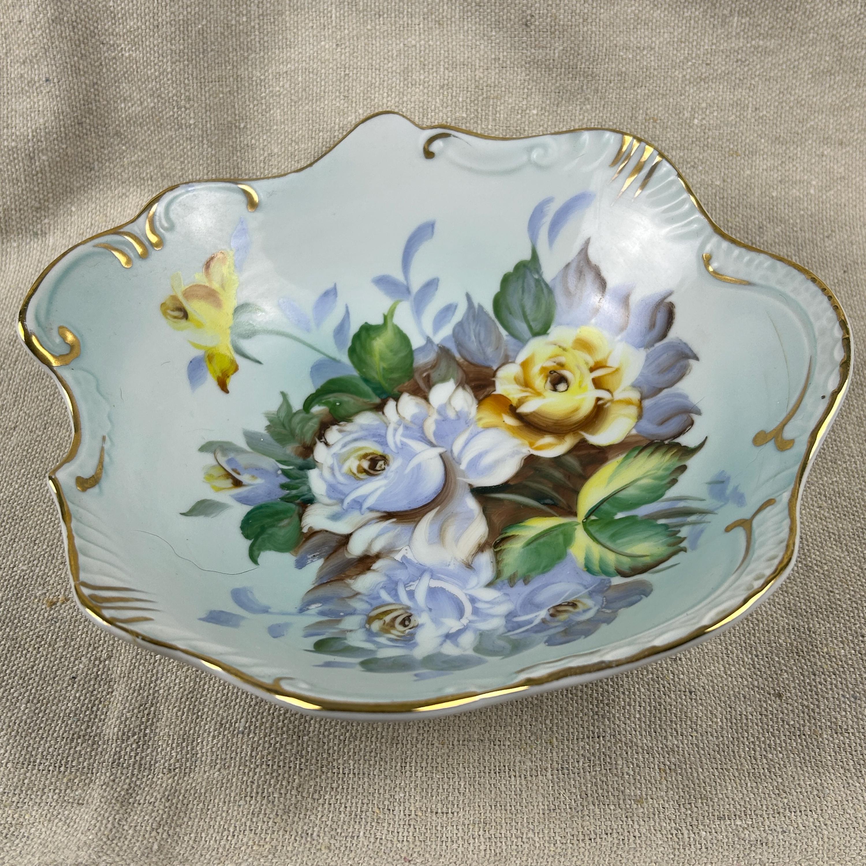 This is a vintage hand-painted ceramic bowl, made by Ucagco Ceramics in Japan. The bowl features a floral design with blue and yellow roses and has a gilded, ruffled rim. The edges are trimmed in gold with a few gold accents around the ruffled rim. An interesting edge to the bowl as well. In absolutely beautiful condition with no chips, cracks, crazing, or paint loss. The paint colors are clear and vibrant. The original Ucagco Ceramics stickers remains on the bottom of the bowl.