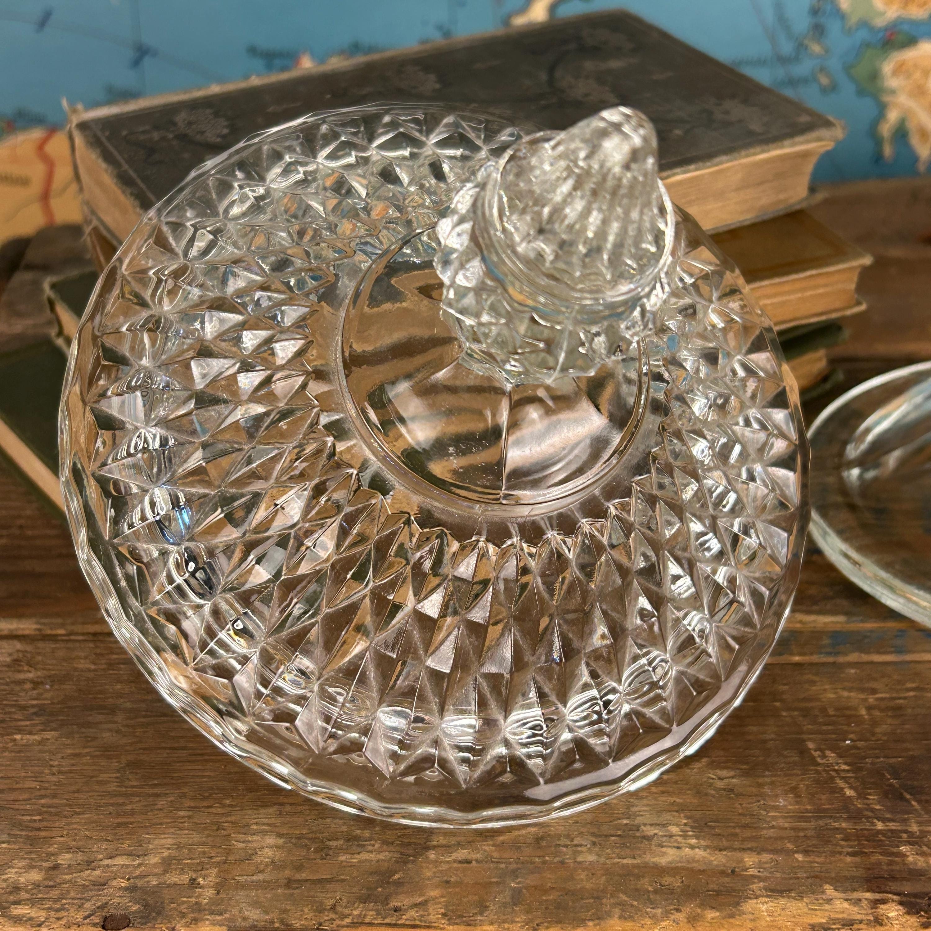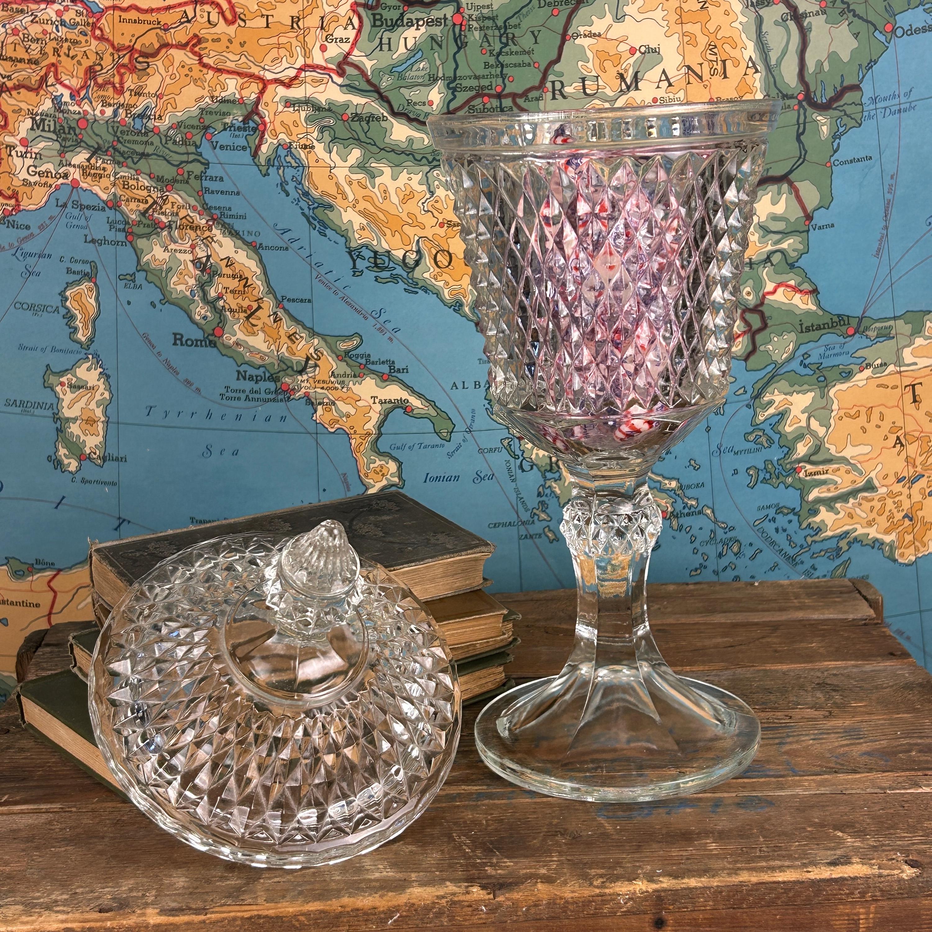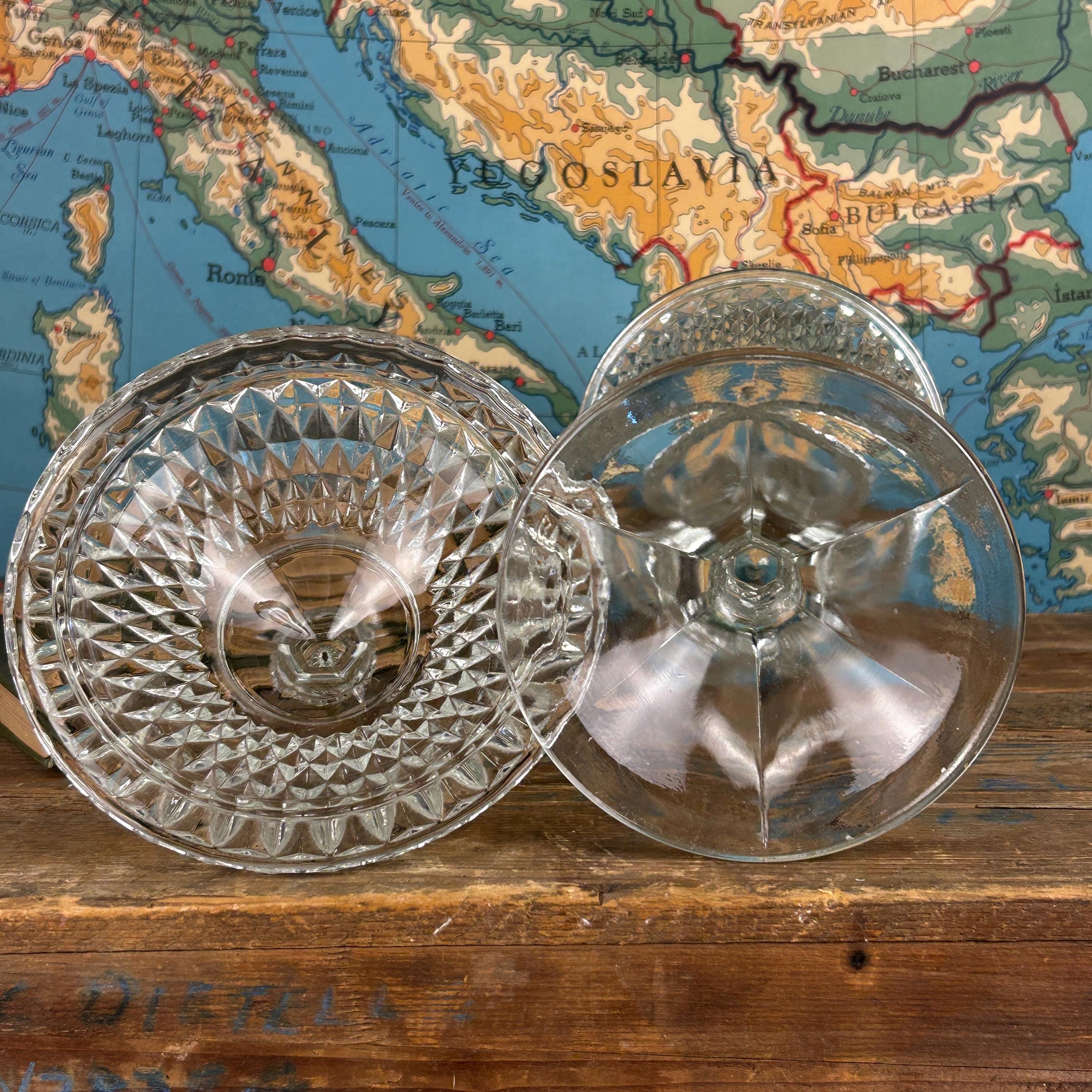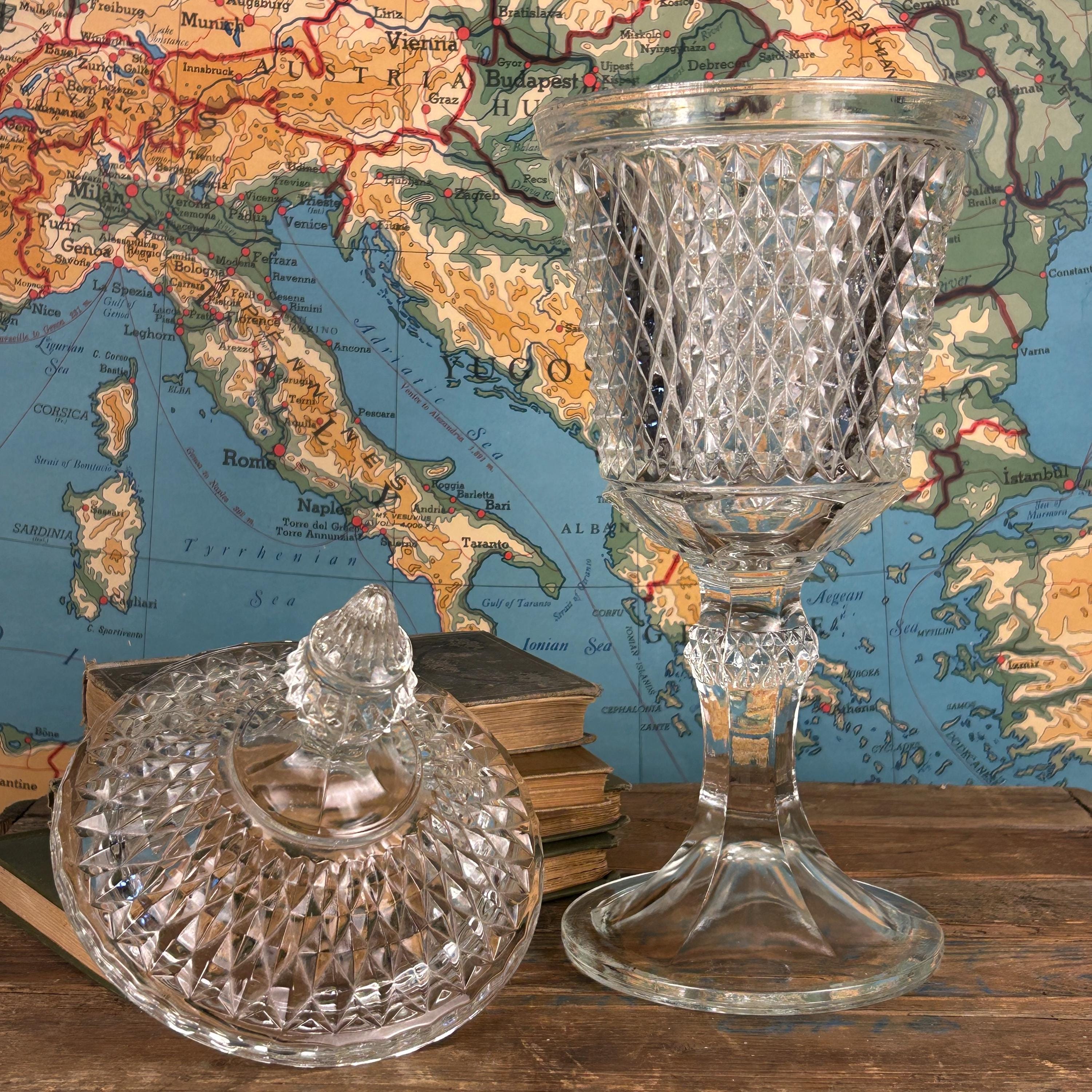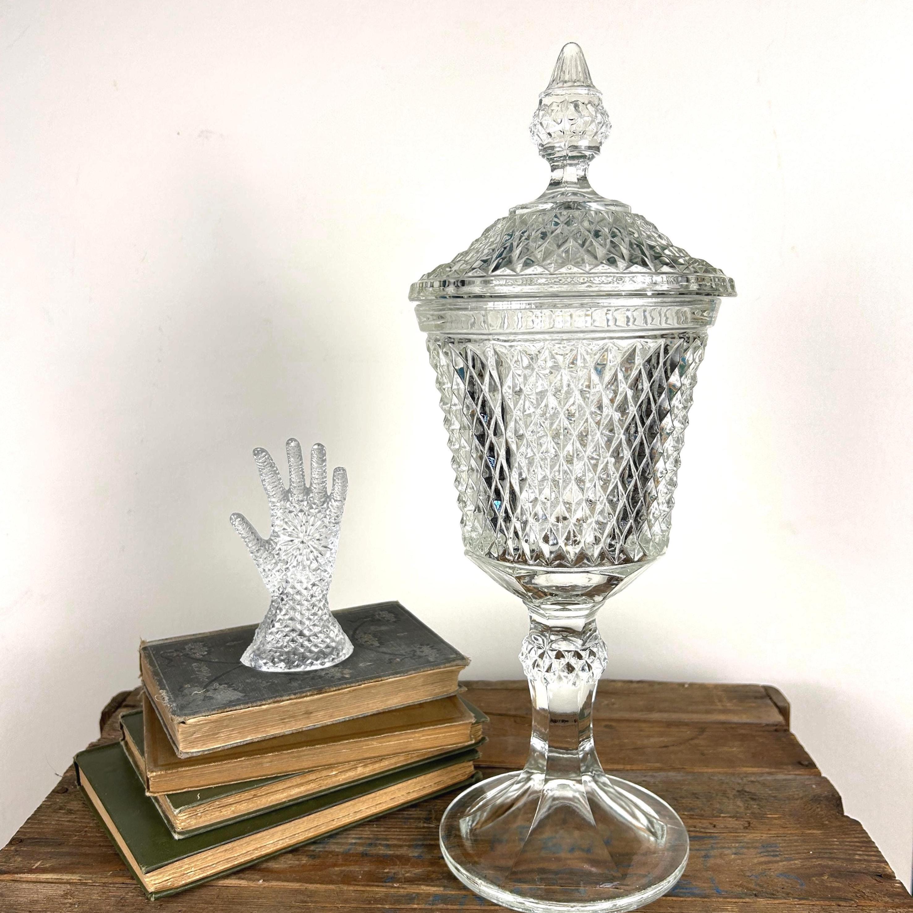 Stunning Indiana Glass Tiara Diamond Point Apothecary Vase. This lidded tall bowl is perfect for candy, decorative storage, or kitchen organization. Its elegant design adds a touch of vintage charm to any space, making it a versatile piece for showcasing your favorite treats or trinkets. Ideal for collectors or as a thoughtful gift, this exquisite vase combines functionality with timeless beauty. Don't miss out on this must-have addition to your décor! This would be a fun way to store coffee beans at the family coffee station. Or to just pretty up your kitchen space.