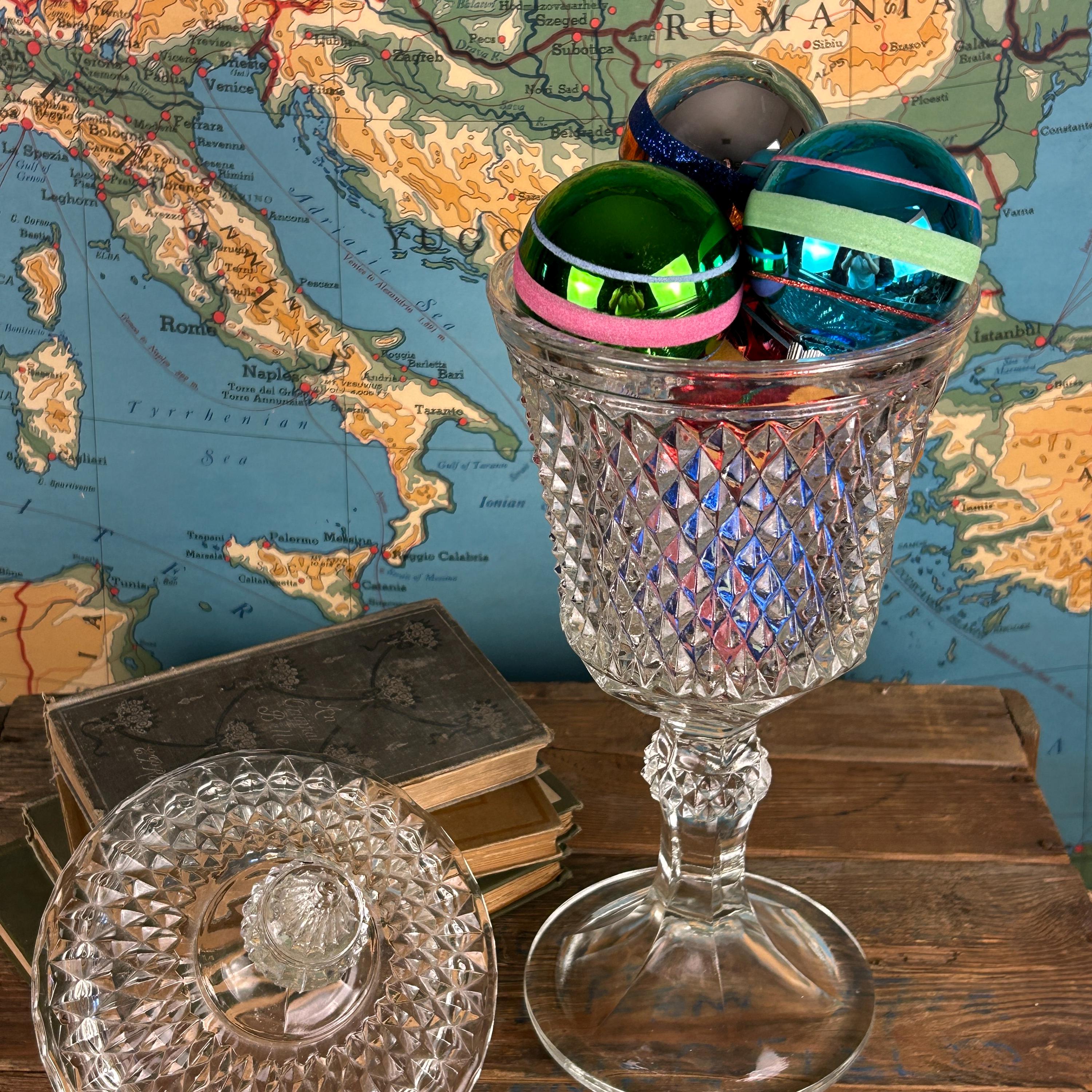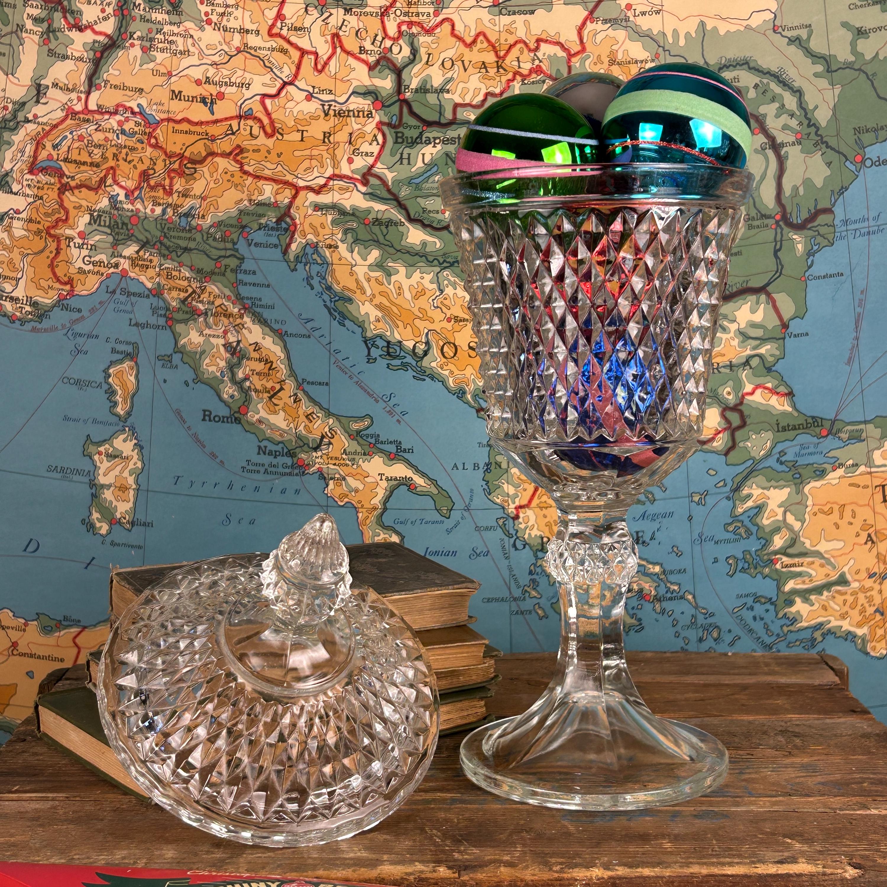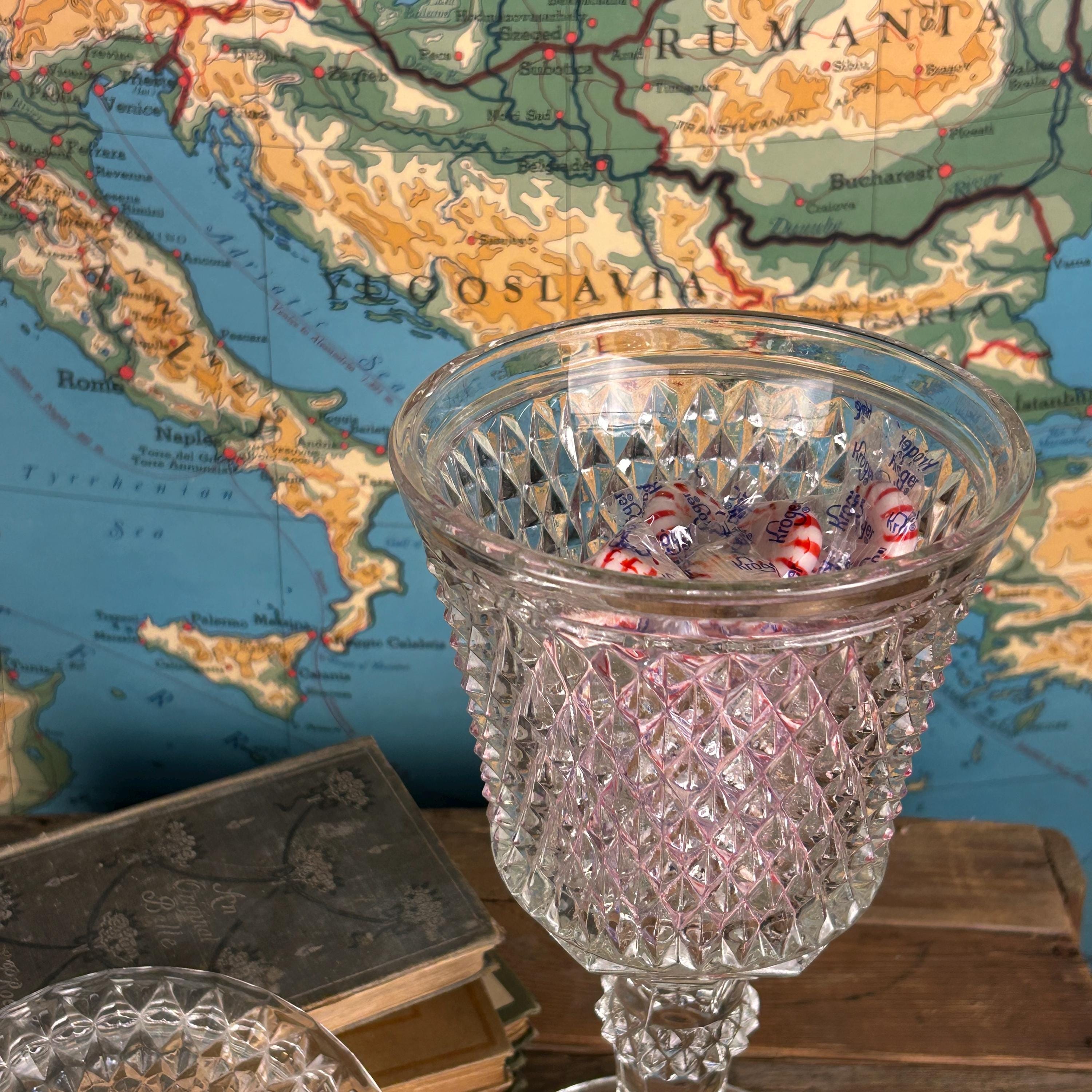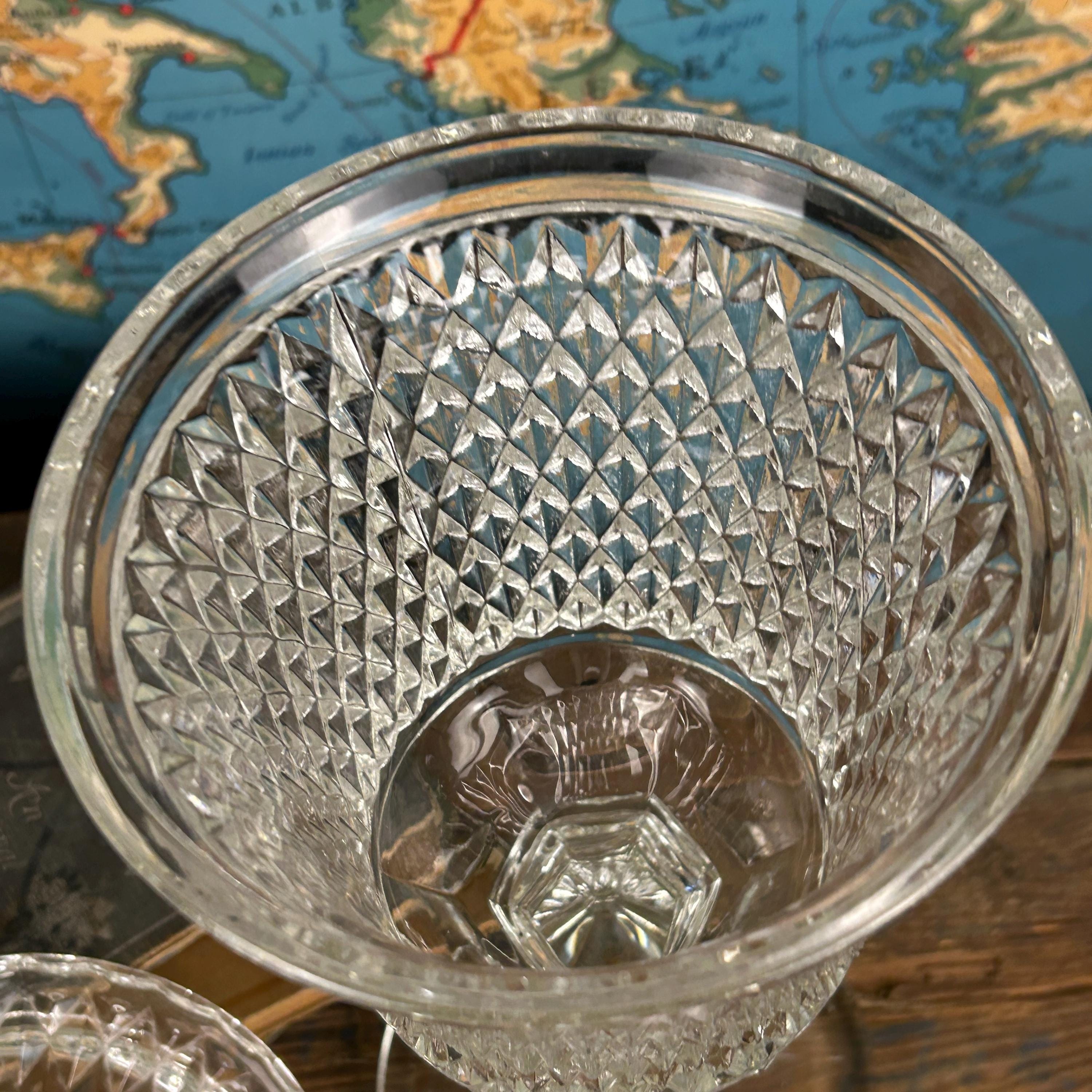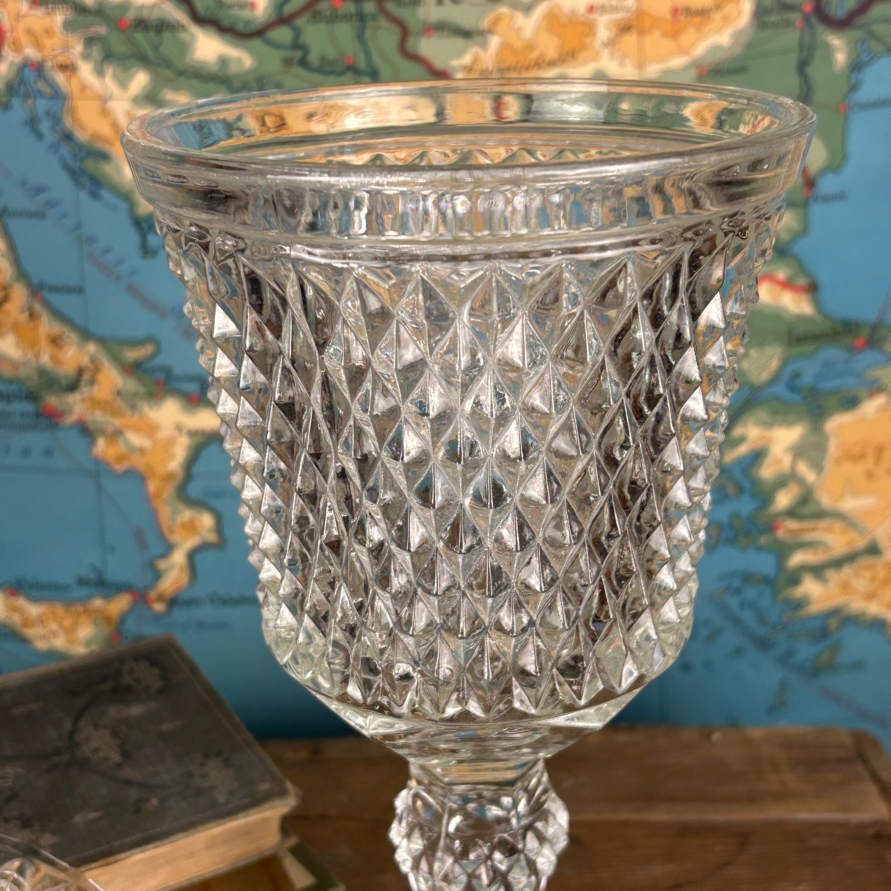 Stunning Indiana Glass Tiara Diamond Point Apothecary Vase. This lidded tall bowl is perfect for candy, decorative storage, or kitchen organization. Its elegant design adds a touch of vintage charm to any space, making it a versatile piece for showcasing your favorite treats or trinkets. Ideal for collectors or as a thoughtful gift, this exquisite vase combines functionality with timeless beauty. Don't miss out on this must-have addition to your décor! This would be a fun way to store coffee beans at the family coffee station. Or to just pretty up your kitchen space.