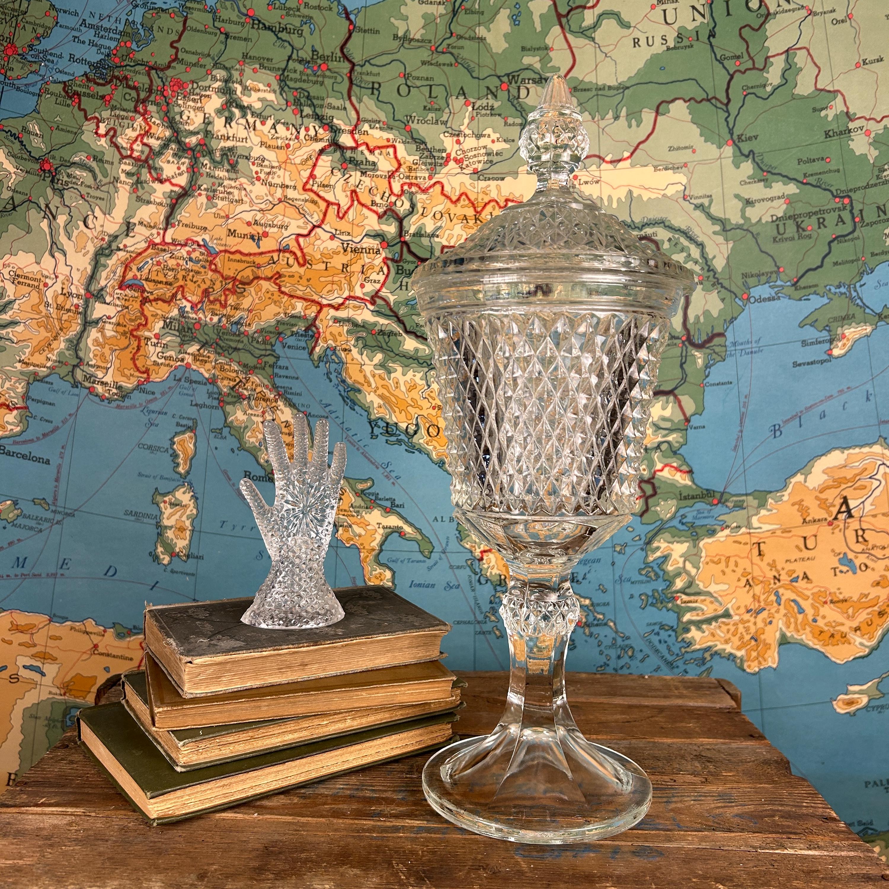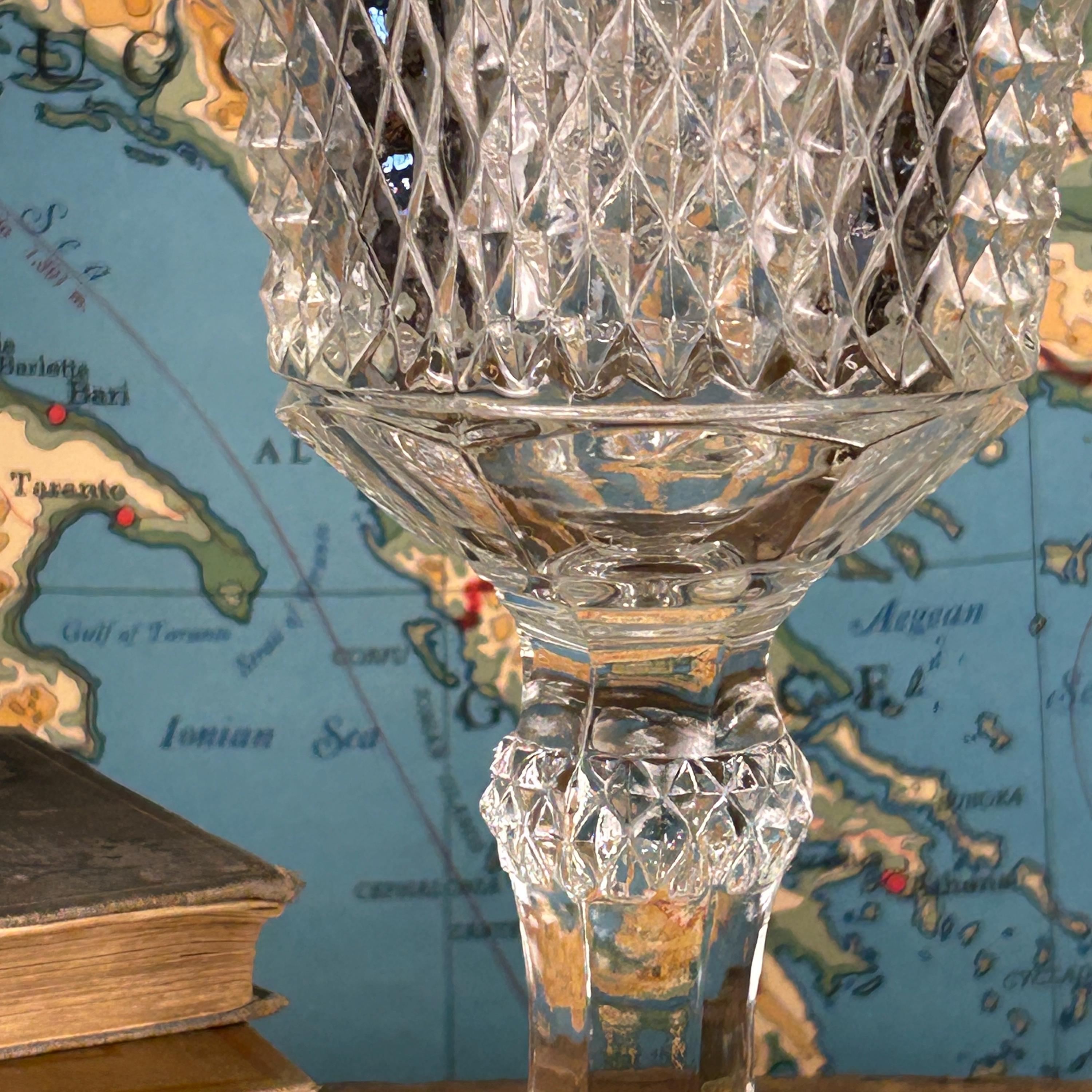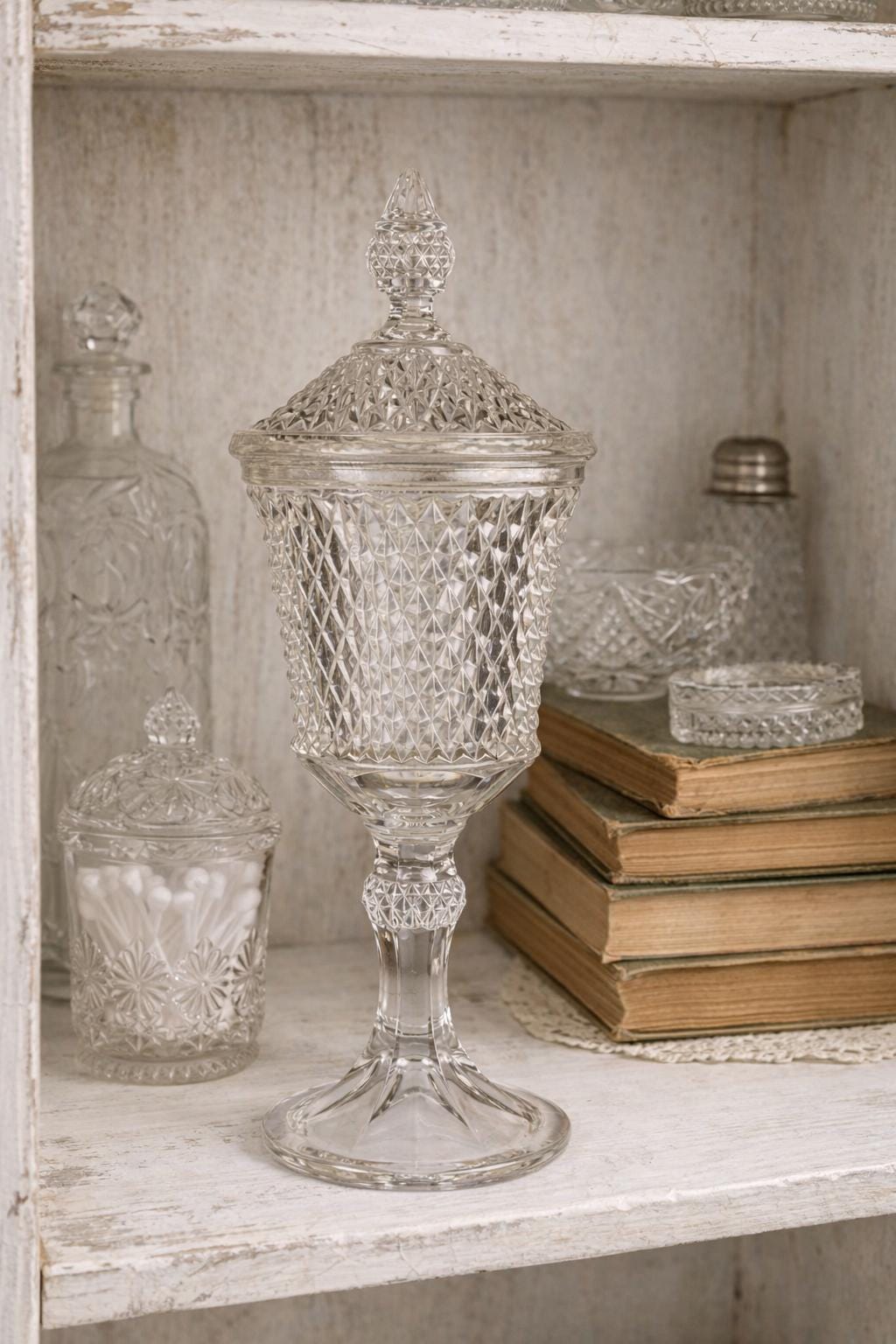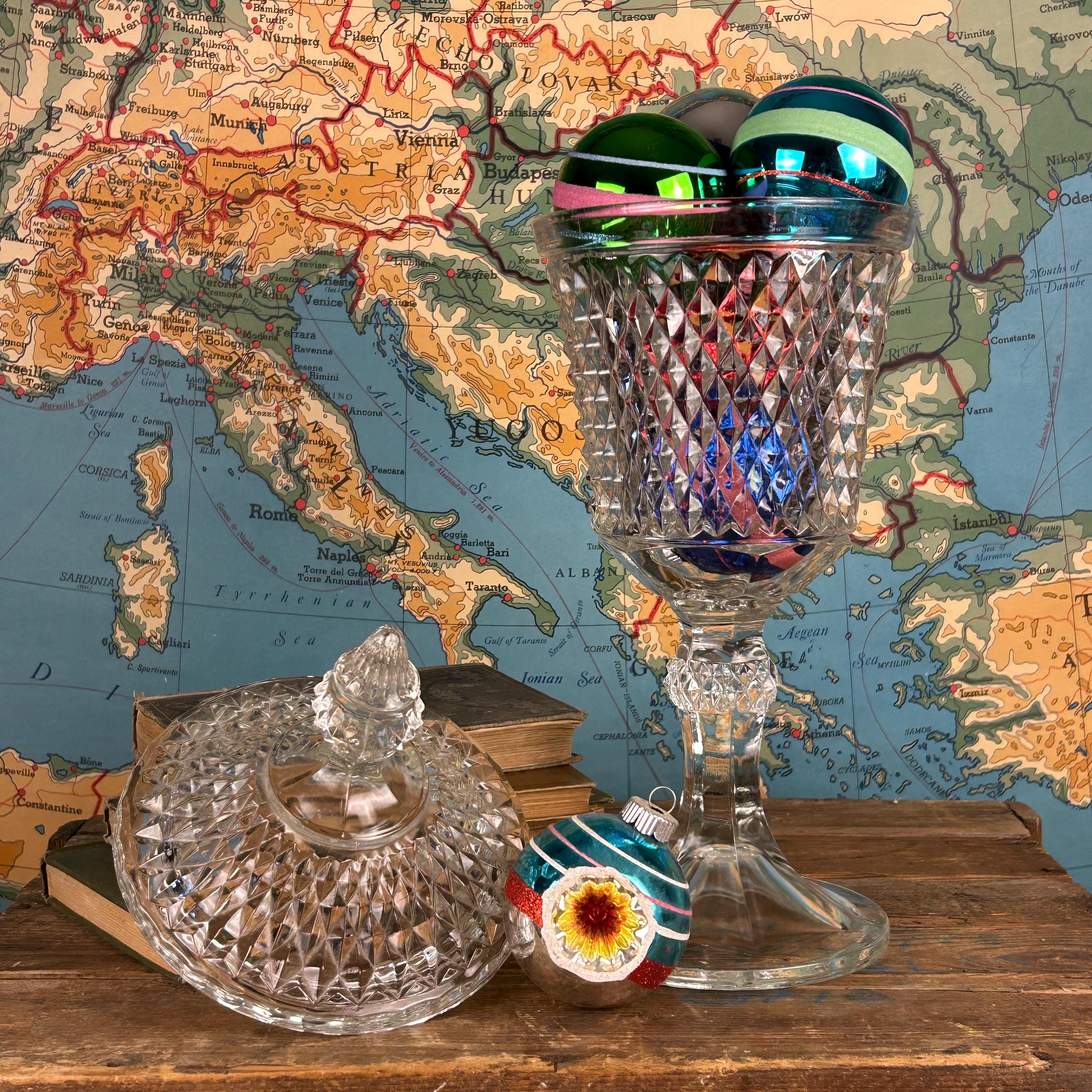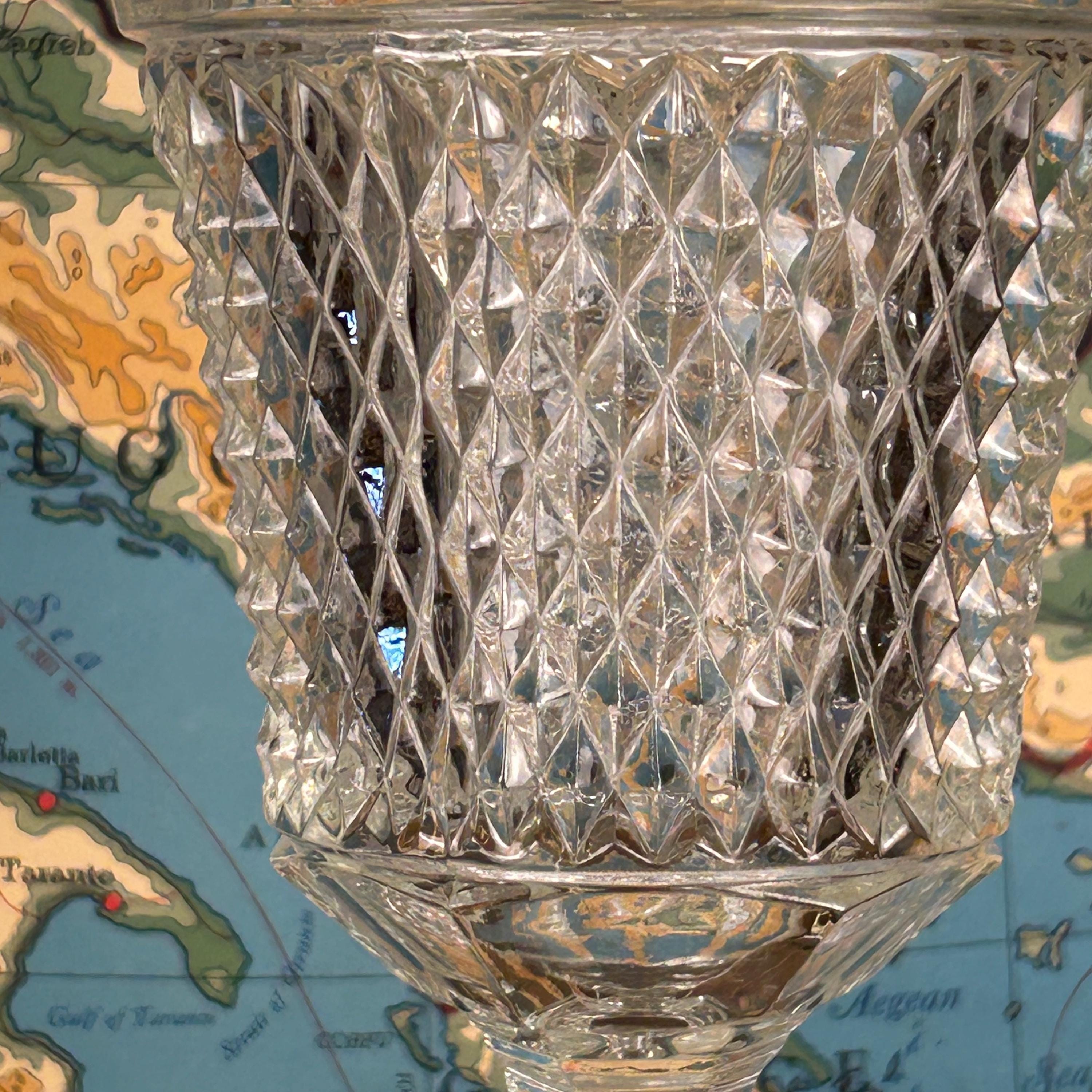 Stunning Indiana Glass Tiara Diamond Point Apothecary Vase. This lidded tall bowl is perfect for candy, decorative storage, or kitchen organization. Its elegant design adds a touch of vintage charm to any space, making it a versatile piece for showcasing your favorite treats or trinkets. Ideal for collectors or as a thoughtful gift, this exquisite vase combines functionality with timeless beauty. Don't miss out on this must-have addition to your décor! This would be a fun way to store coffee beans at the family coffee station. Or to just pretty up your kitchen space.