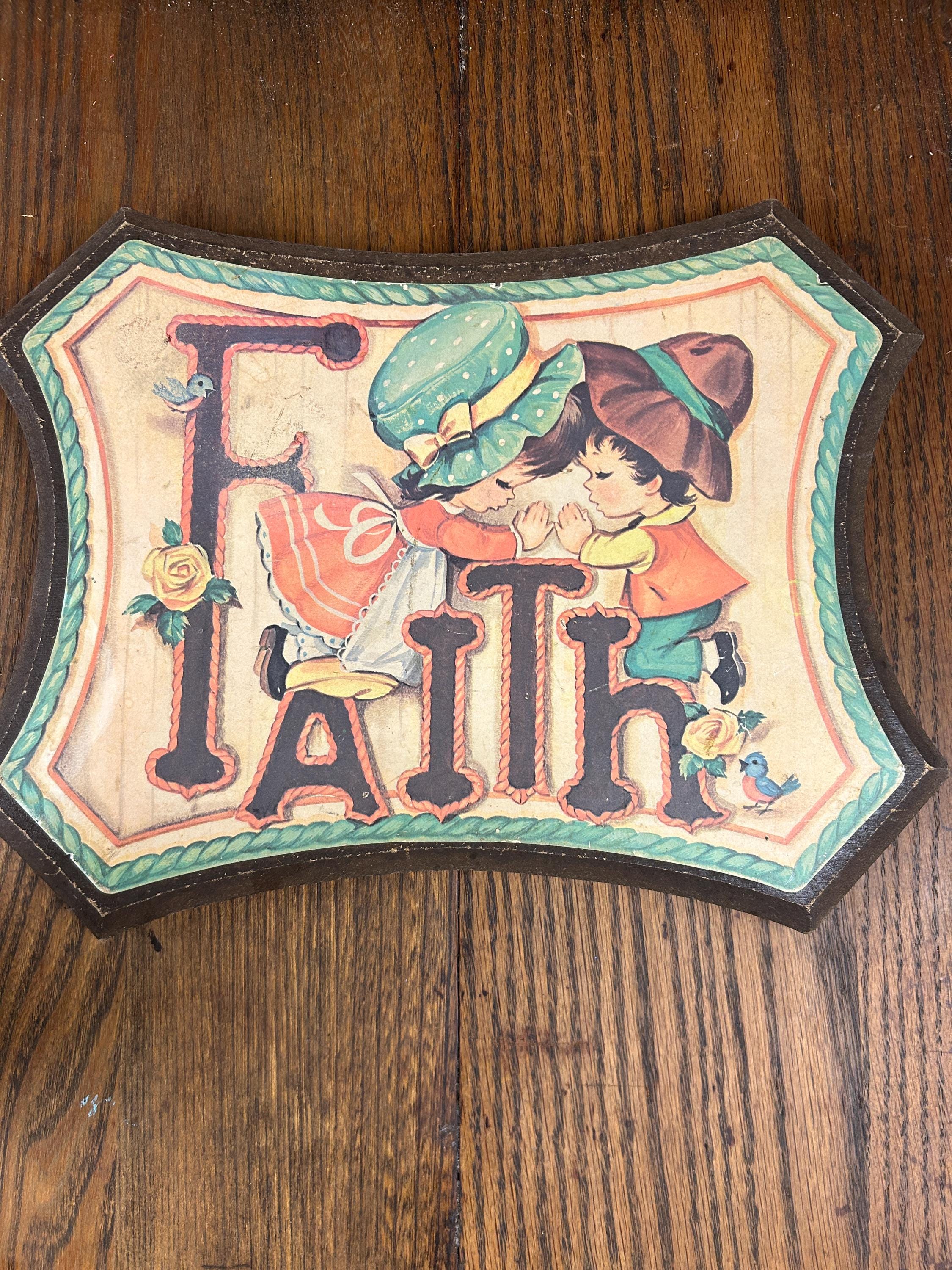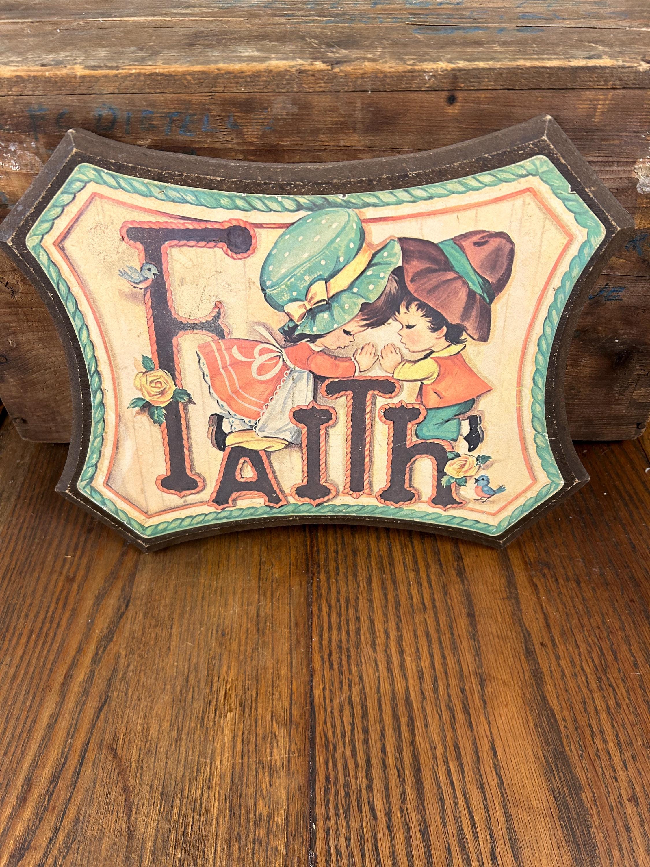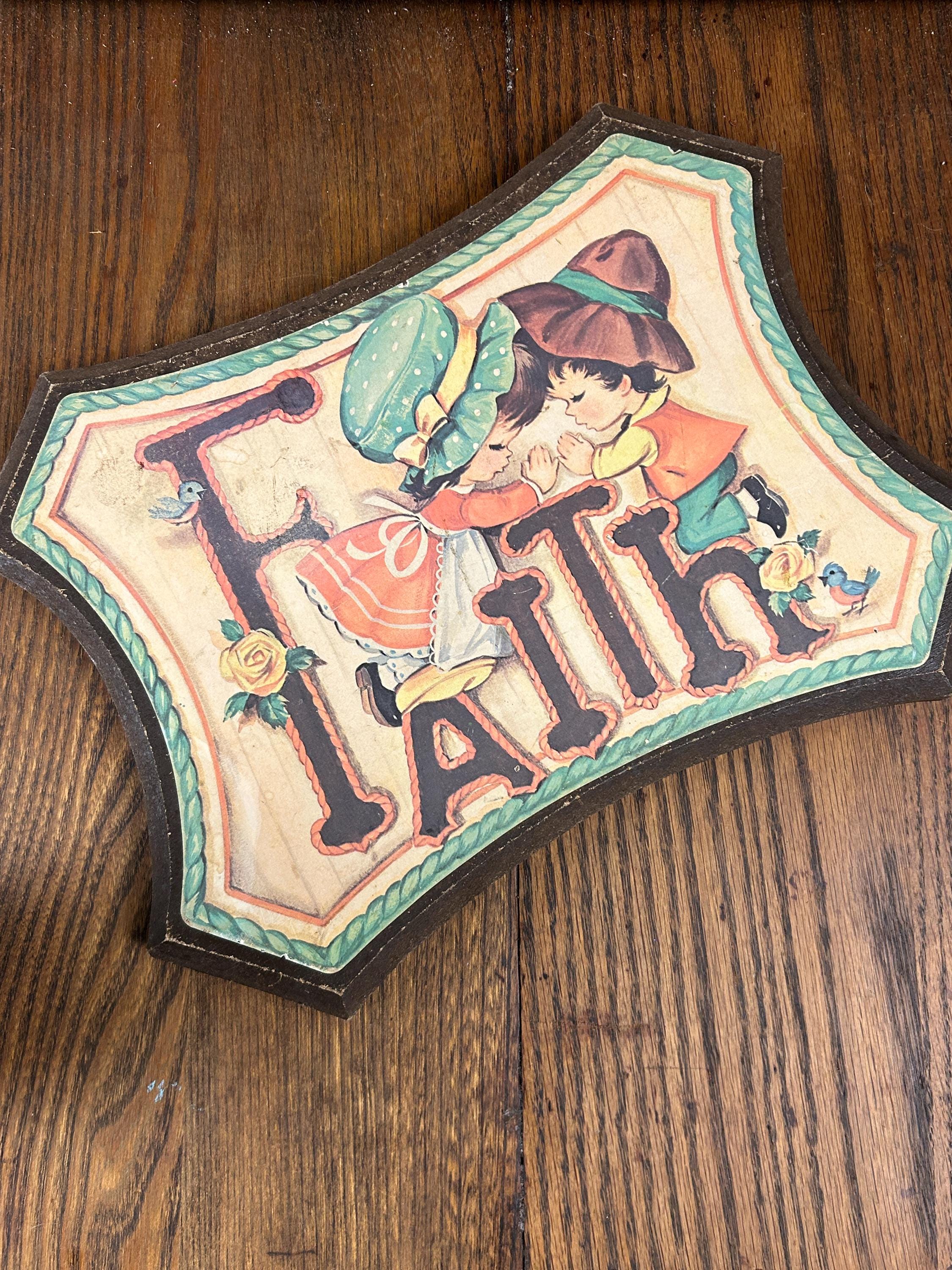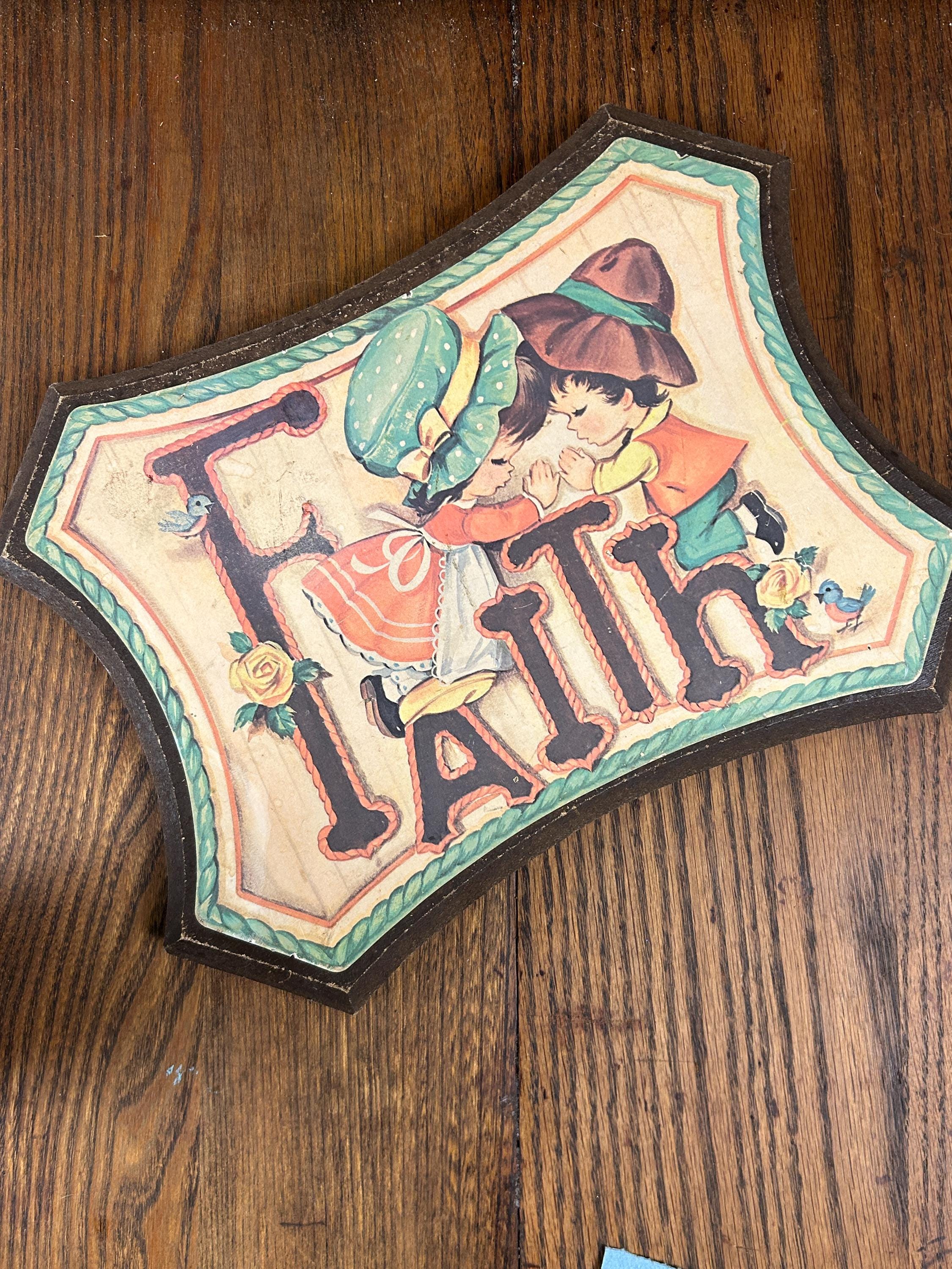 Such an adorable piece from the 70s. In good vintage condition with some wear on edges and a faint soiled area next to the top of the F. Graphic is securely adhered to the wooden surface. Adorable little boy and girl in prayer kneeling on the Faith. Accompanied by two little robins and two yellow roses. Perfect cottagecore kitsch!