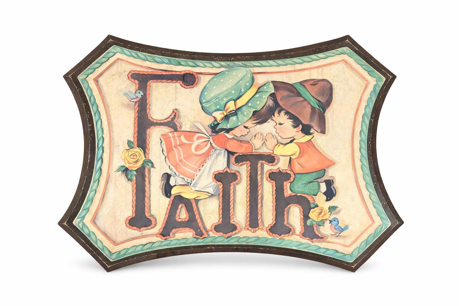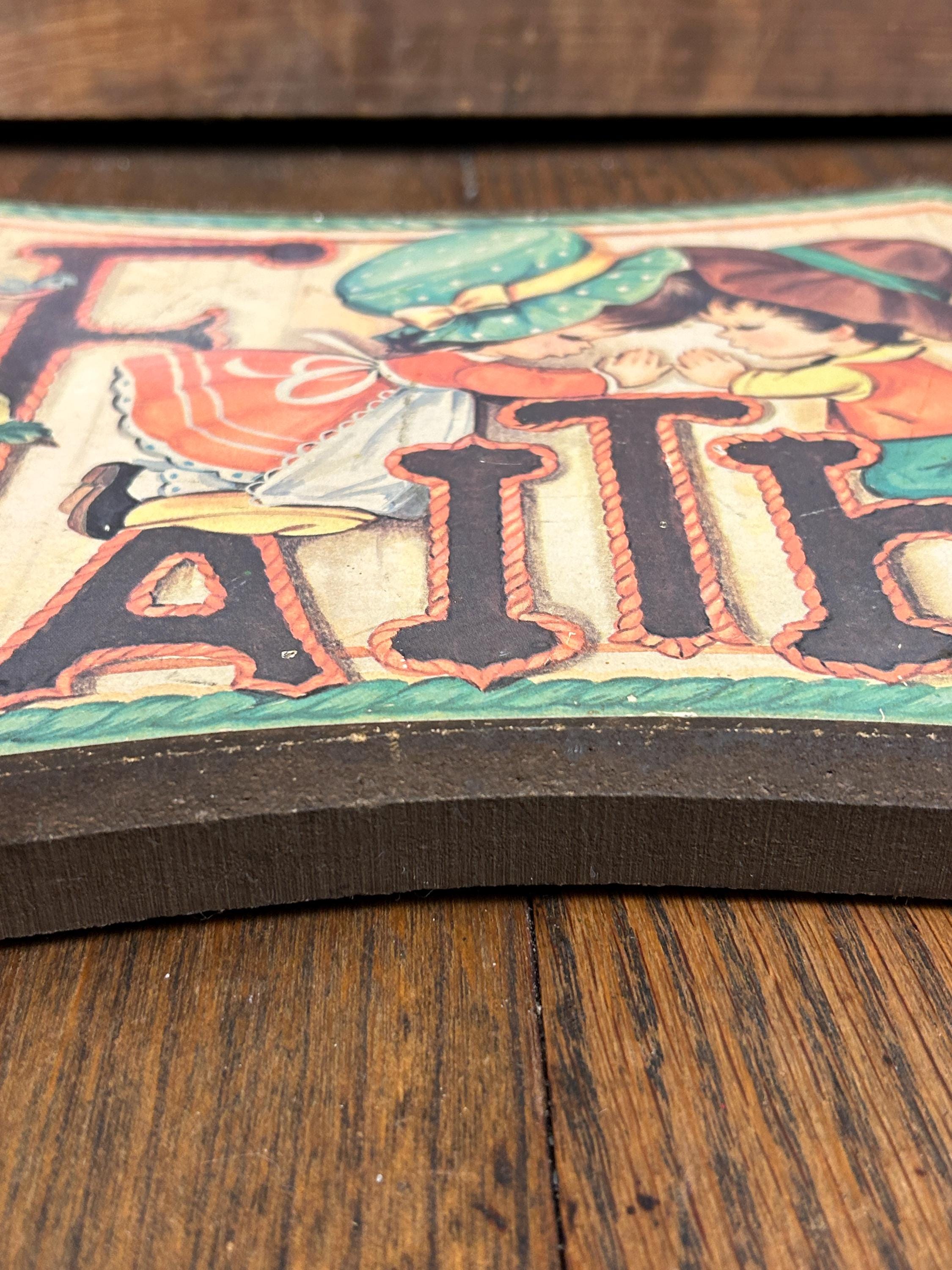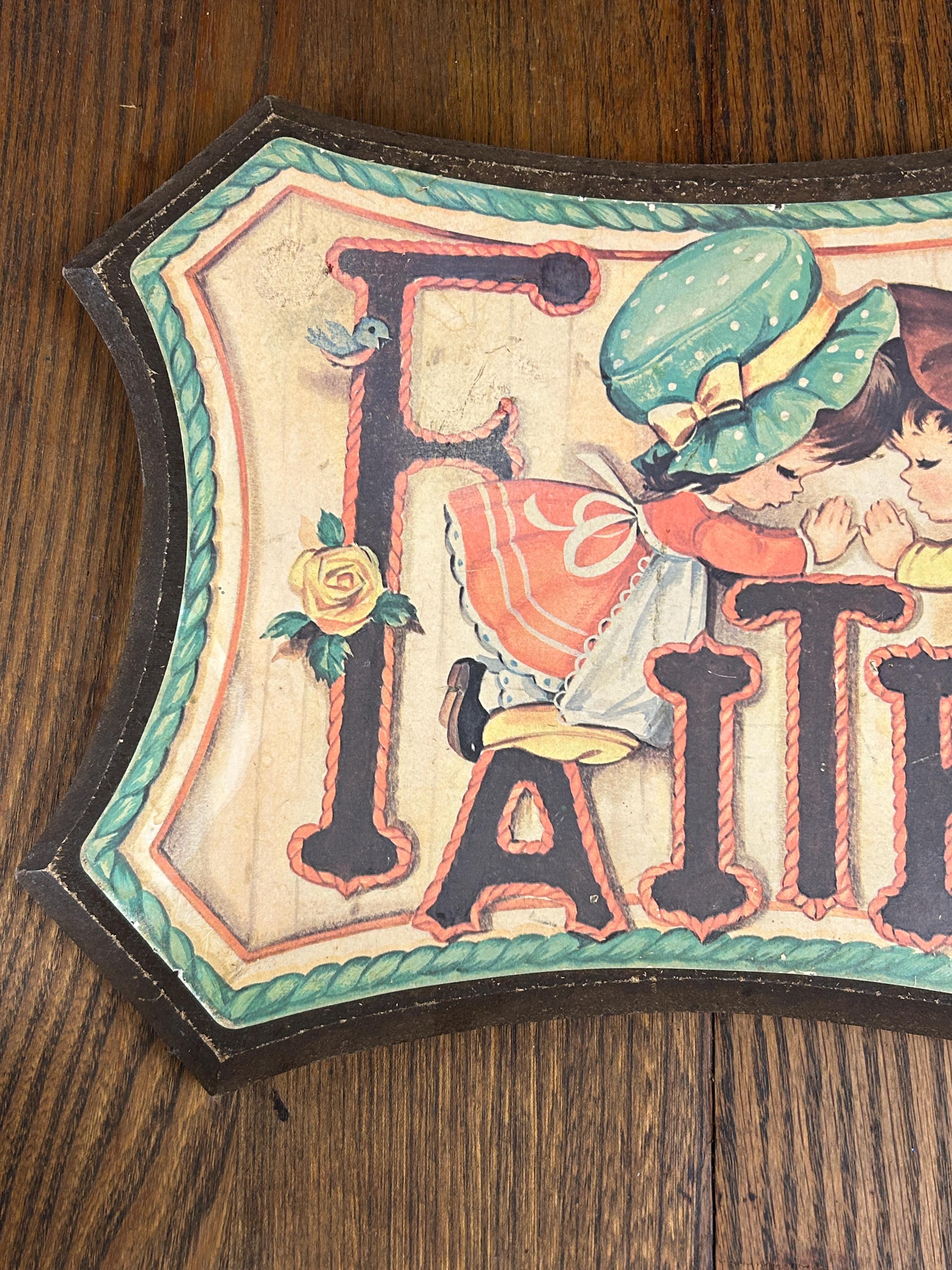 Such an adorable piece from the 70s. In good vintage condition with some wear on edges and a faint soiled area next to the top of the F. Graphic is securely adhered to the wooden surface. Adorable little boy and girl in prayer kneeling on the Faith. Accompanied by two little robins and two yellow roses. Perfect cottagecore kitsch!