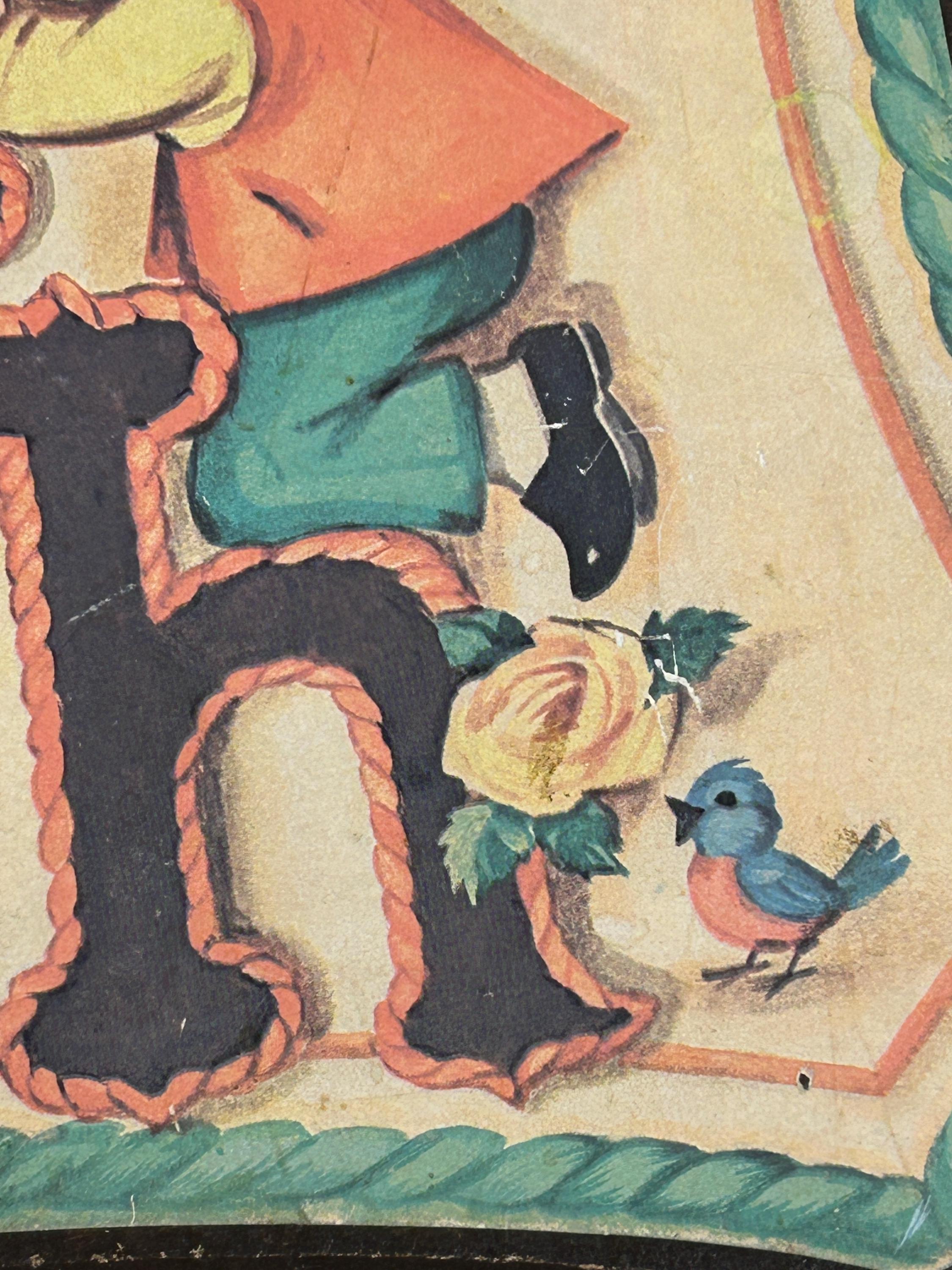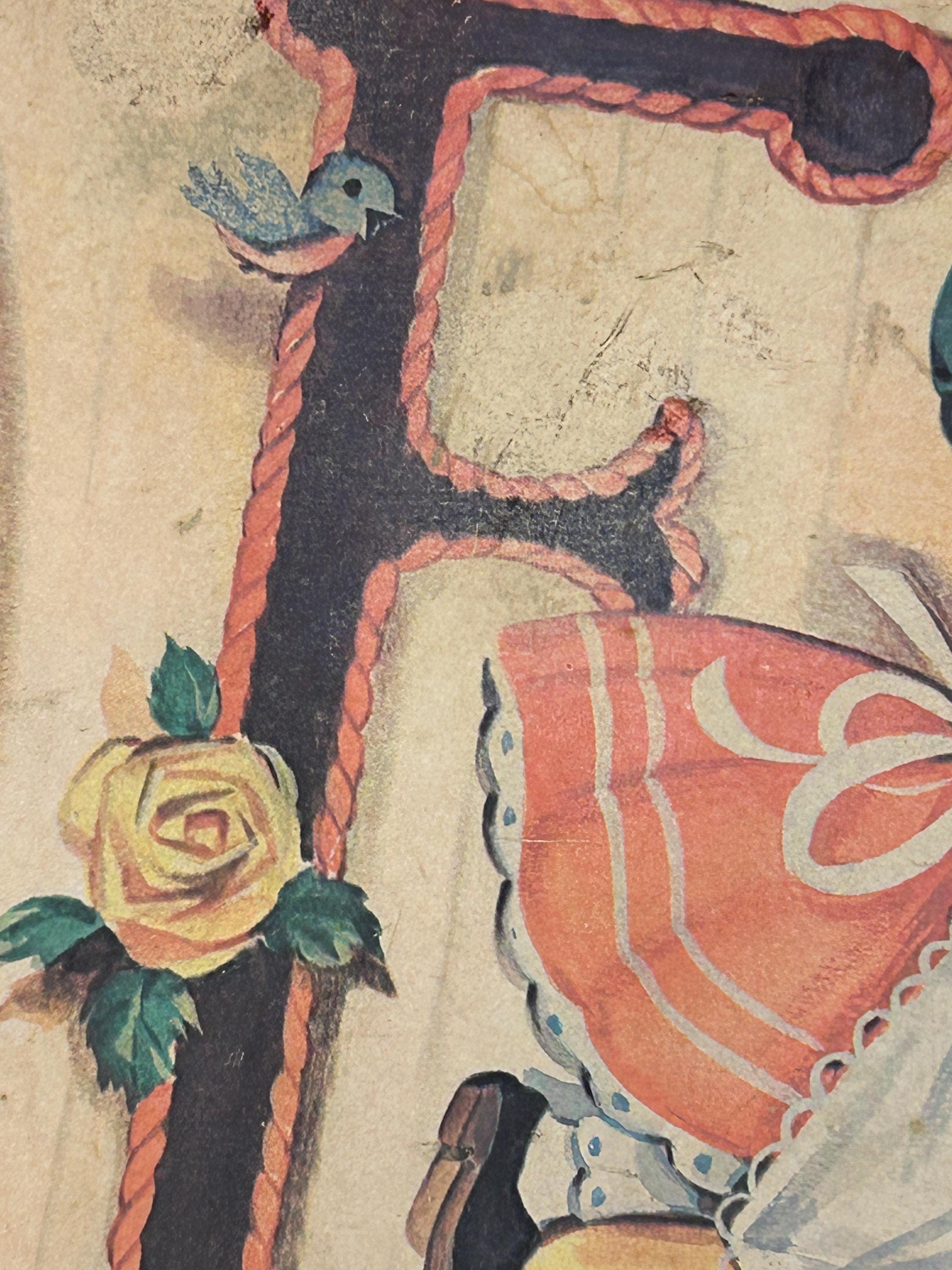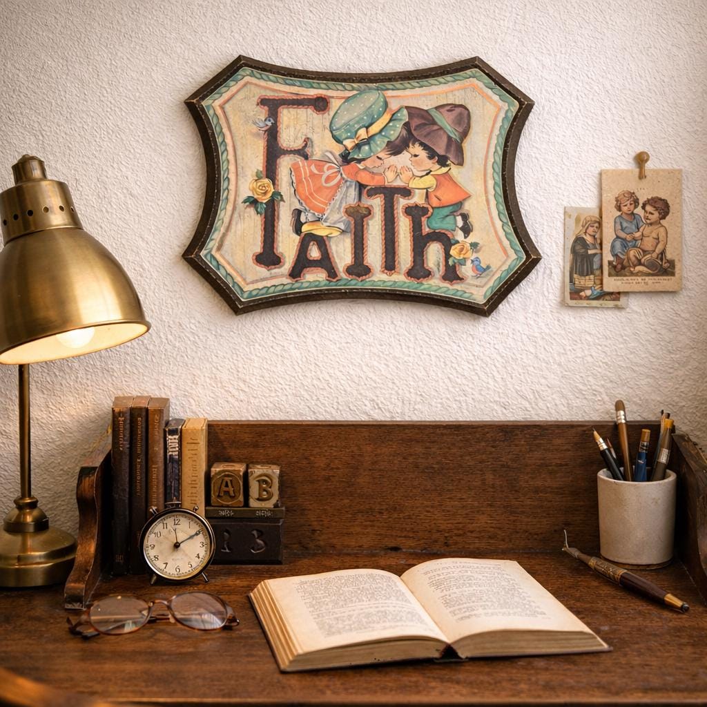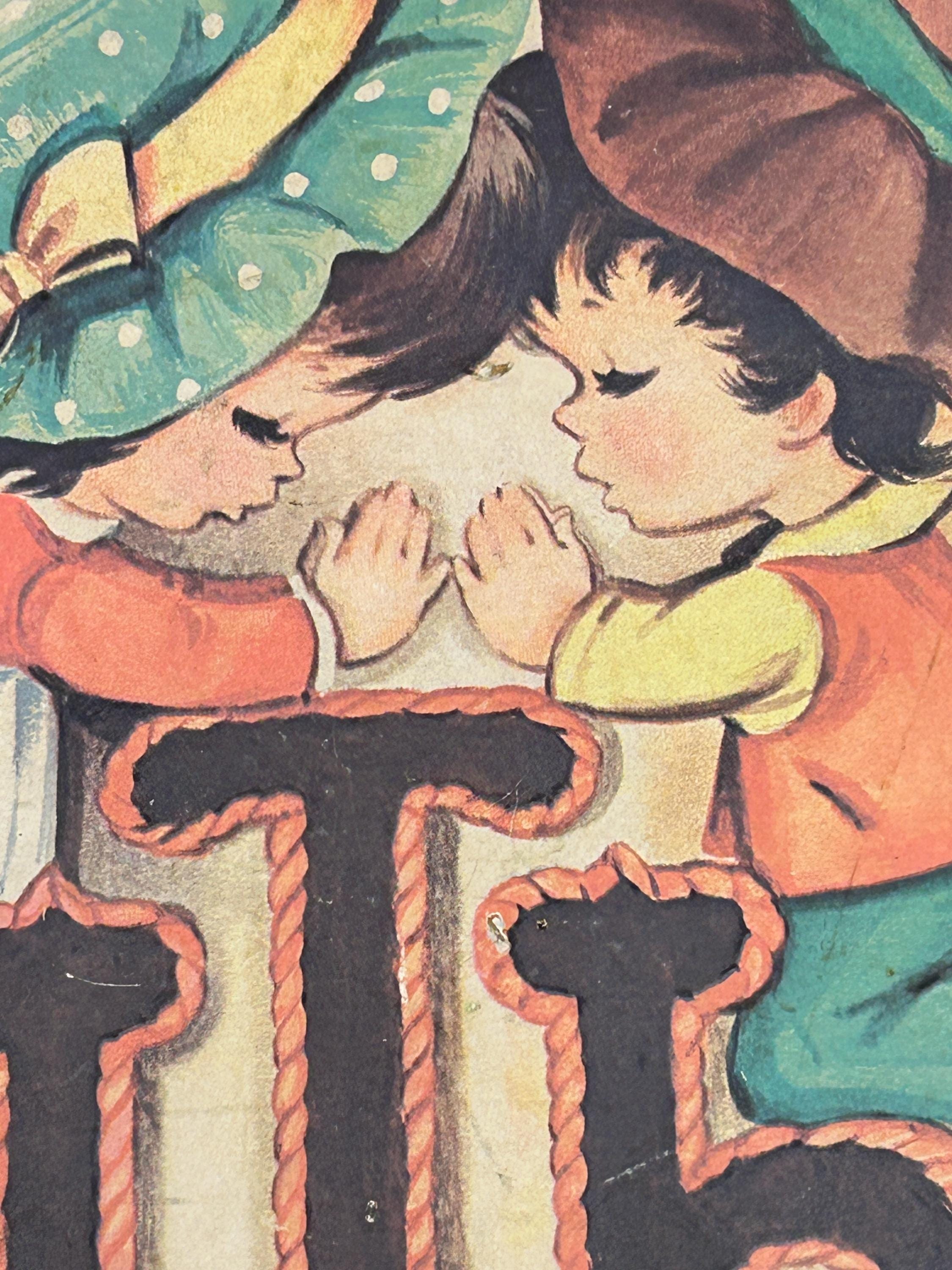 Such an adorable piece from the 70s. In good vintage condition with some wear on edges and a faint soiled area next to the top of the F. Graphic is securely adhered to the wooden surface. Adorable little boy and girl in prayer kneeling on the Faith. Accompanied by two little robins and two yellow roses. Perfect cottagecore kitsch!