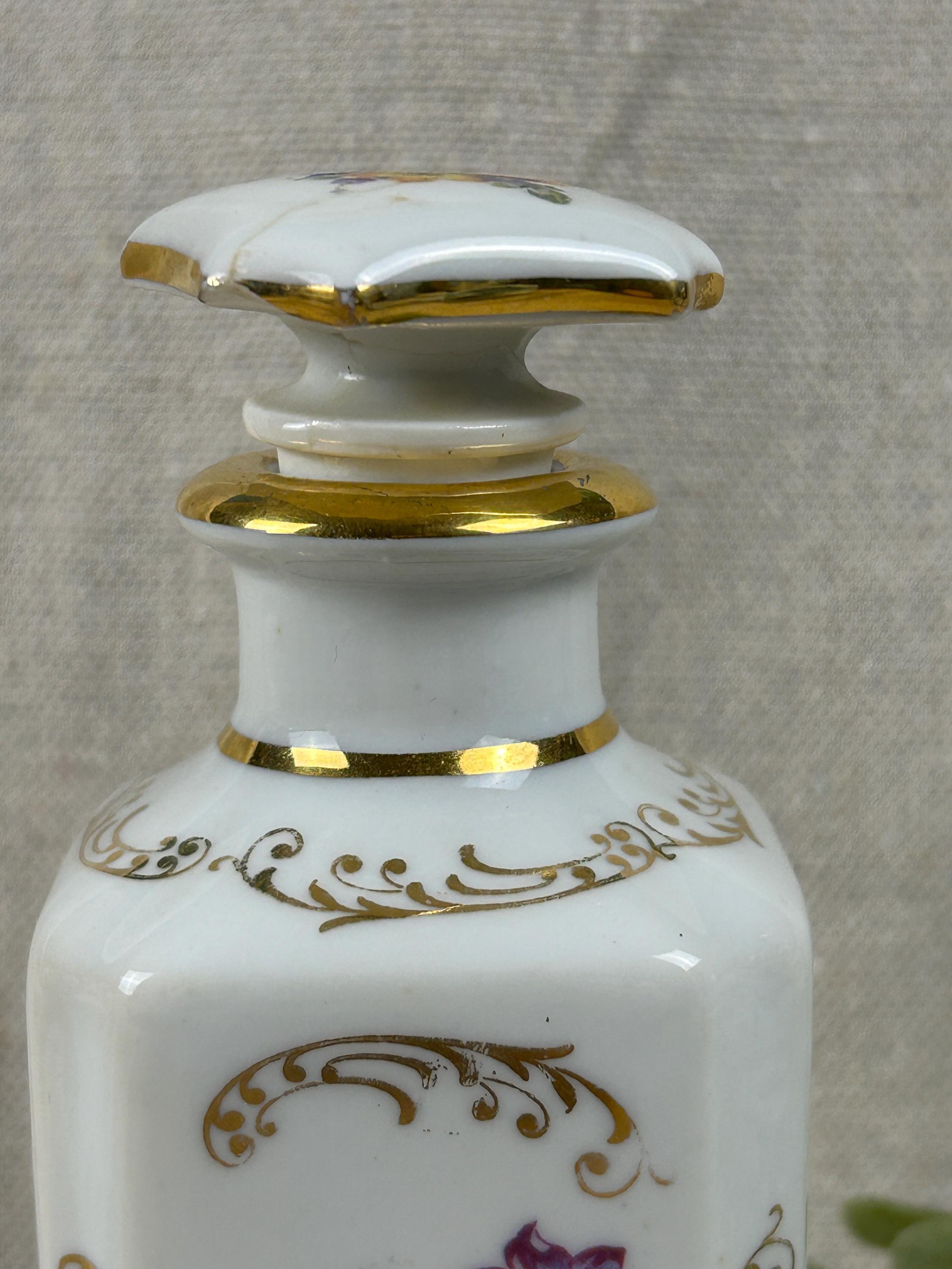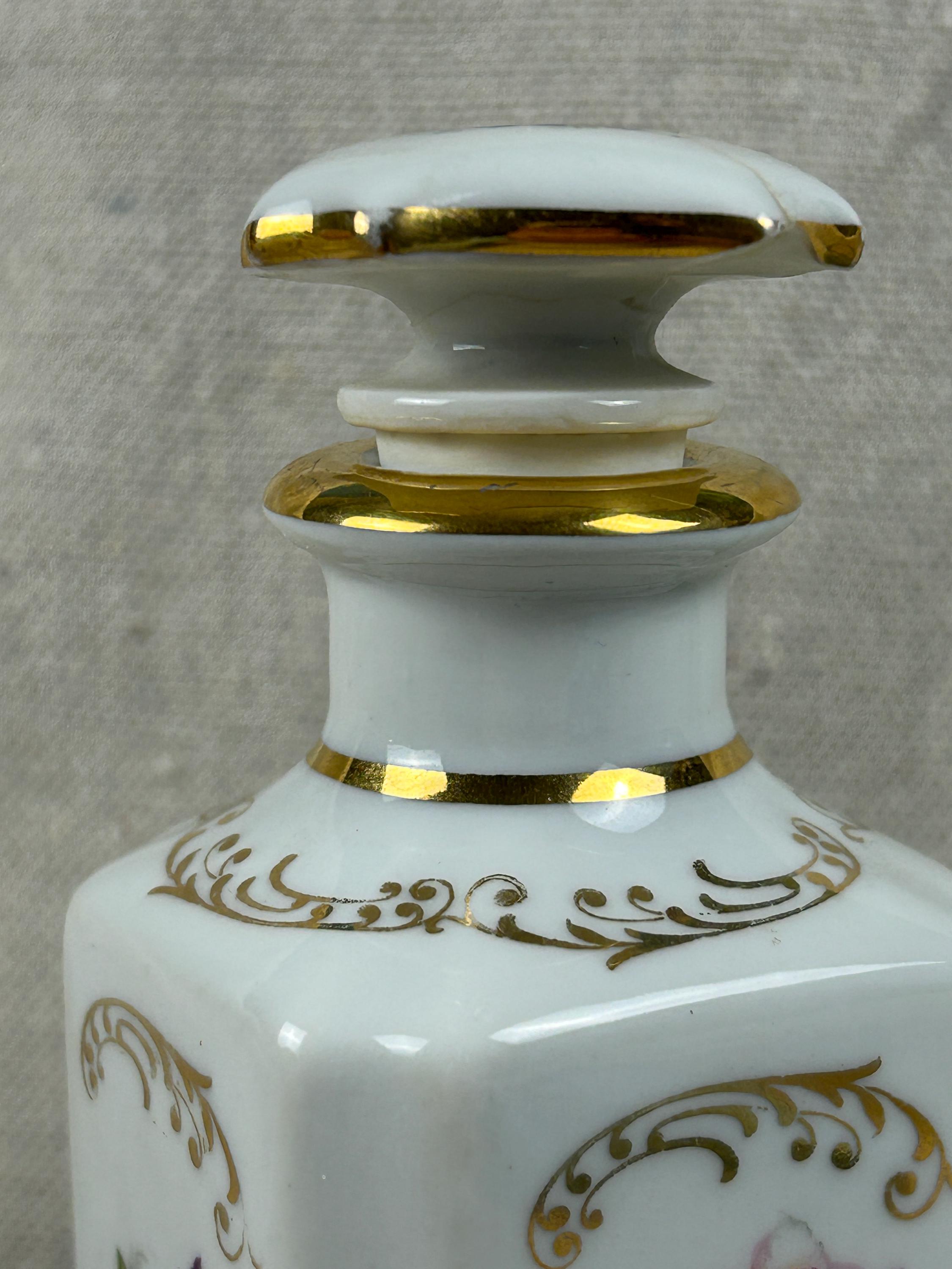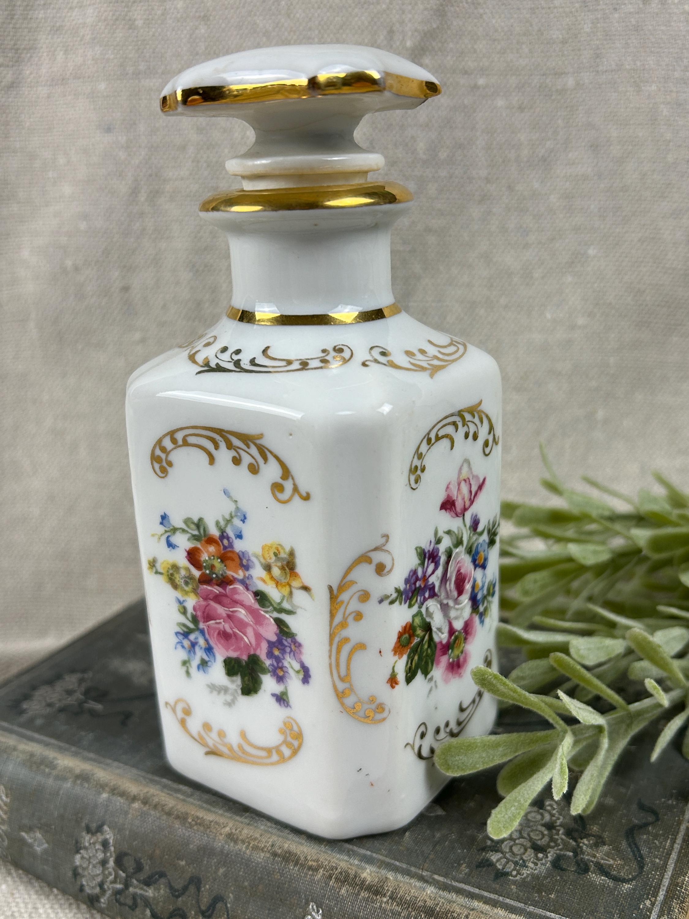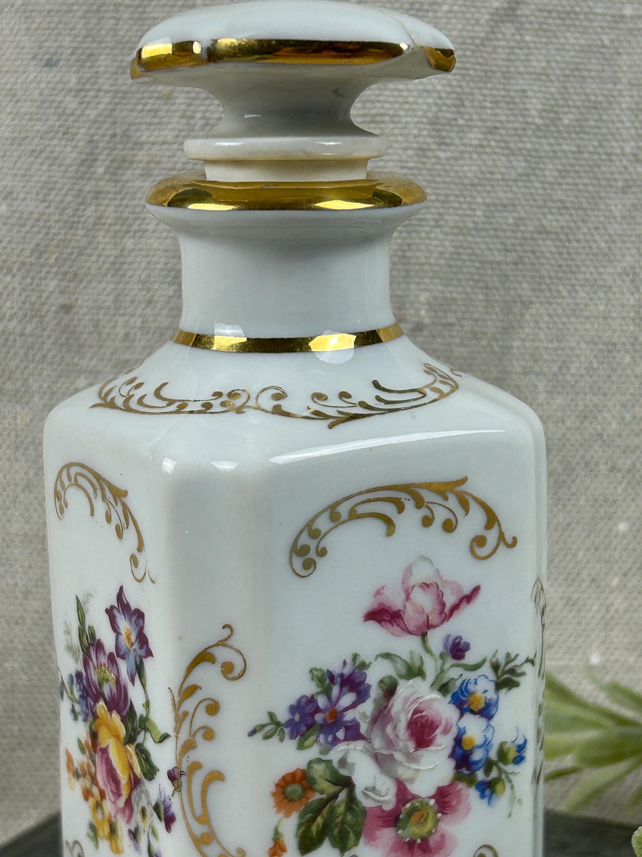 THis is a beautiful vintage porcelain perfume bottle, from the Limoges region of France. This bottle is hand-painted and features delicate floral designs with gold accents. Colors are clear and bright, not noticeable paint loss, excellent condition, with a hairline crack on the top of stopper. Otherwise, fabulous condition.