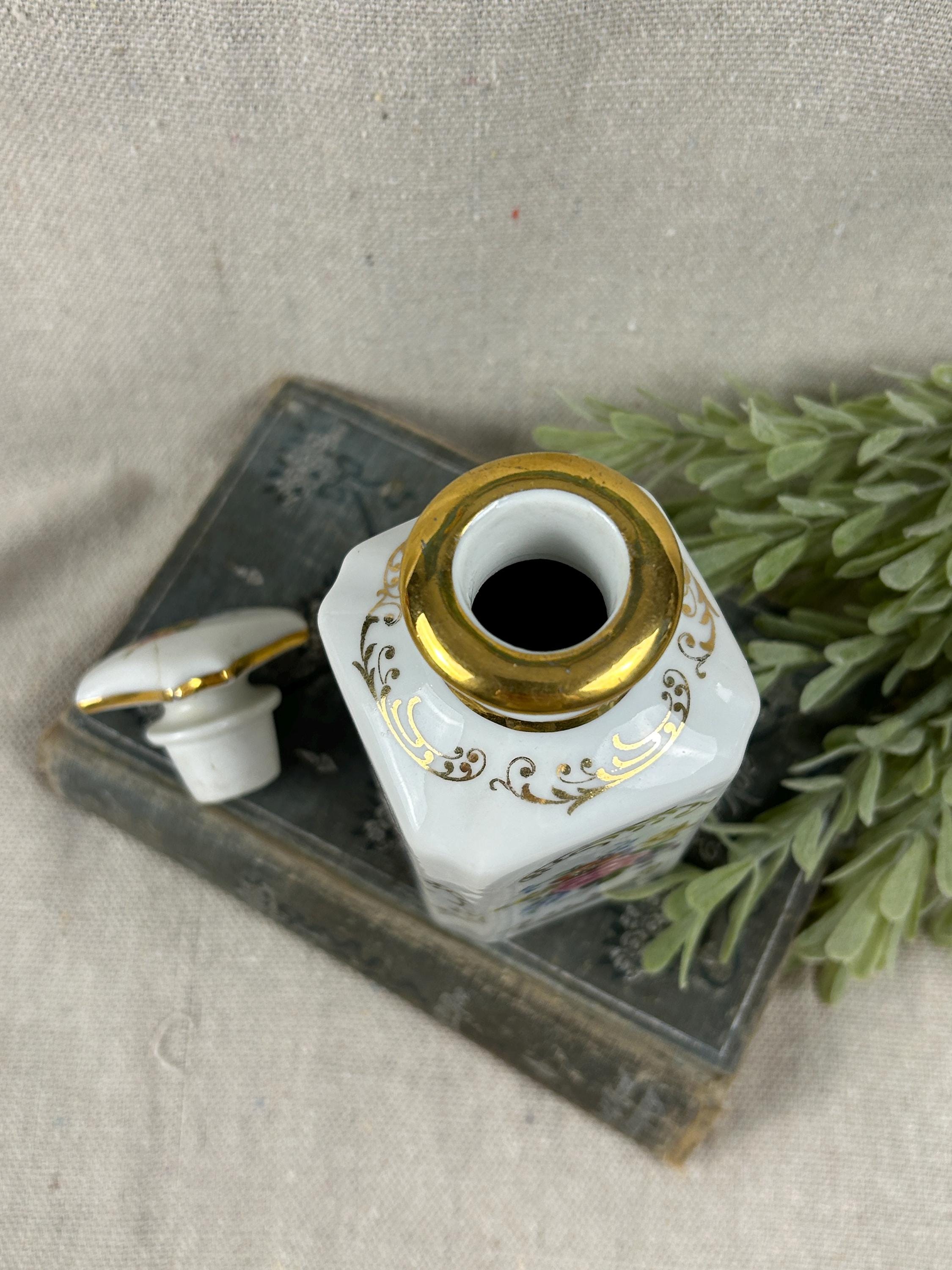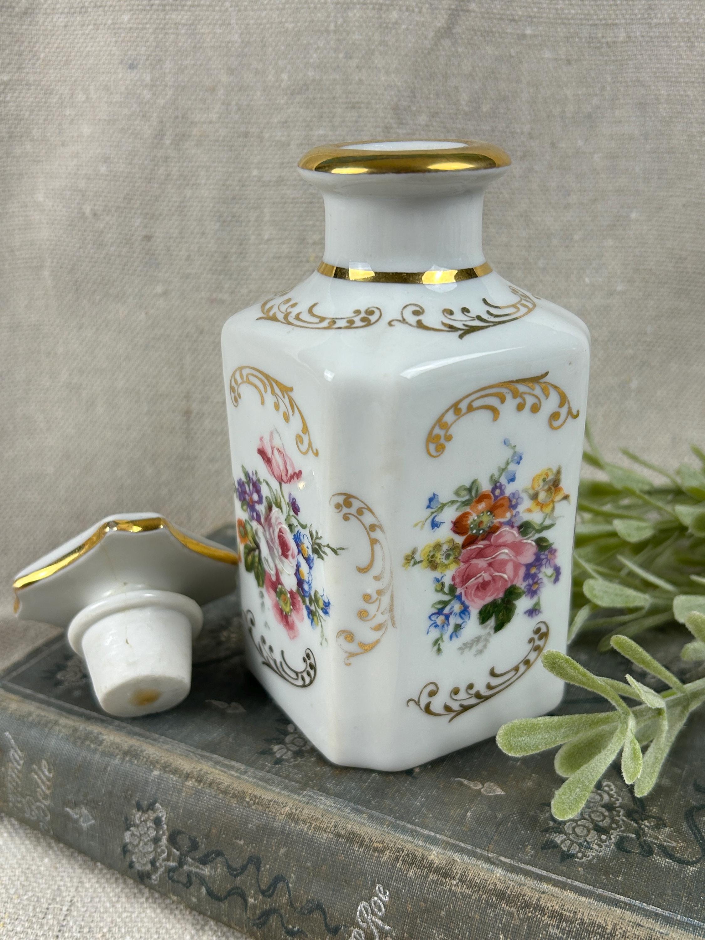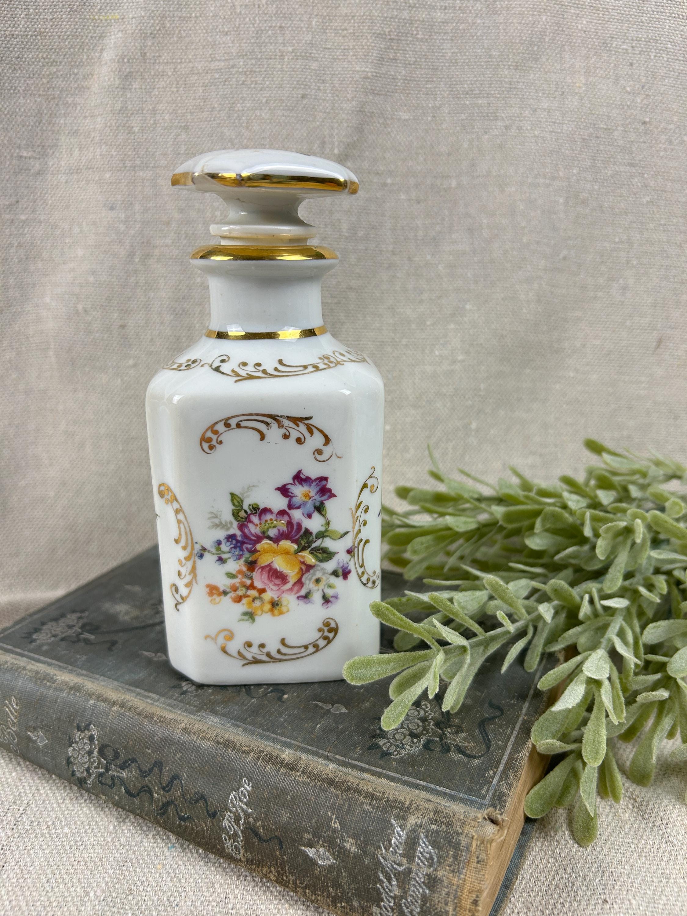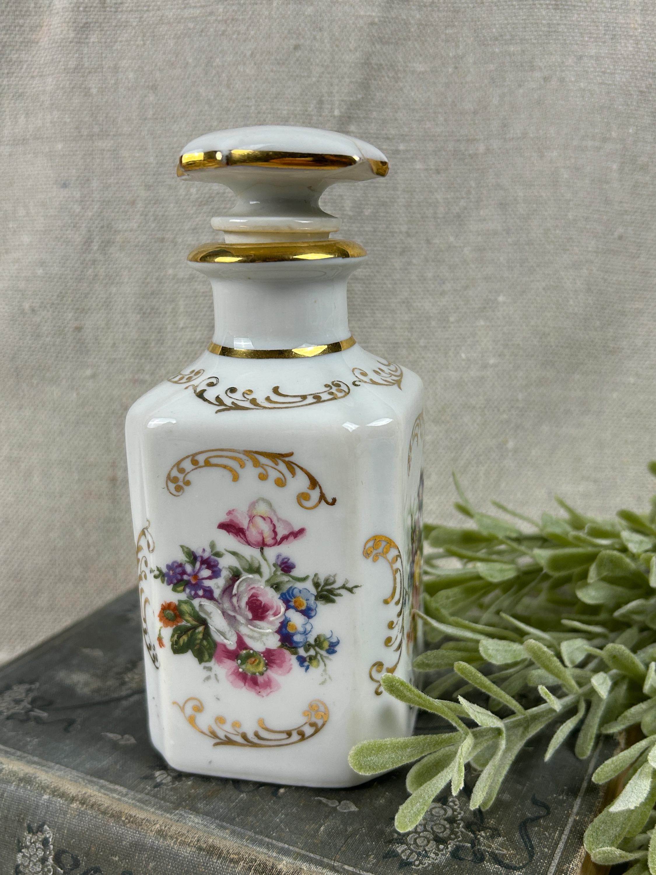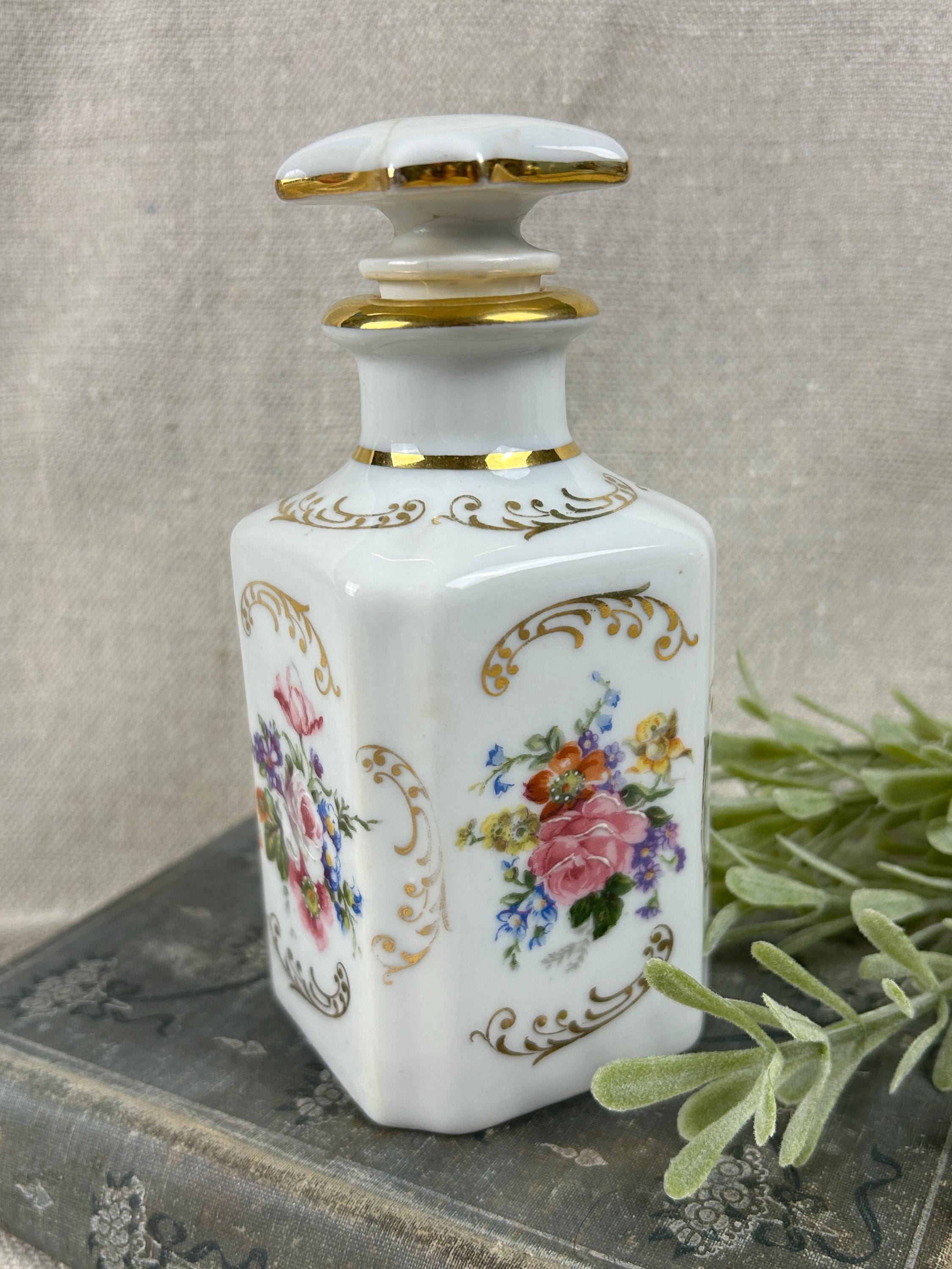 THis is a beautiful vintage porcelain perfume bottle, from the Limoges region of France. This bottle is hand-painted and features delicate floral designs with gold accents. Colors are clear and bright, not noticeable paint loss, excellent condition, with a hairline crack on the top of stopper. Otherwise, fabulous condition.