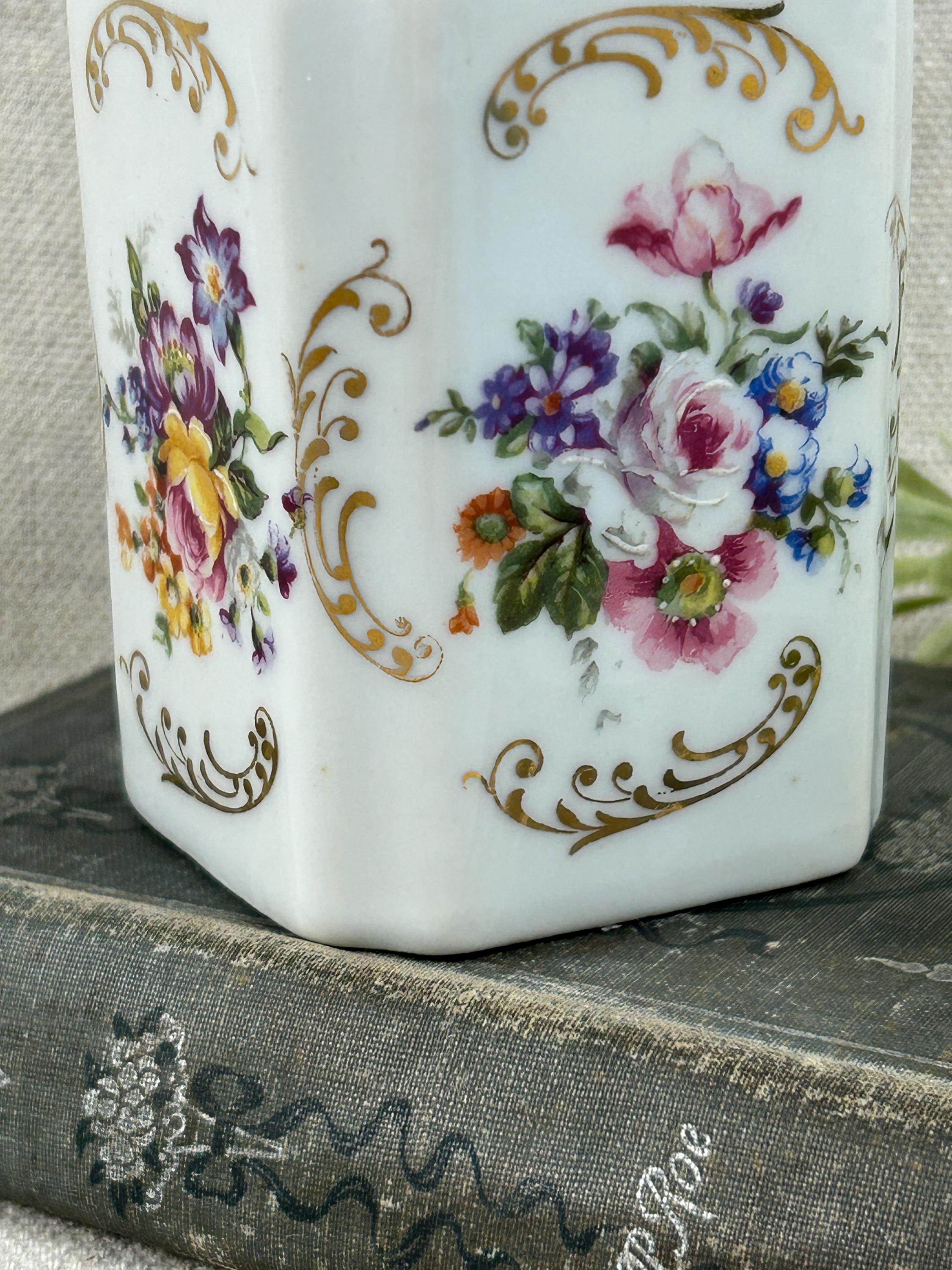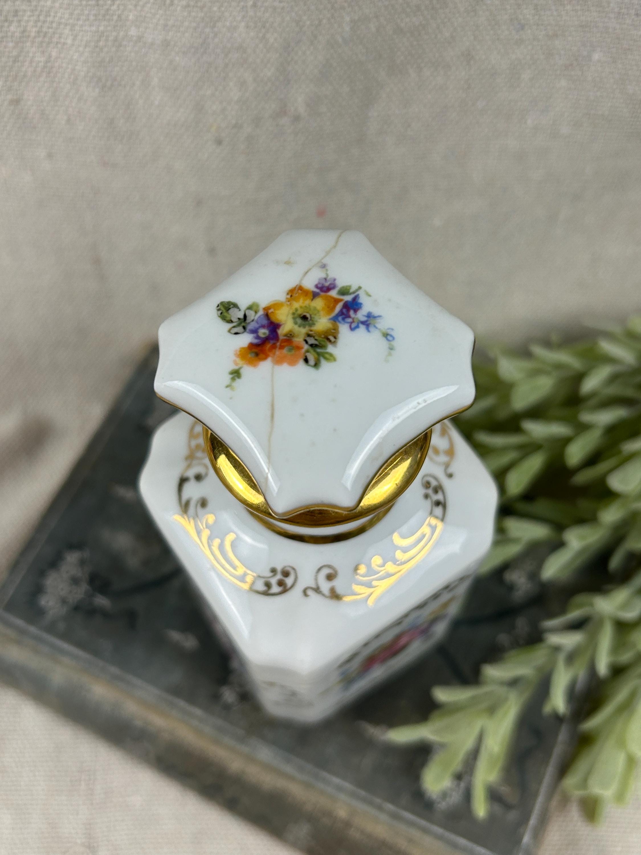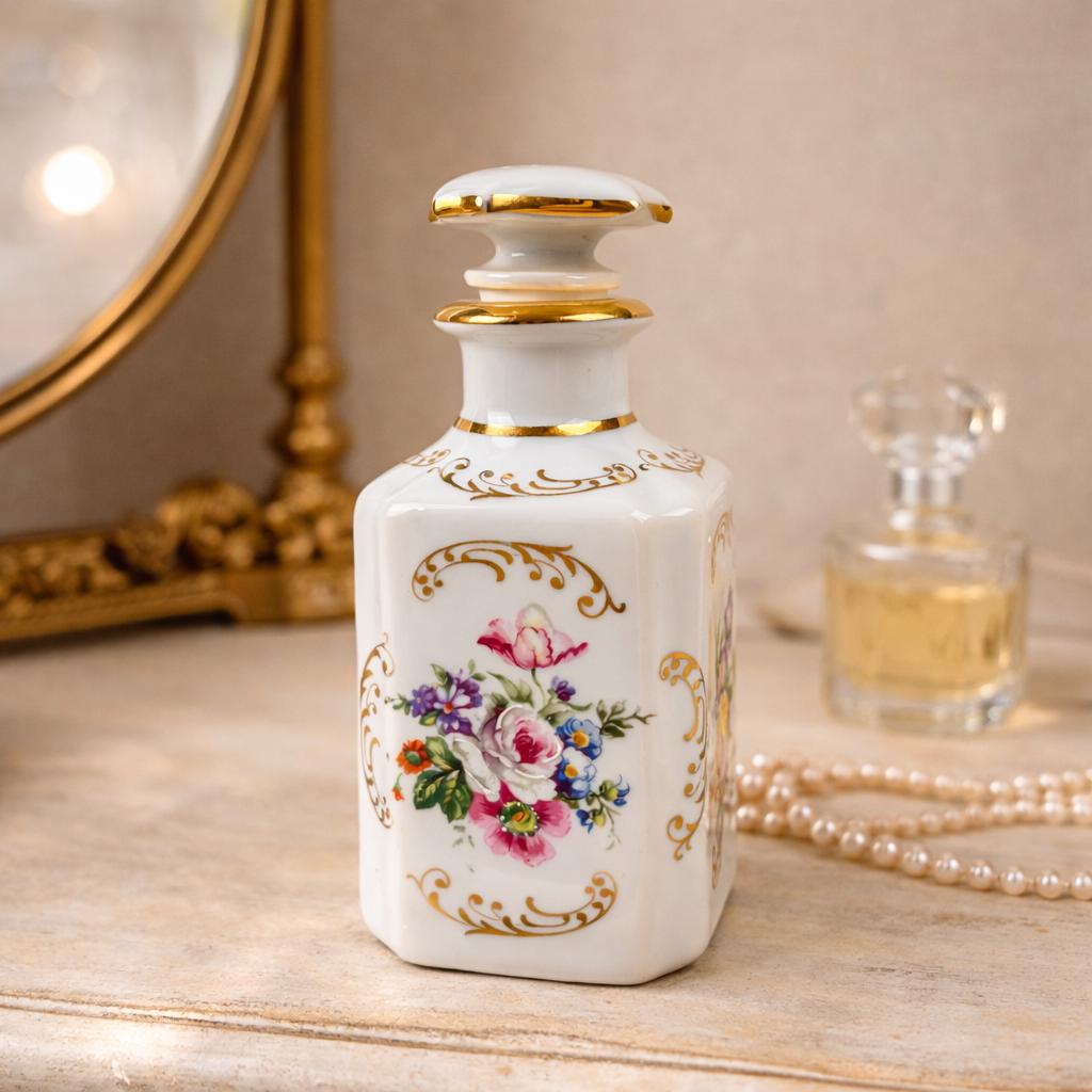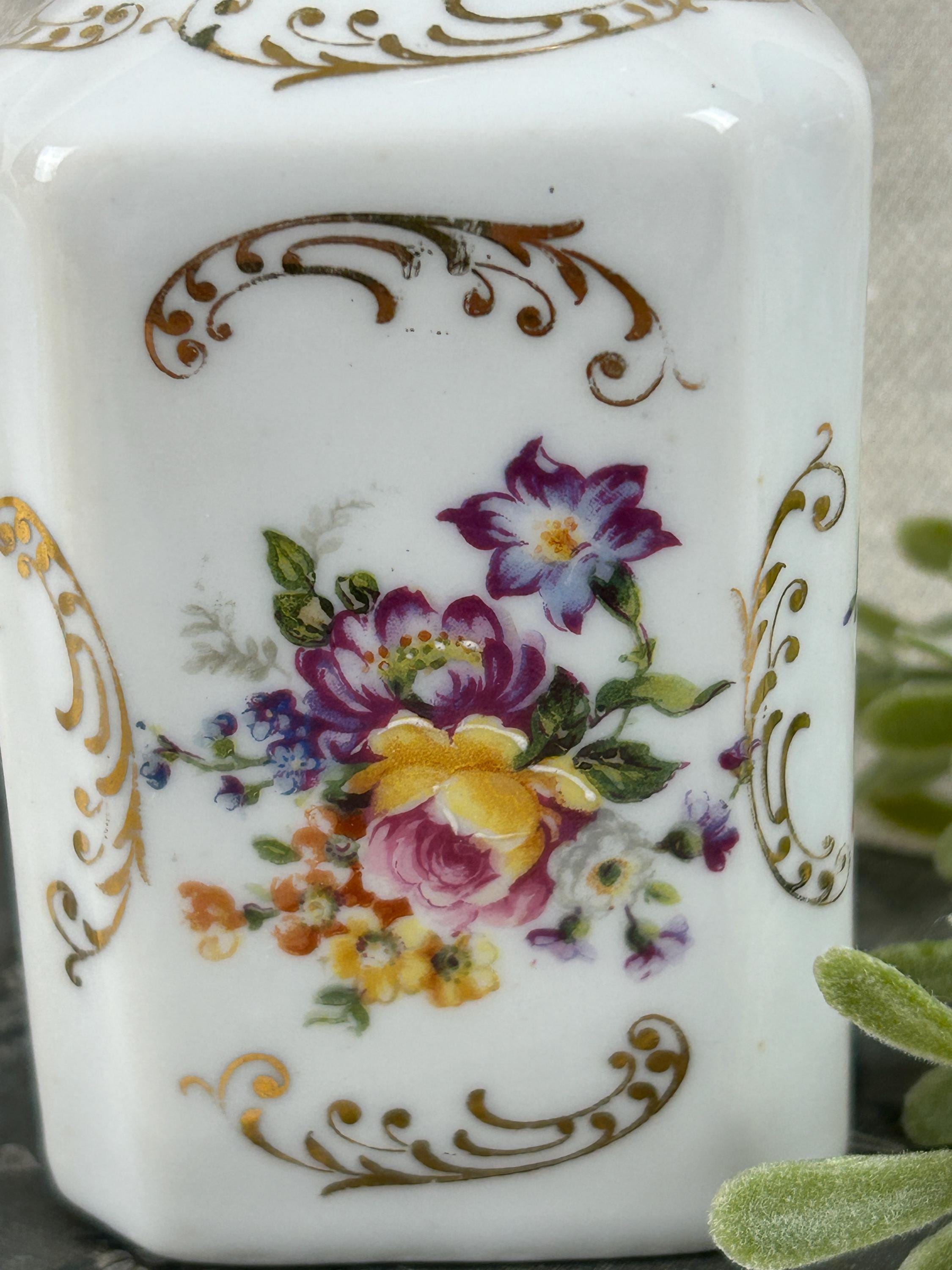 THis is a beautiful vintage porcelain perfume bottle, from the Limoges region of France. This bottle is hand-painted and features delicate floral designs with gold accents. Colors are clear and bright, not noticeable paint loss, excellent condition, with a hairline crack on the top of stopper. Otherwise, fabulous condition.