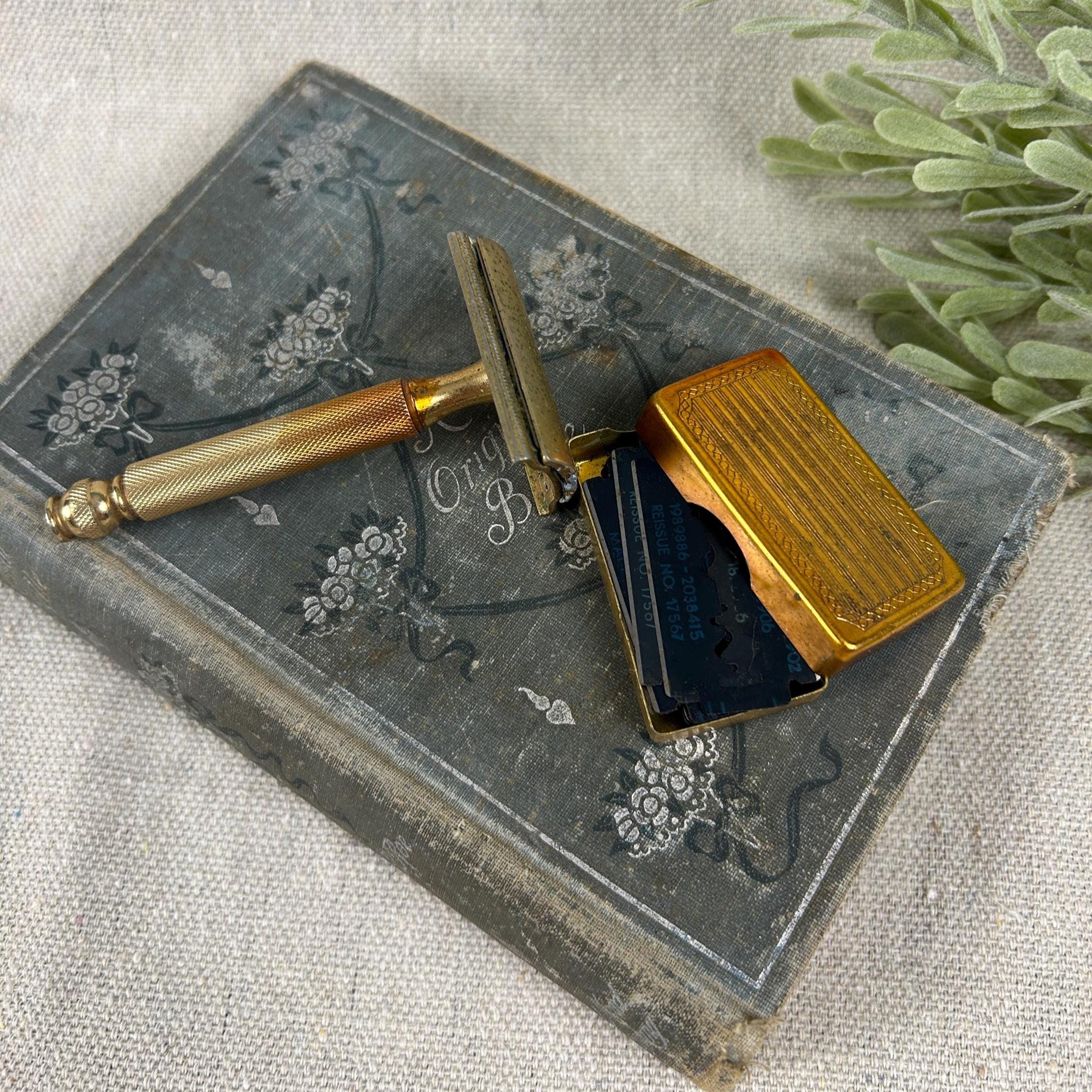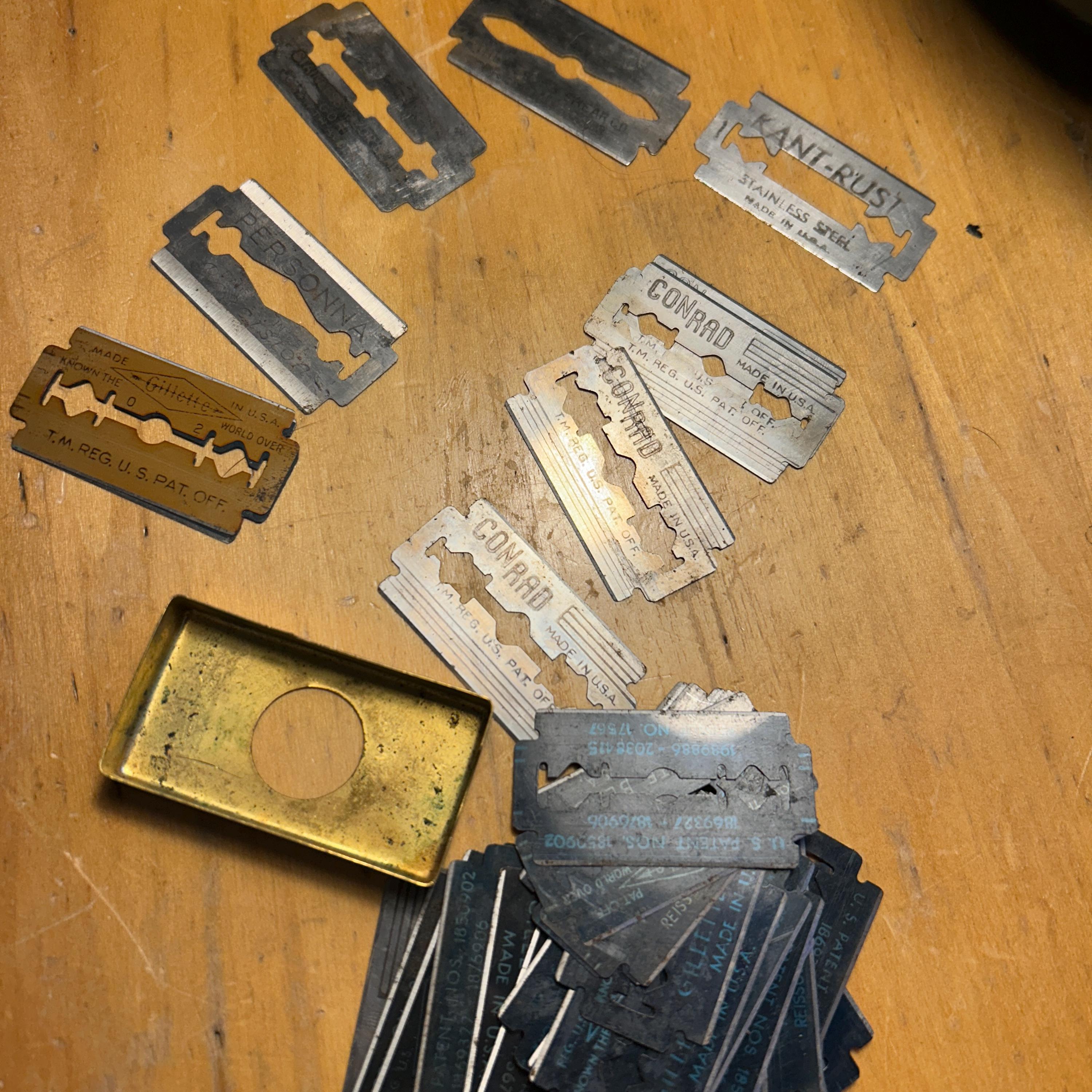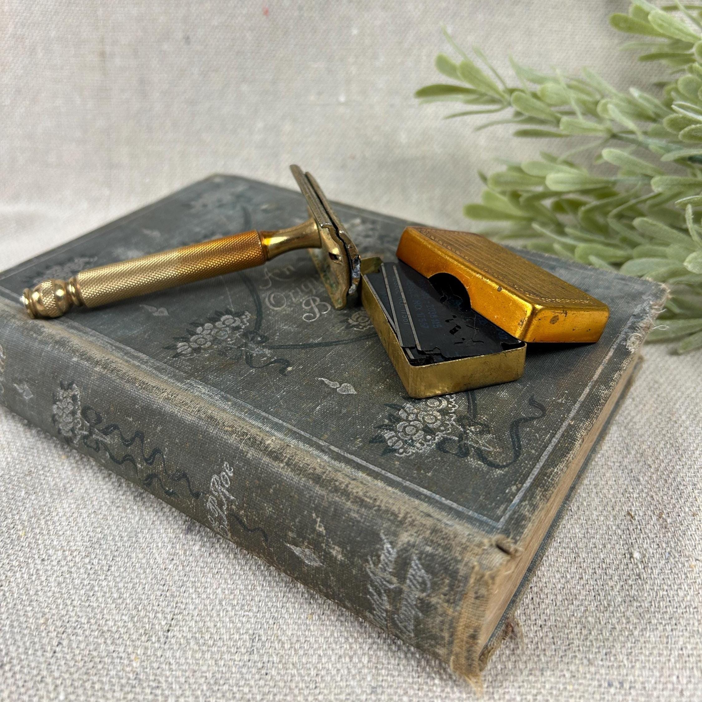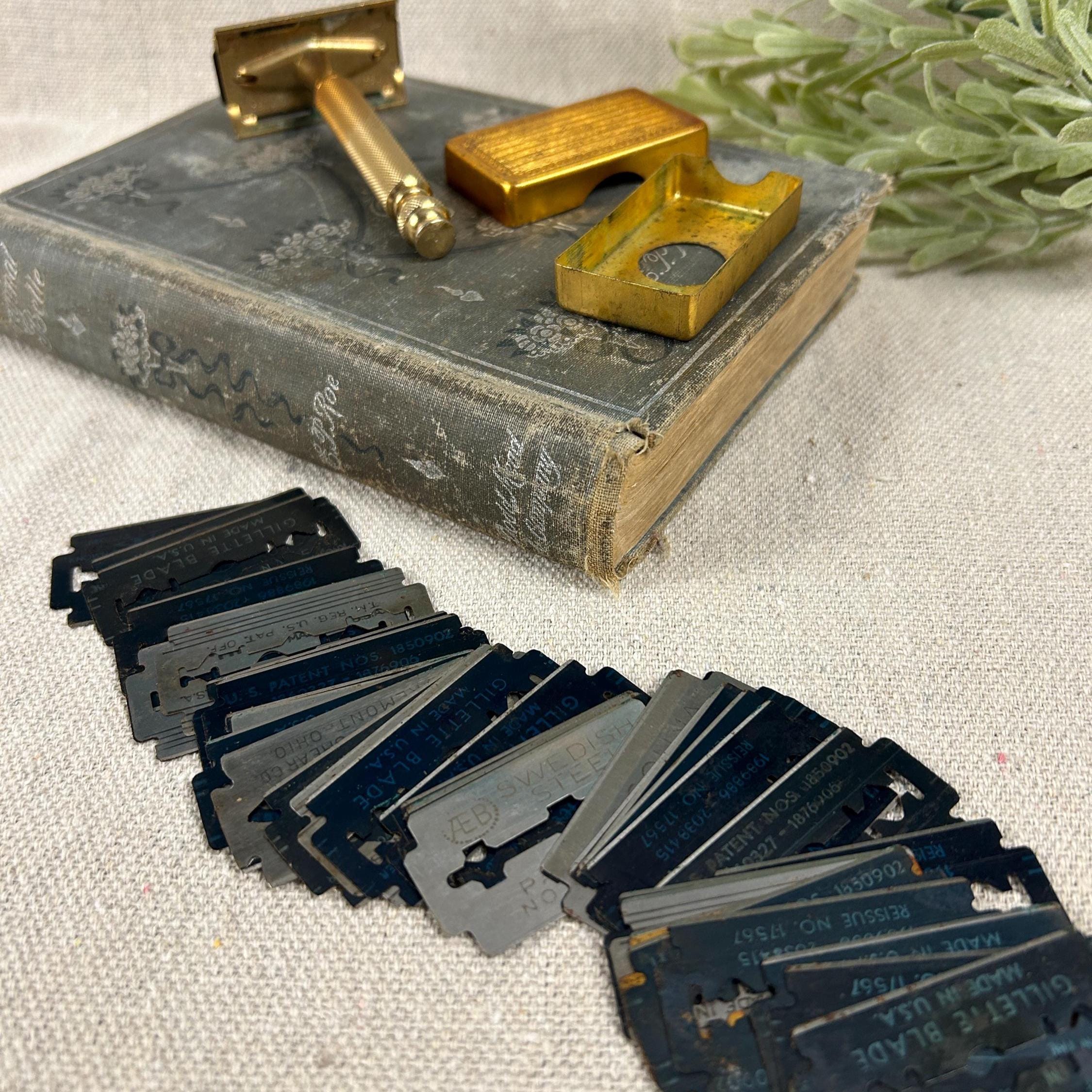 The set includes the razor and a matching gold-toned case full of 45 vintage blades. Blades include Personna, Gillette, Conrad, Excalibur, Kant-Rust, and Clauss.