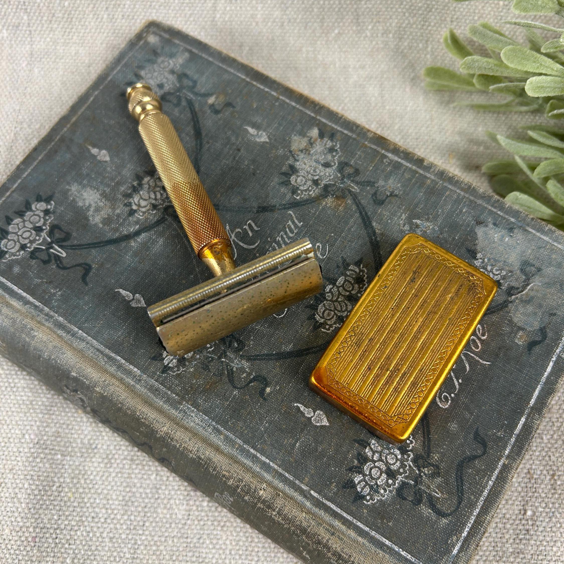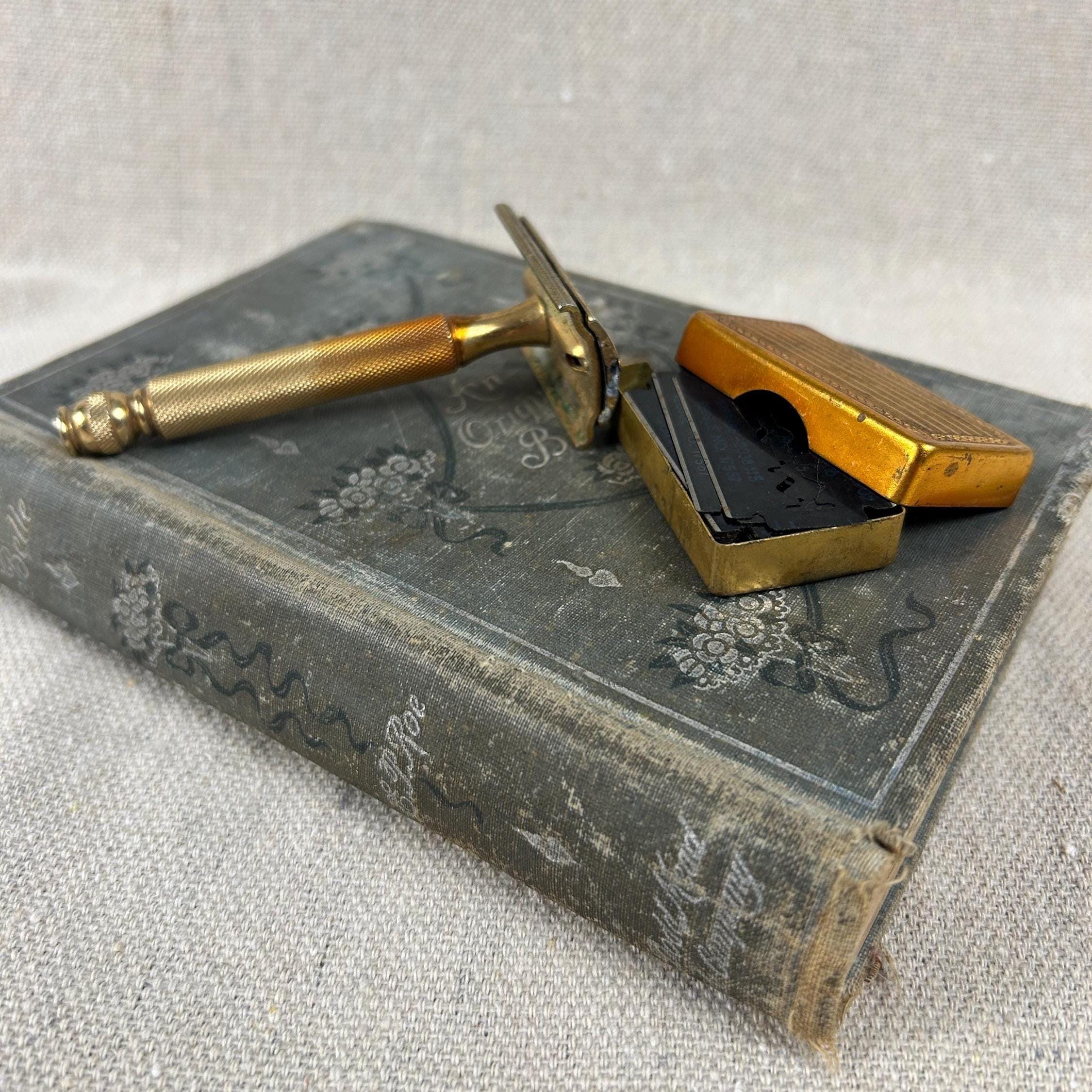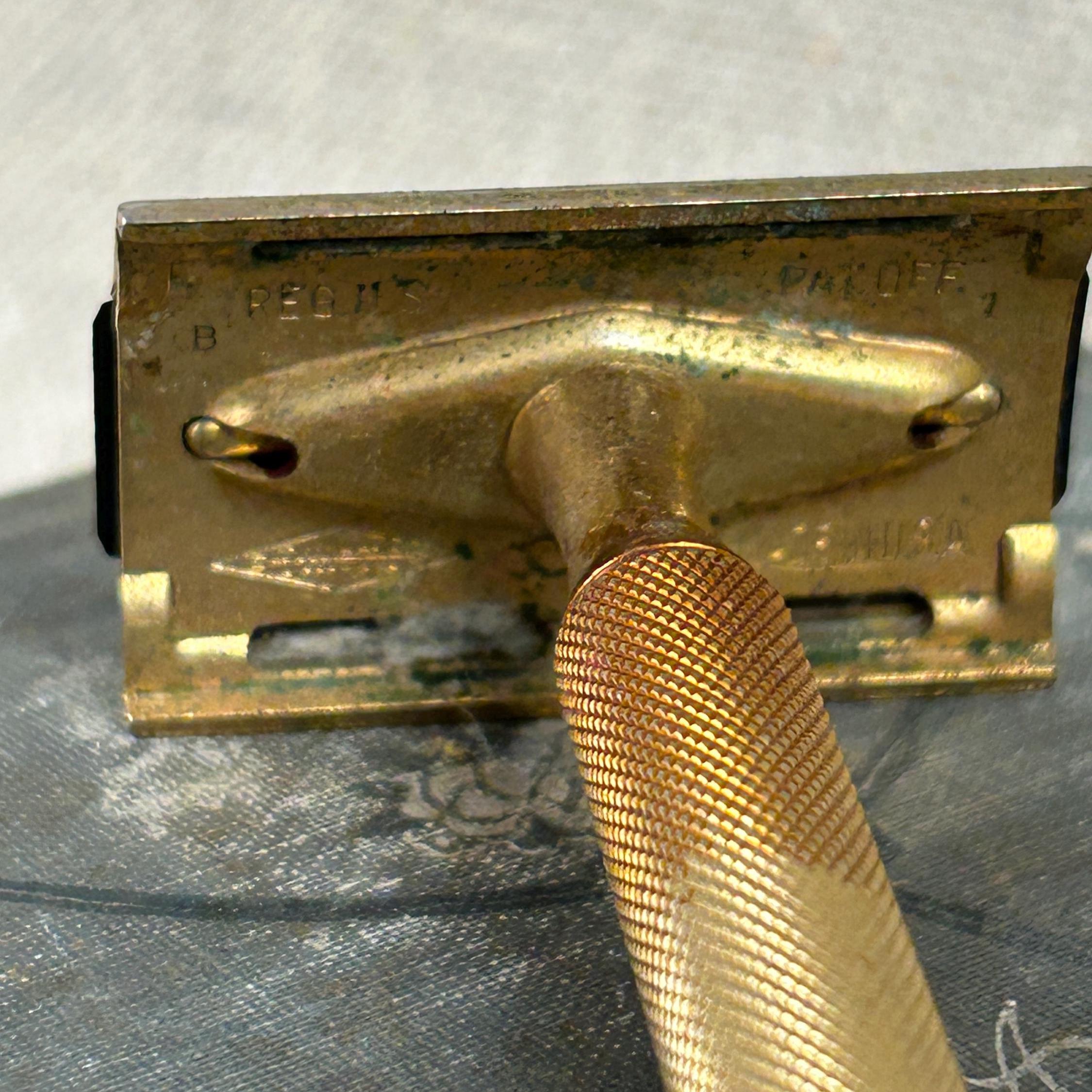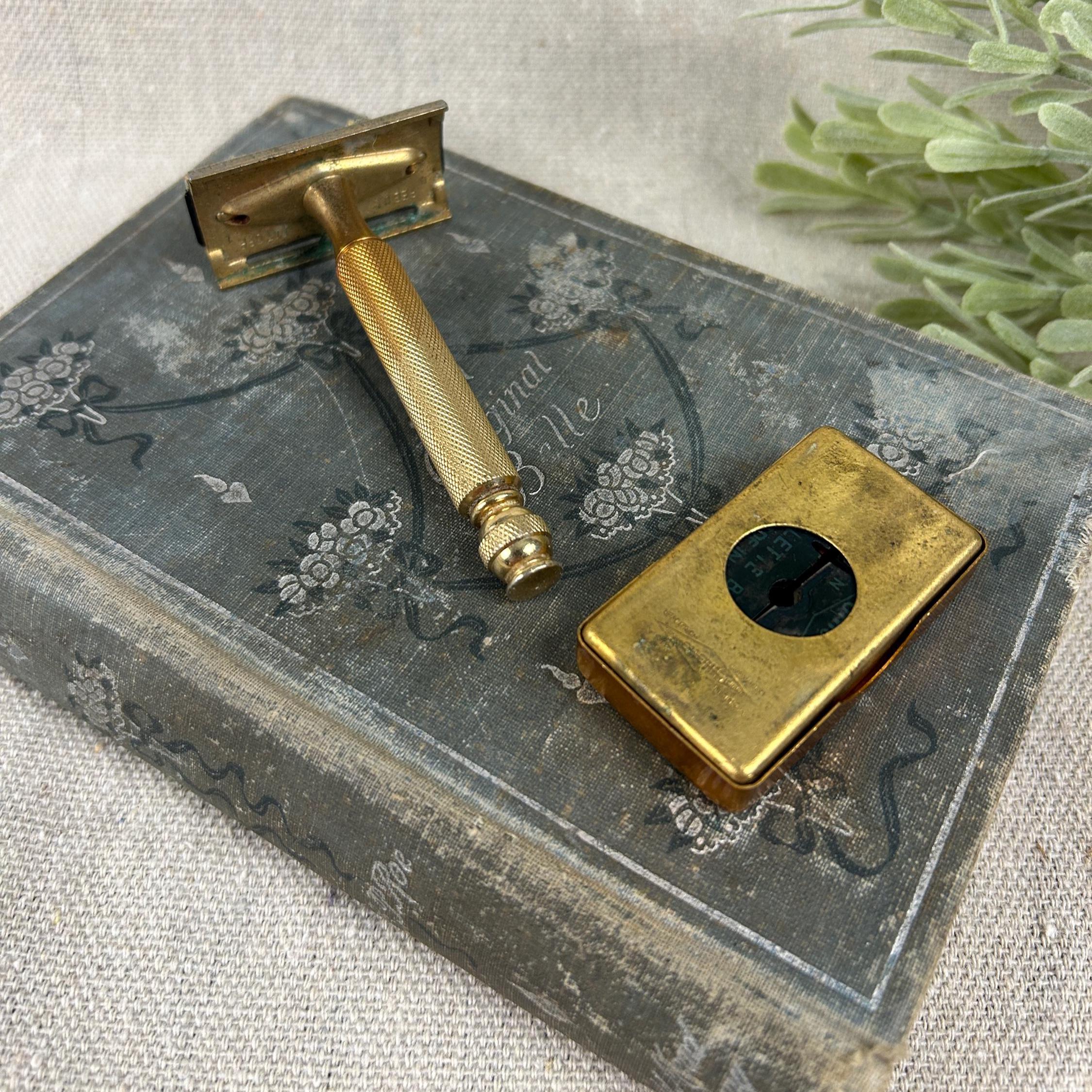The set includes the razor and a matching gold-toned case full of 45 vintage blades. Blades include Personna, Gillette, Conrad, Excalibur, Kant-Rust, and Clauss.