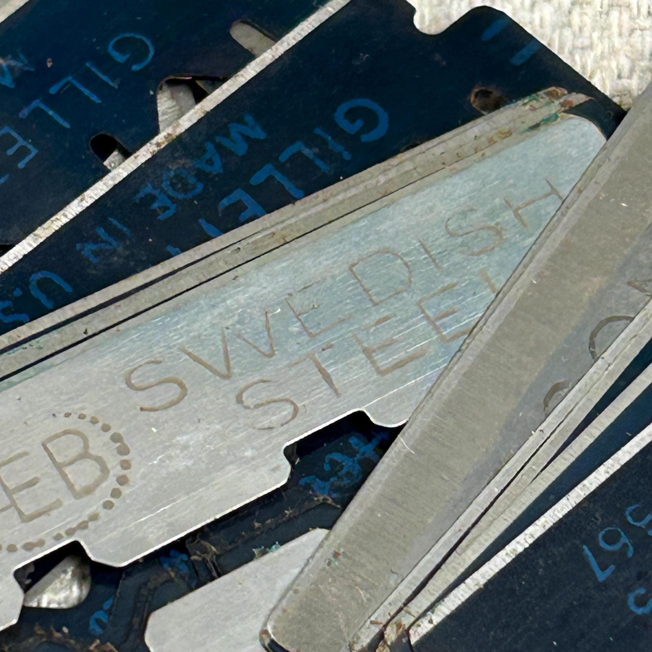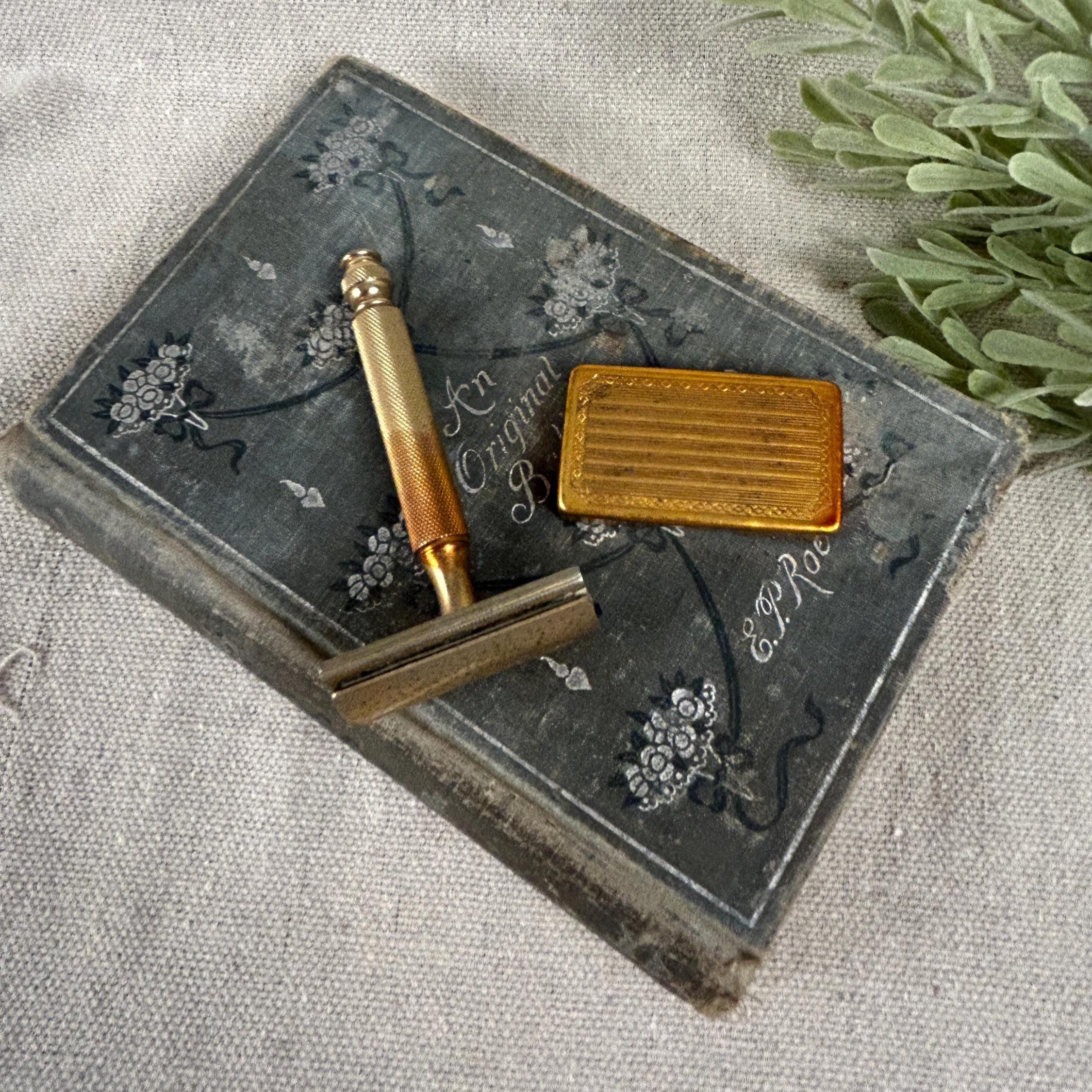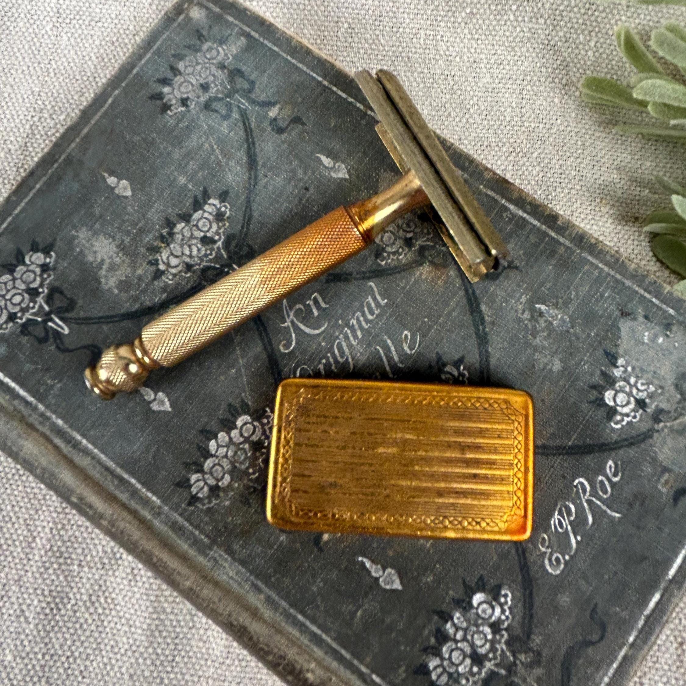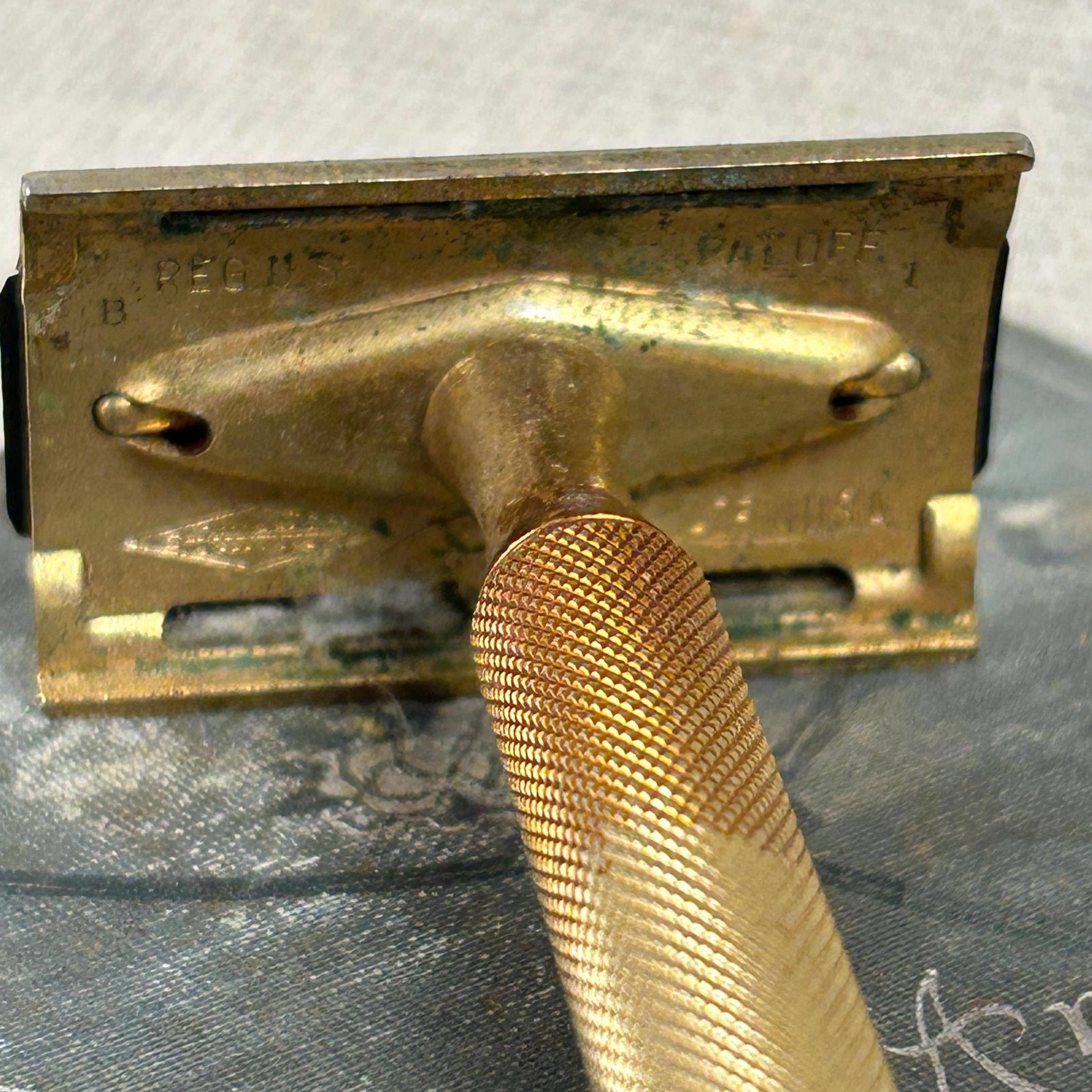 The set includes the razor and a matching gold-toned case full of 45 vintage blades. Blades include Personna, Gillette, Conrad, Excalibur, Kant-Rust, and Clauss.