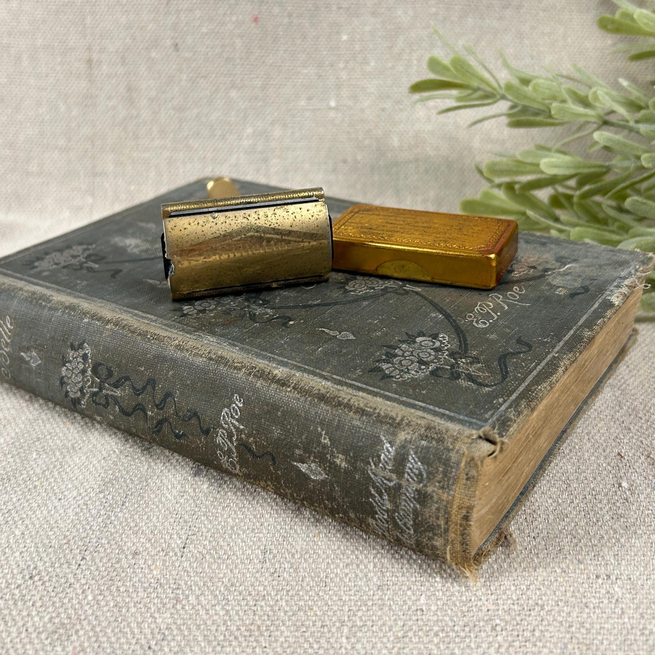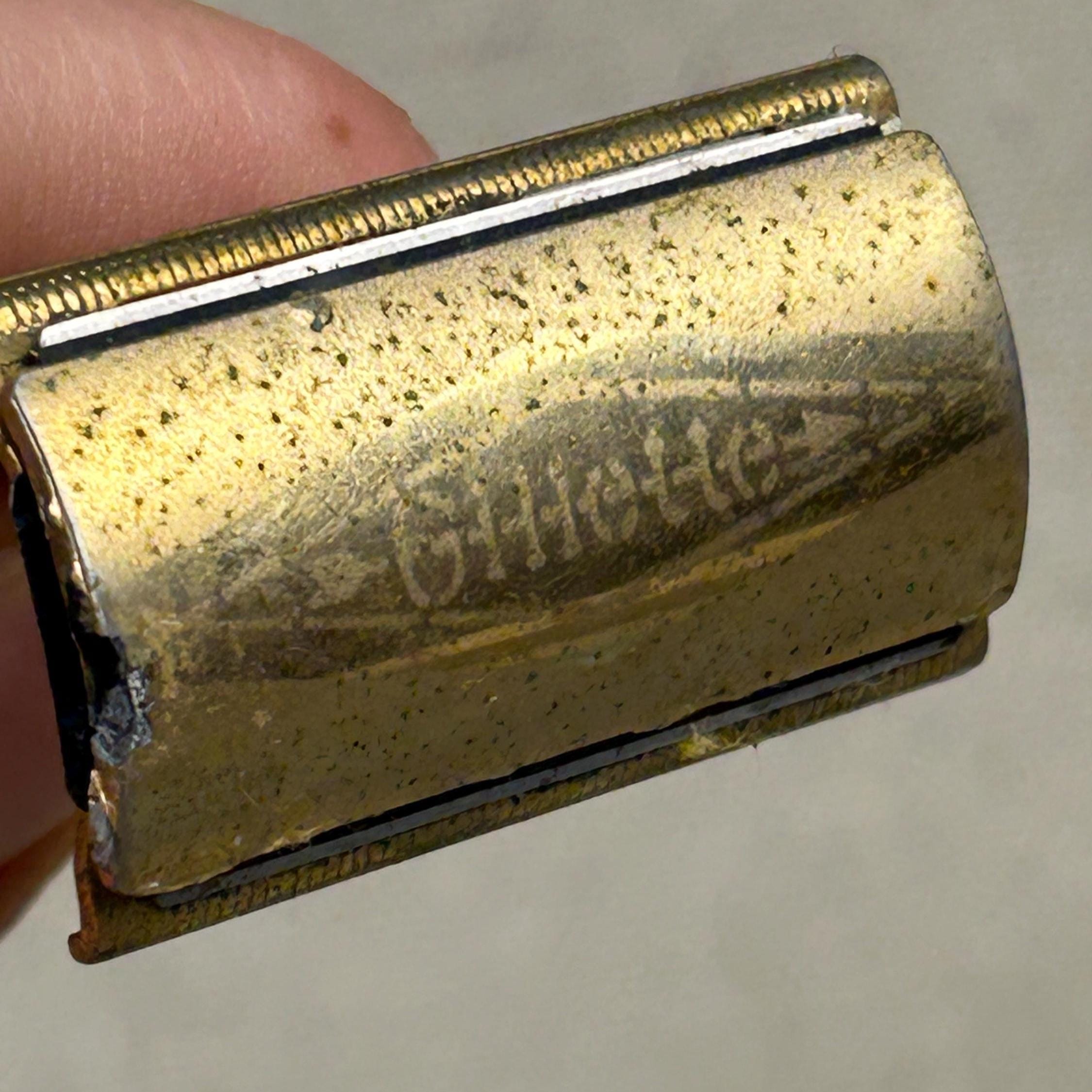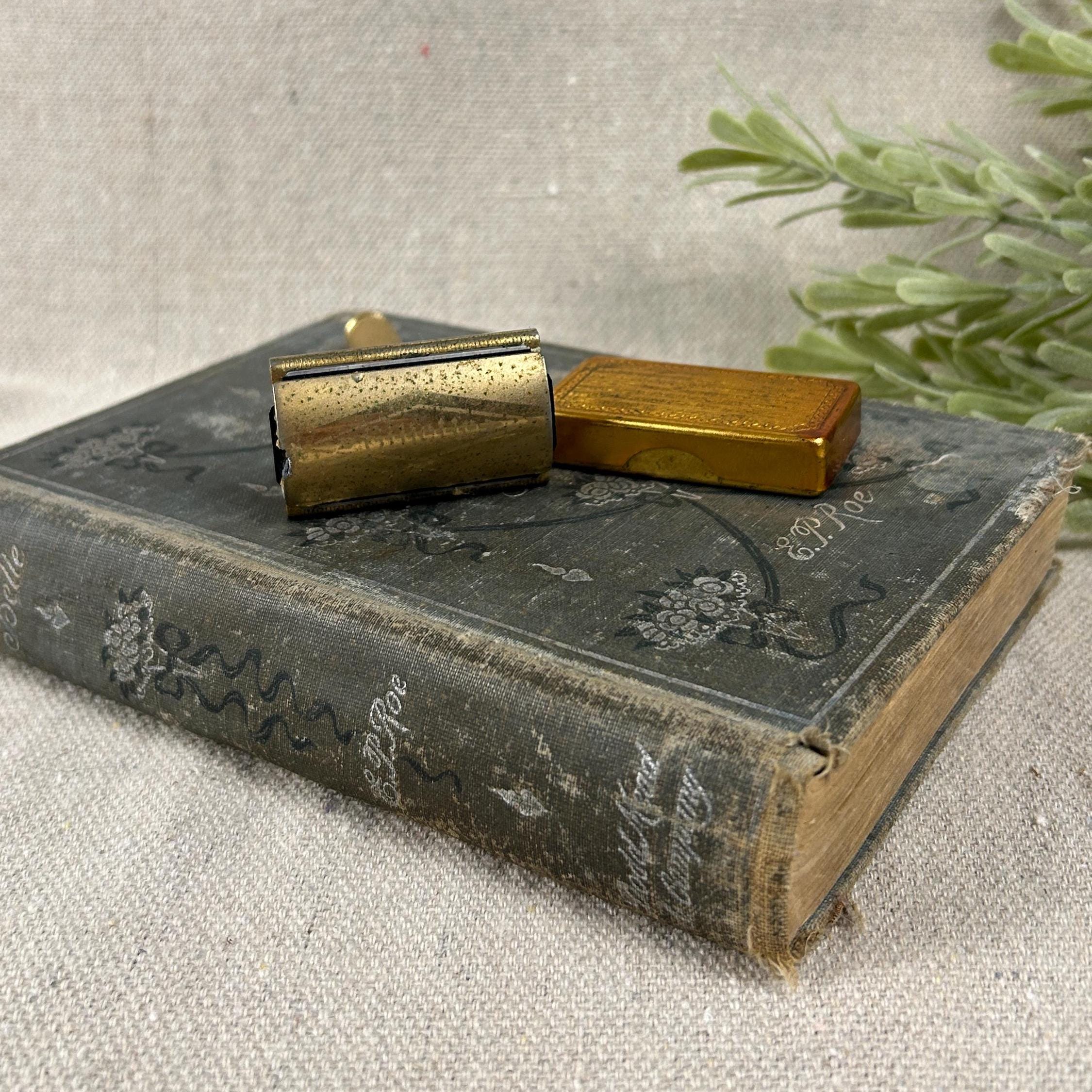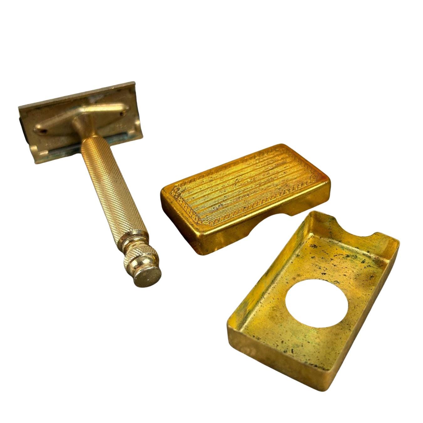 The set includes the razor and a matching gold-toned case full of 45 vintage blades. Blades include Personna, Gillette, Conrad, Excalibur, Kant-Rust, and Clauss.