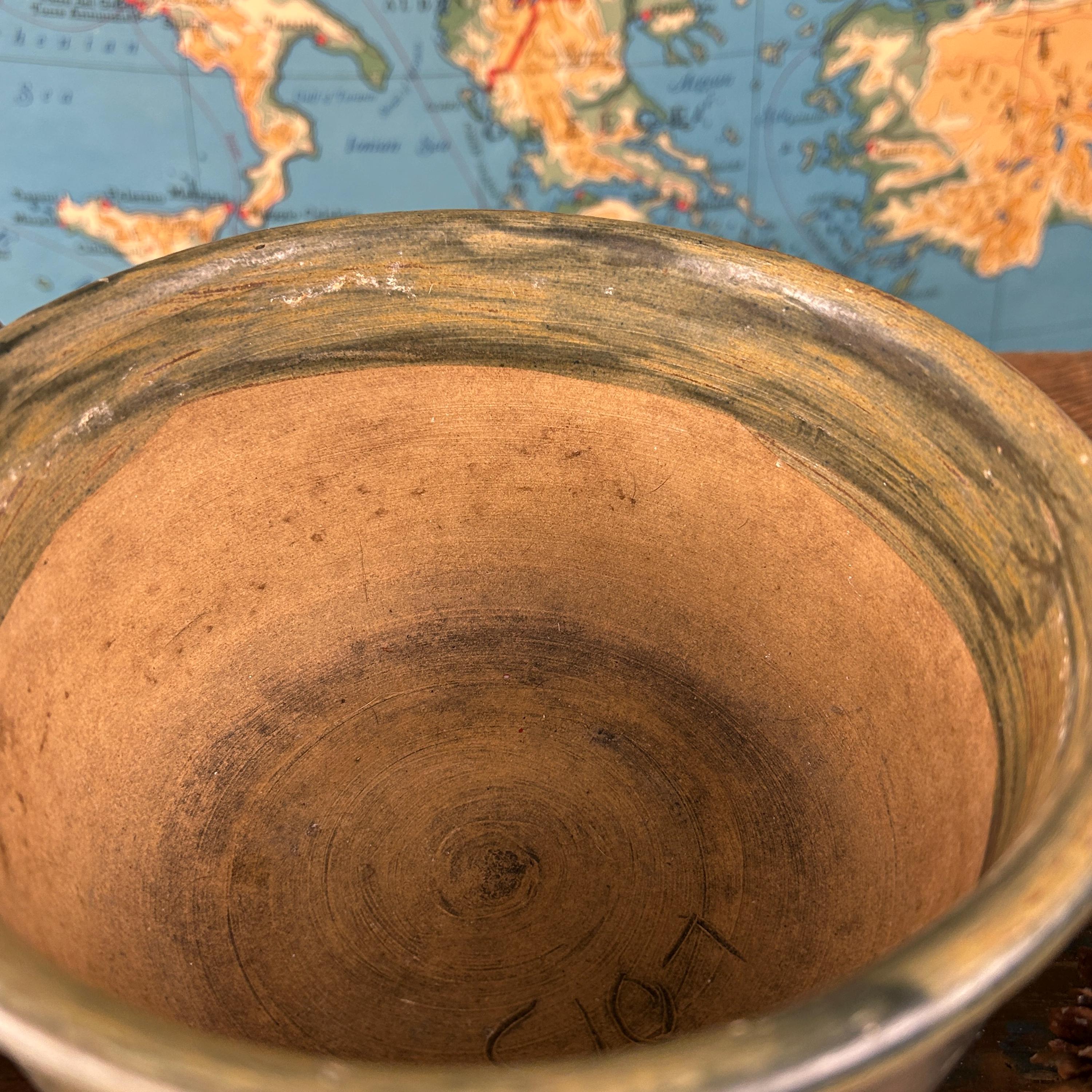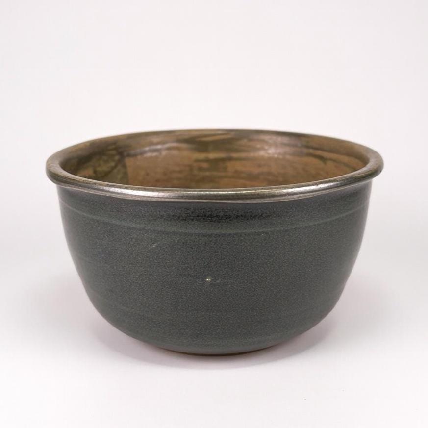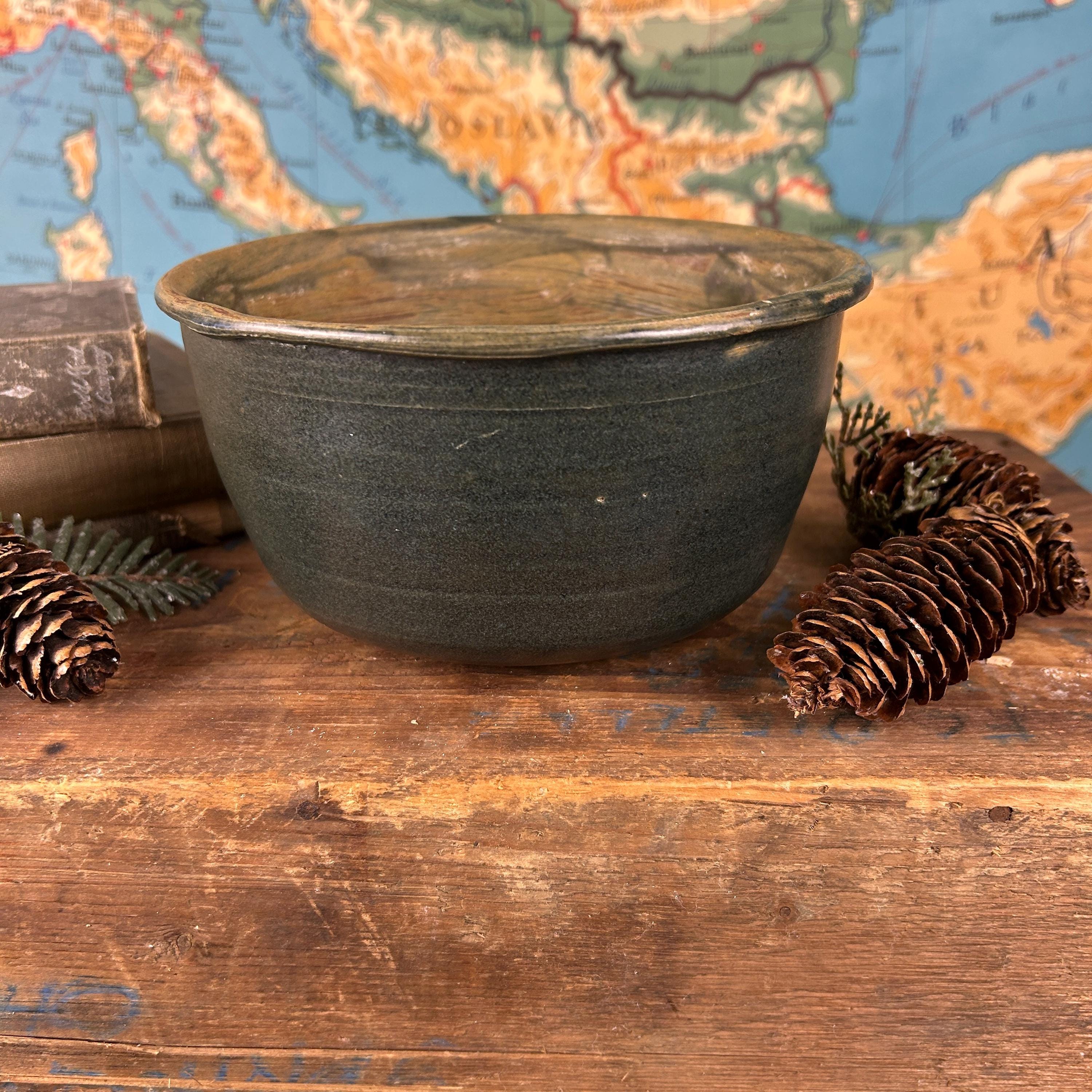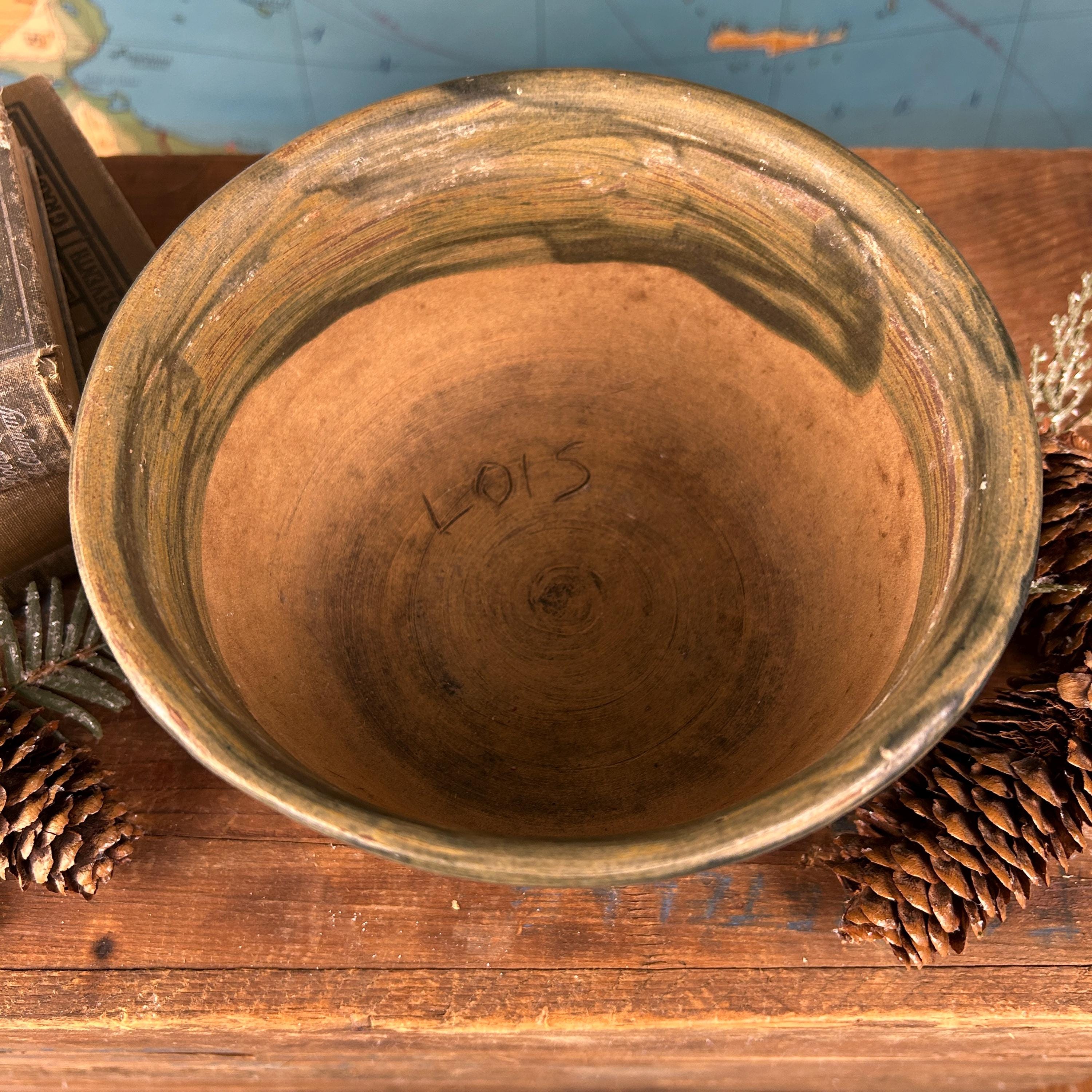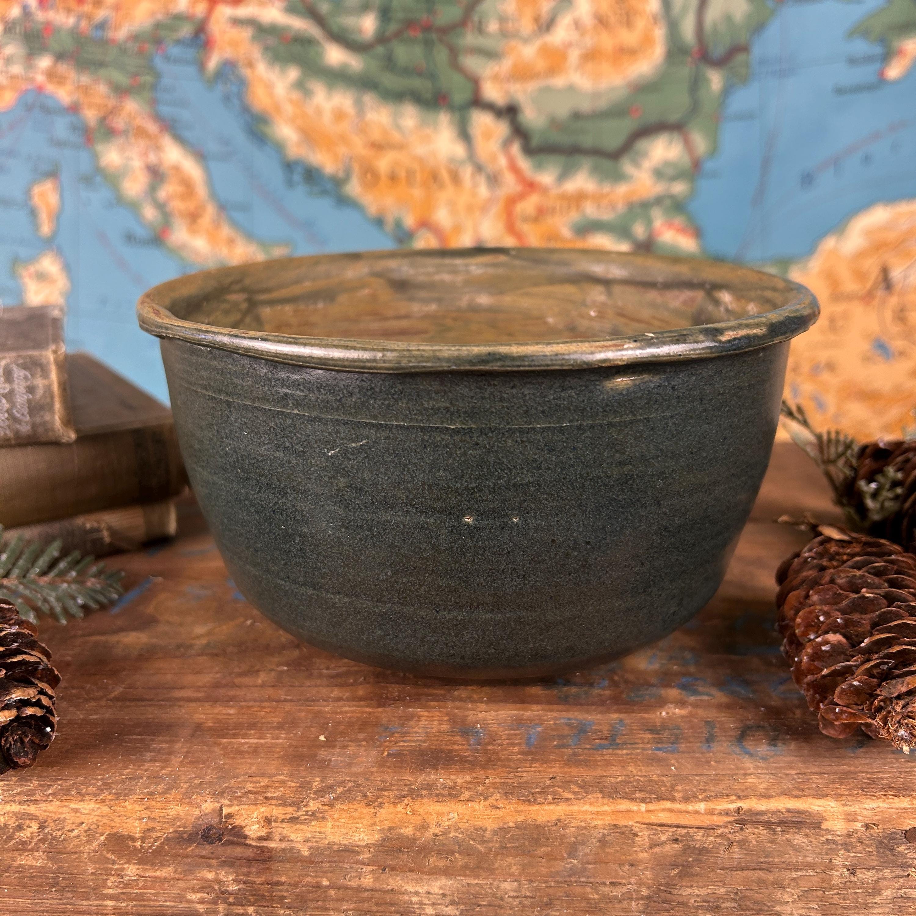 This is a handmade, hand-thrown pottery bowl, it has a dark green glaze with a textured, rustic finish. It could be used for various purposes, such as a serving bowl, a mixing bowl, or a decorative piece. This hand-thrown studio art bowl is signed by the artist, Lois.