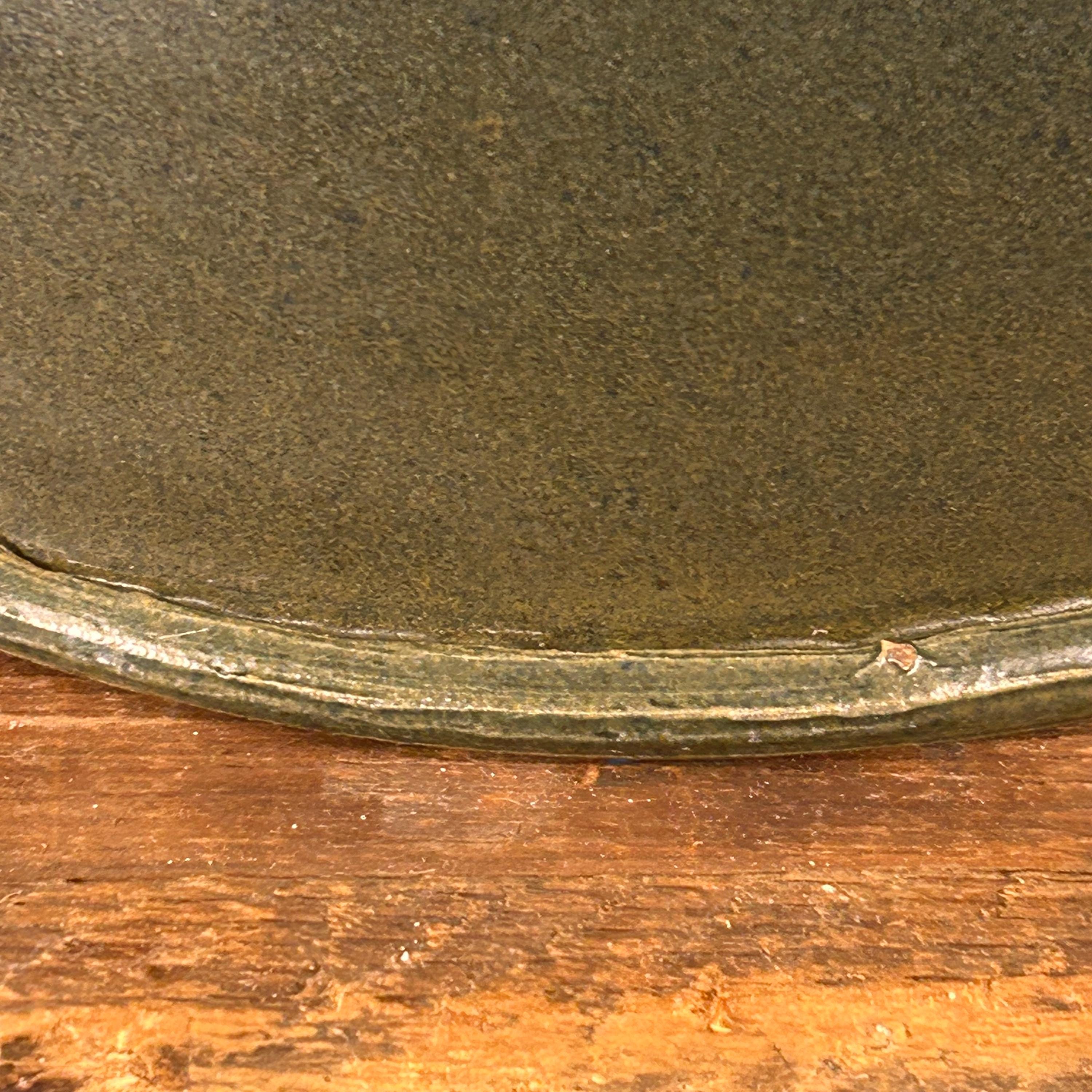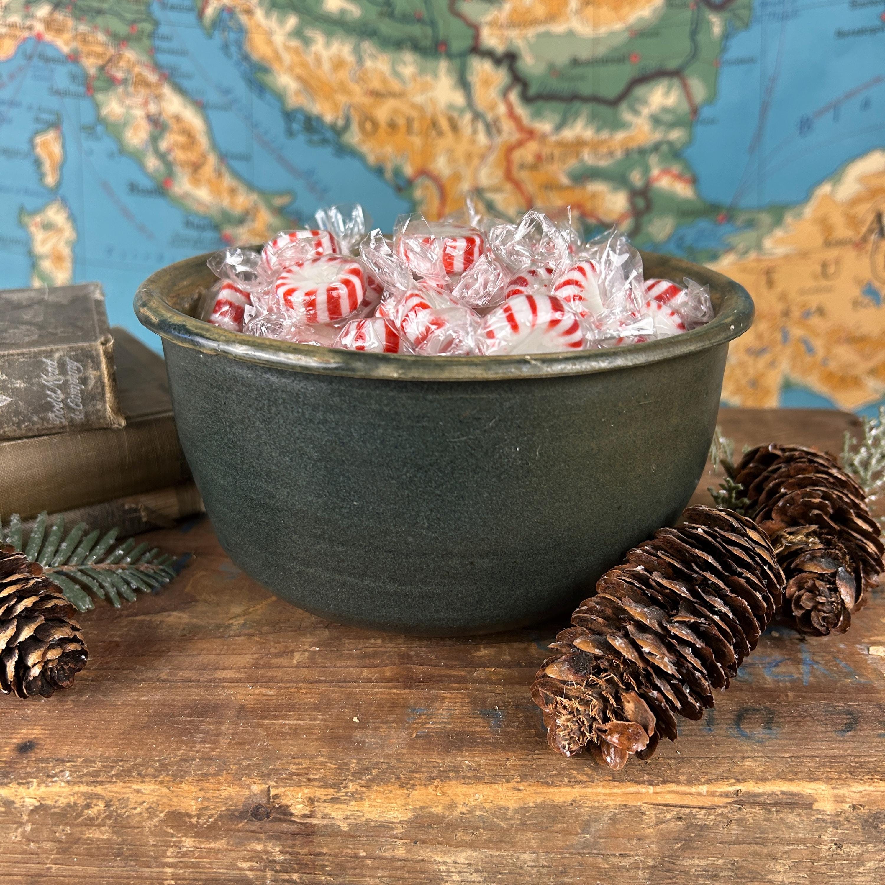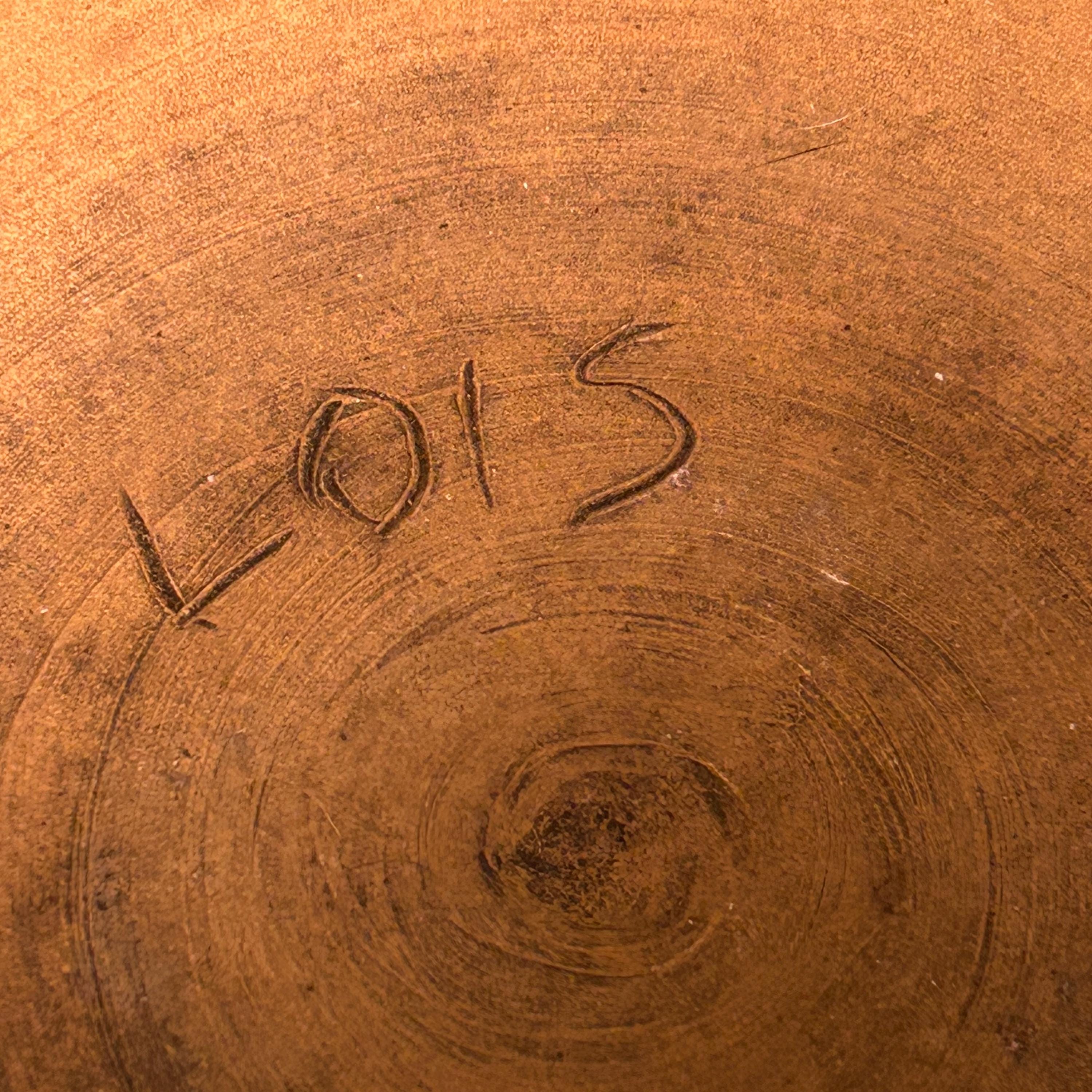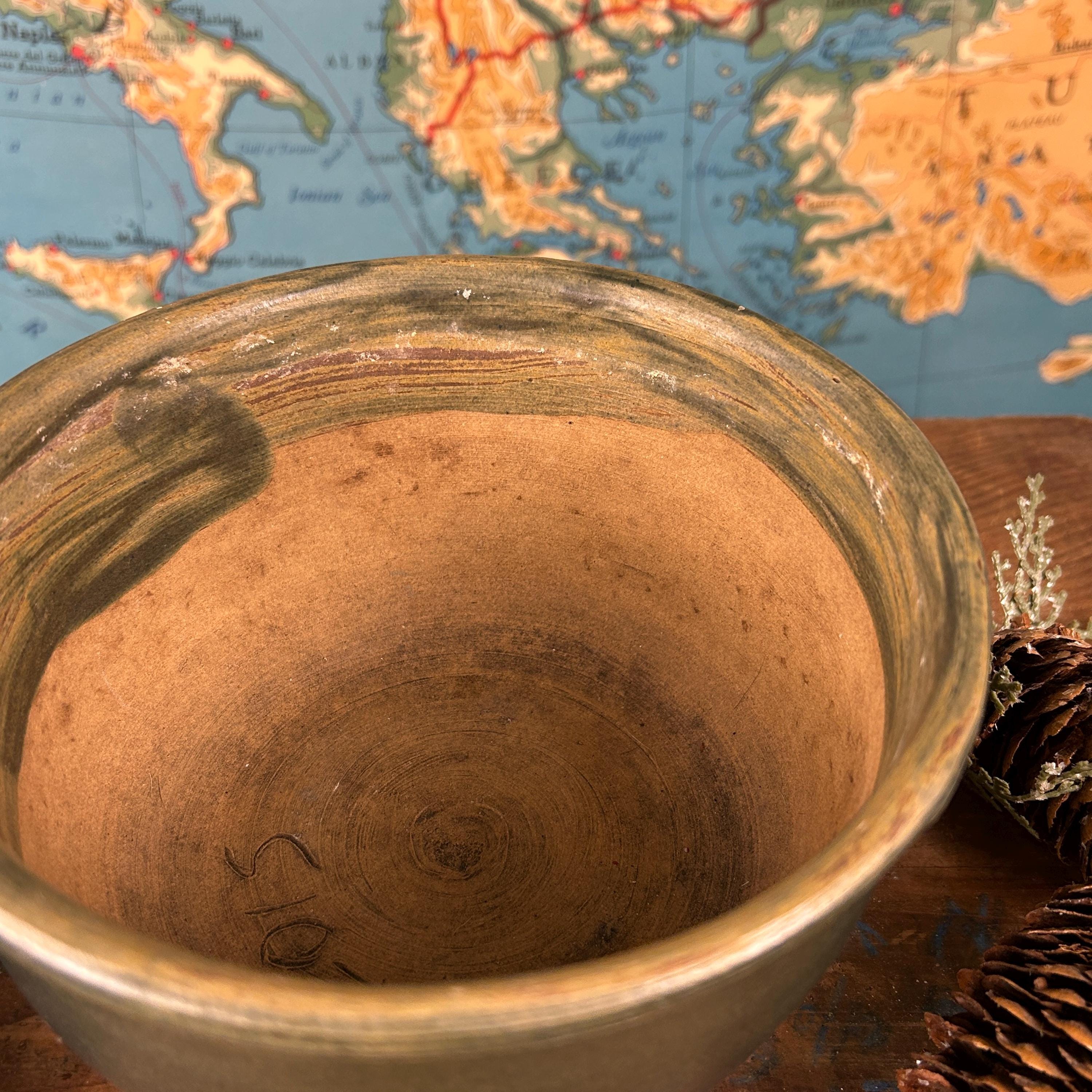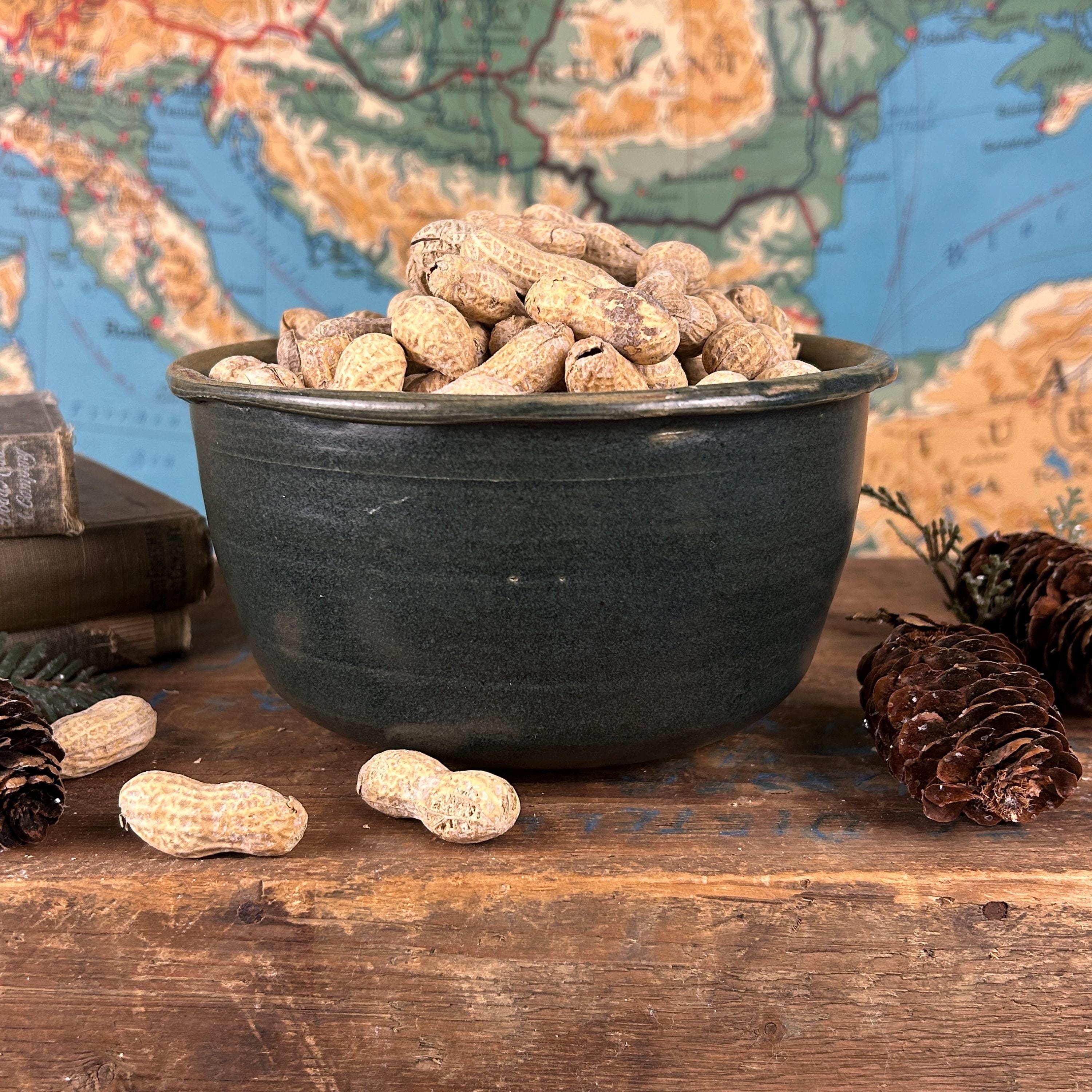 This is a handmade, hand-thrown pottery bowl, it has a dark green glaze with a textured, rustic finish. It could be used for various purposes, such as a serving bowl, a mixing bowl, or a decorative piece. This hand-thrown studio art bowl is signed by the artist, Lois.