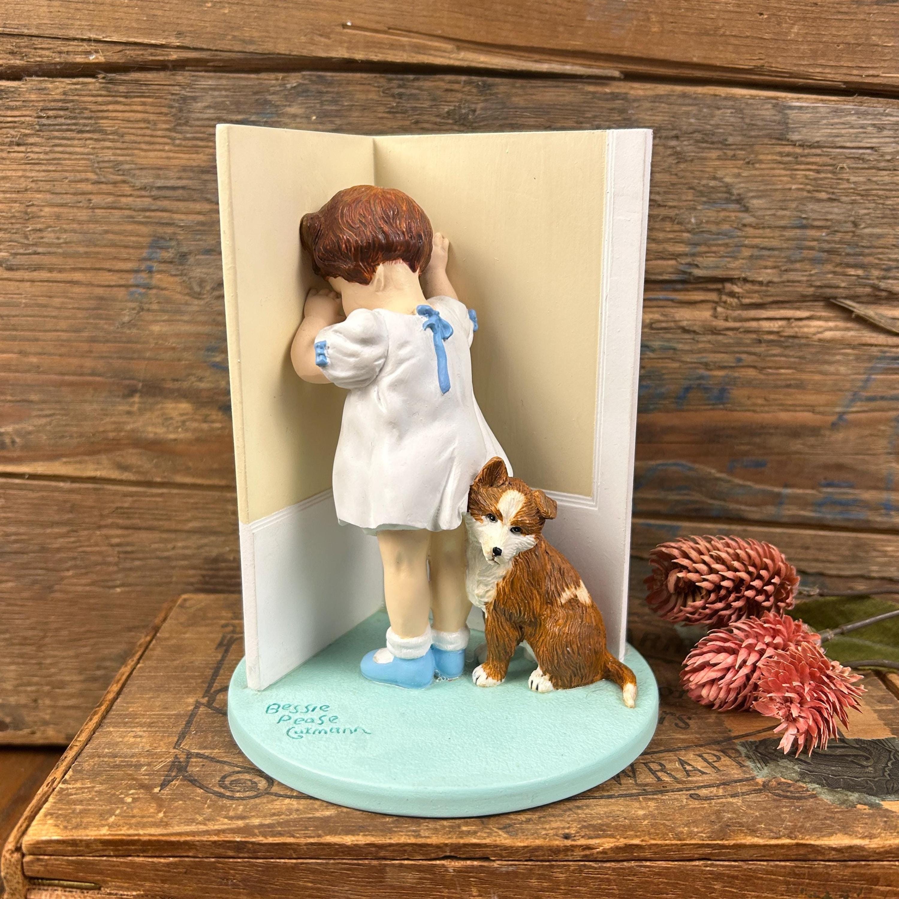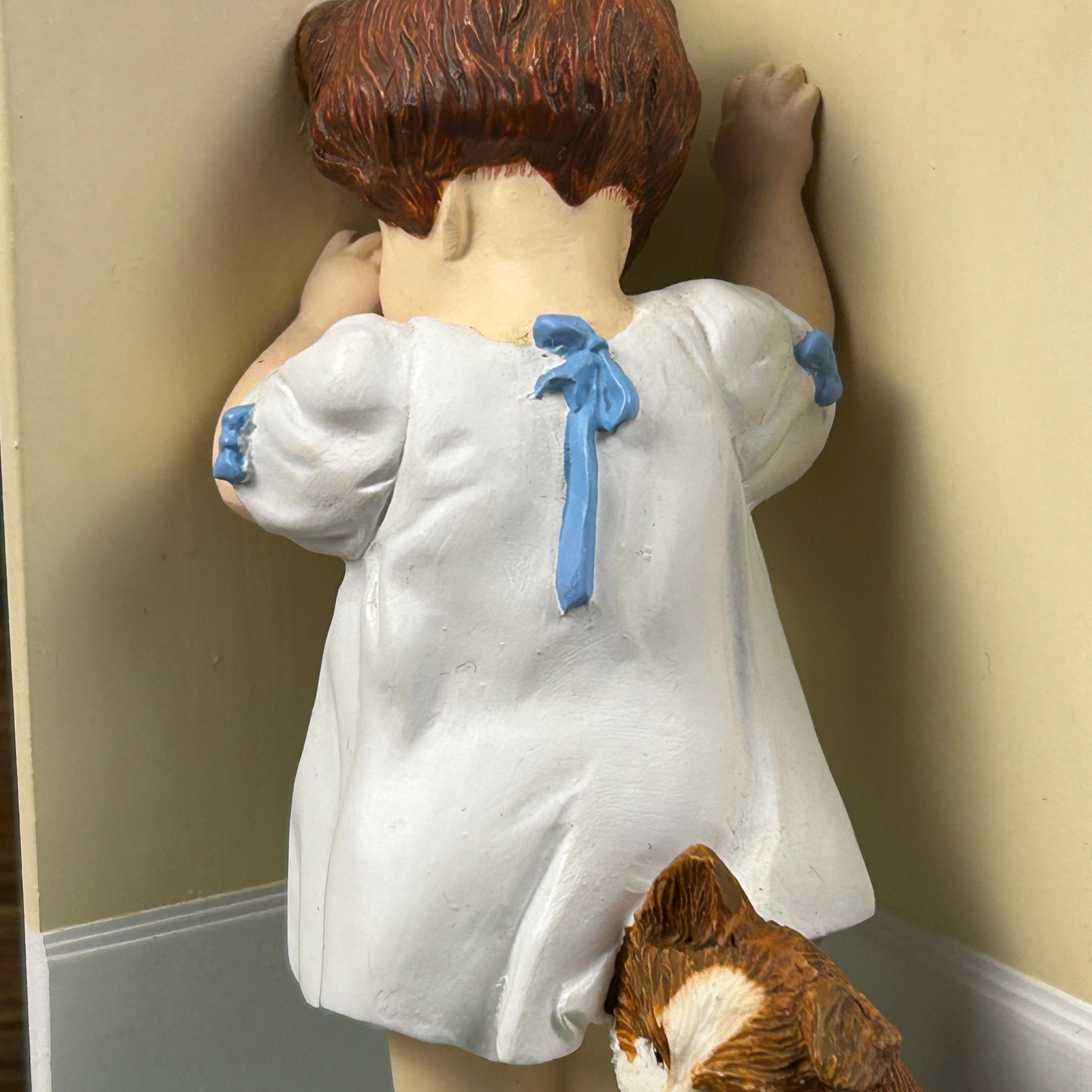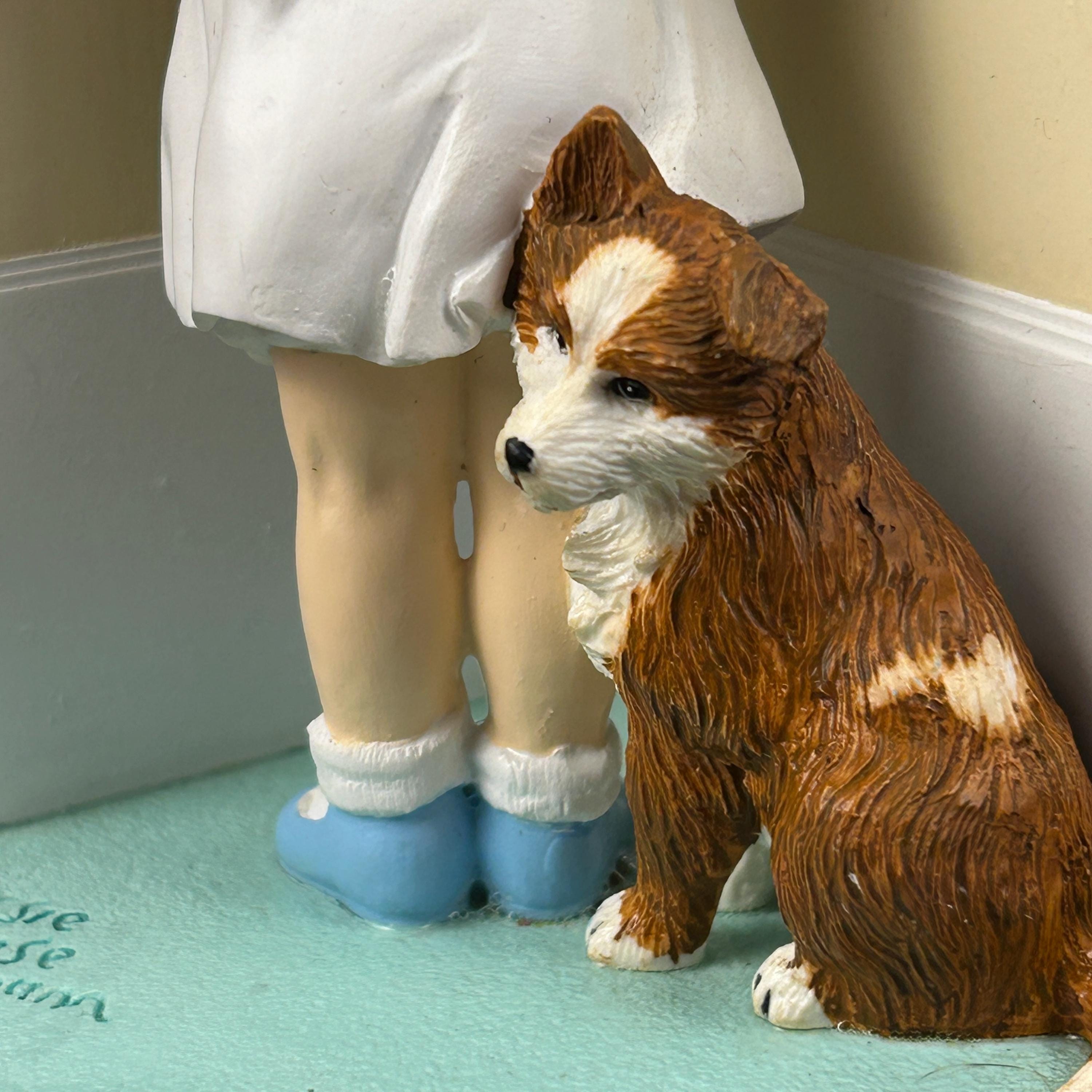 The figurine depicts a young girl facing the corner with her dog sitting next to her.