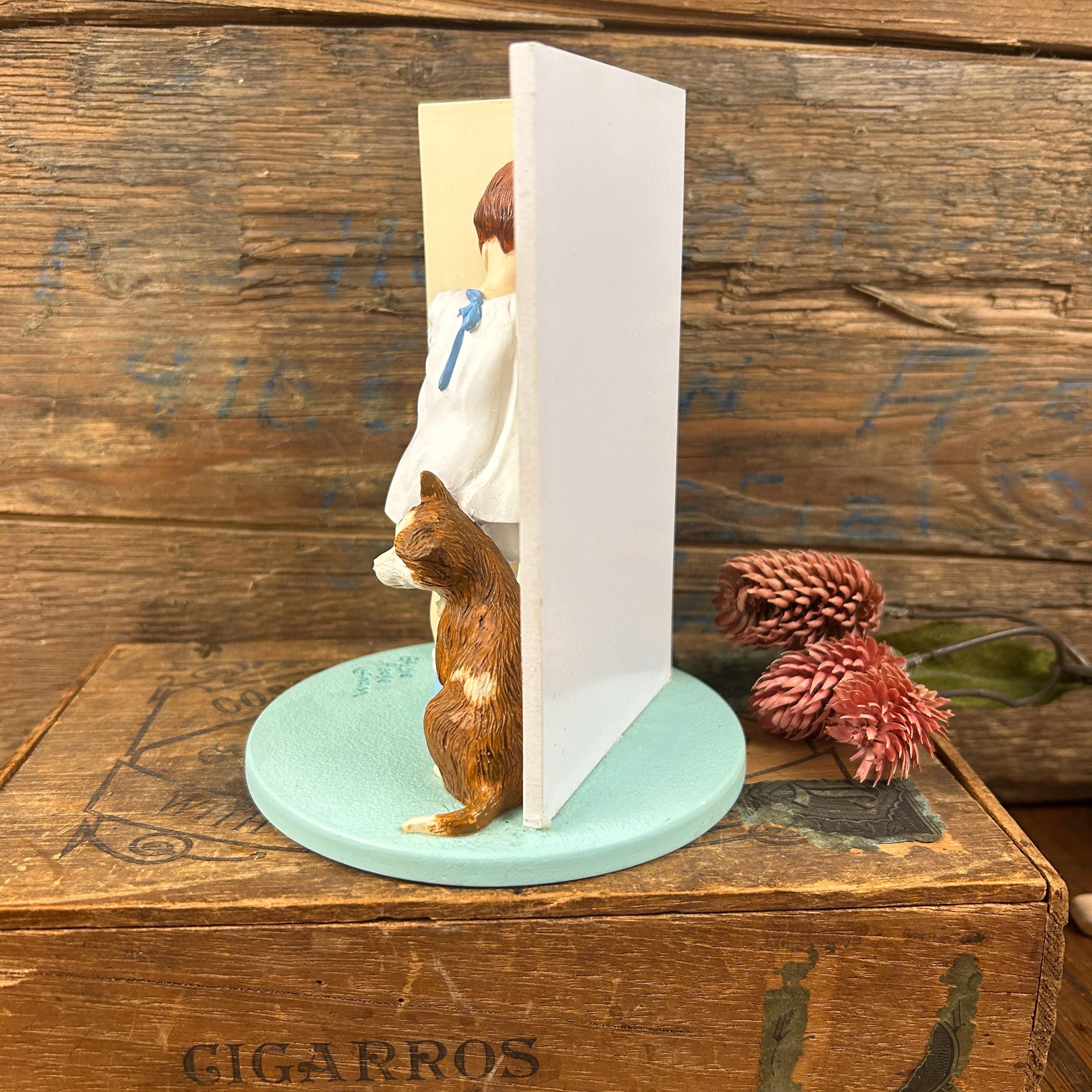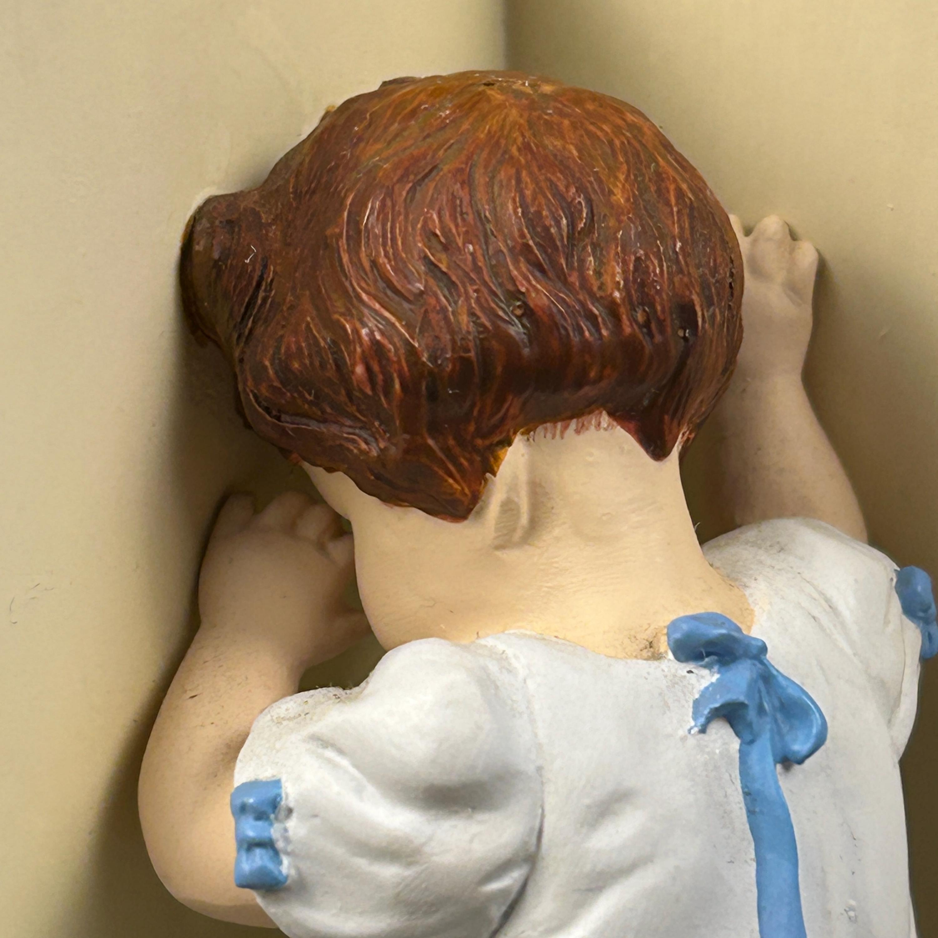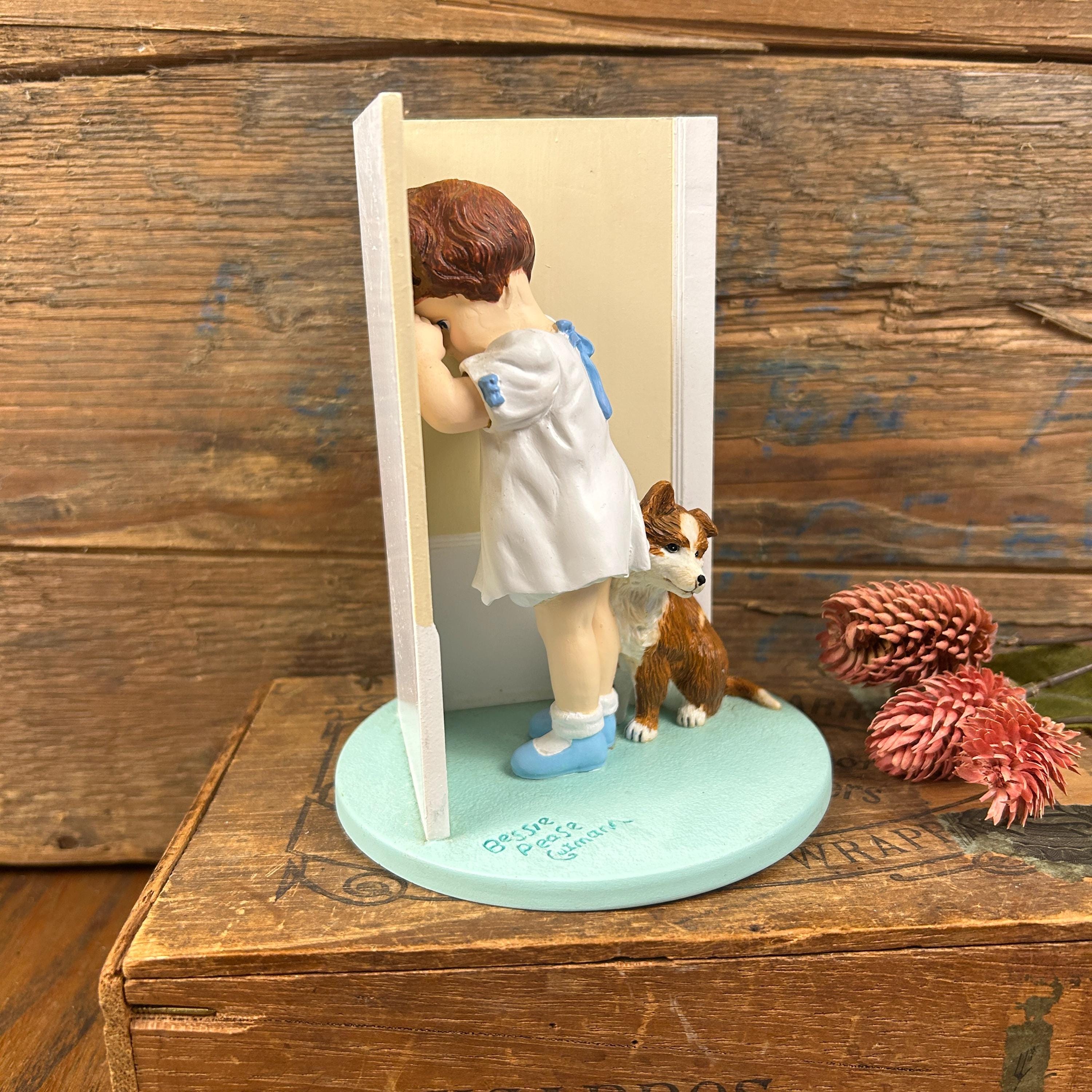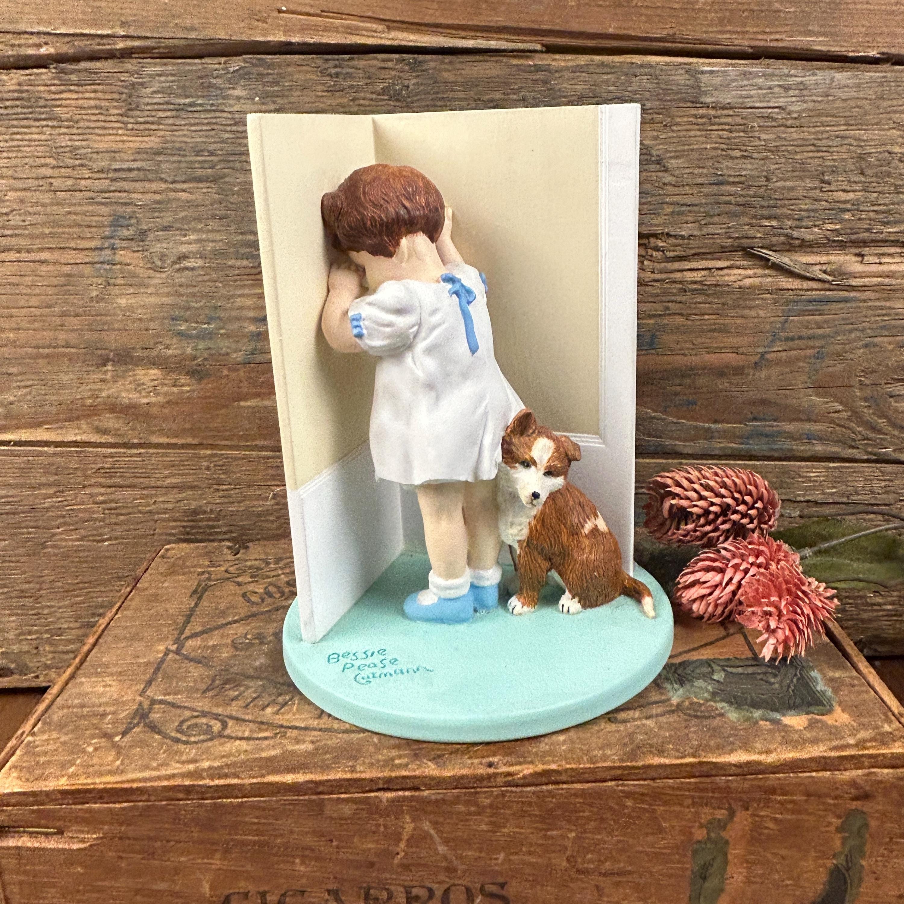 The figurine depicts a young girl facing the corner with her dog sitting next to her.