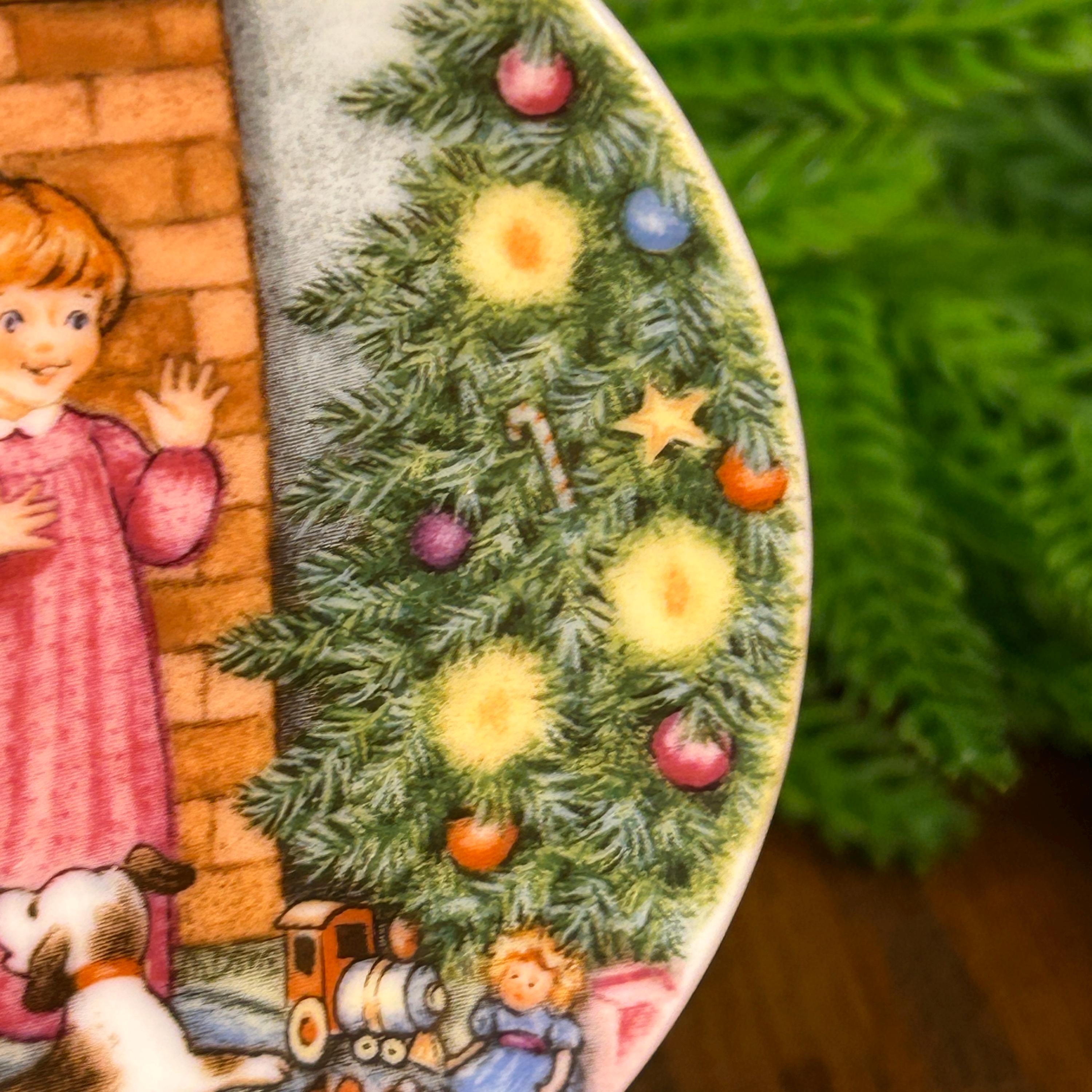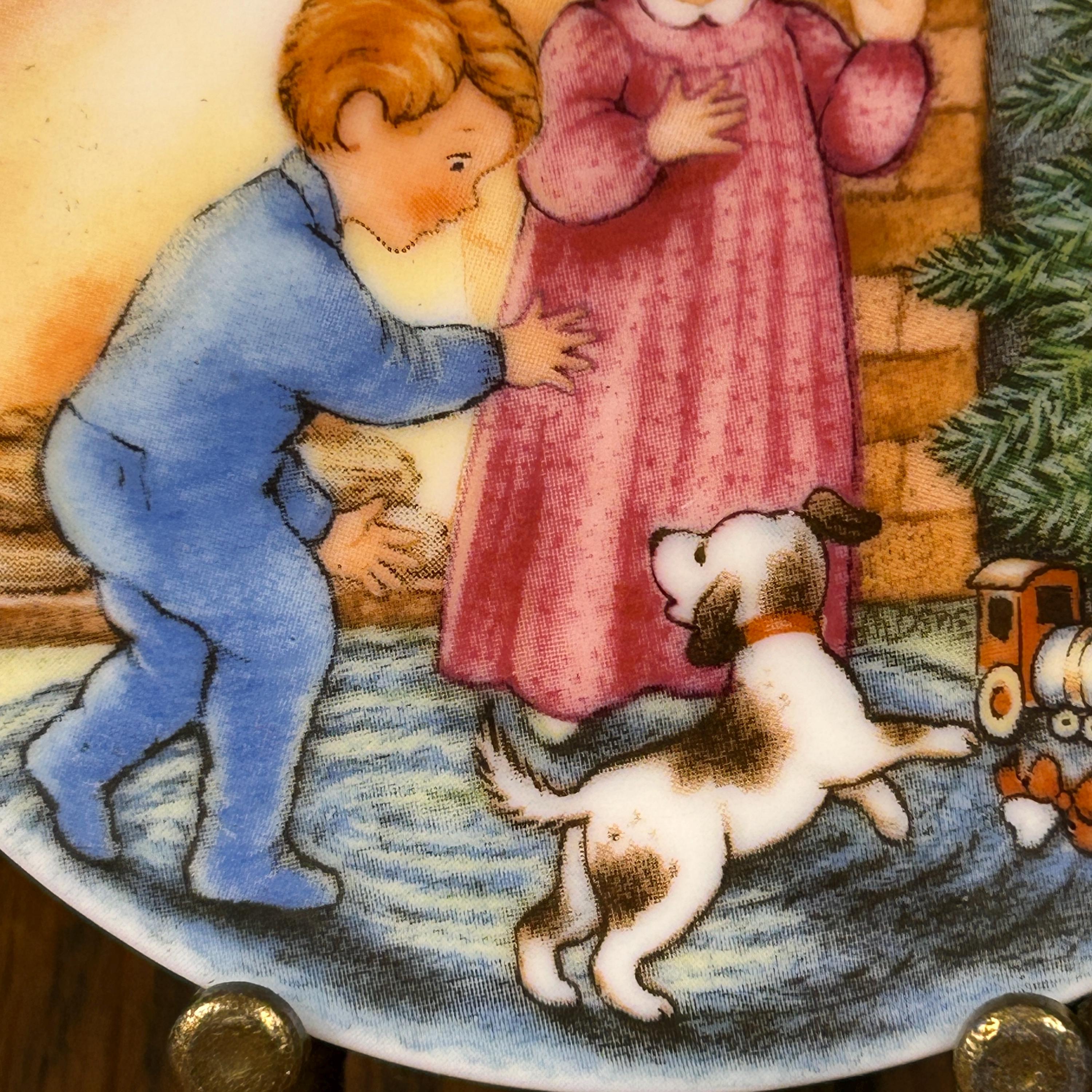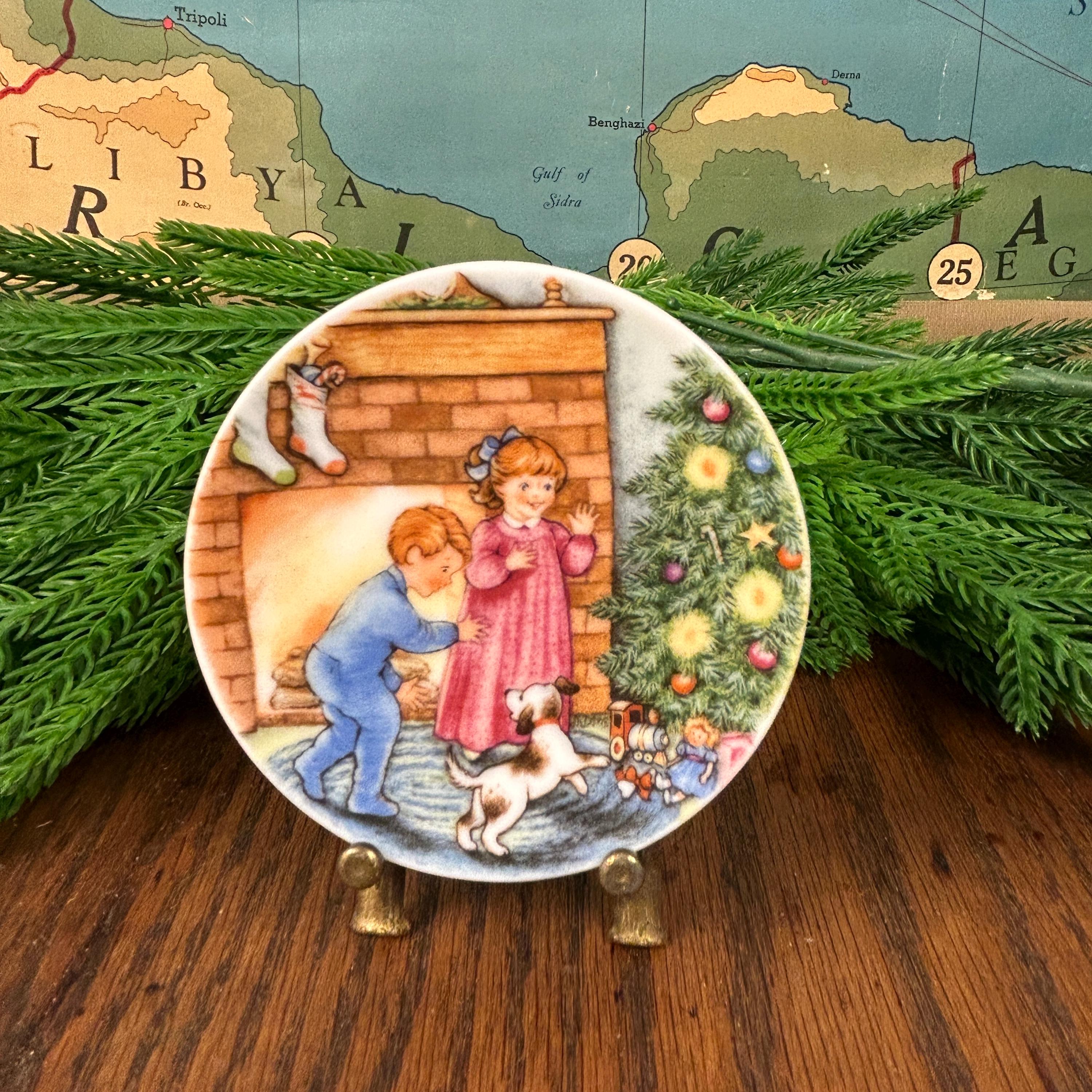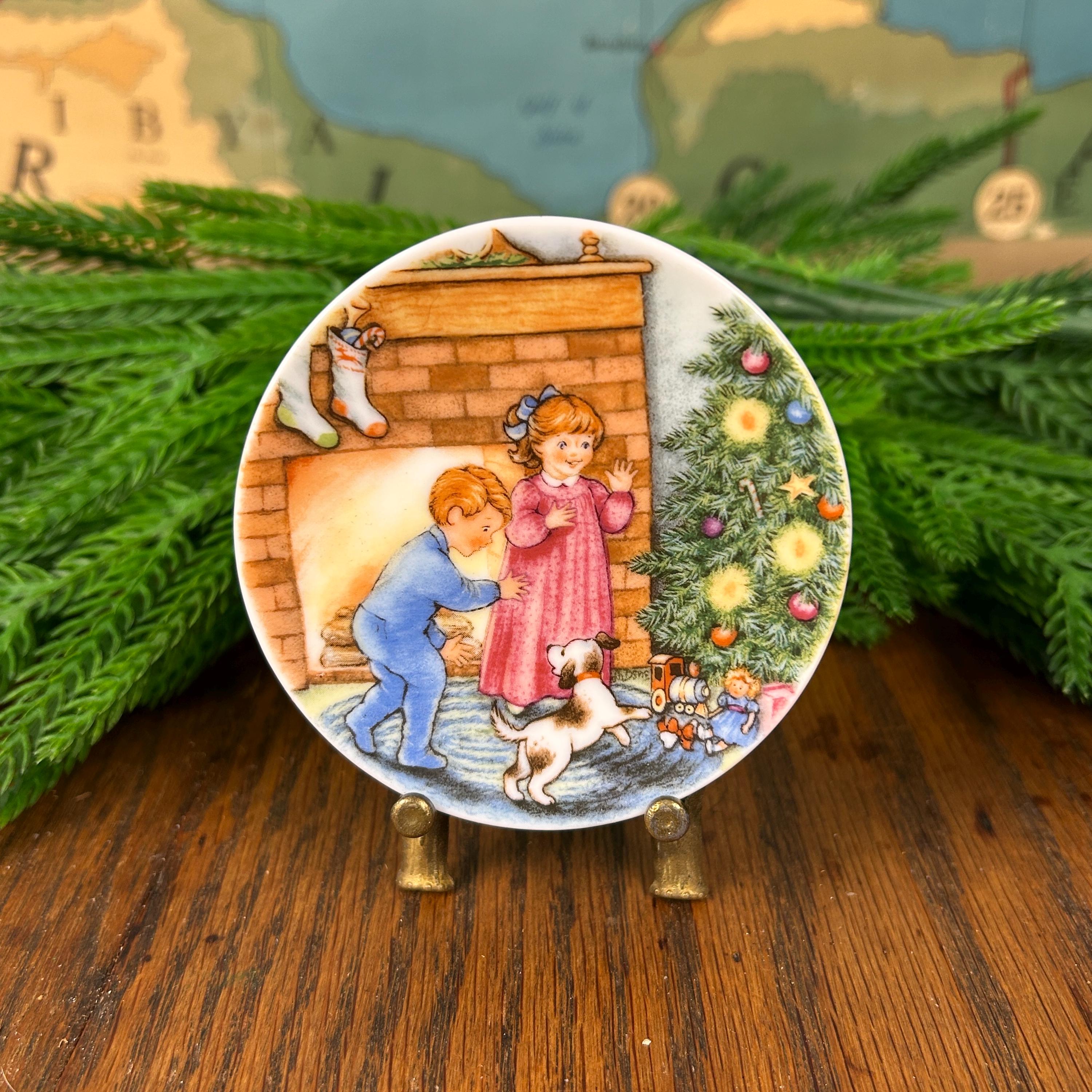 This adorable tiny plate is from Hallmark 1989 and is entitled "Morning of Wonder". It shows two children and a dog on Christmas morning excited about the gifts under the tree. This little plate measuring almost 3 1/4" in diameter can be used as a wall hanging, placed on a small easel for tabletop display and would make cute decor for a dollhouse.