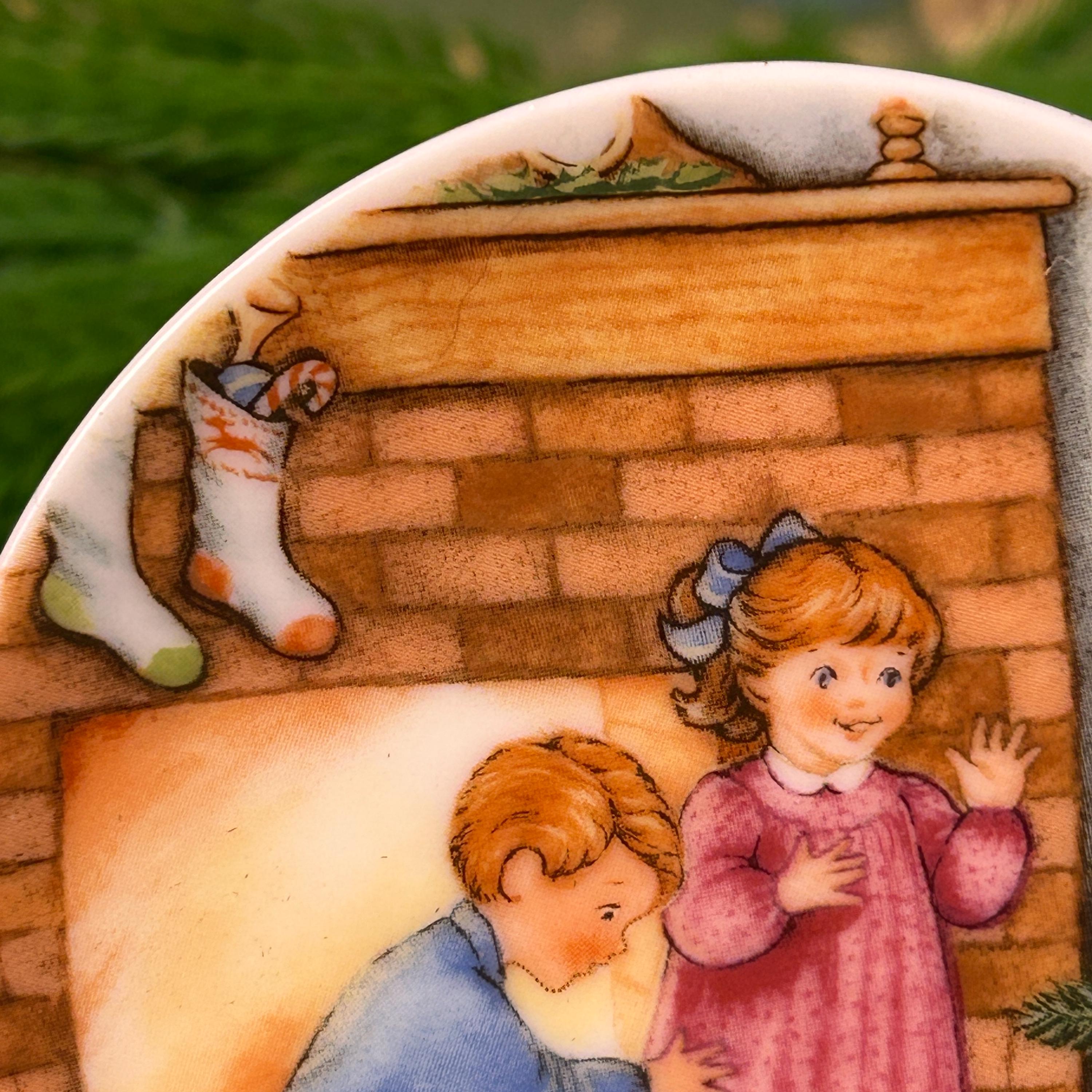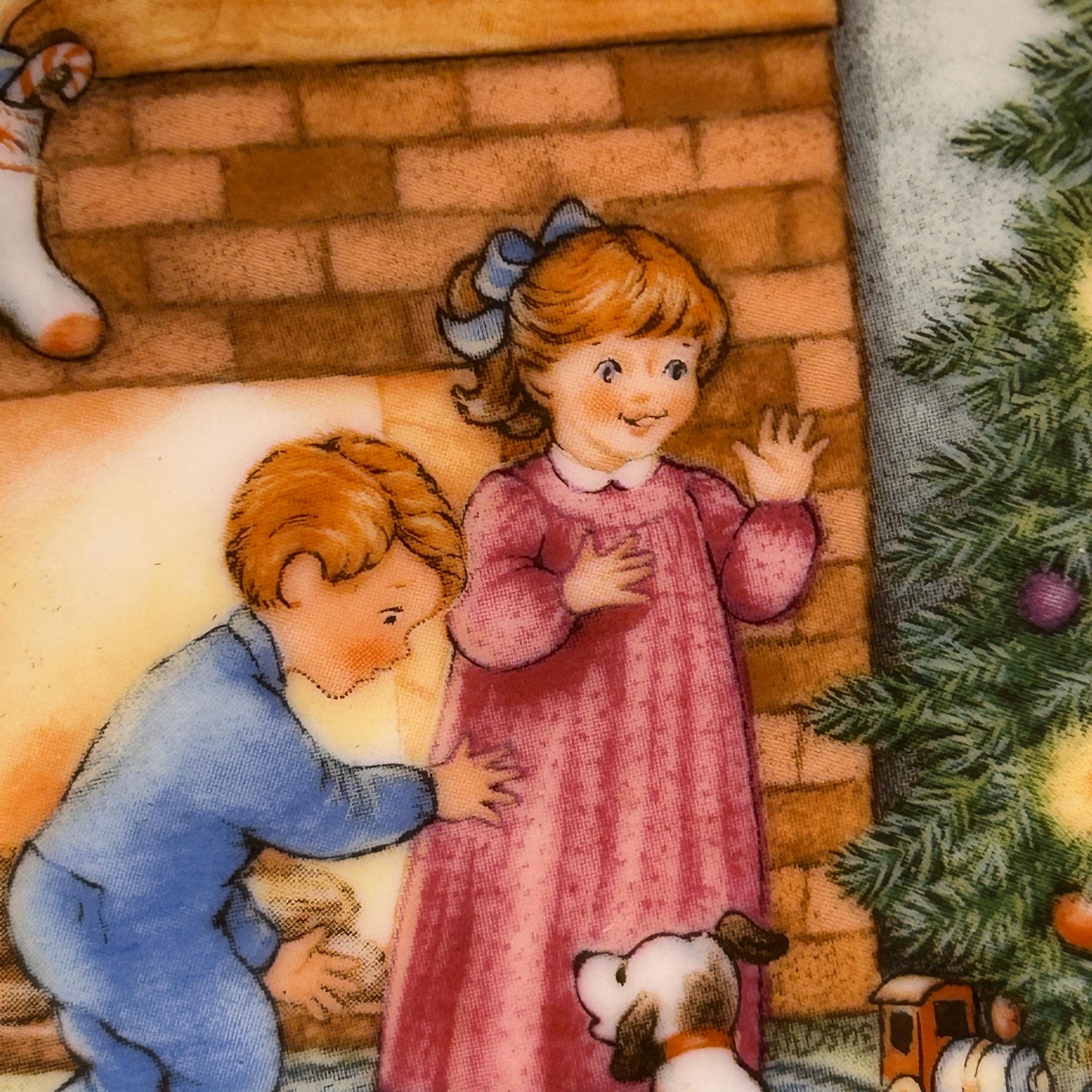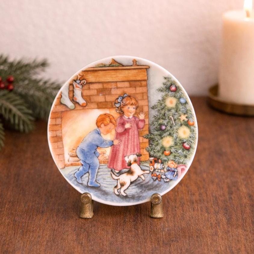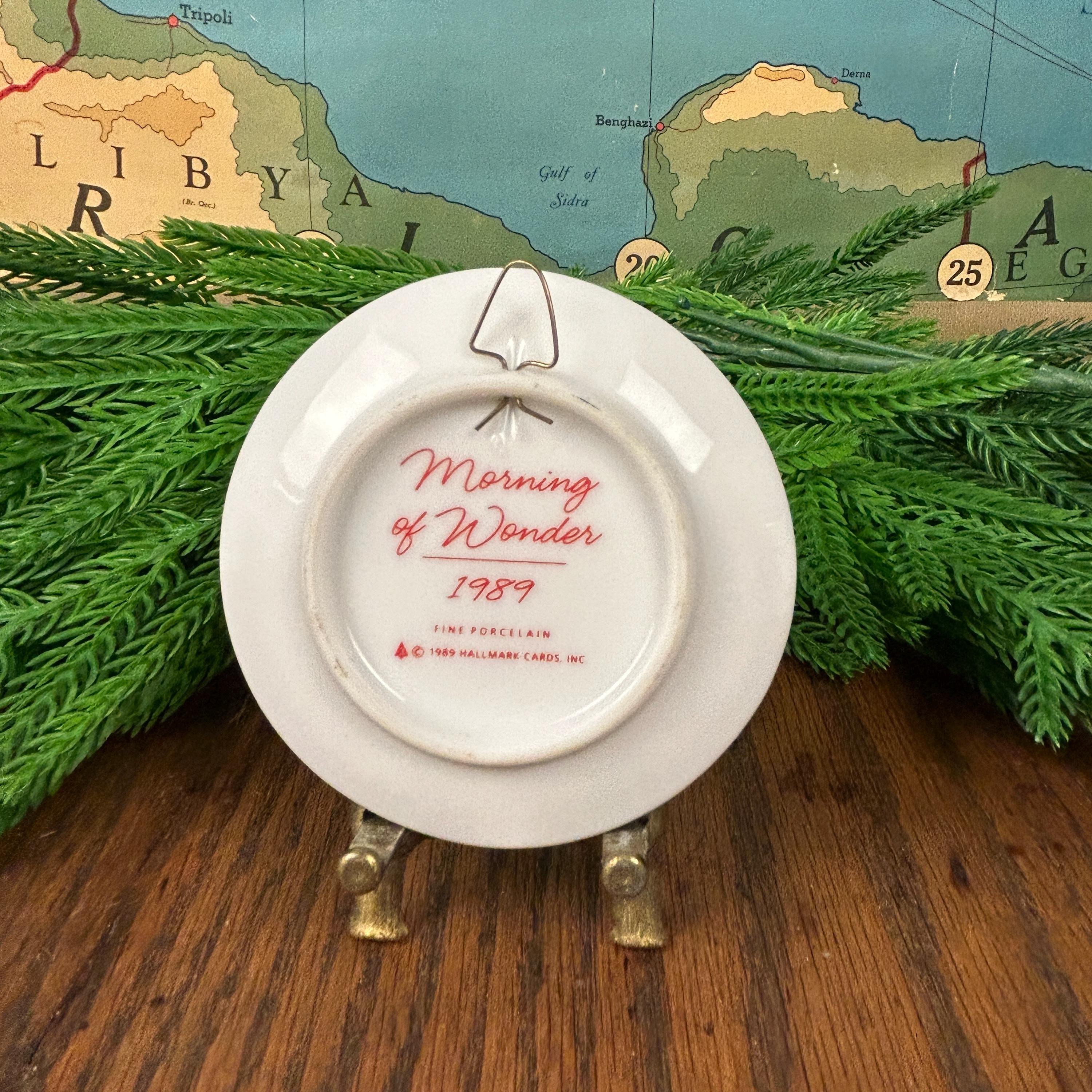 This adorable tiny plate is from Hallmark 1989 and is entitled "Morning of Wonder". It shows two children and a dog on Christmas morning excited about the gifts under the tree. This little plate measuring almost 3 1/4" in diameter can be used as a wall hanging, placed on a small easel for tabletop display and would make cute decor for a dollhouse.
