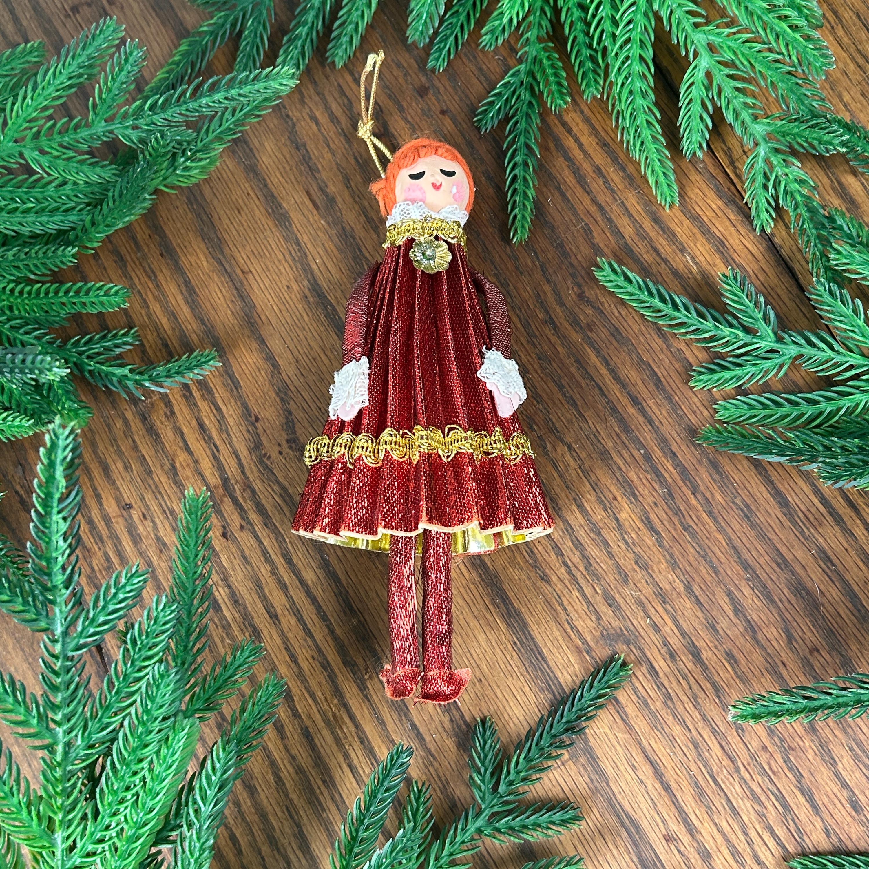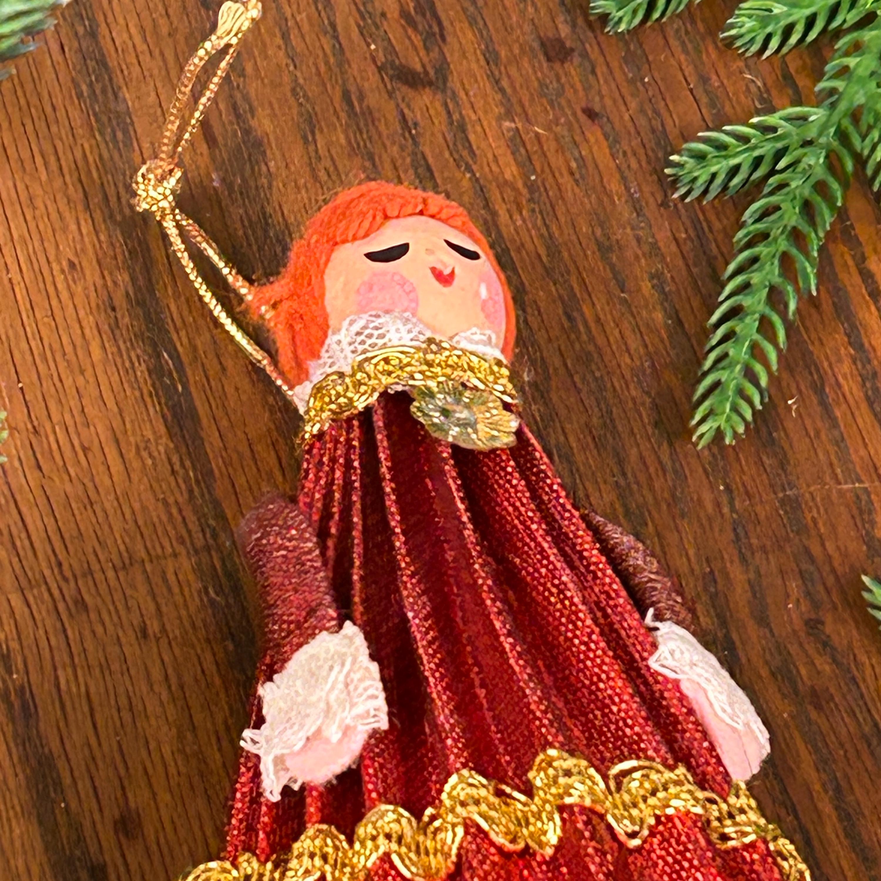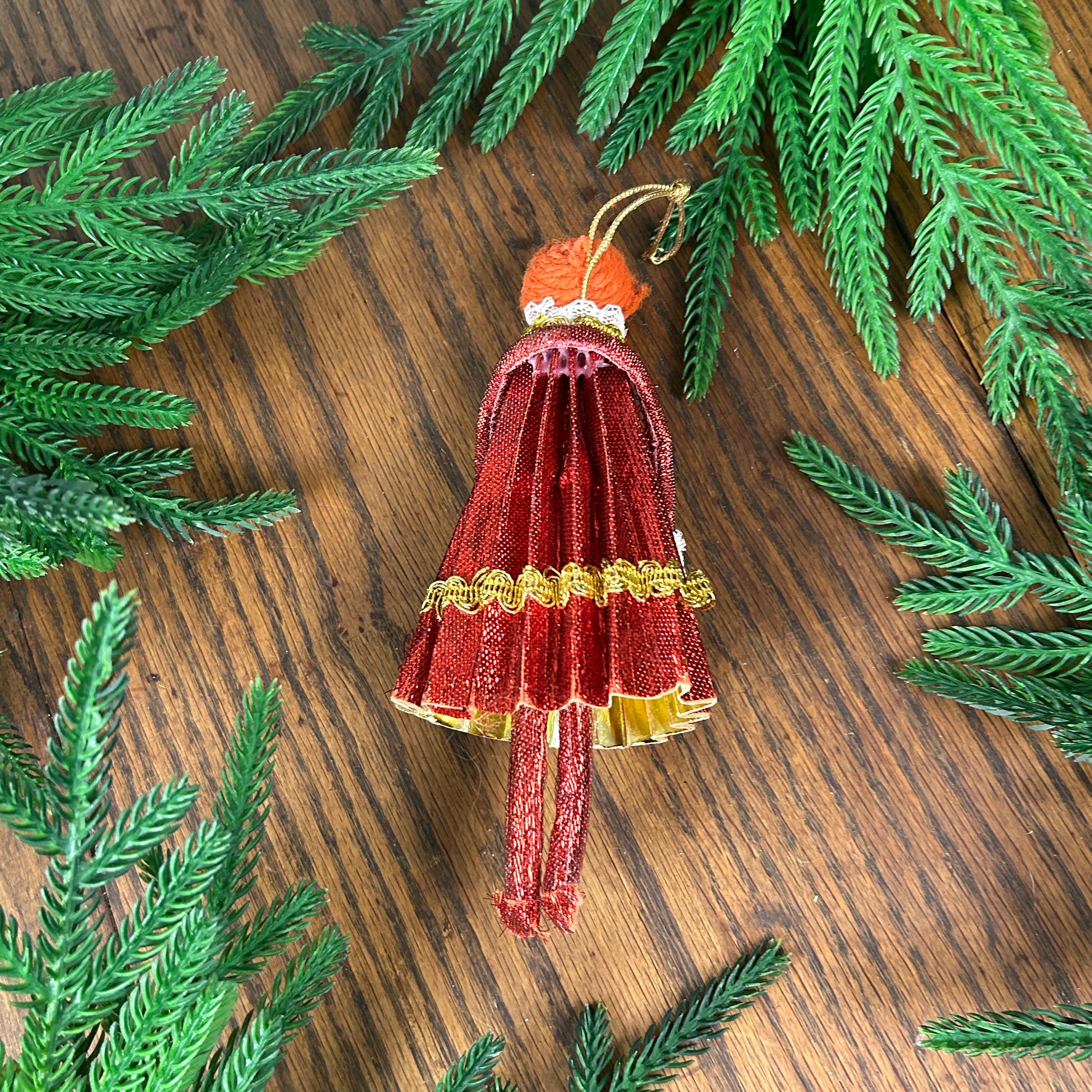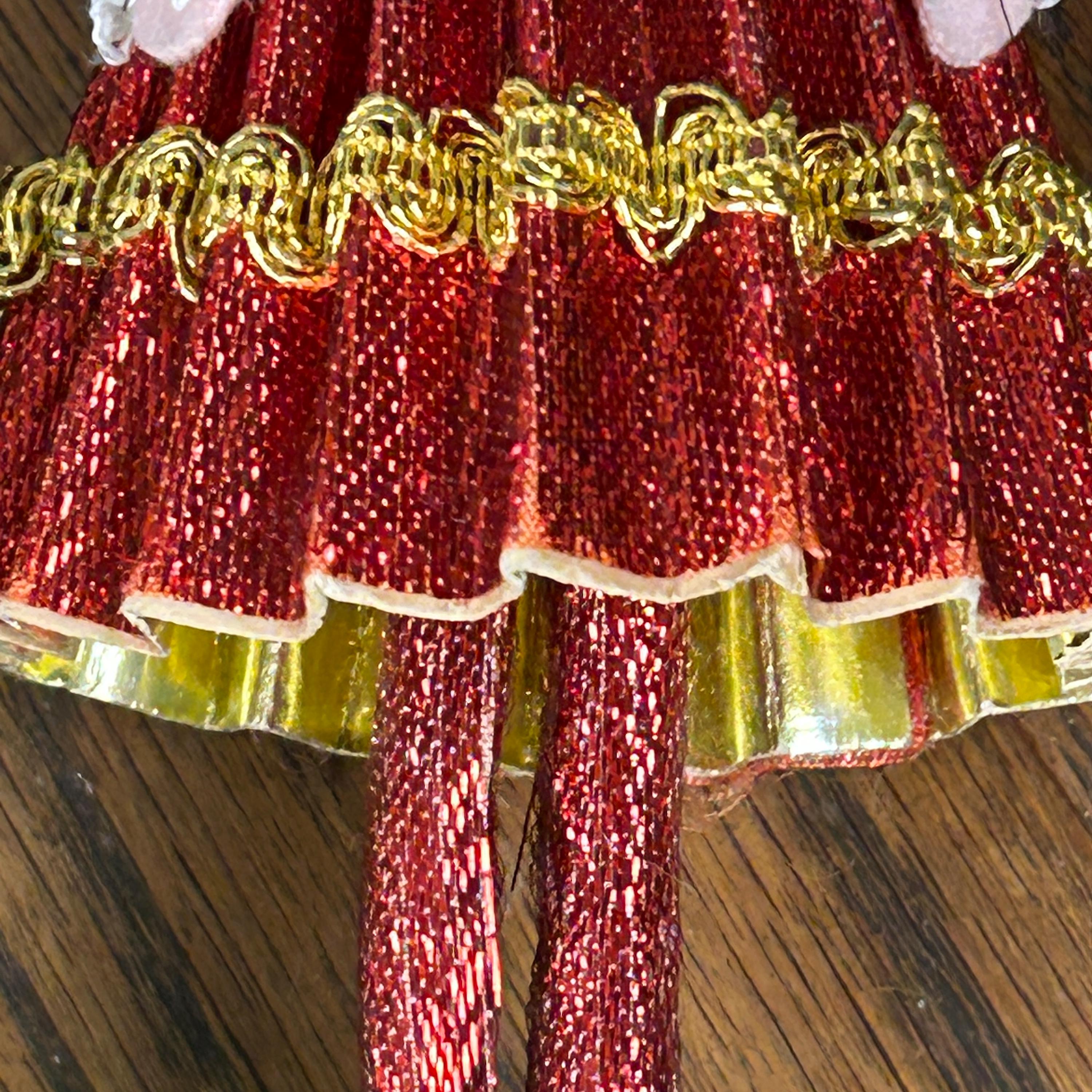 This vintage ornament is a 1969 "Mr. Christmas" girl or angel figure, featuring a red dress made of cardboard, yarn and fabric.