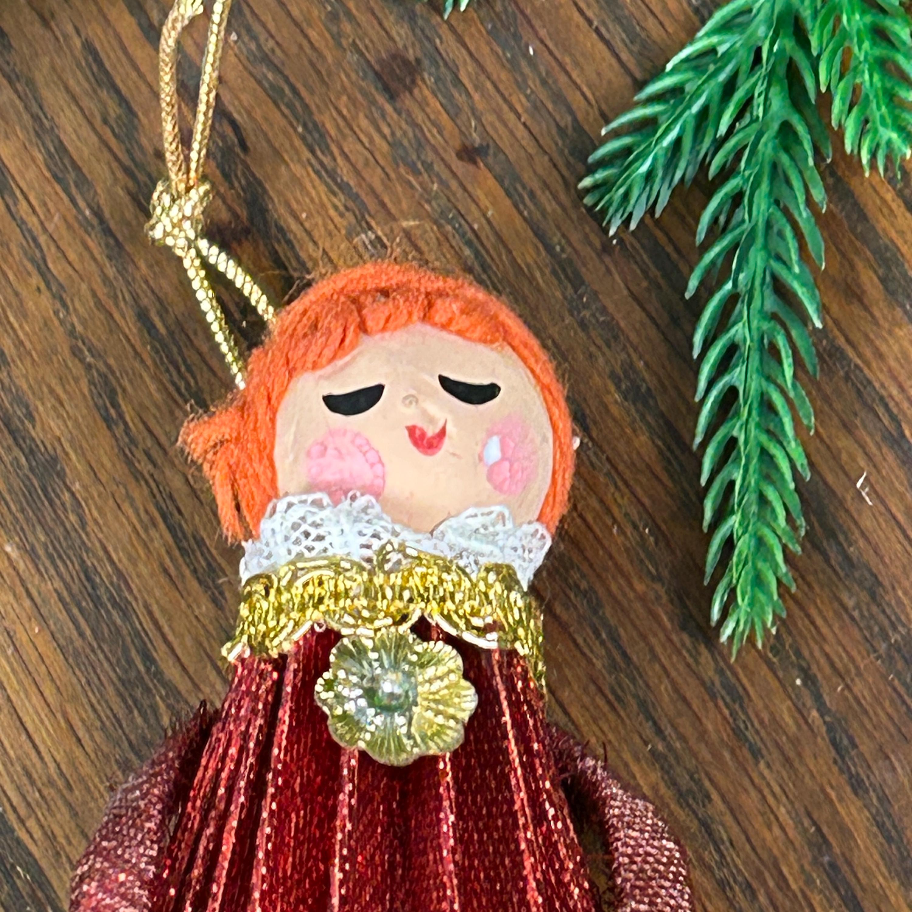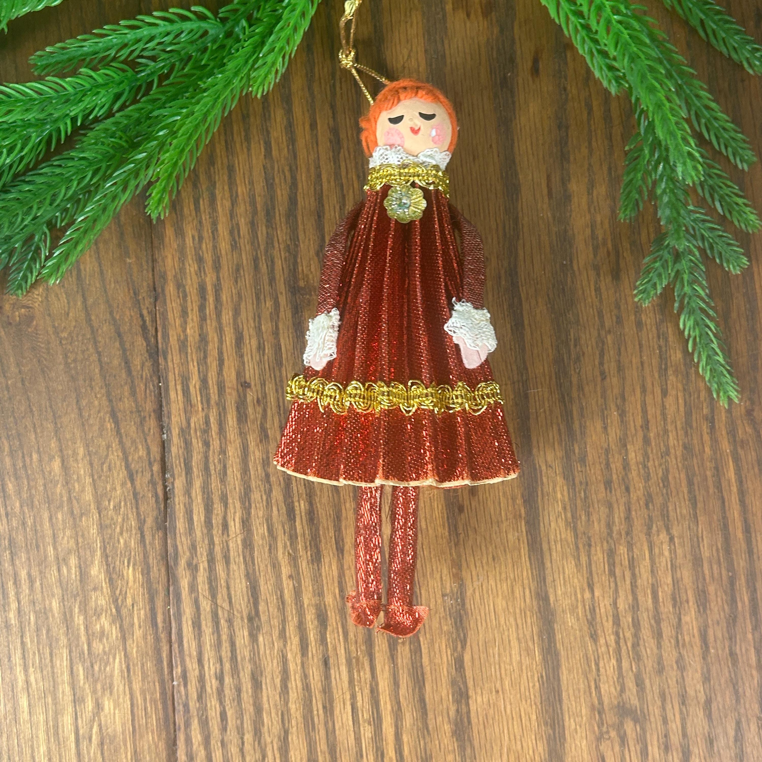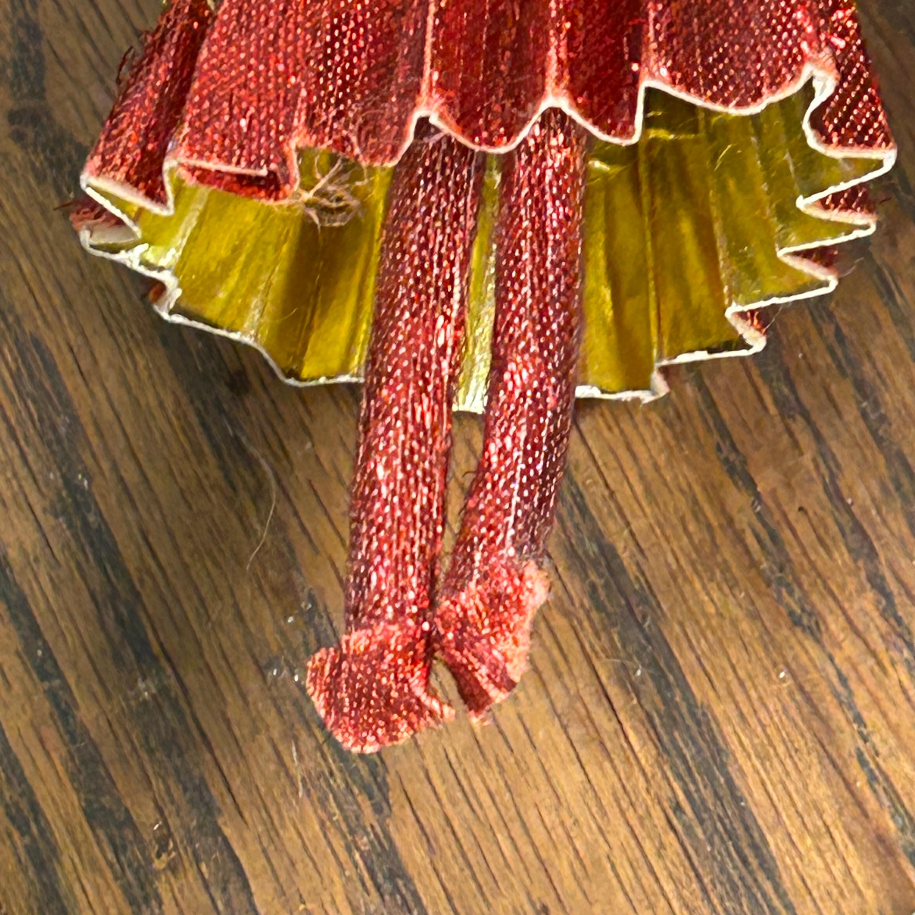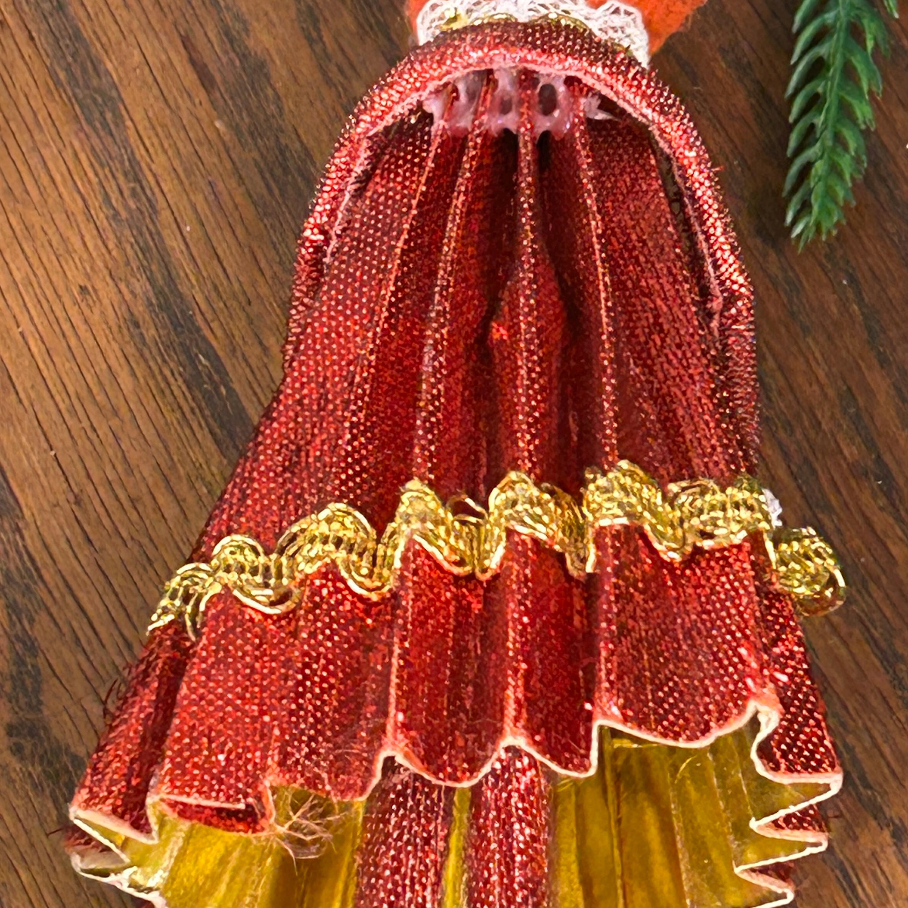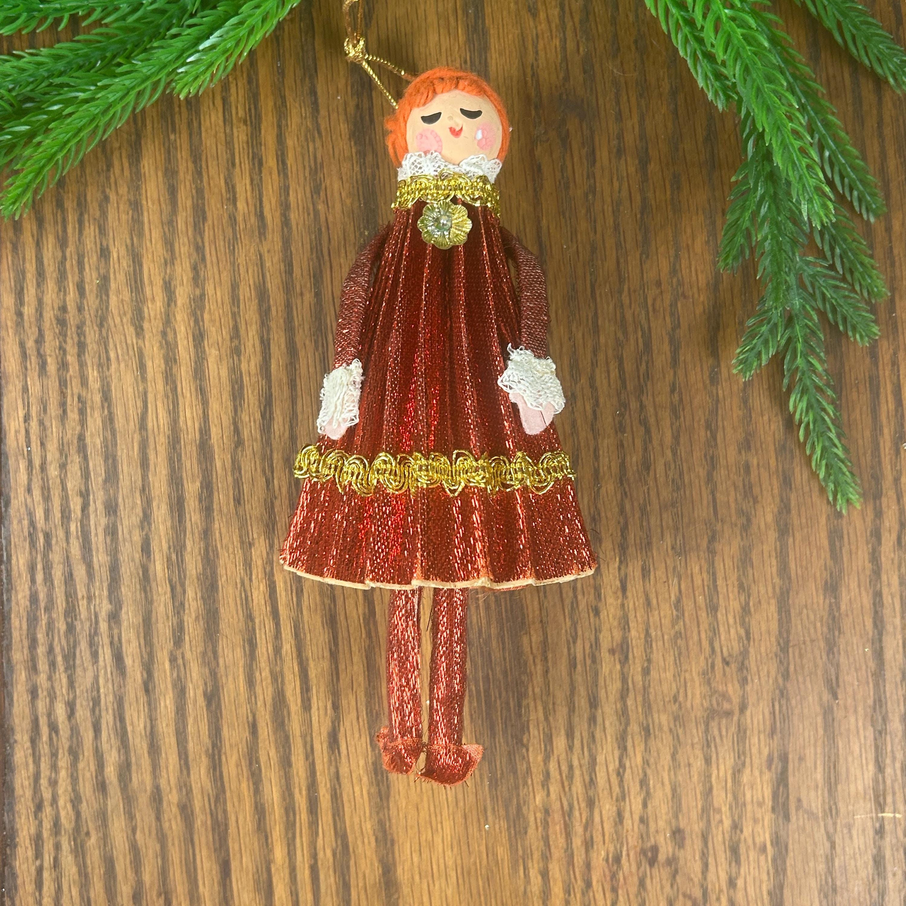 This vintage ornament is a 1969 "Mr. Christmas" girl or angel figure, featuring a red dress made of cardboard, yarn and fabric.