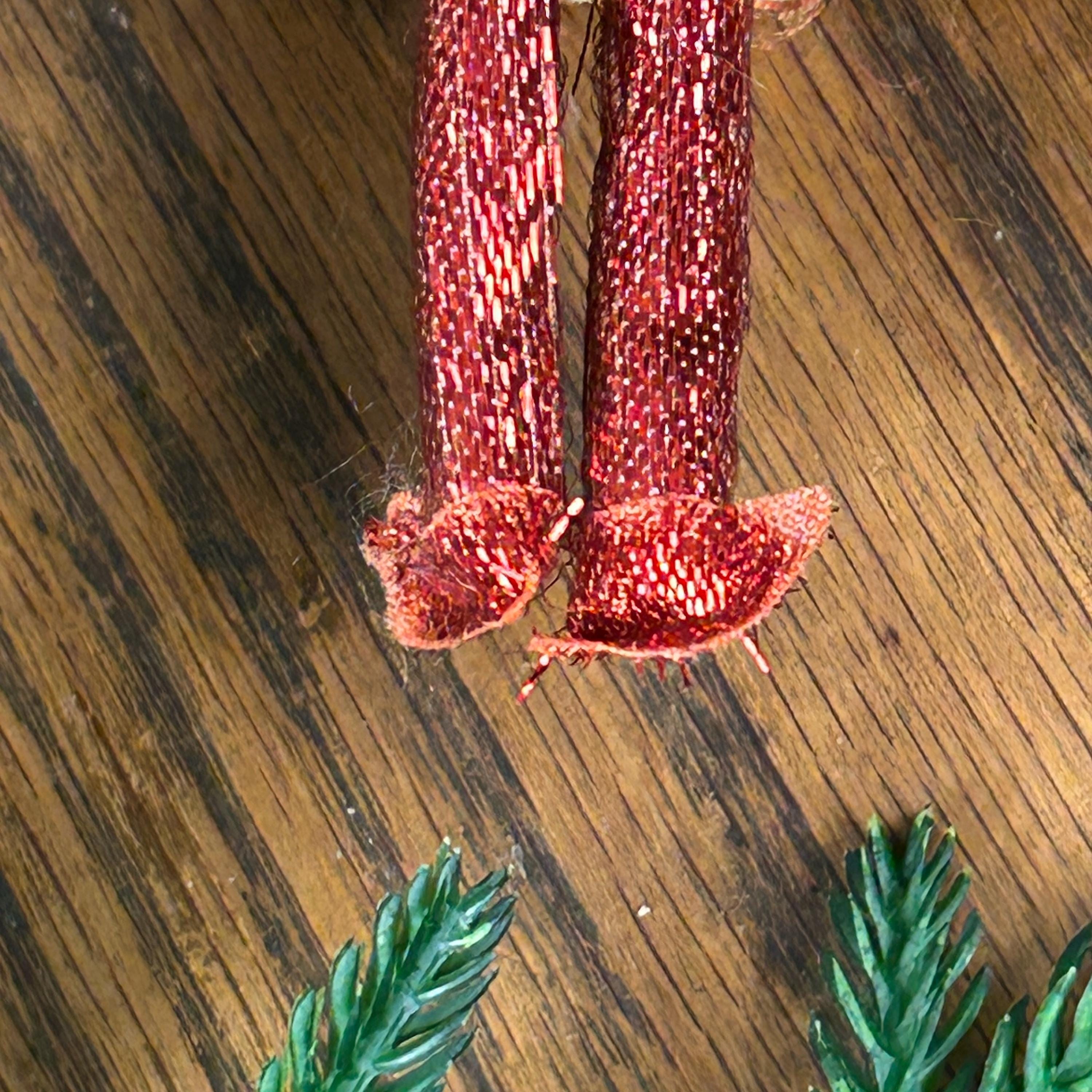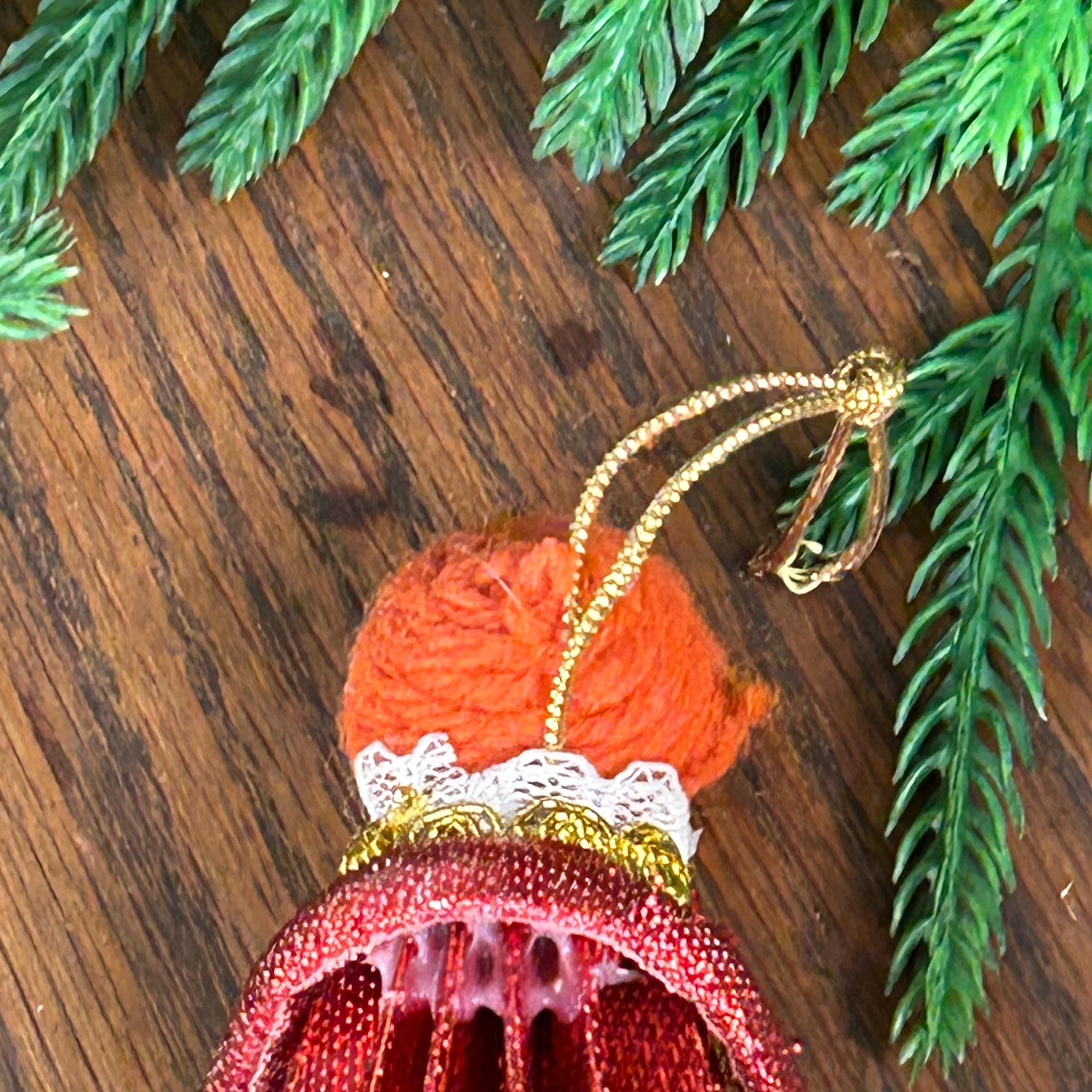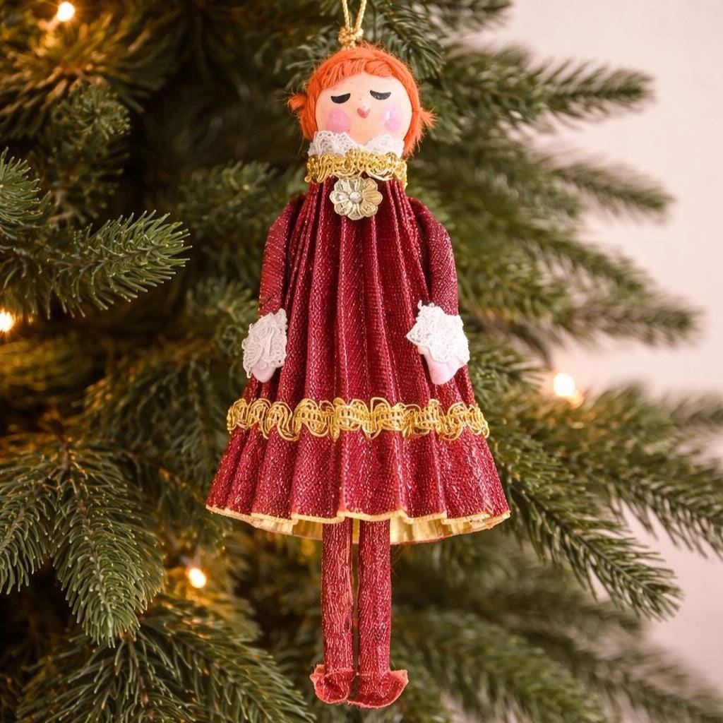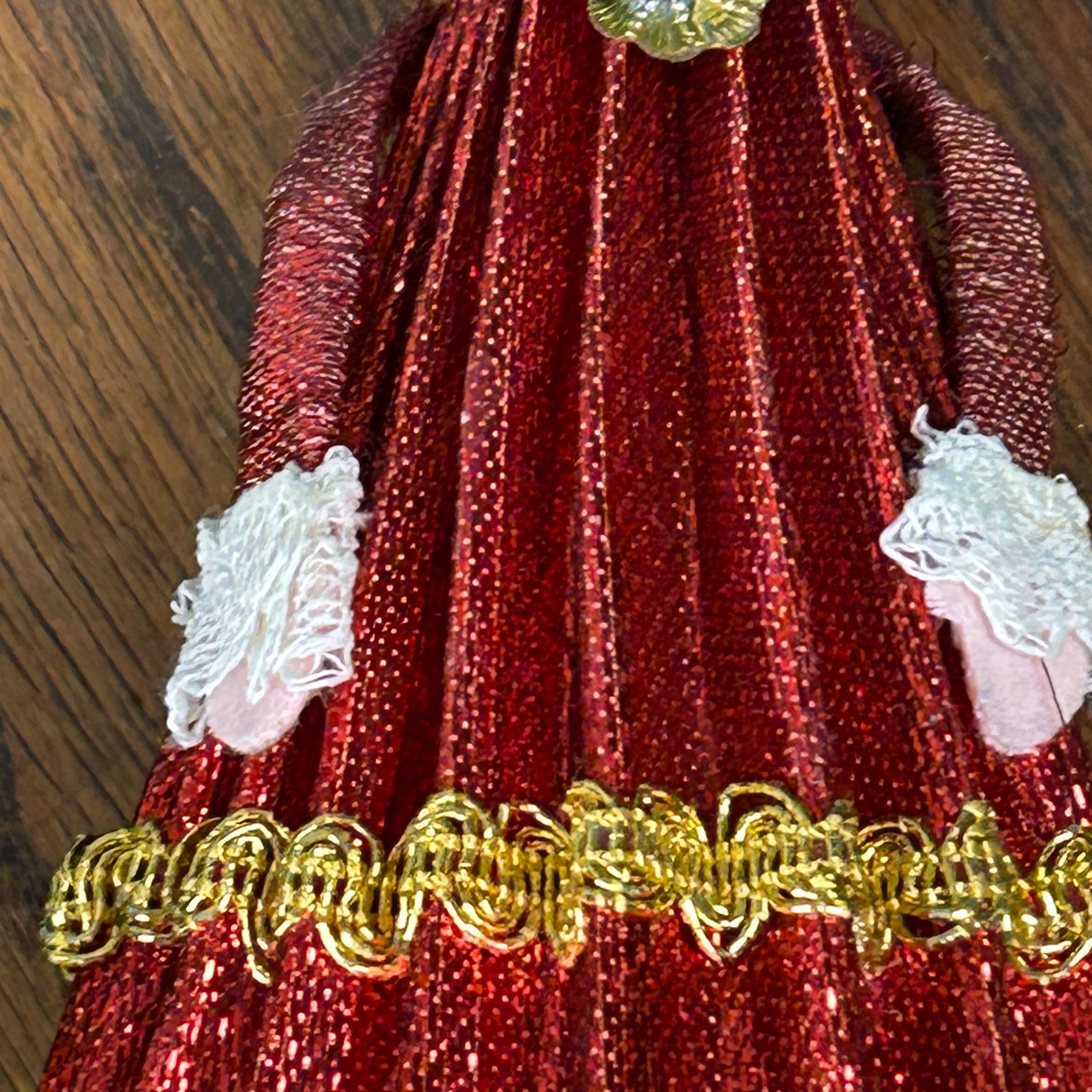 This vintage ornament is a 1969 "Mr. Christmas" girl or angel figure, featuring a red dress made of cardboard, yarn and fabric.