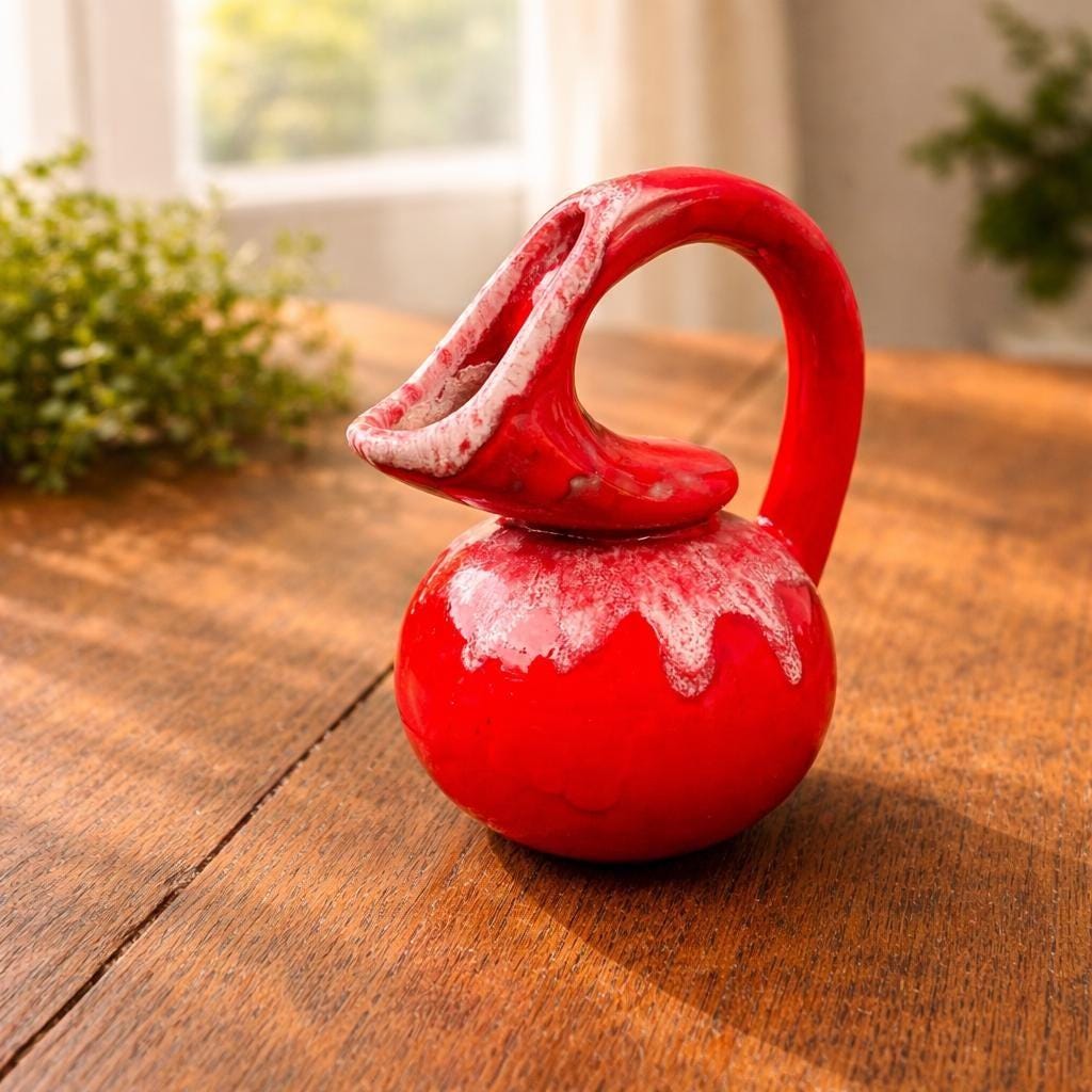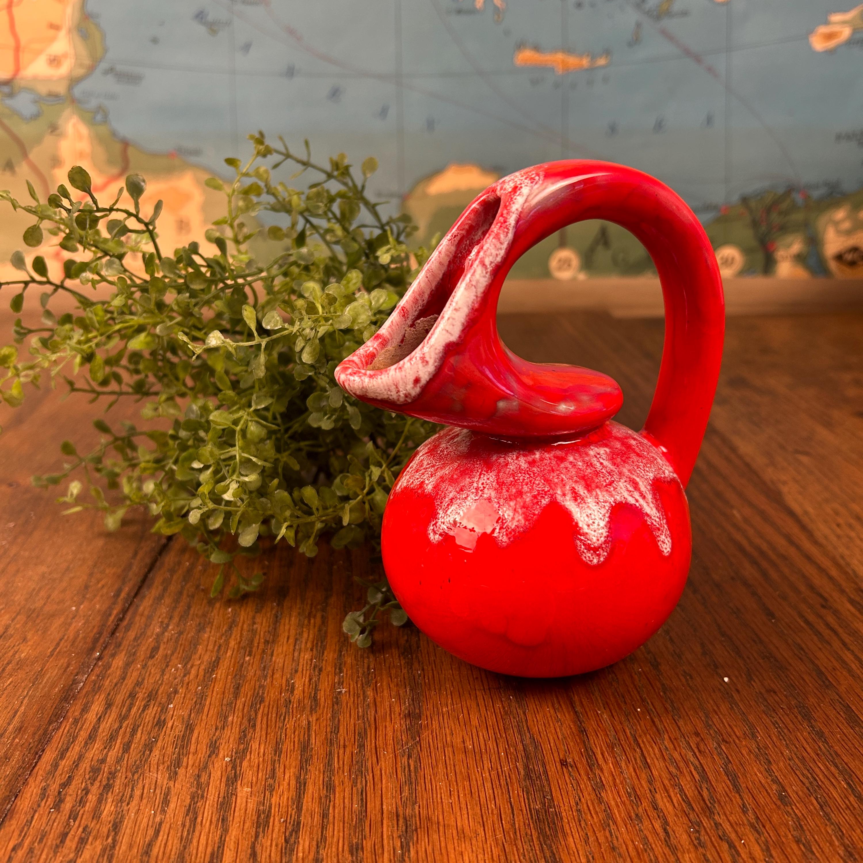 This is a mid-century modern red art pottery pitcher or ewer, possibly a hobbyist piece from the 1950s.