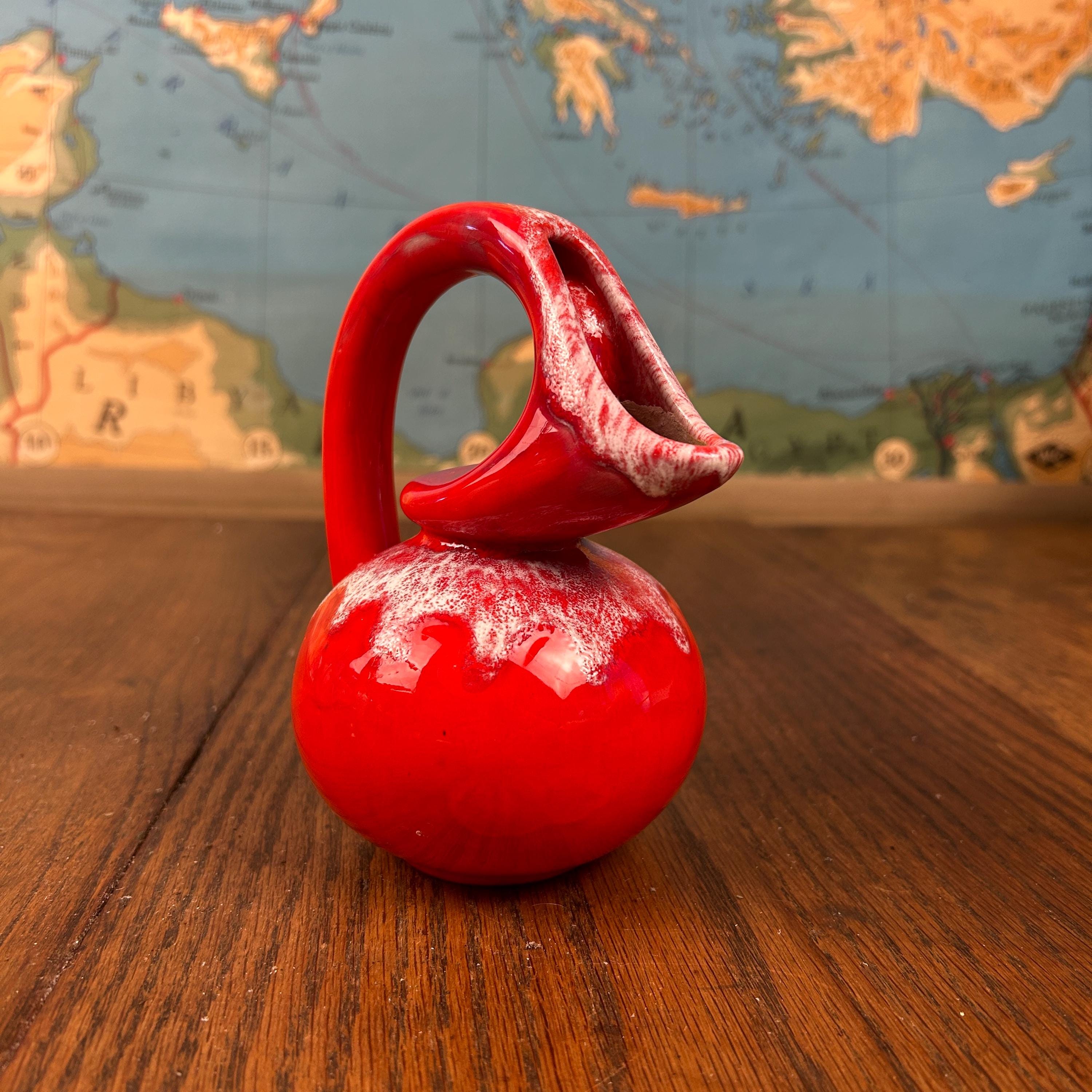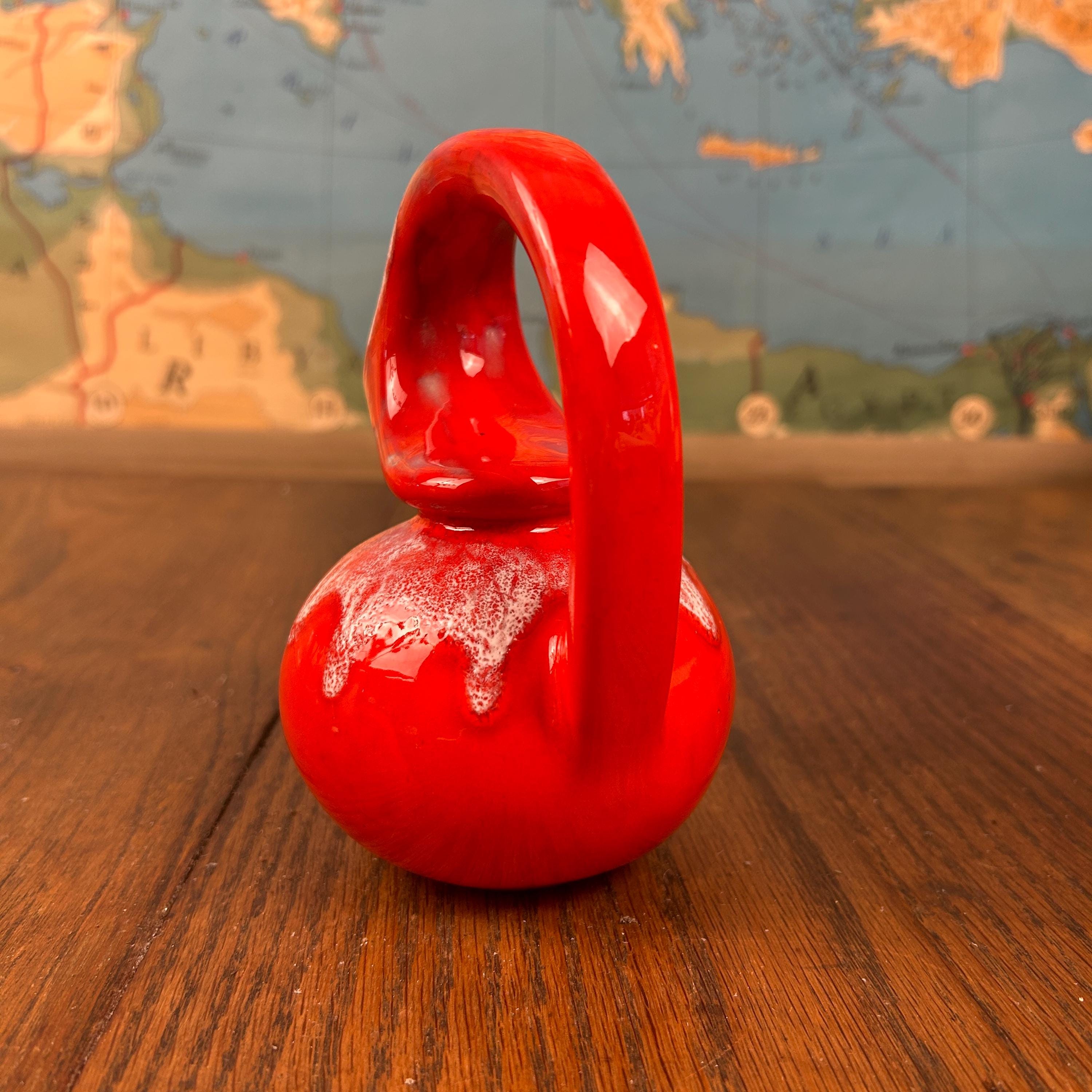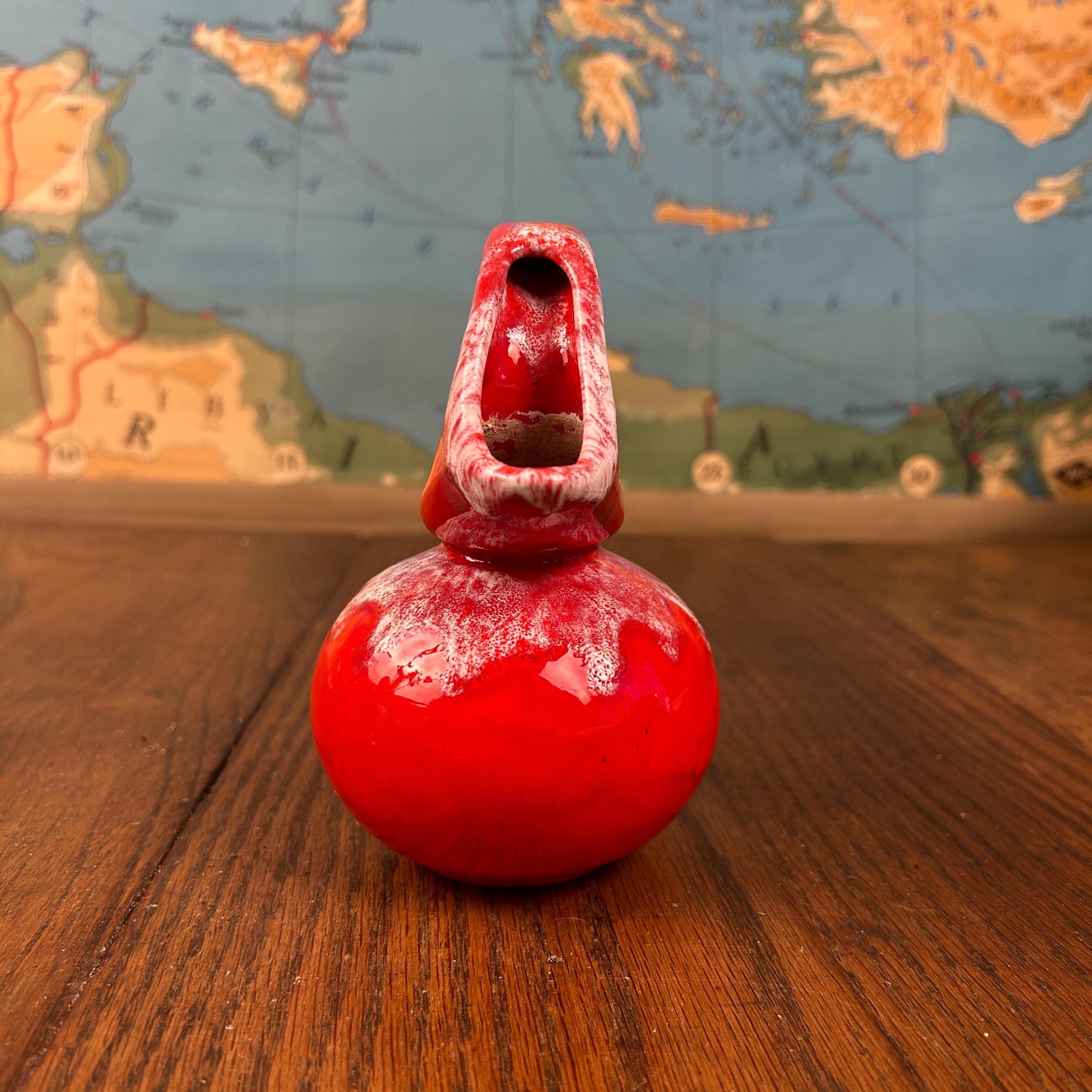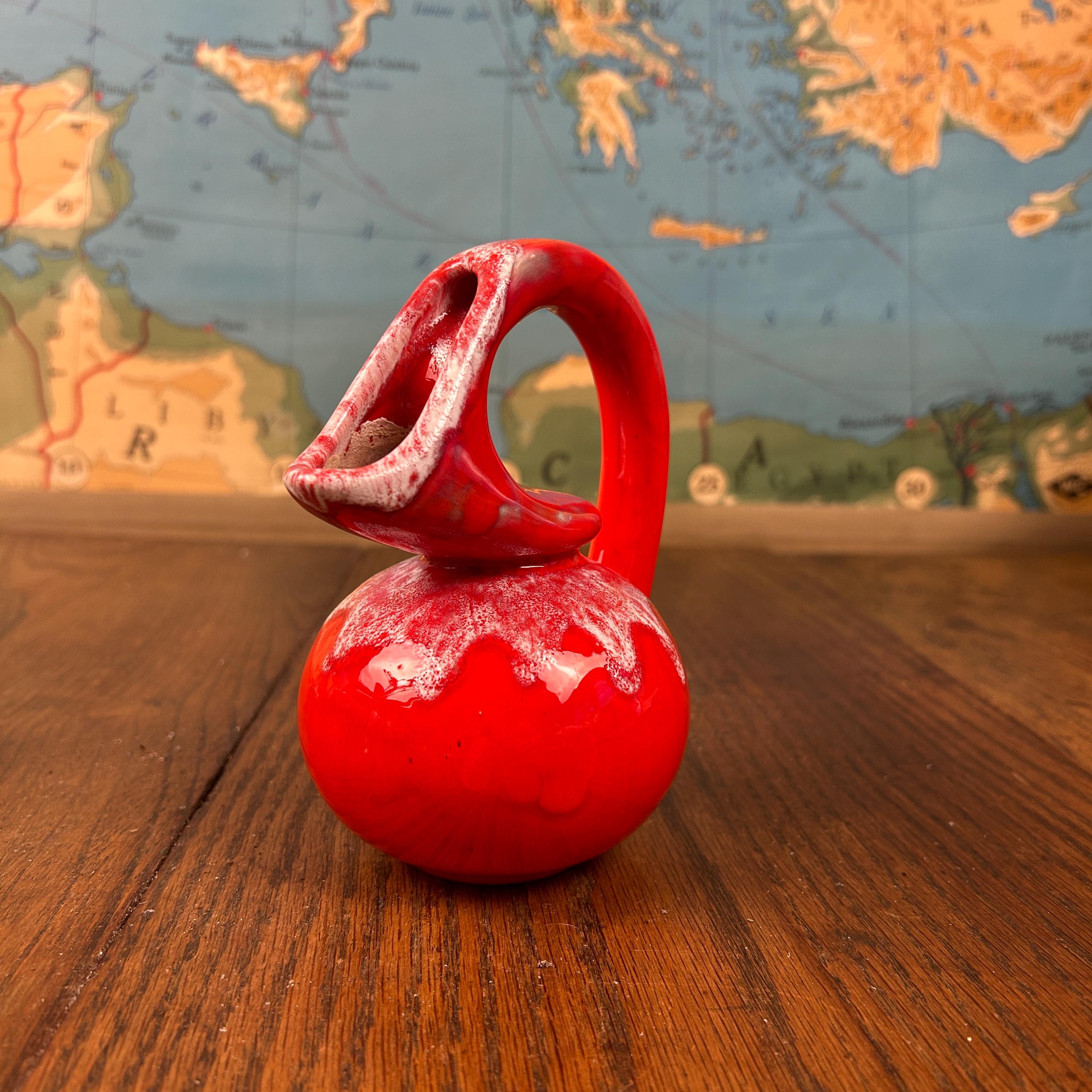 The piece has a glossy red glaze with a contrasting white drip or mottled effect around the top.
