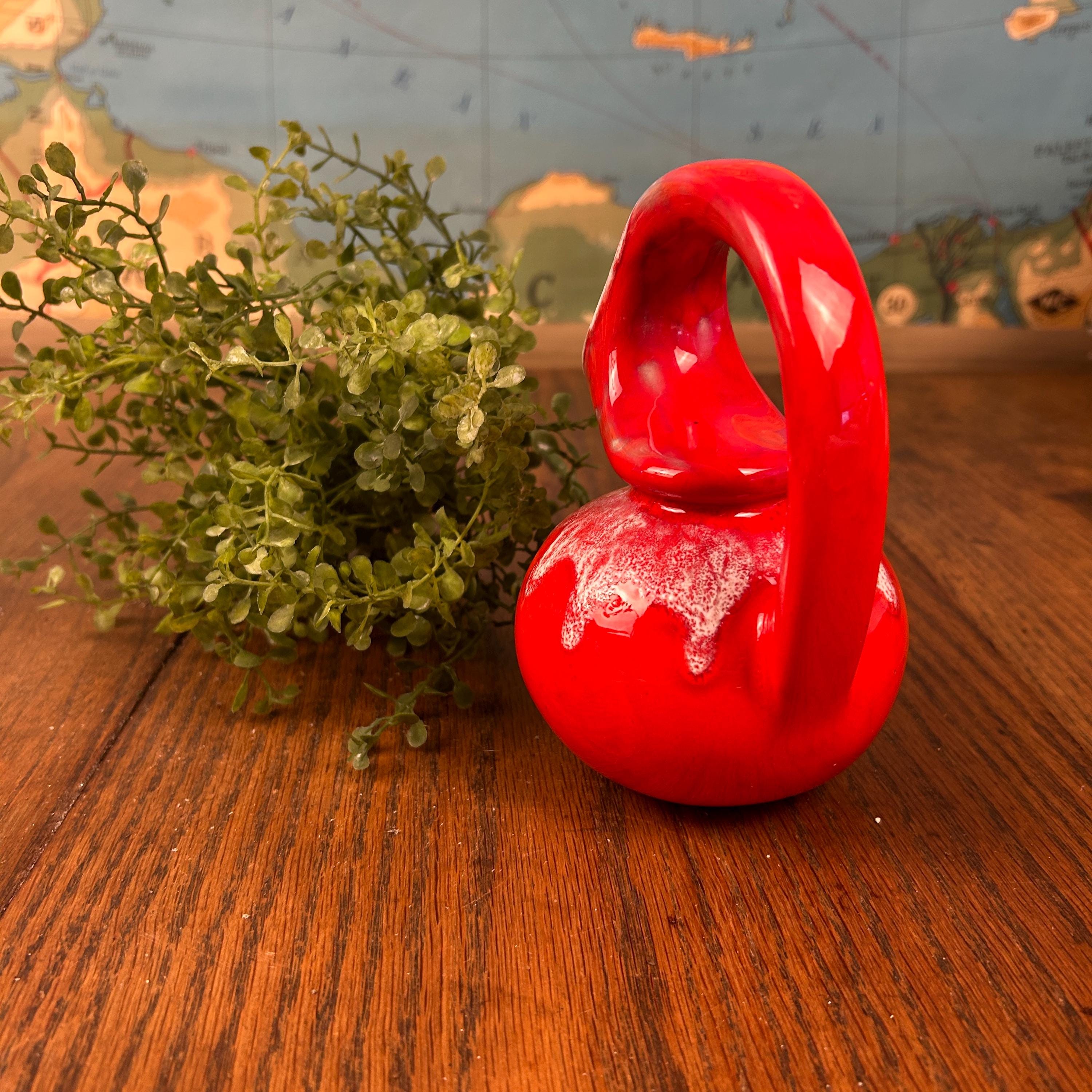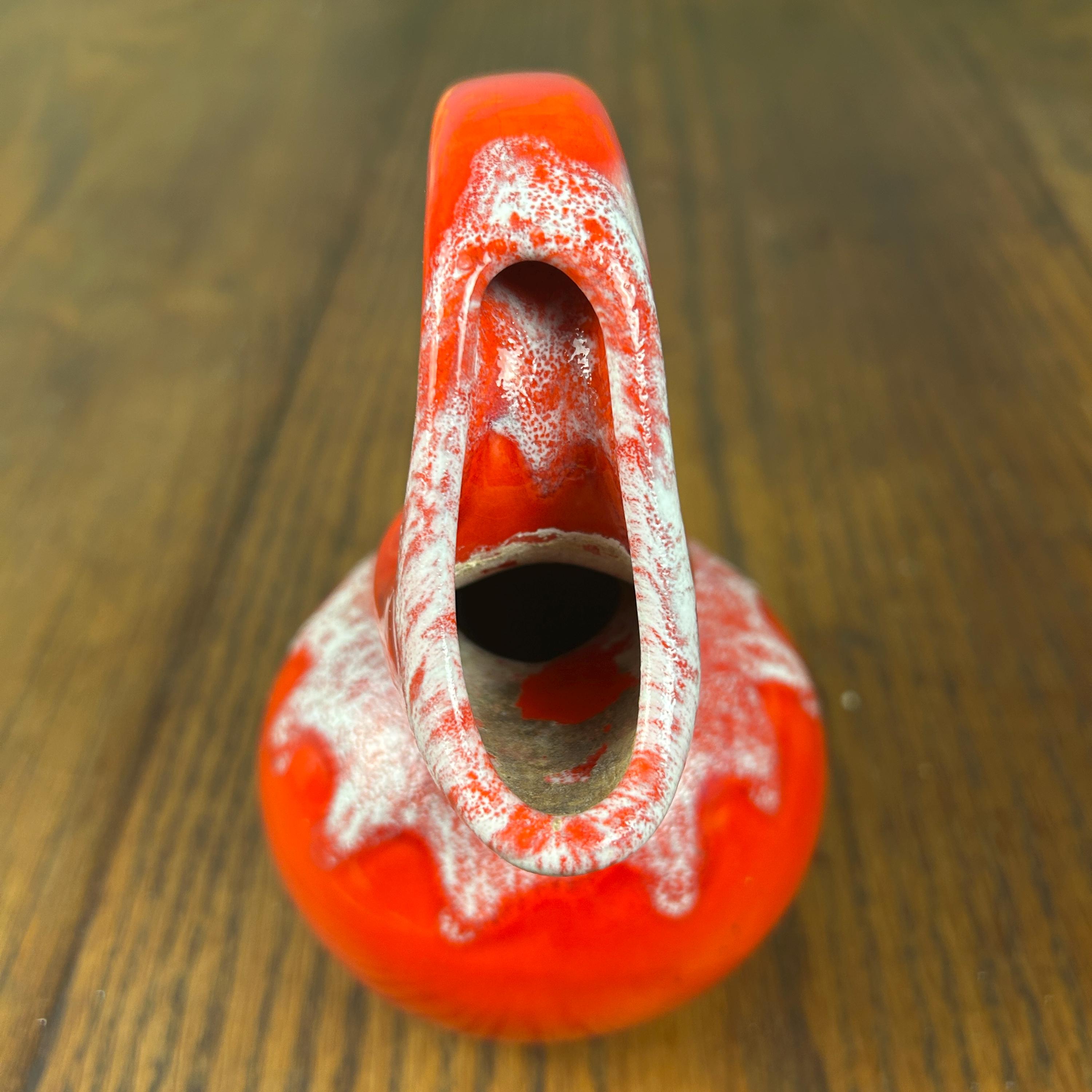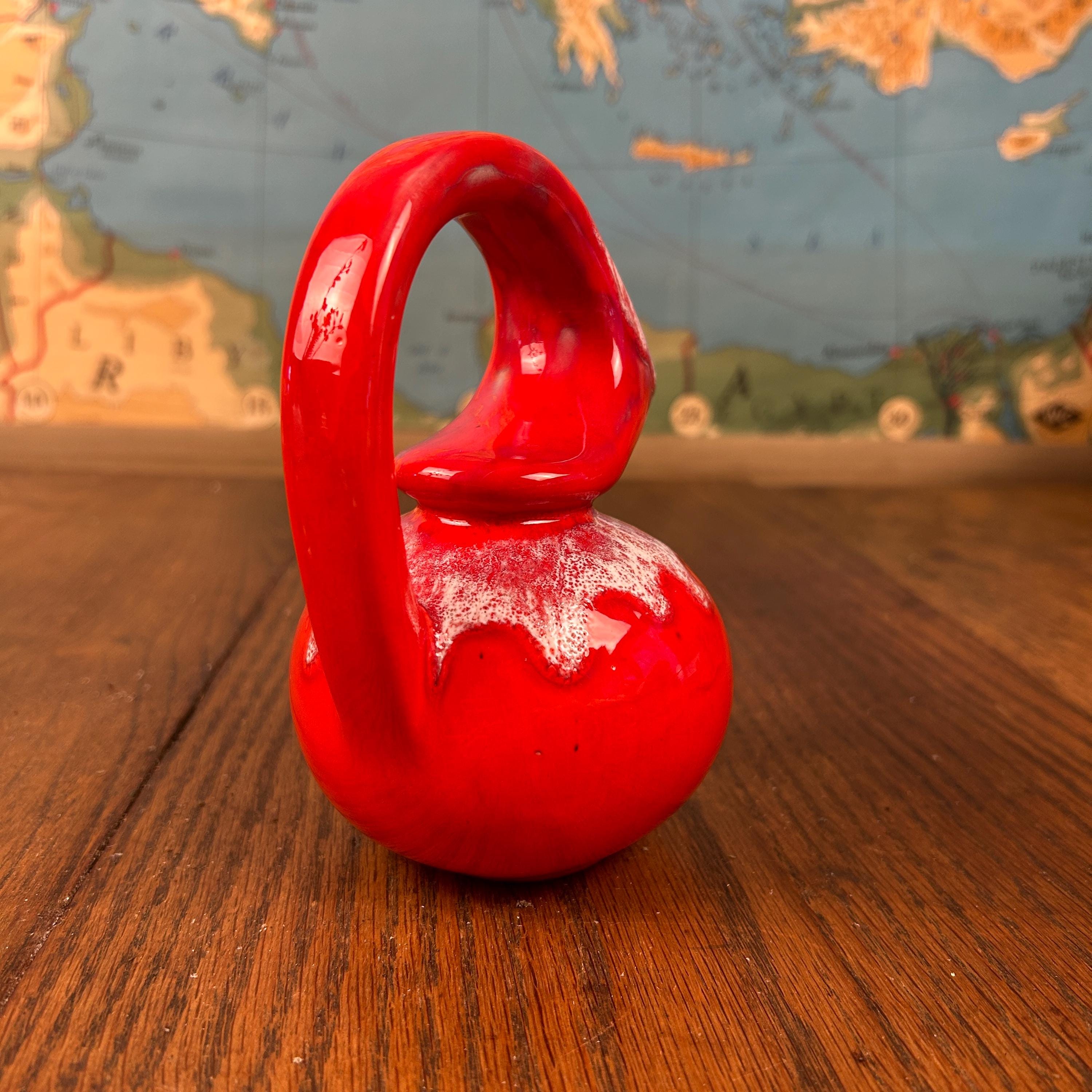 The piece has a glossy red glaze with a contrasting white drip or mottled effect around the top.