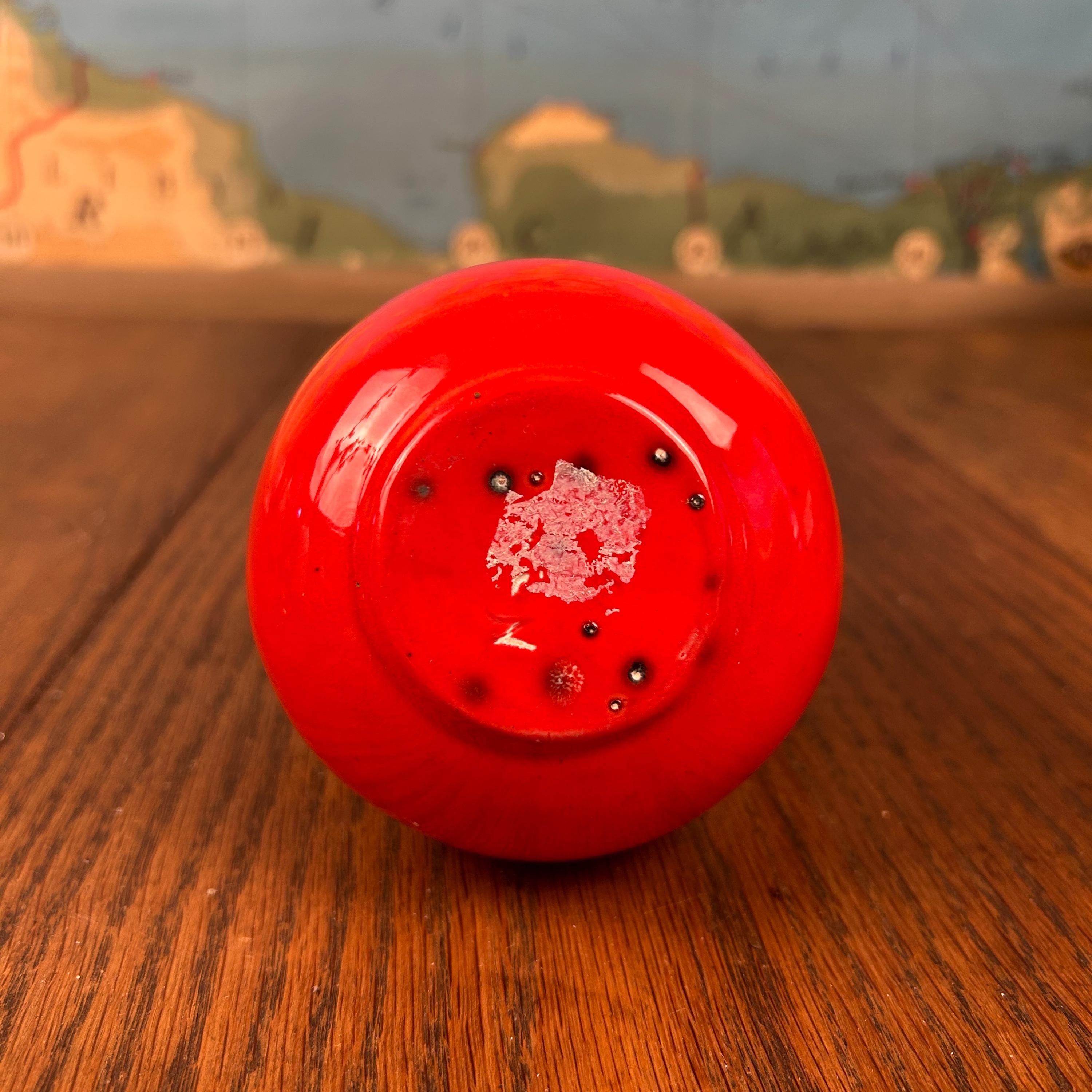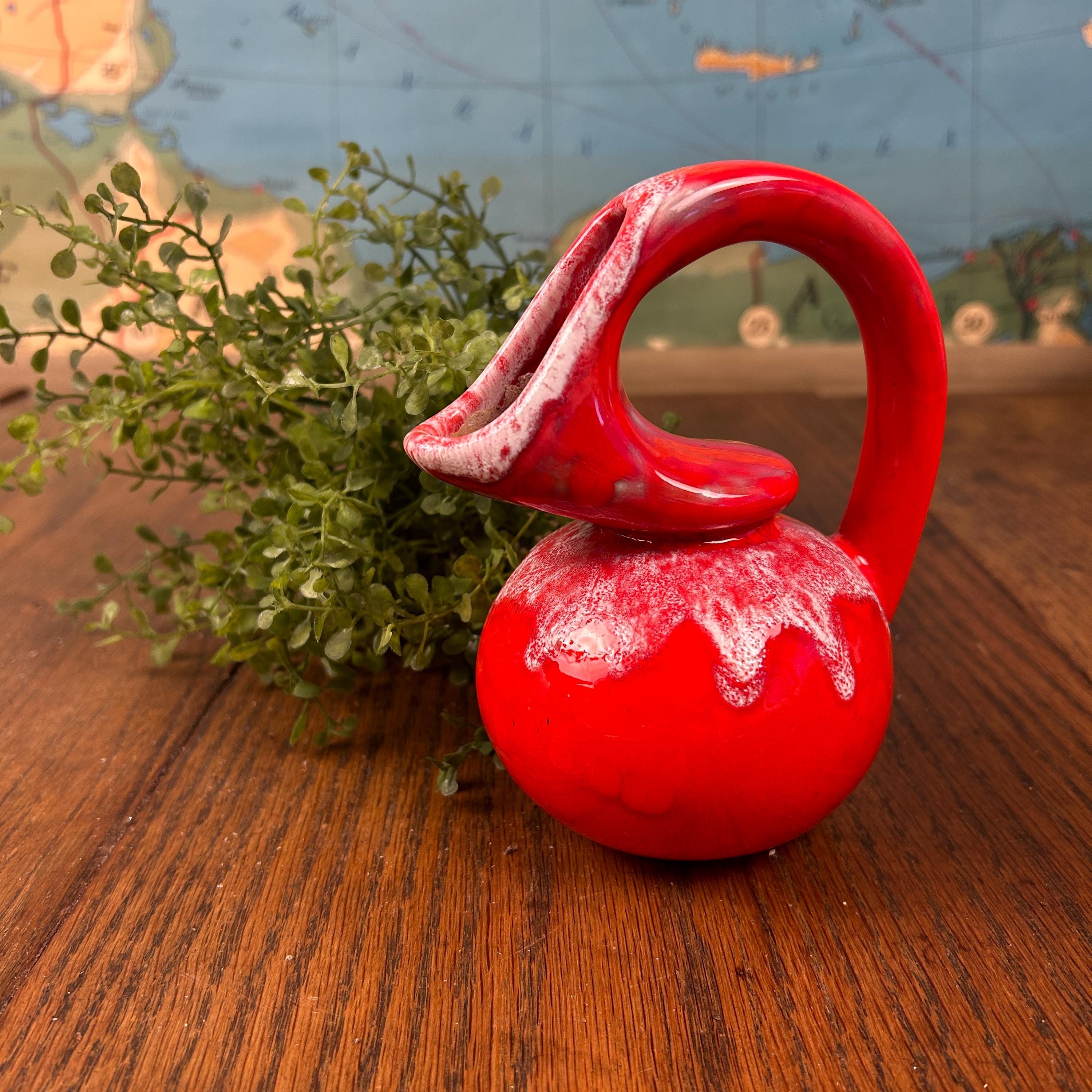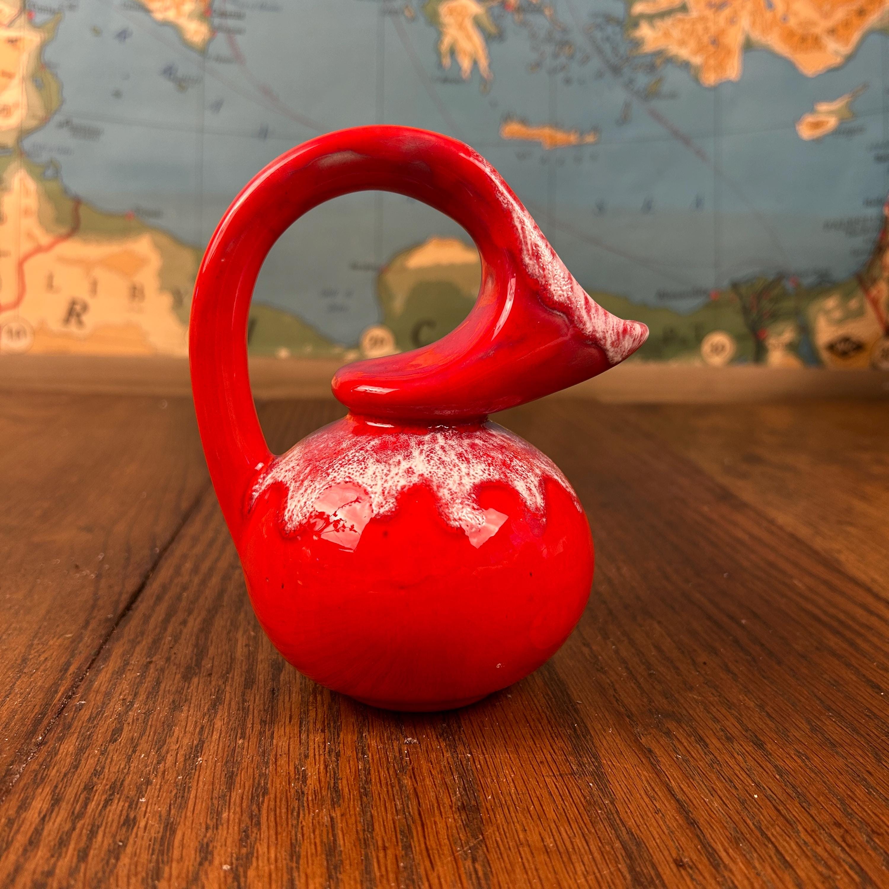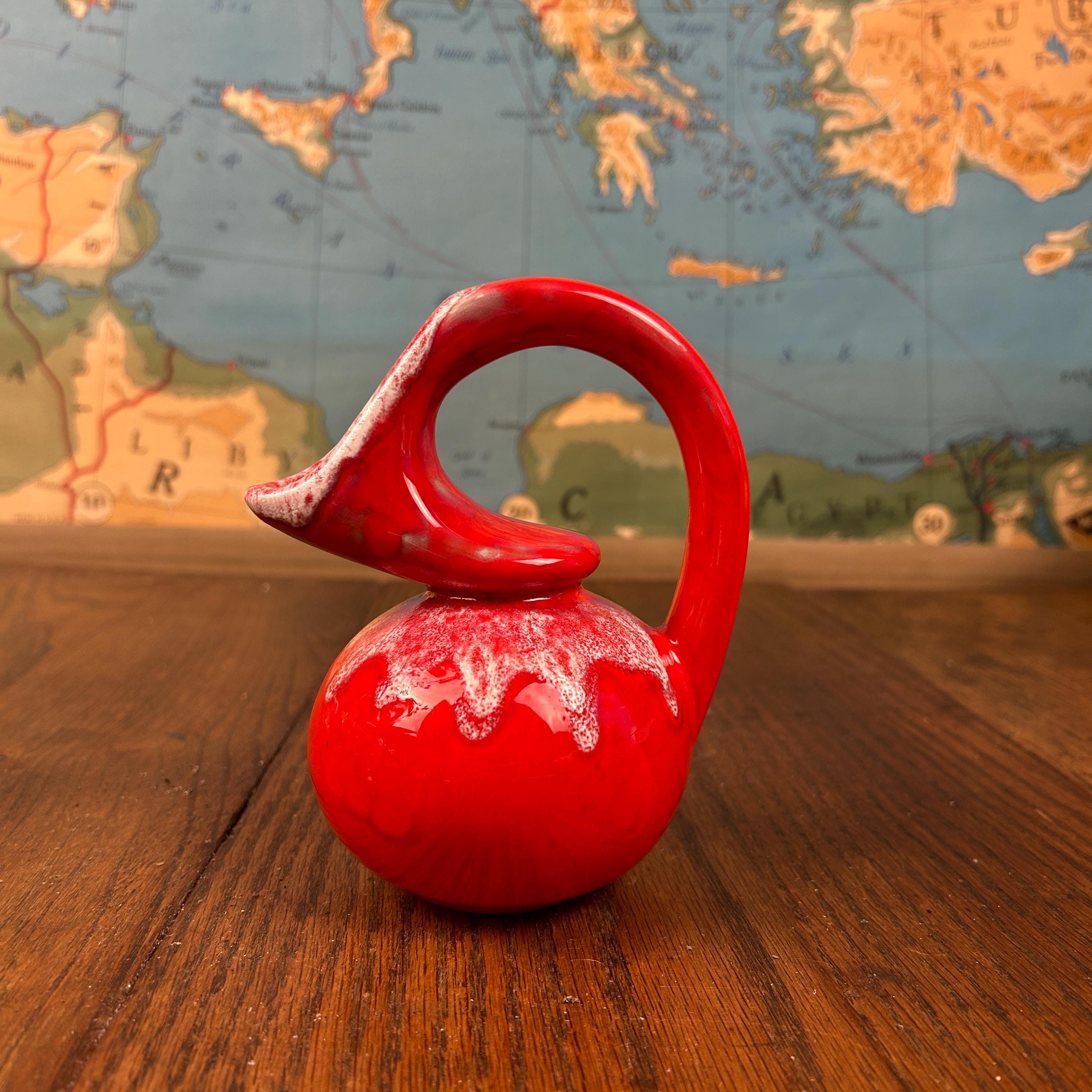 The piece has a glossy red glaze with a contrasting white drip or mottled effect around the top.