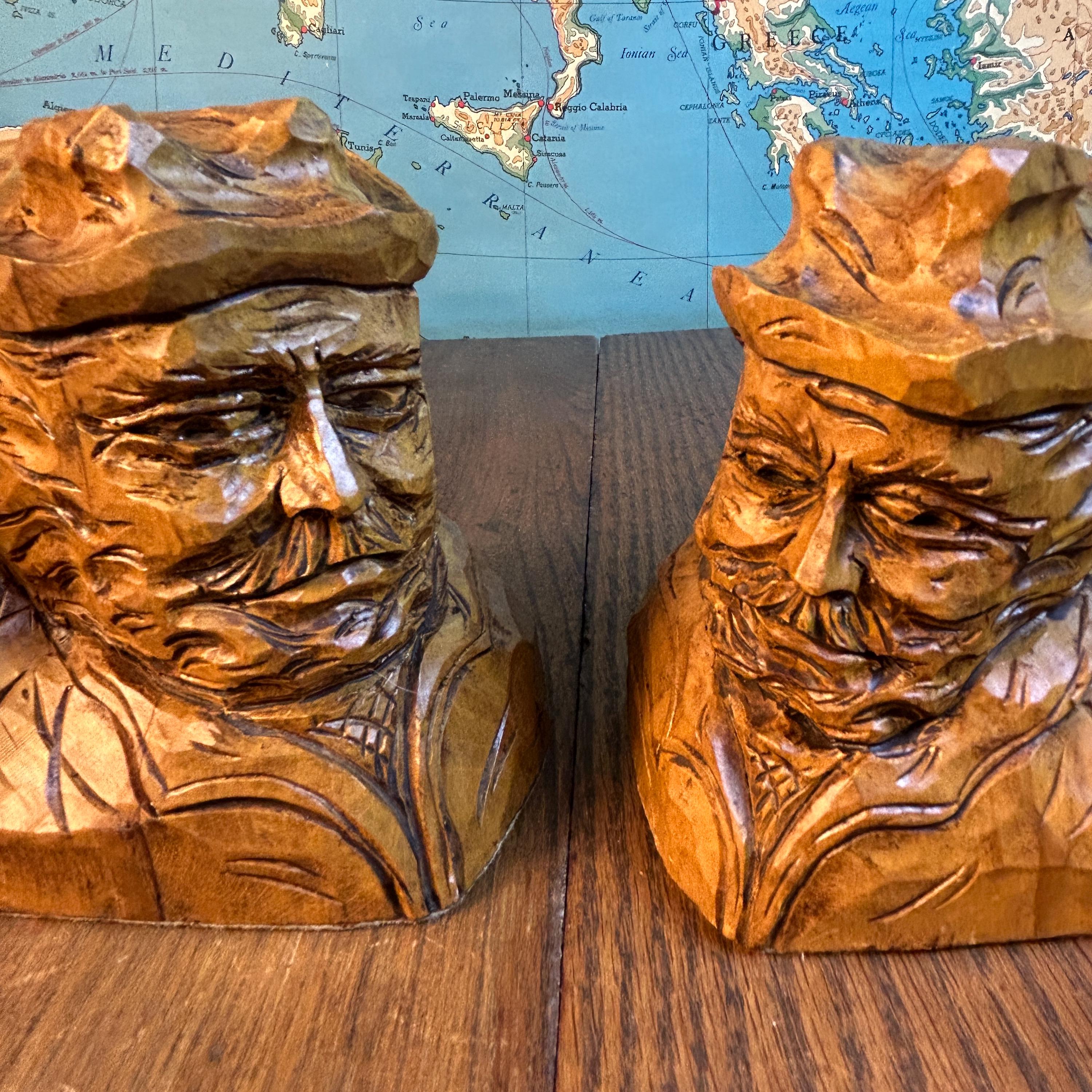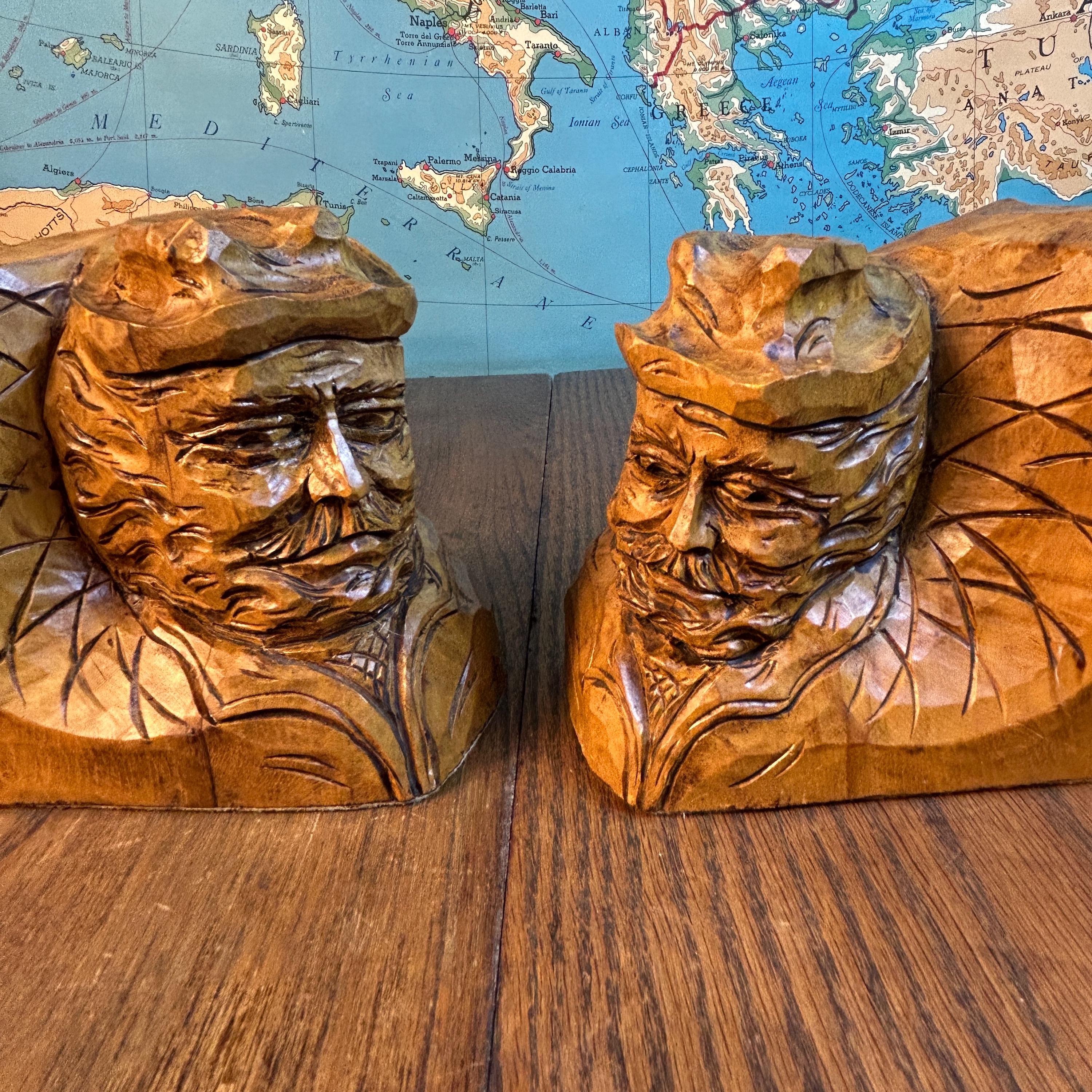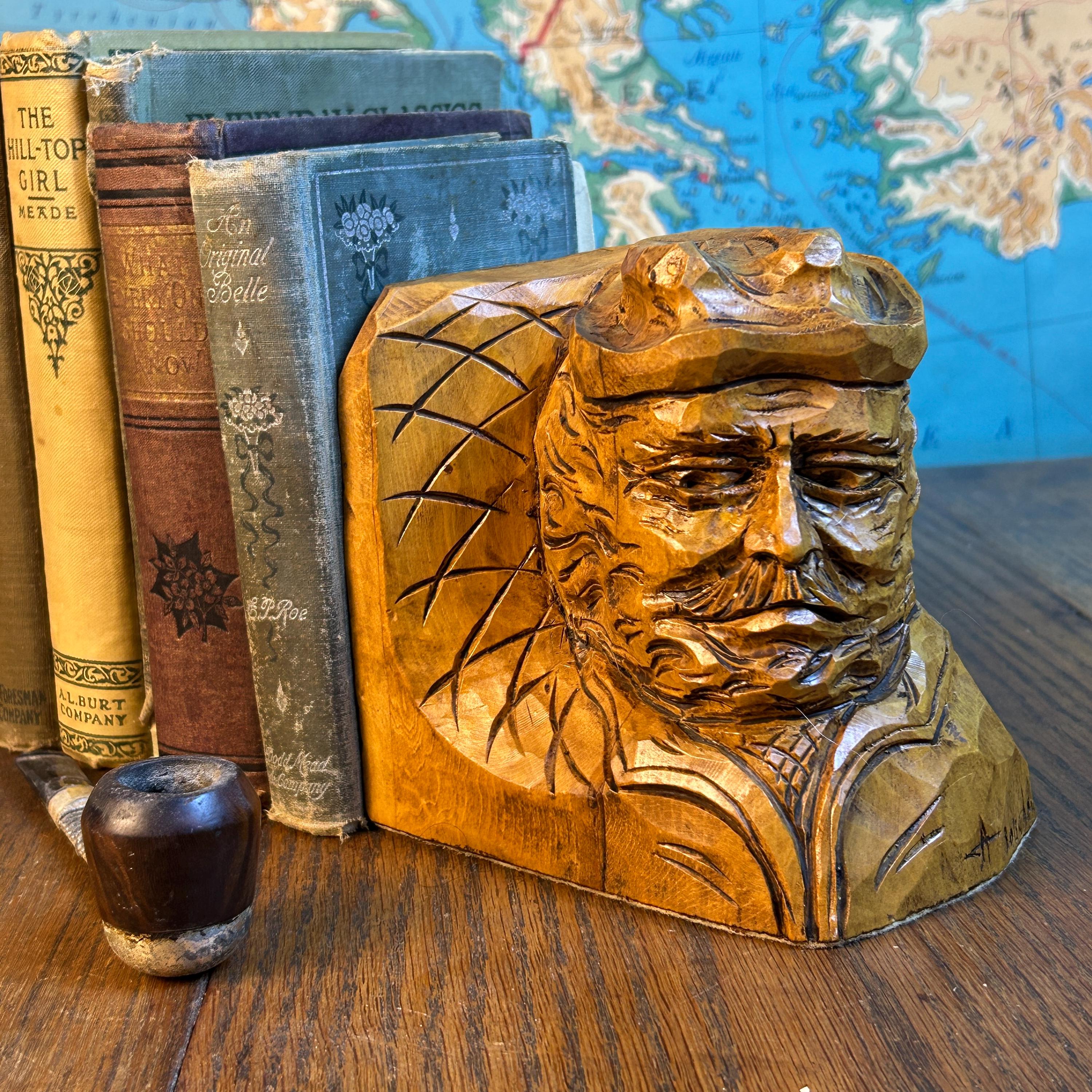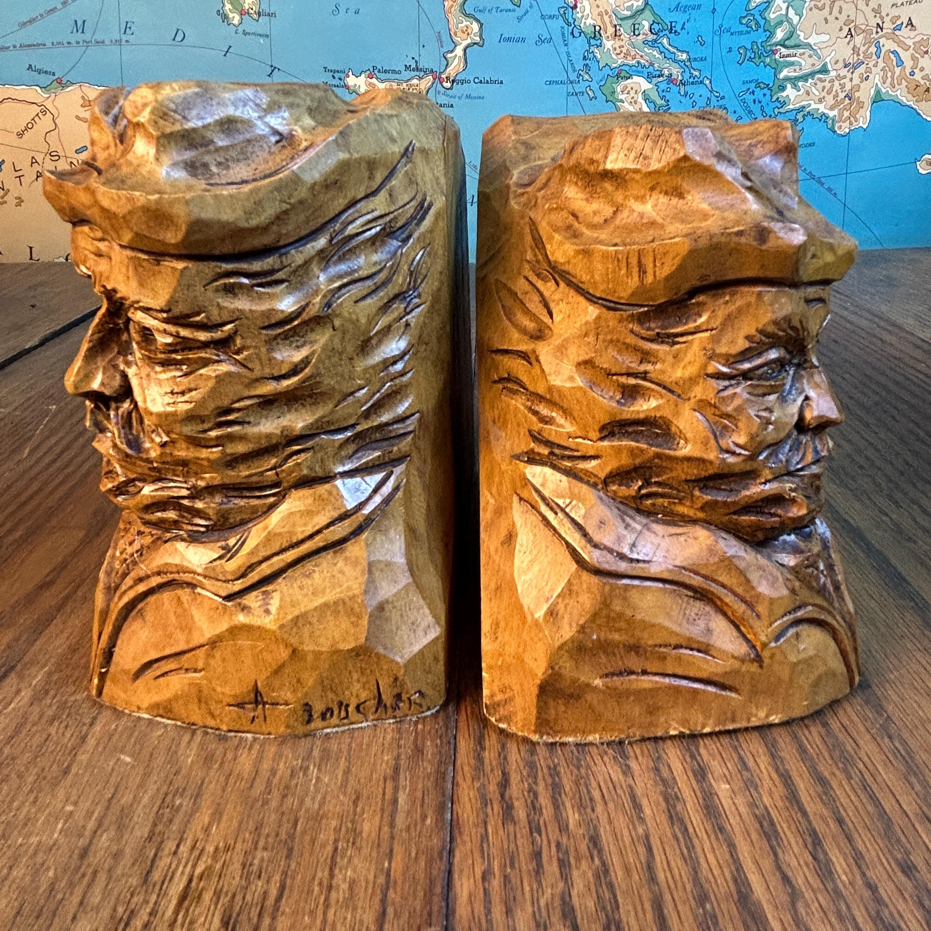 These are a stunning pair of hand-carved bookends by Canadian folk artist, Andre Boucher. They are original and signed with his name on the right bookend. The bottoms are covered in felt. This pair is two older men with hats, mustaches and bears and are loving made in the folk art tradition.