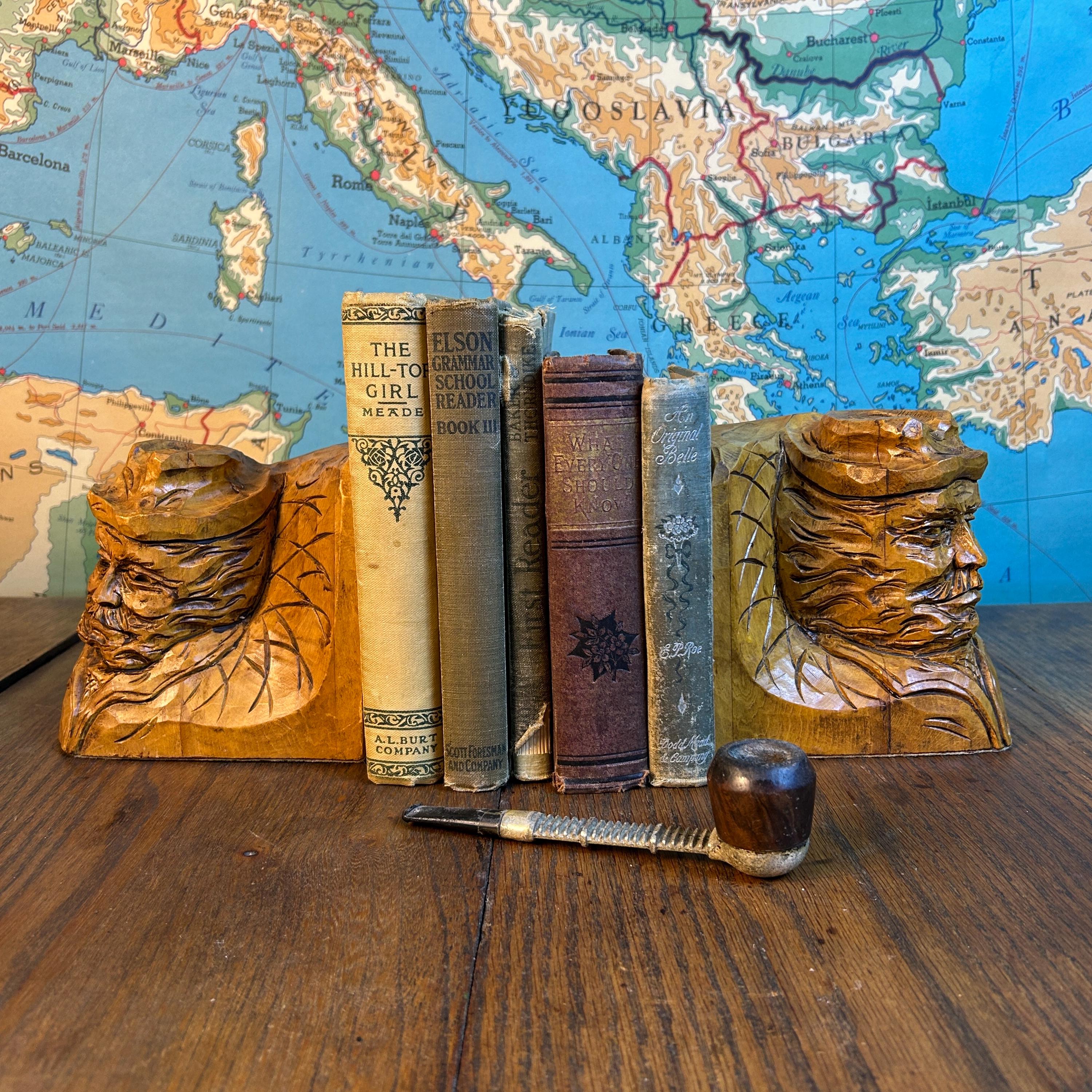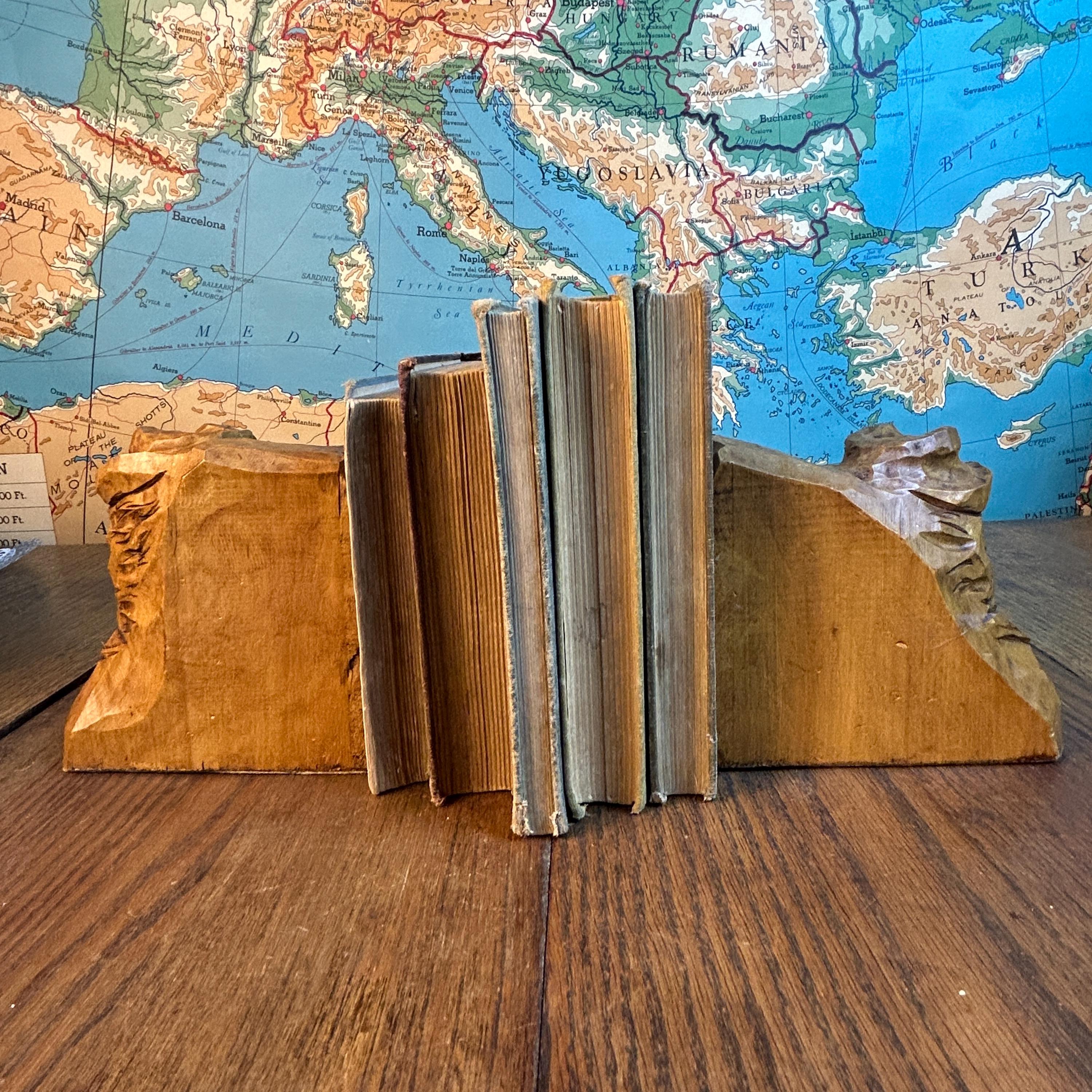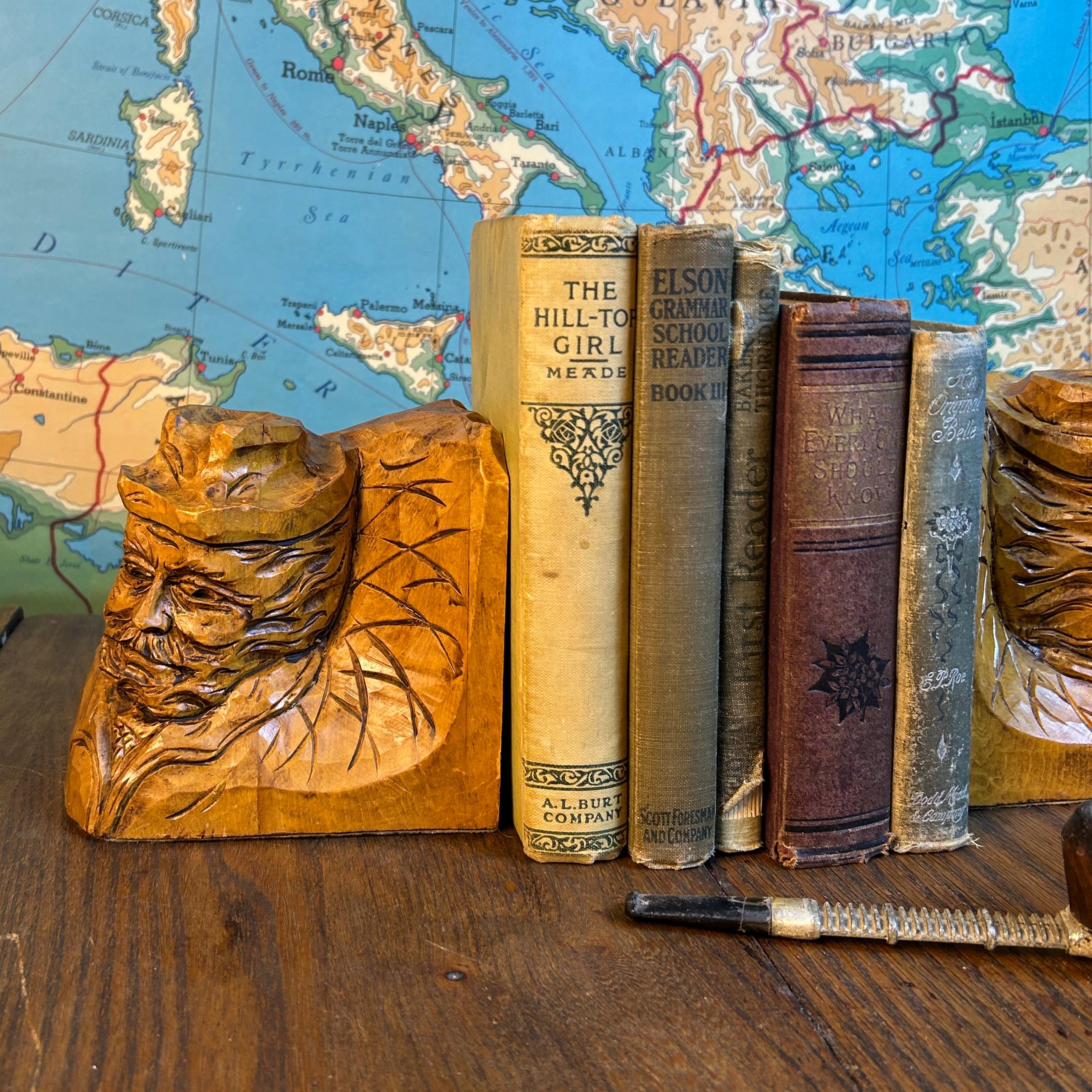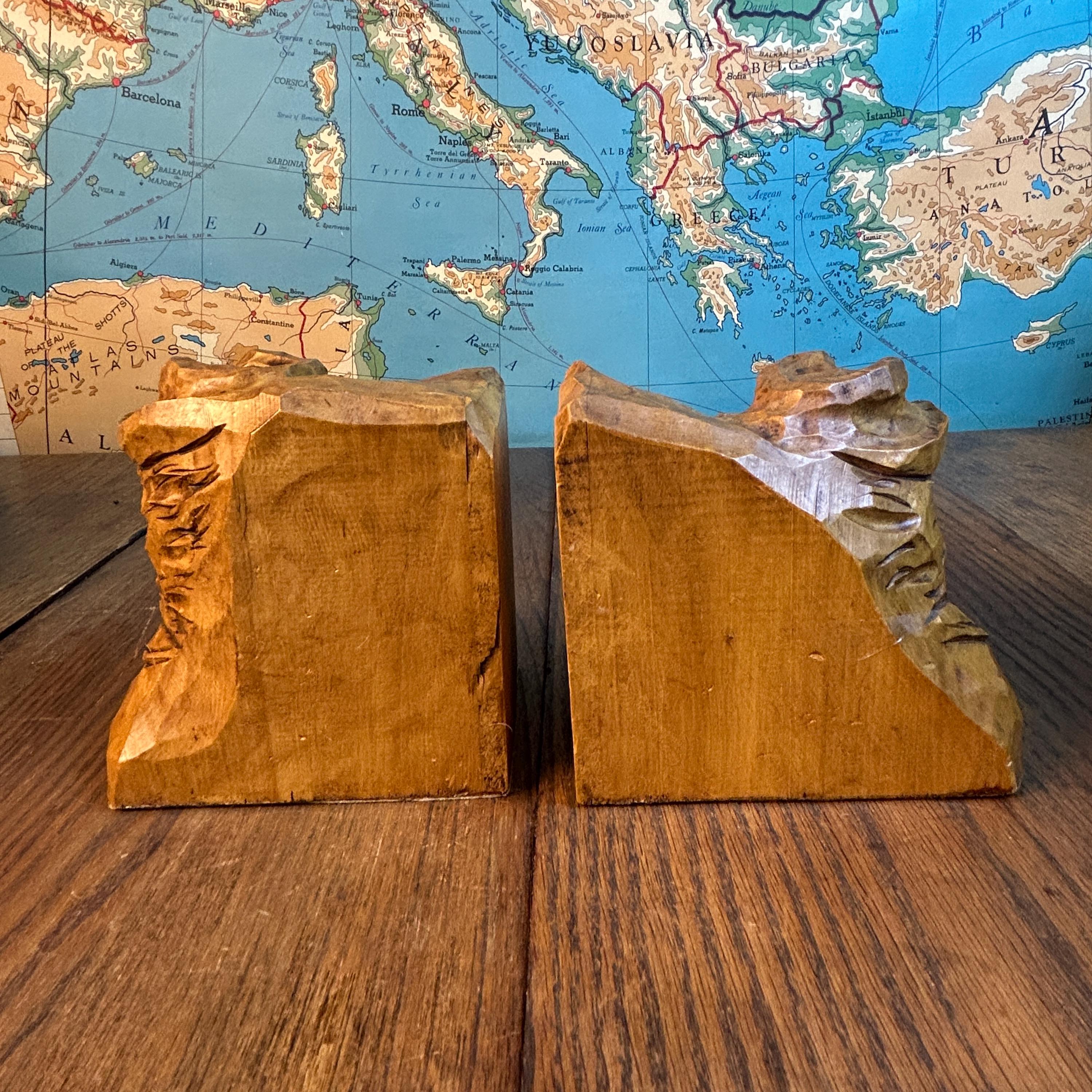These are a stunning pair of hand-carved bookends by Canadian folk artist, Andre Boucher. They are original and signed with his name on the right bookend. The bottoms are covered in felt. This pair is two older men with hats, mustaches and bears and are loving made in the folk art tradition.