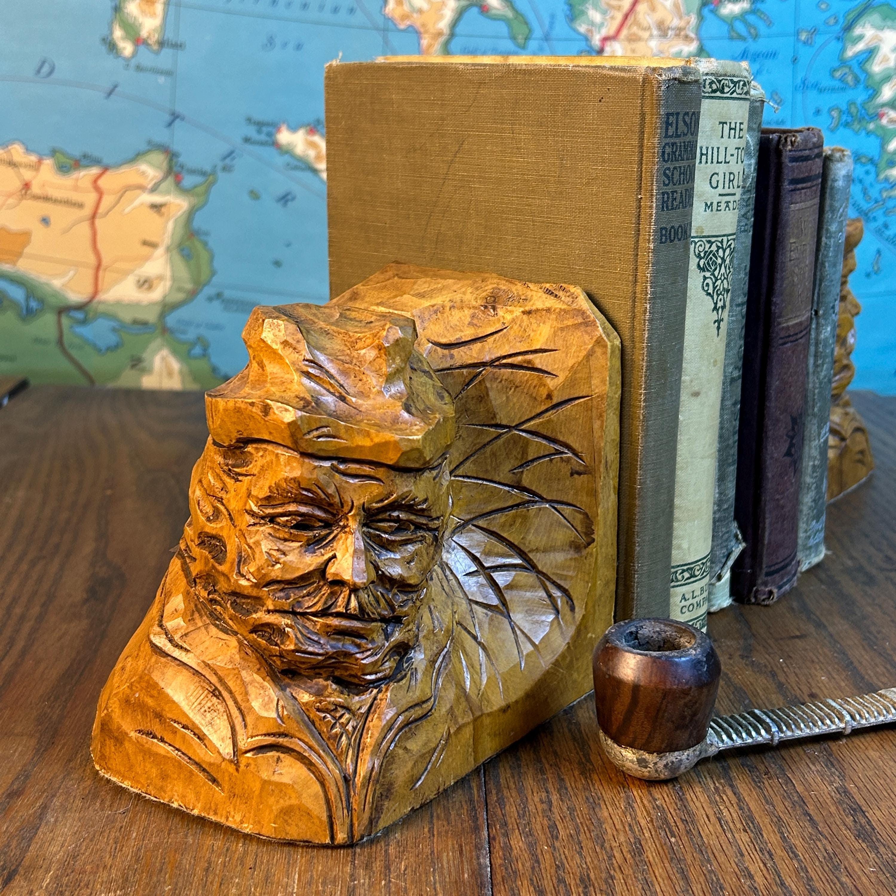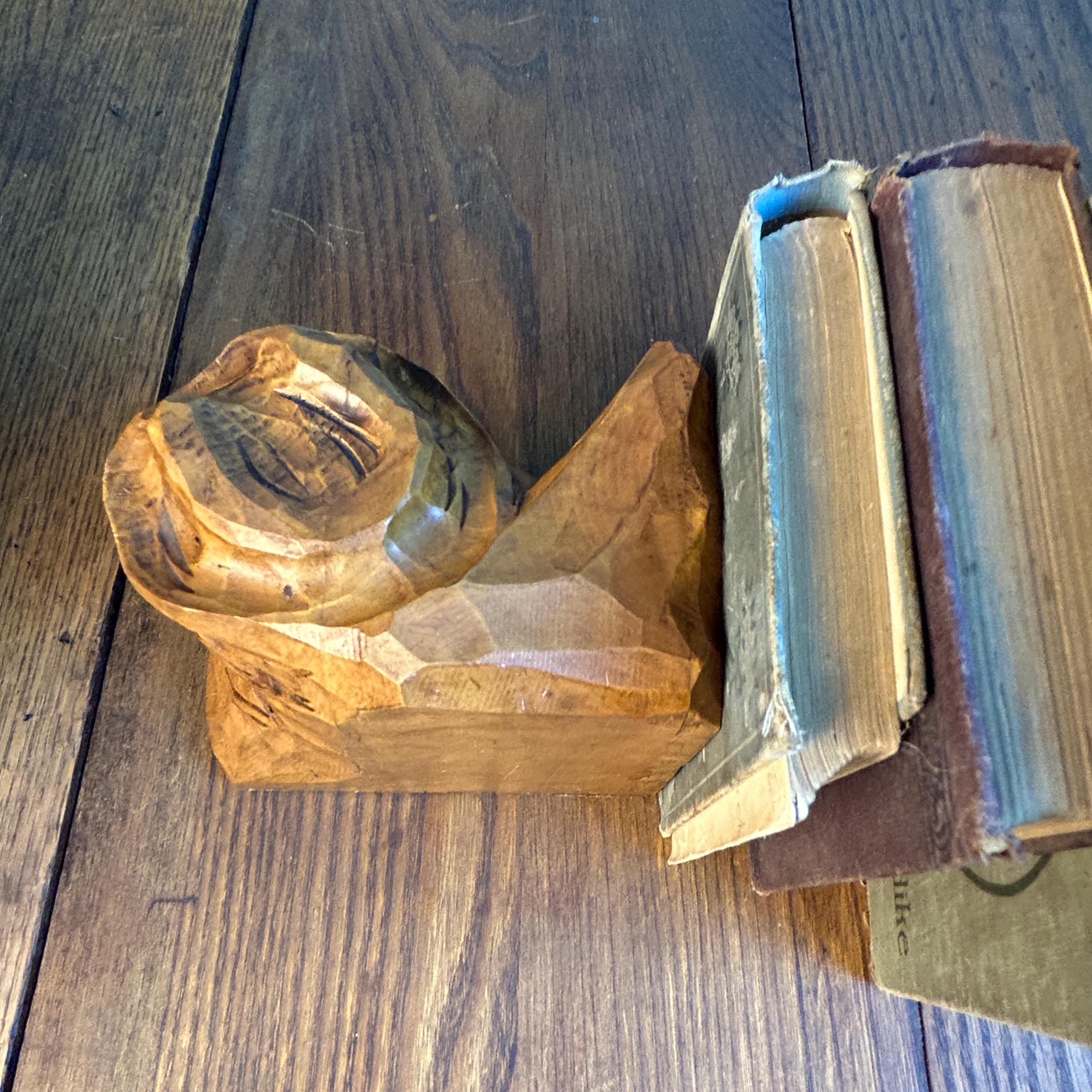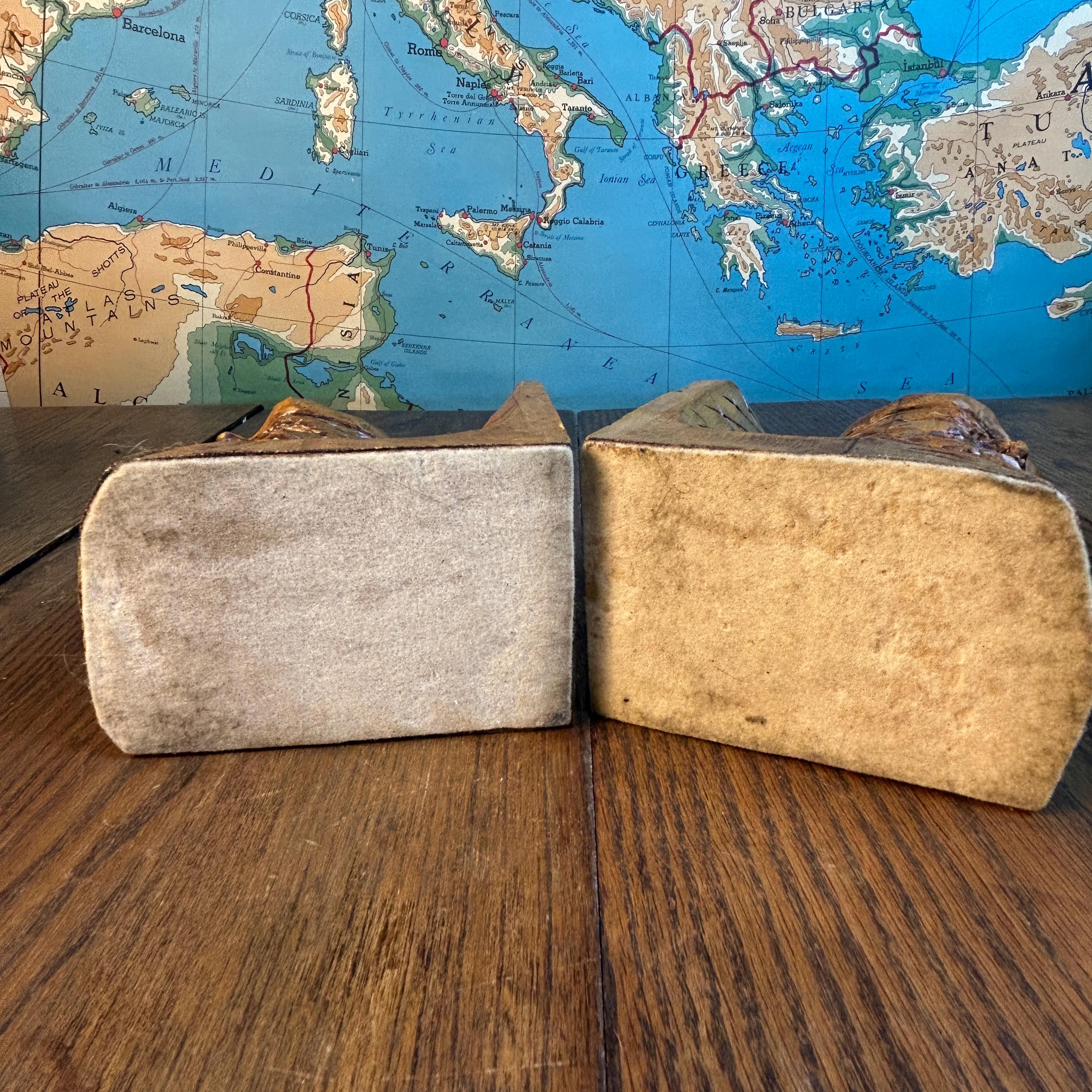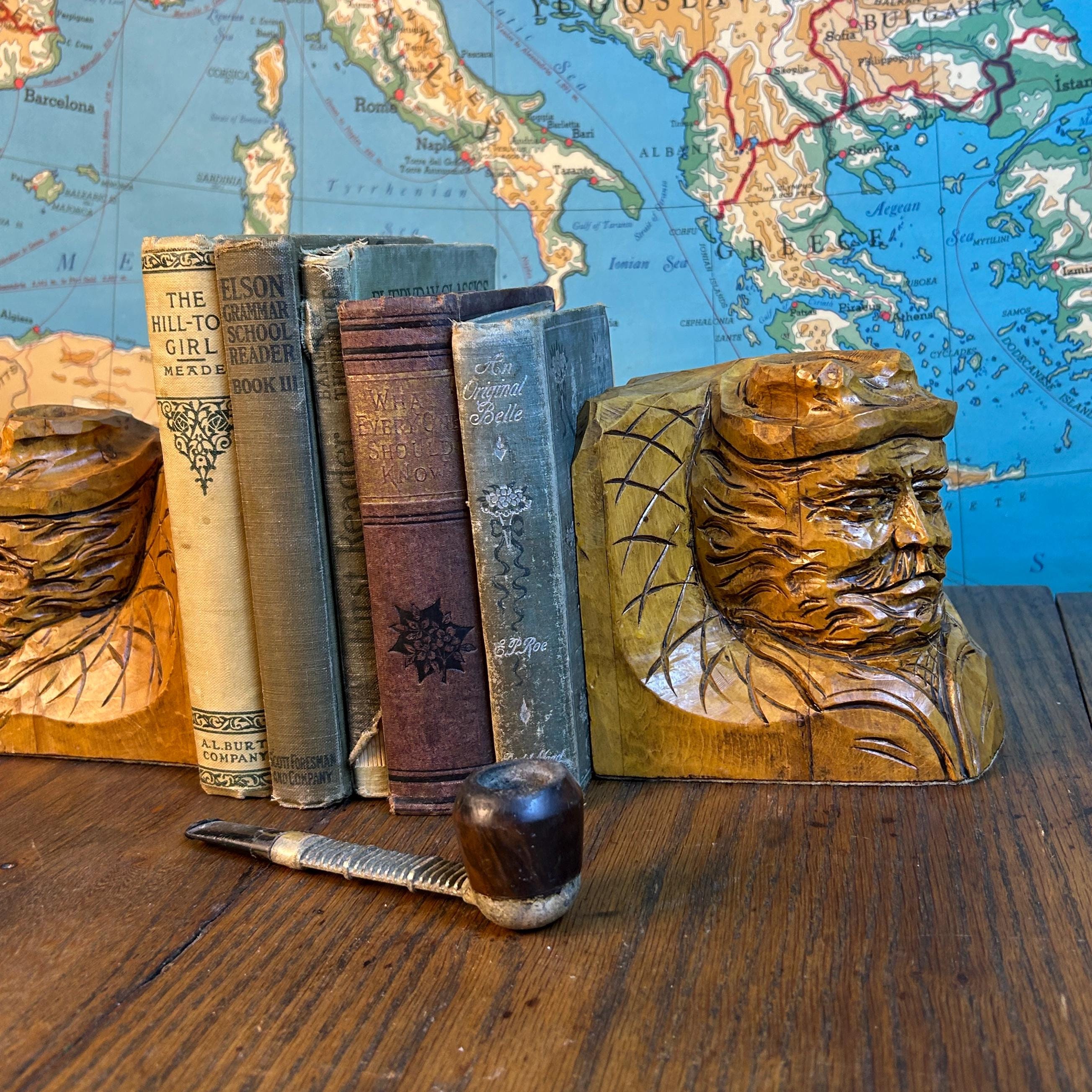These are a stunning pair of hand-carved bookends by Canadian folk artist, Andre Boucher. They are original and signed with his name on the right bookend. The bottoms are covered in felt. This pair is two older men with hats, mustaches and bears and are loving made in the folk art tradition.