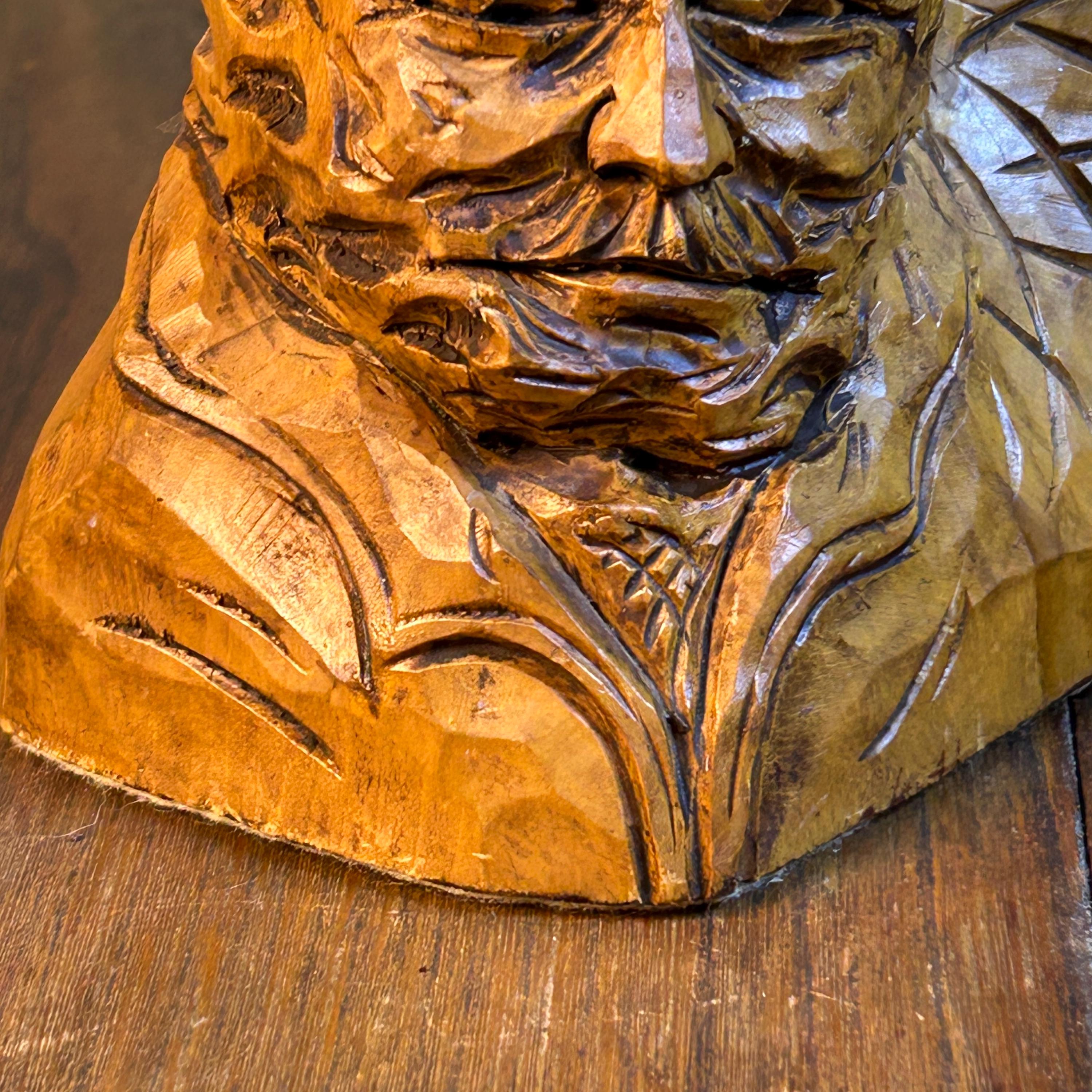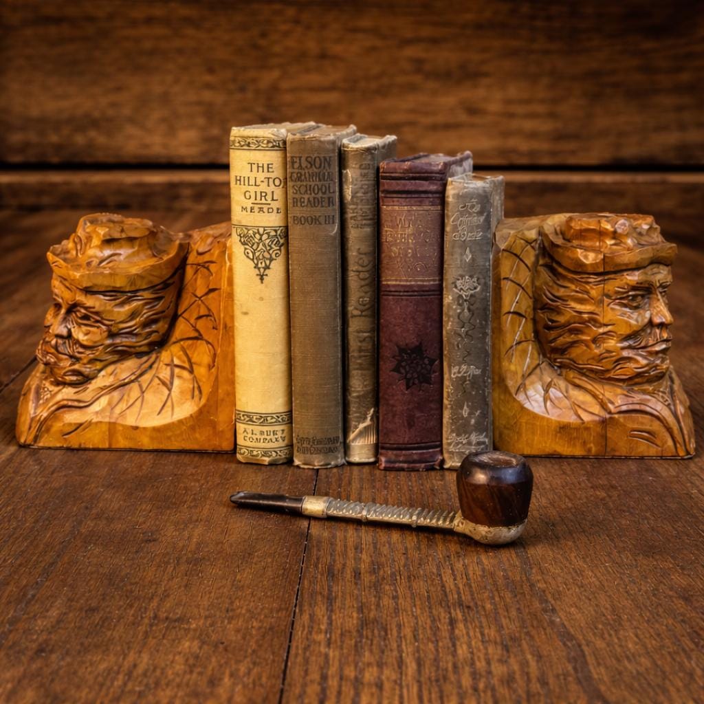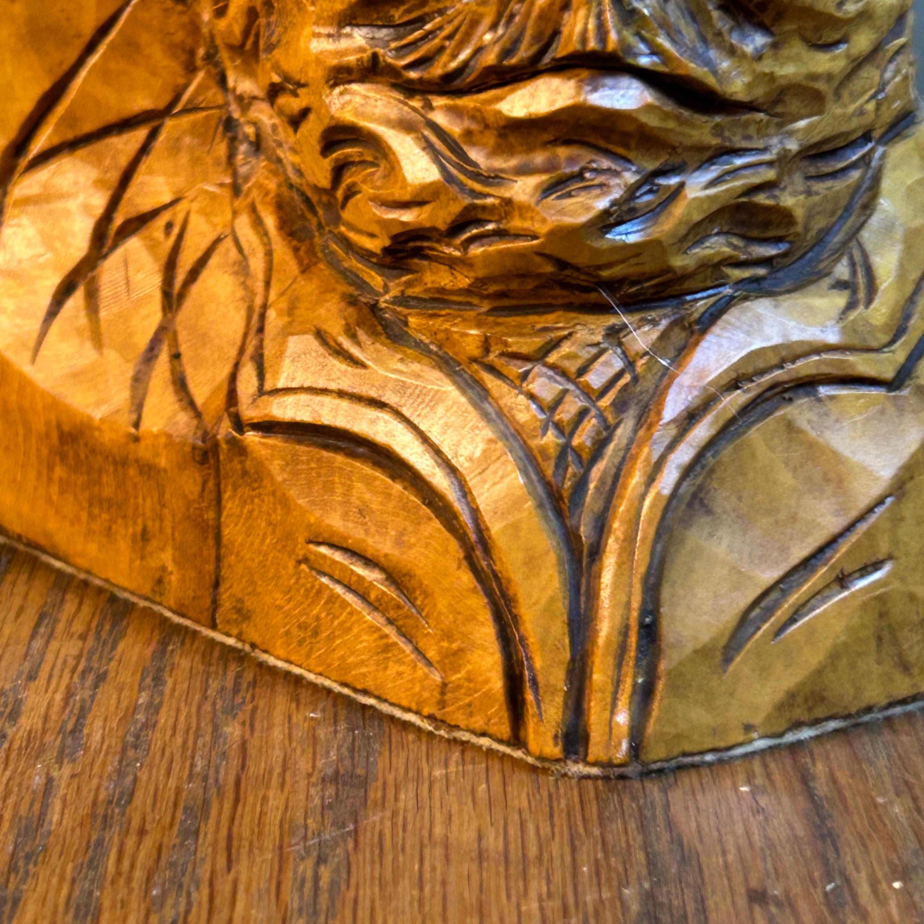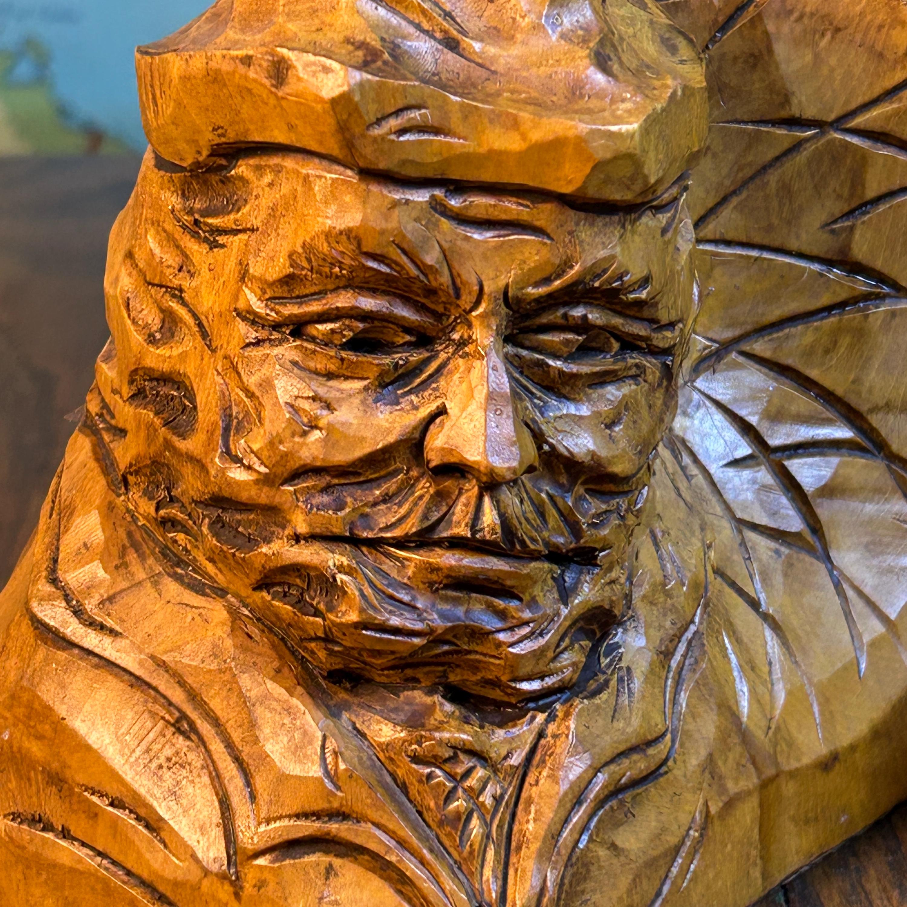 These are a stunning pair of hand-carved bookends by Canadian folk artist, Andre Boucher. They are original and signed with his name on the right bookend. The bottoms are covered in felt. This pair is two older men with hats, mustaches and bears and are loving made in the folk art tradition.