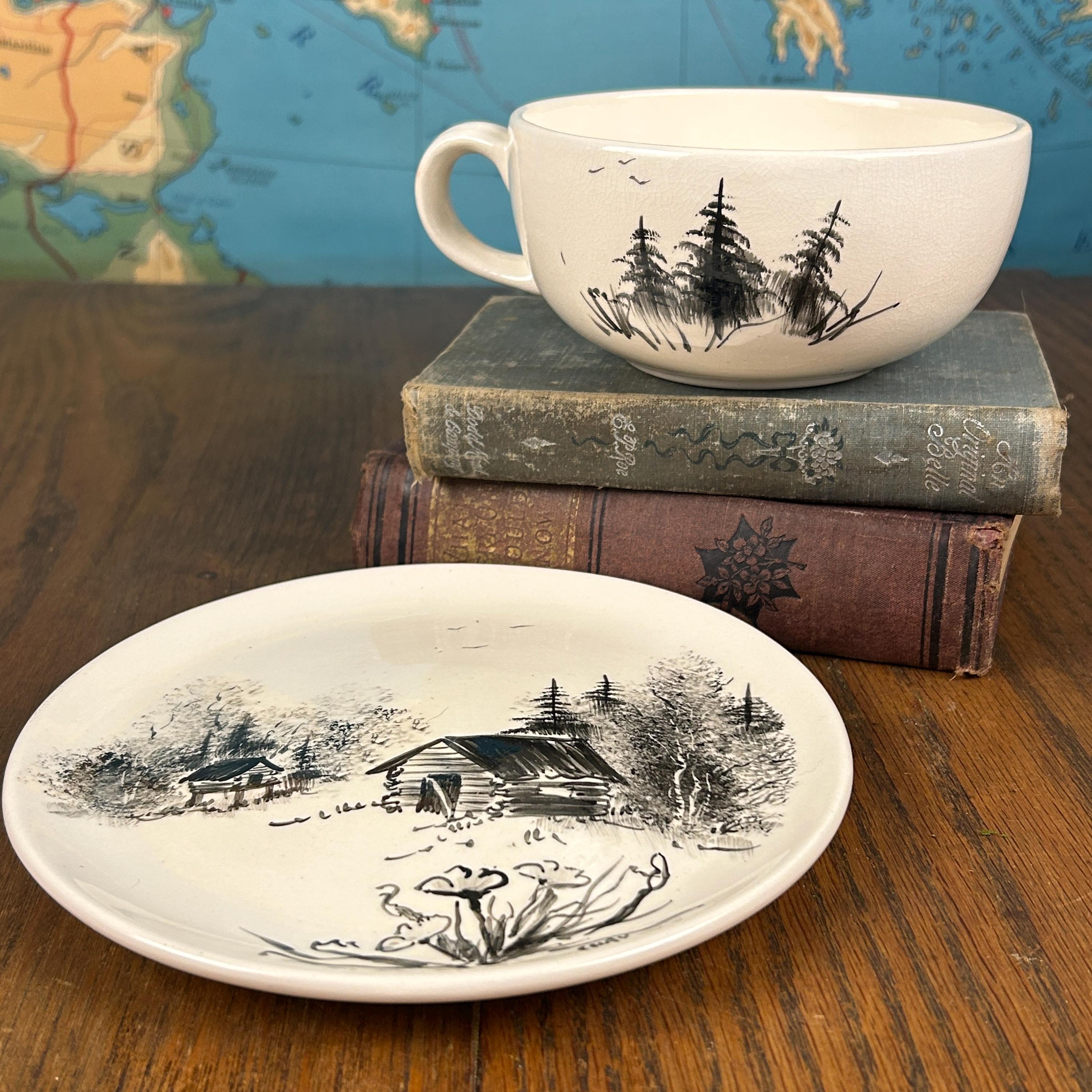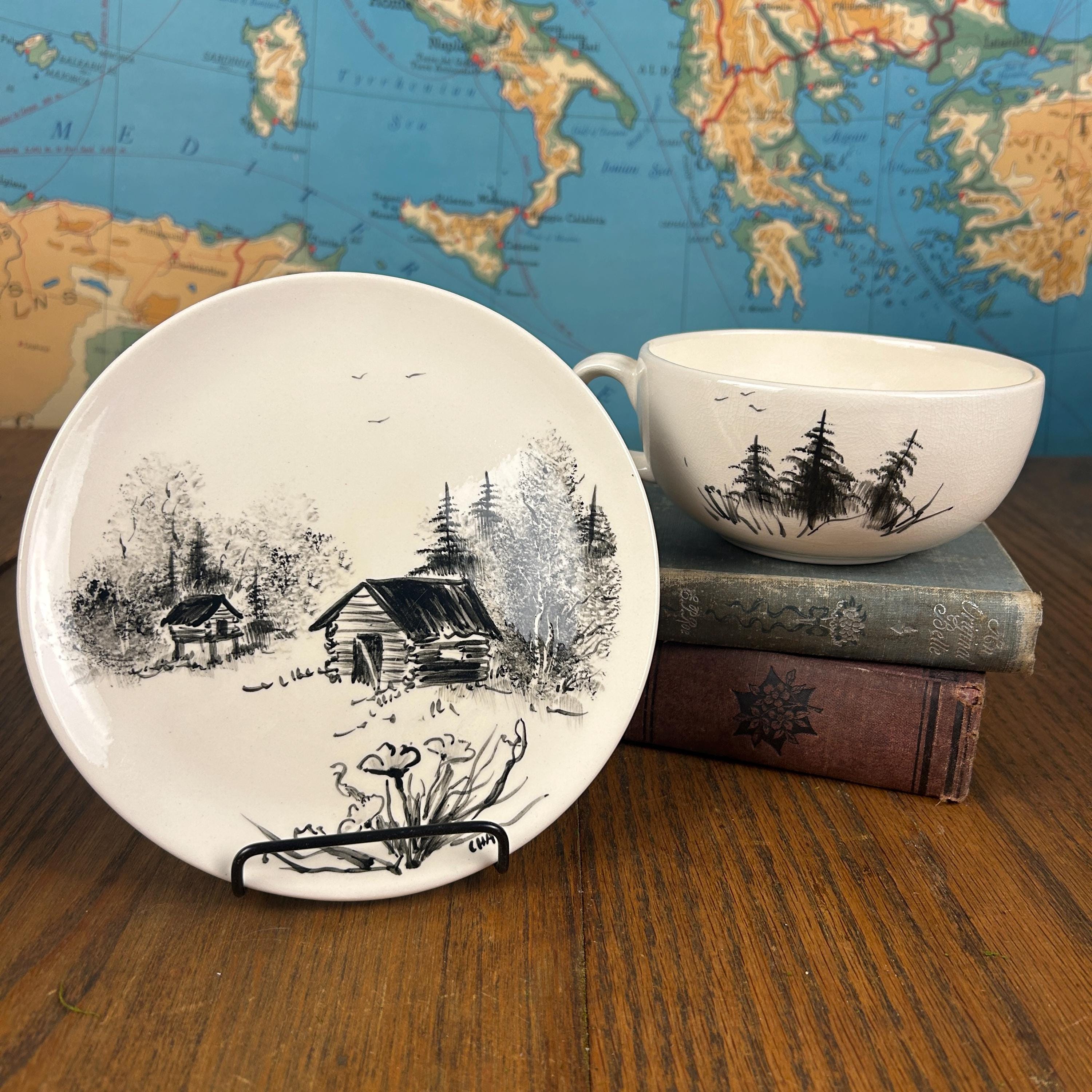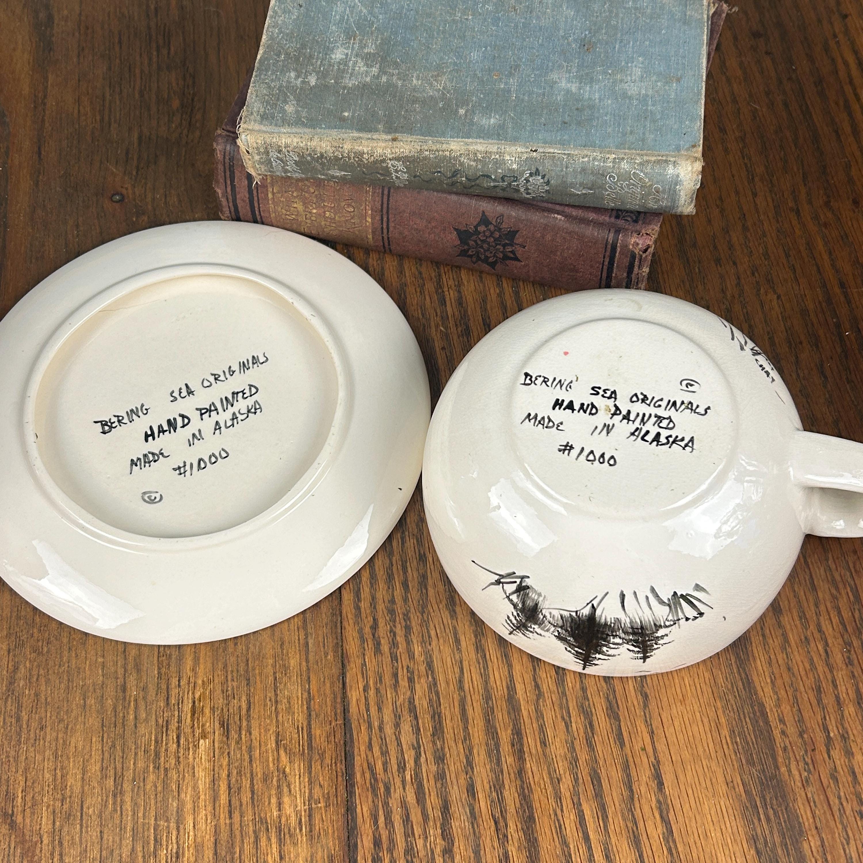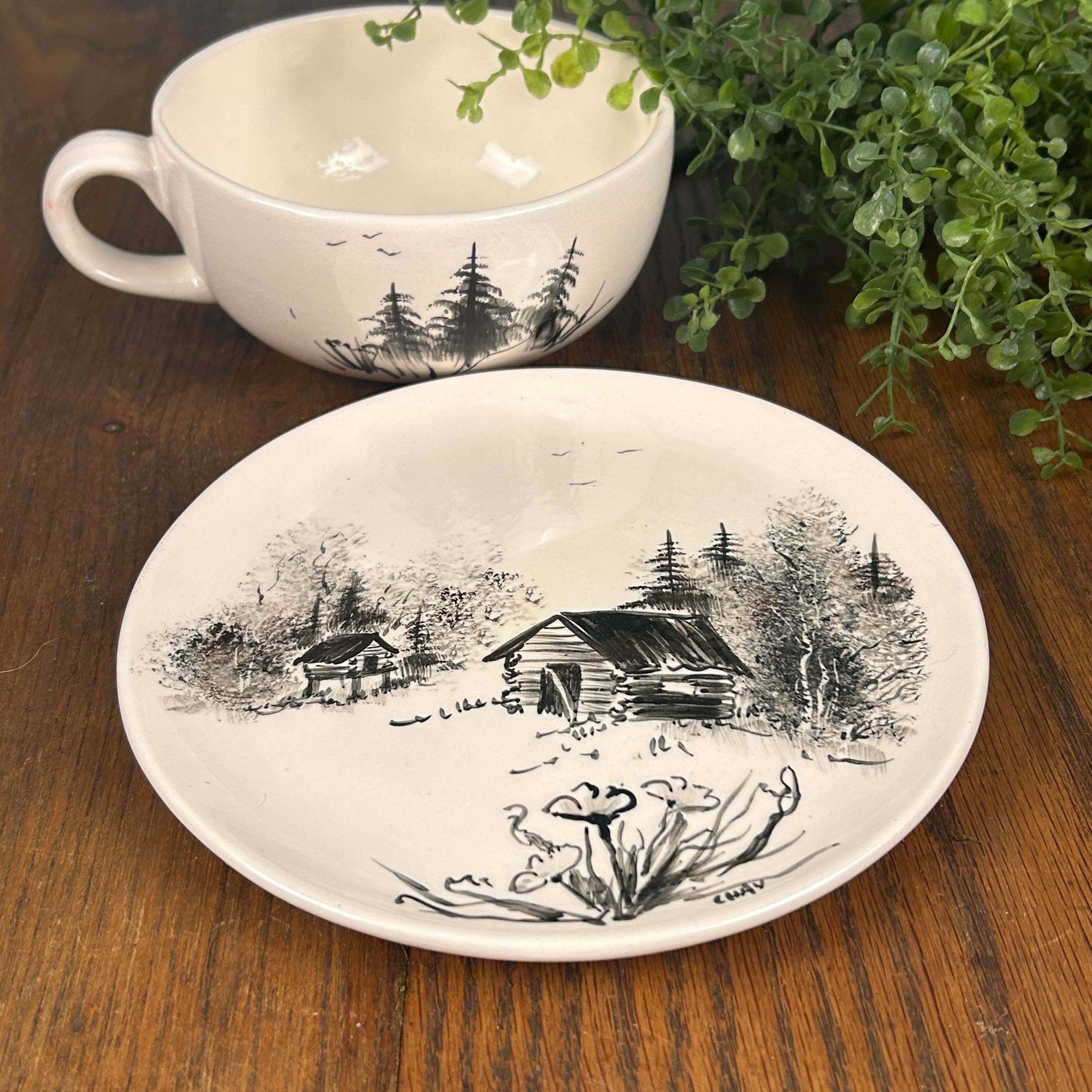 This set is a hand-painted original from a small Alaskan Pottery place called Bering Sea Originals. The artist CHAY has signed and numbered both pieces on the bottom. The scene on both is a log cabin among the trees with flowers and birds accented on both. These are both in excellent condition with no chips, cracks or defects. The paintings are bright and crisp. These were likely produced in the 1970s according to research.