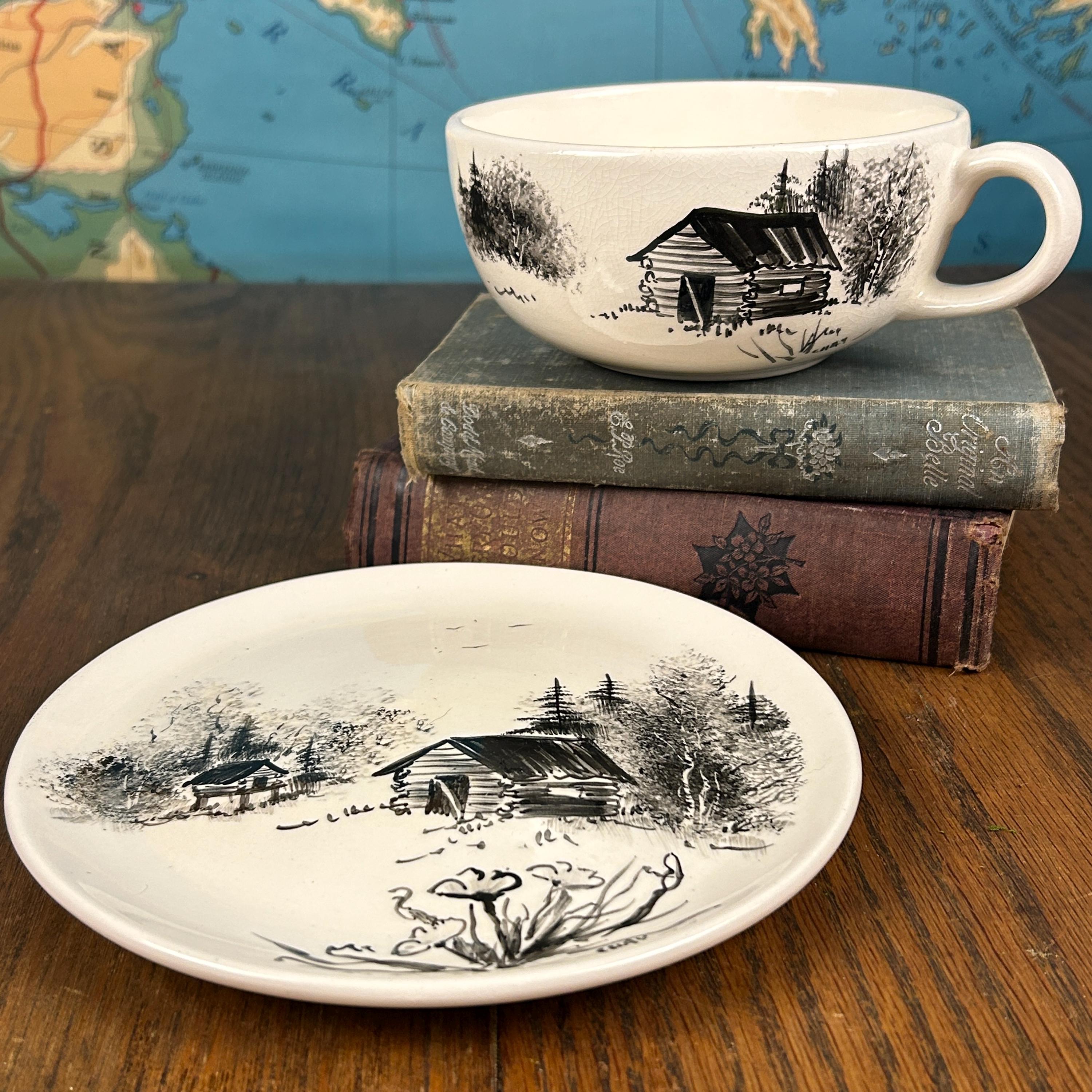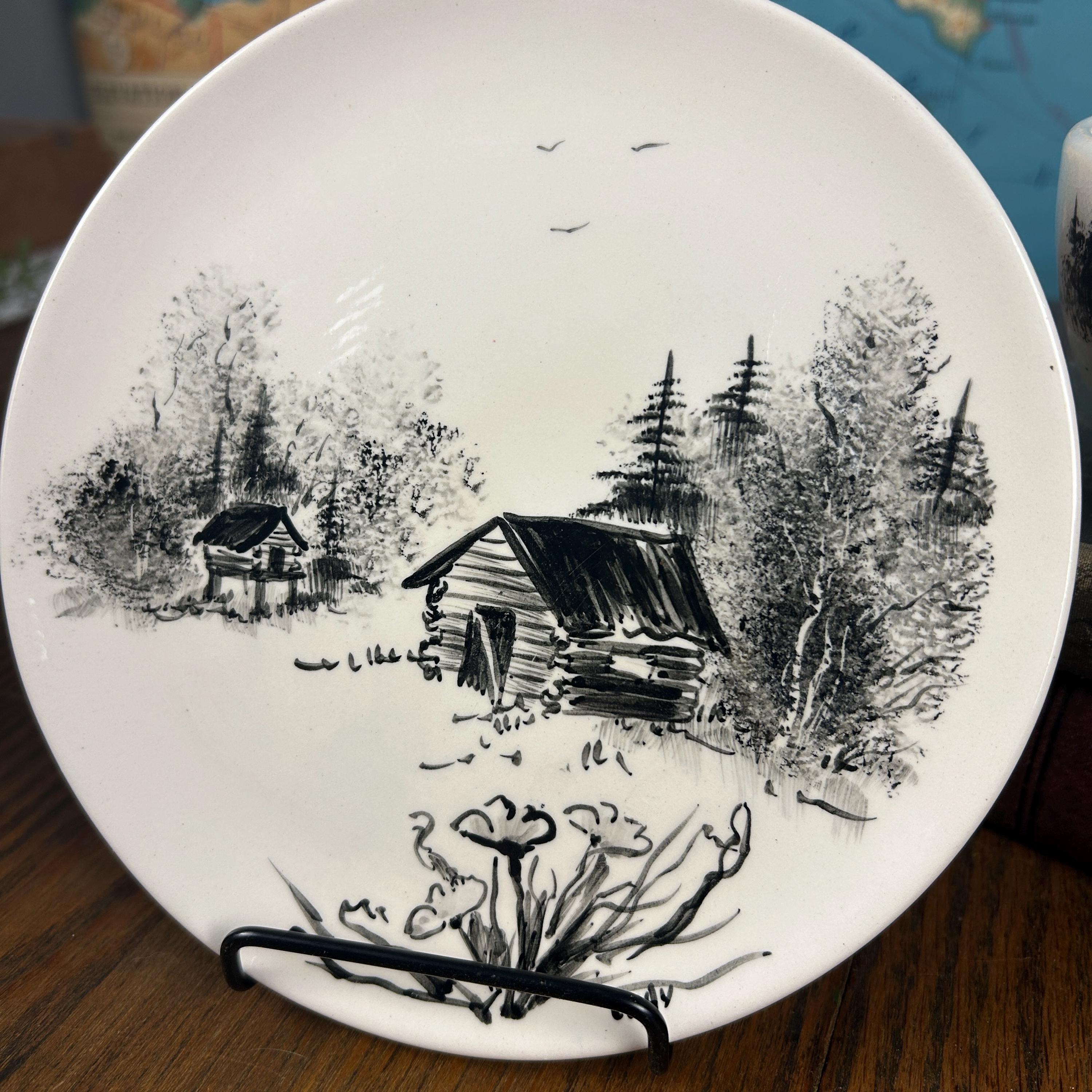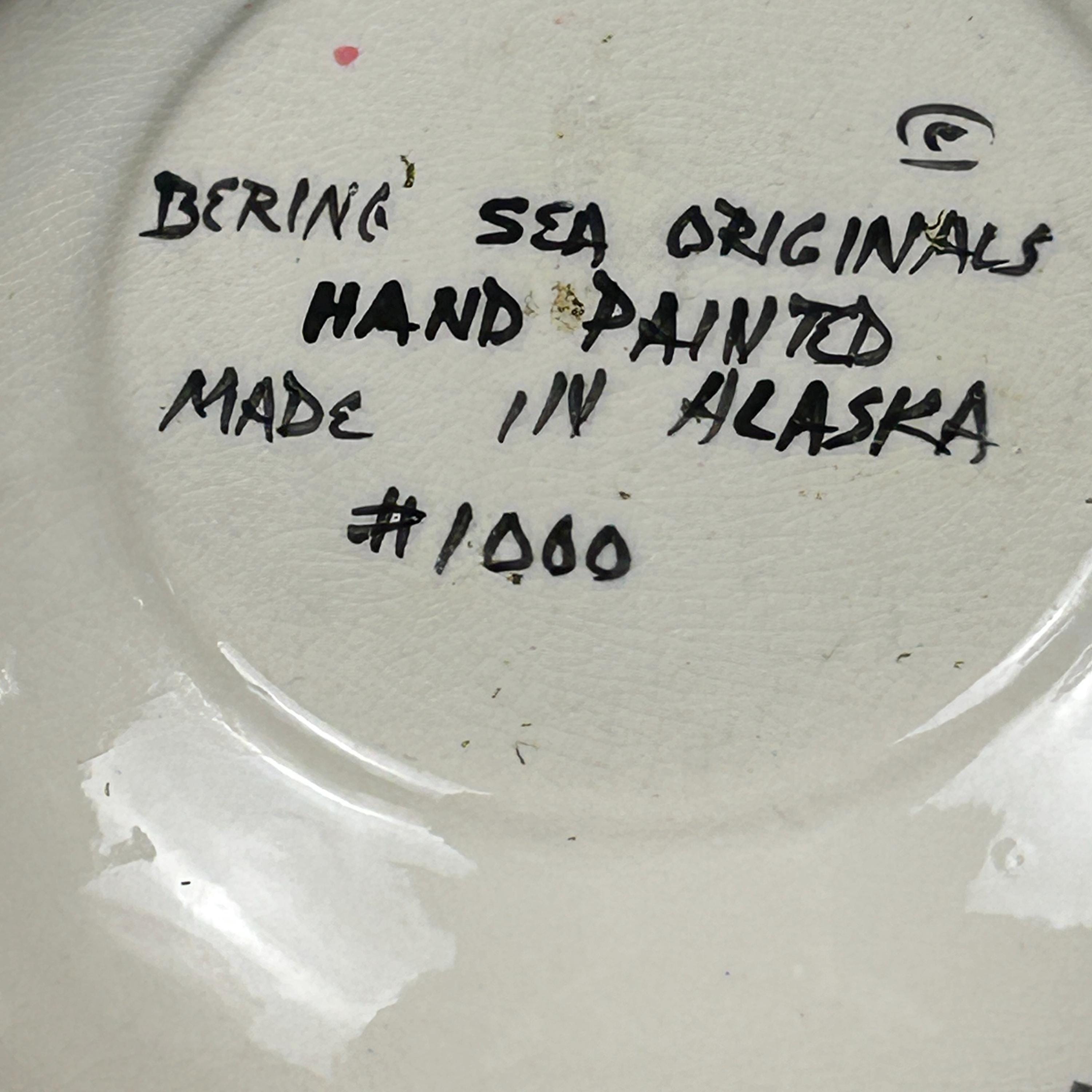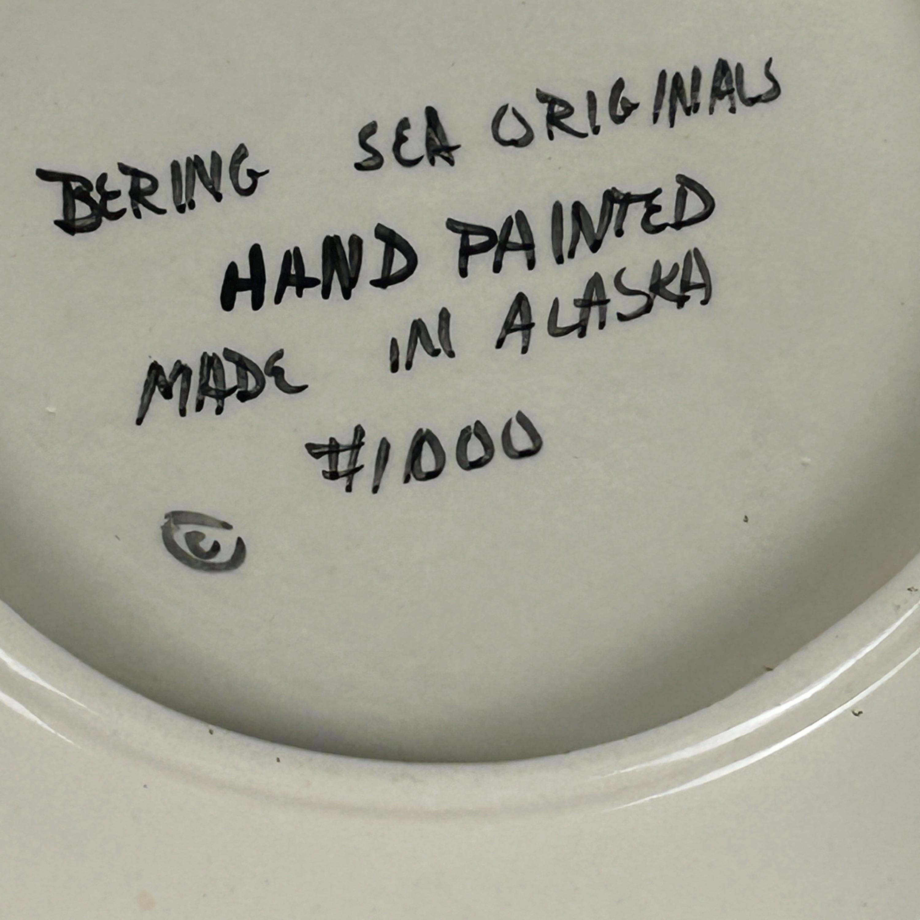 This set is a hand-painted original from a small Alaskan Pottery place called Bering Sea Originals. The artist CHAY has signed and numbered both pieces on the bottom. The scene on both is a log cabin among the trees with flowers and birds accented on both. These are both in excellent condition with no chips, cracks or defects. The paintings are bright and crisp. These were likely produced in the 1970s according to research.