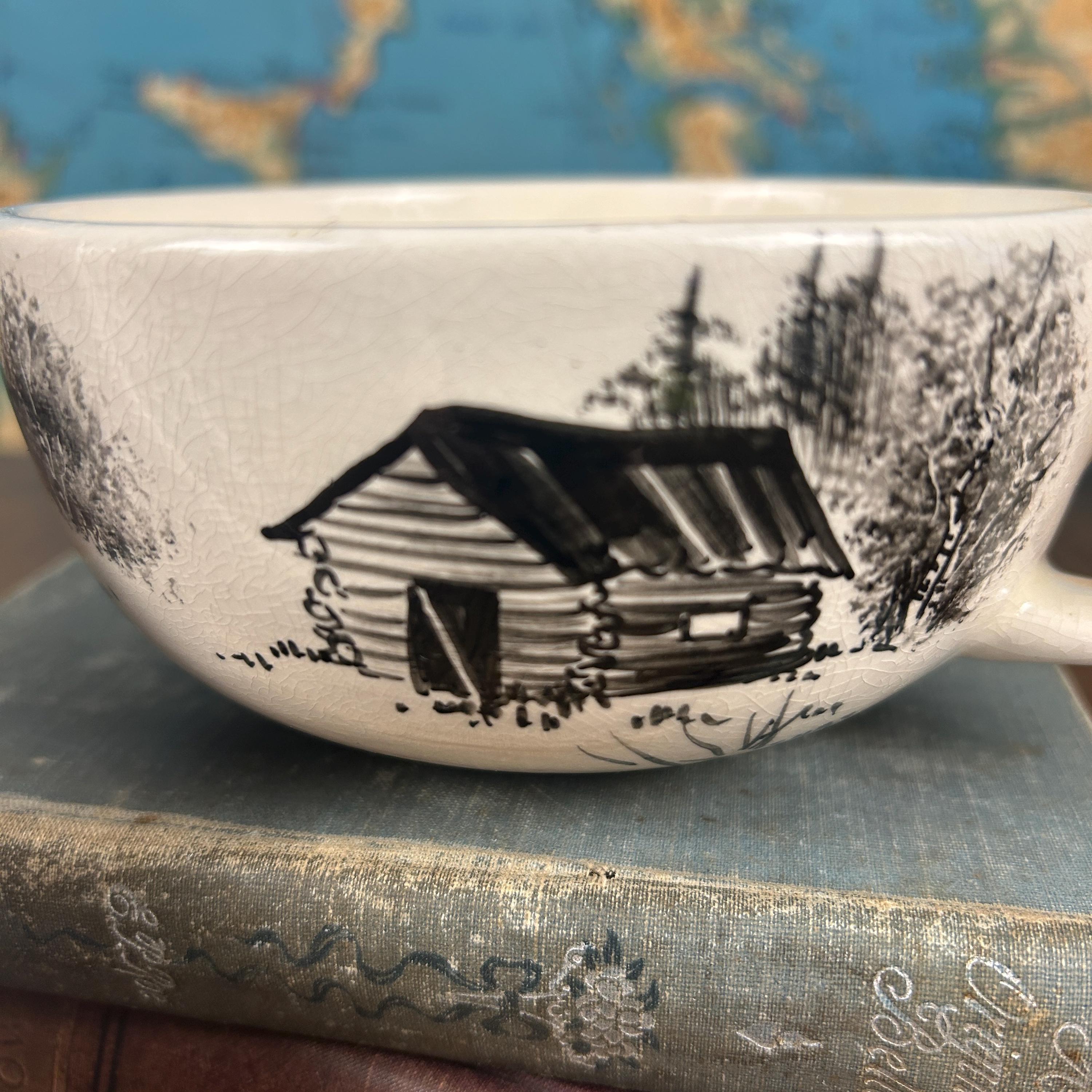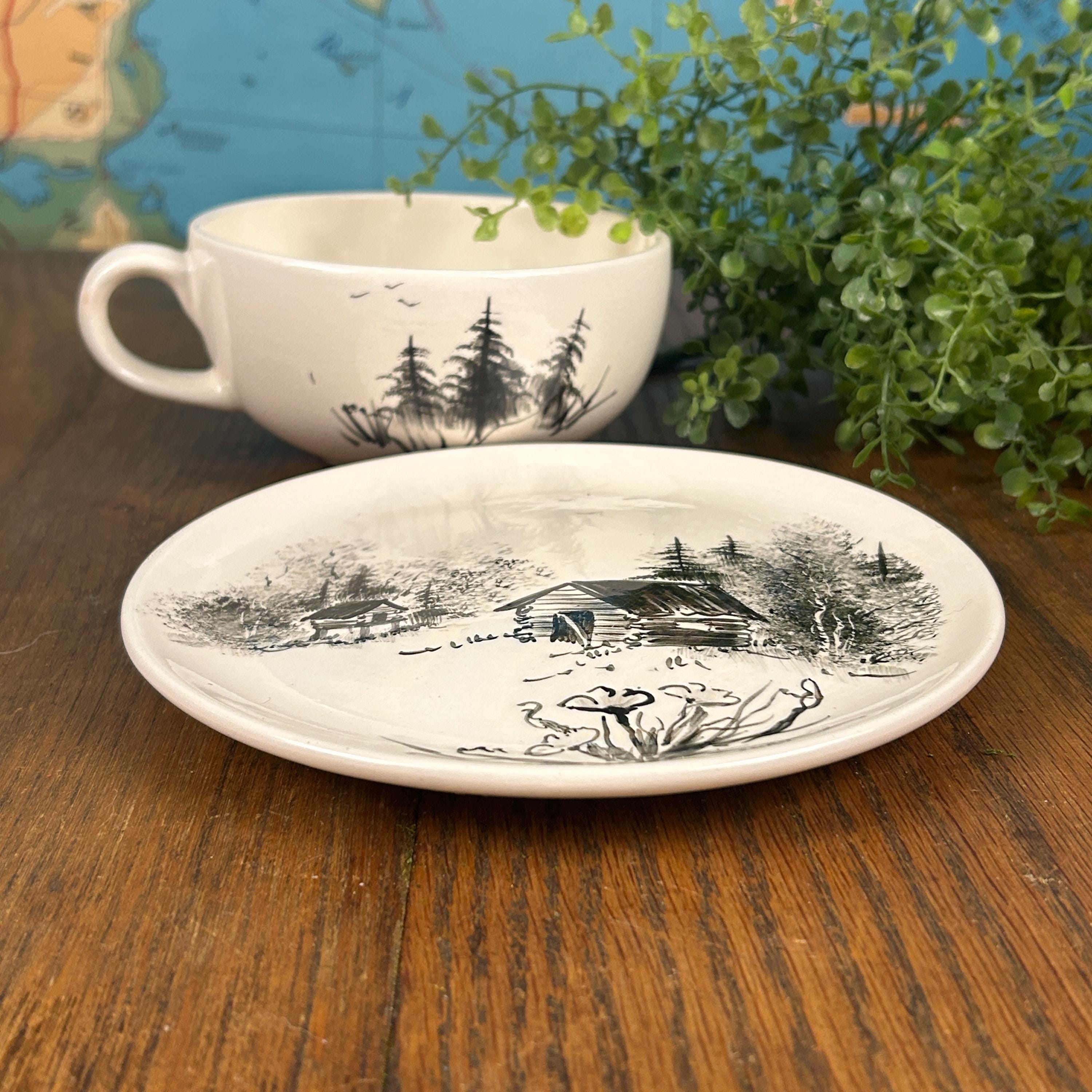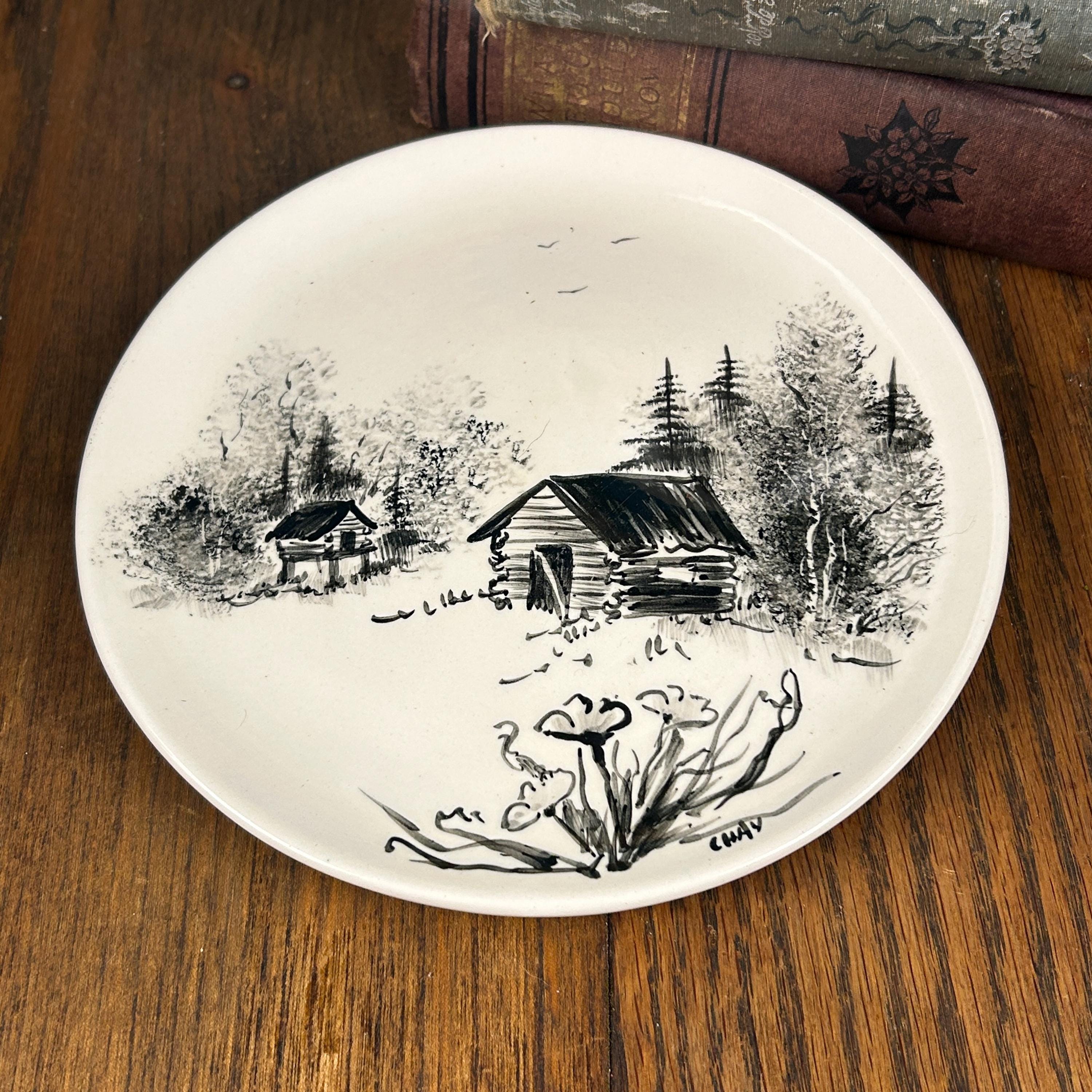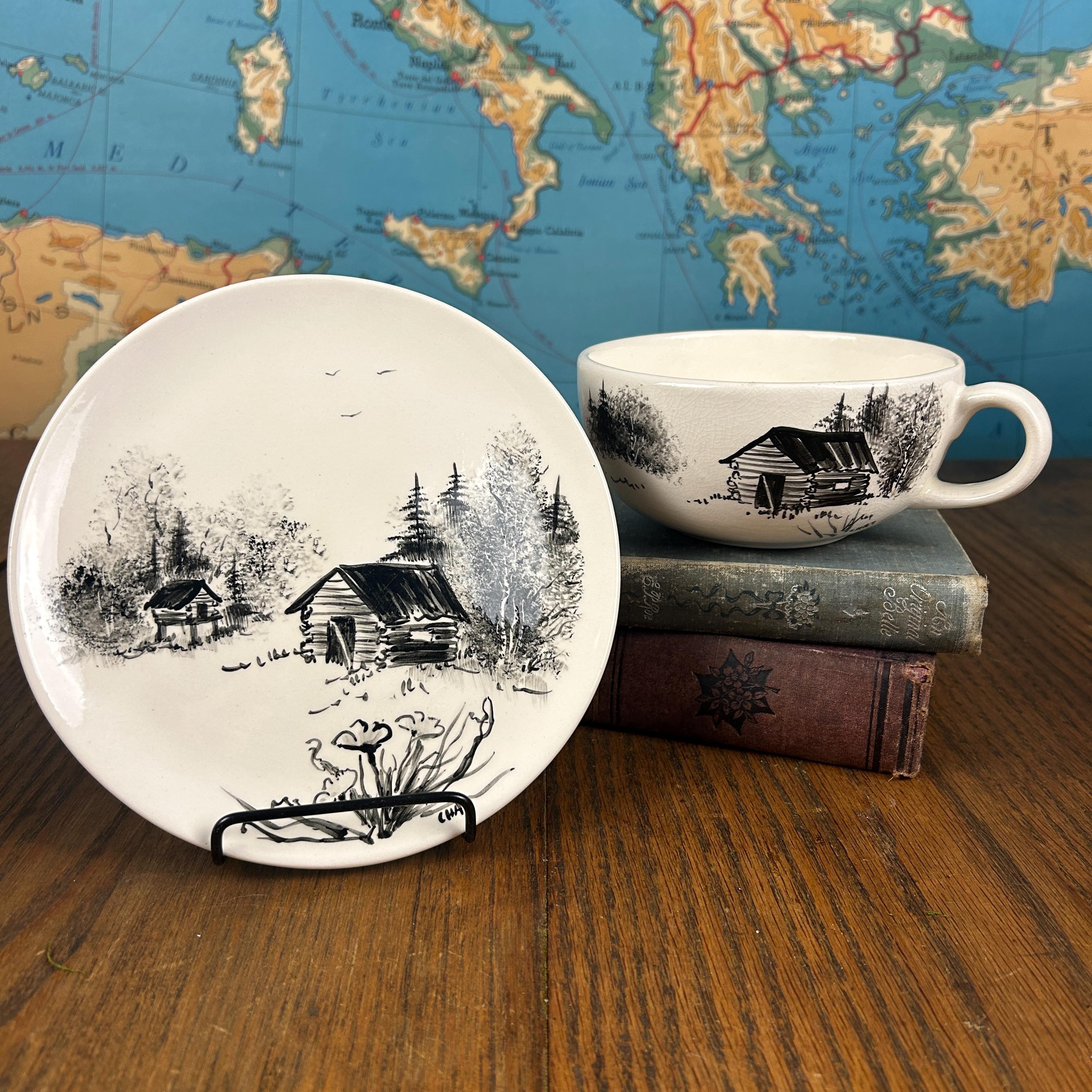 This set is a hand-painted original from a small Alaskan Pottery place called Bering Sea Originals. The artist CHAY has signed and numbered both pieces on the bottom. The scene on both is a log cabin among the trees with flowers and birds accented on both. These are both in excellent condition with no chips, cracks or defects. The paintings are bright and crisp. These were likely produced in the 1970s according to research.
