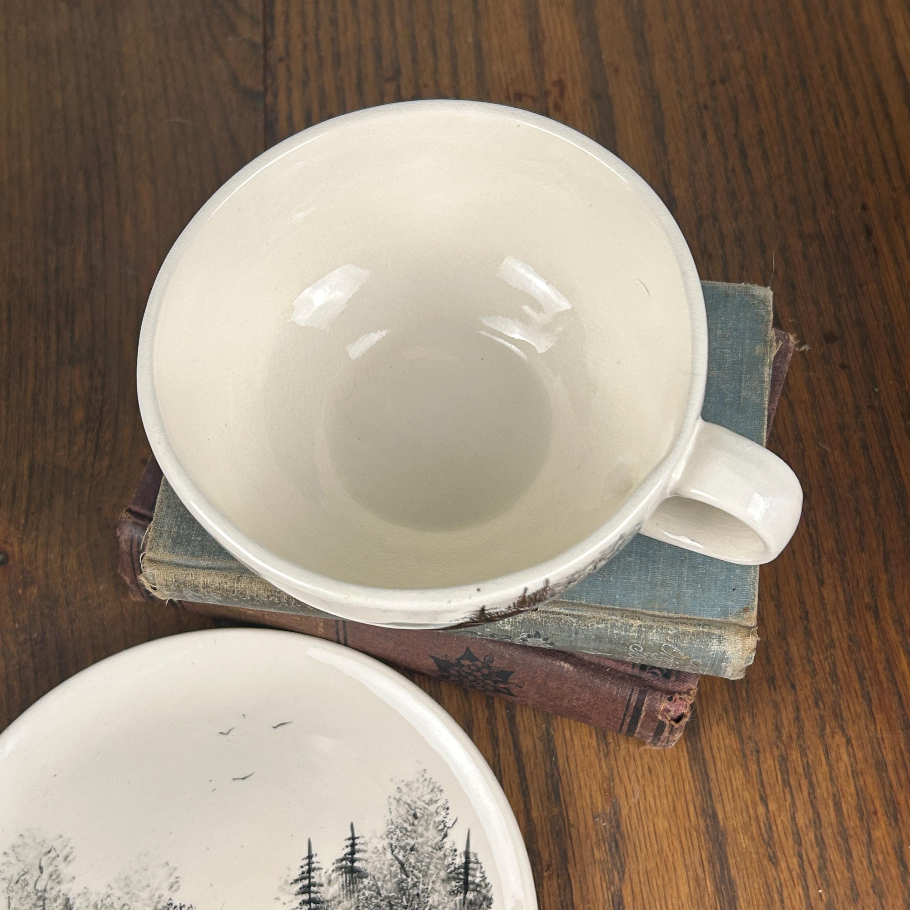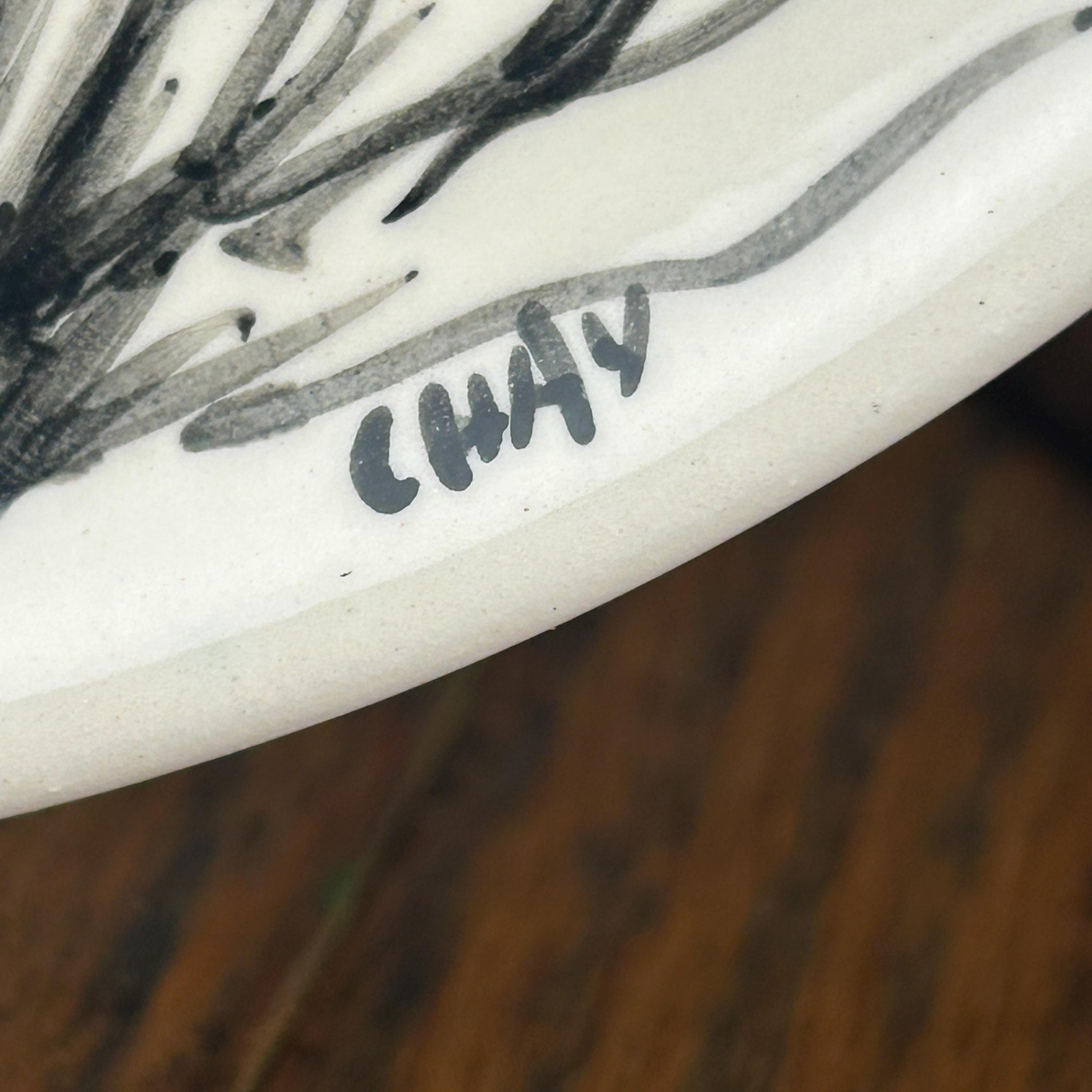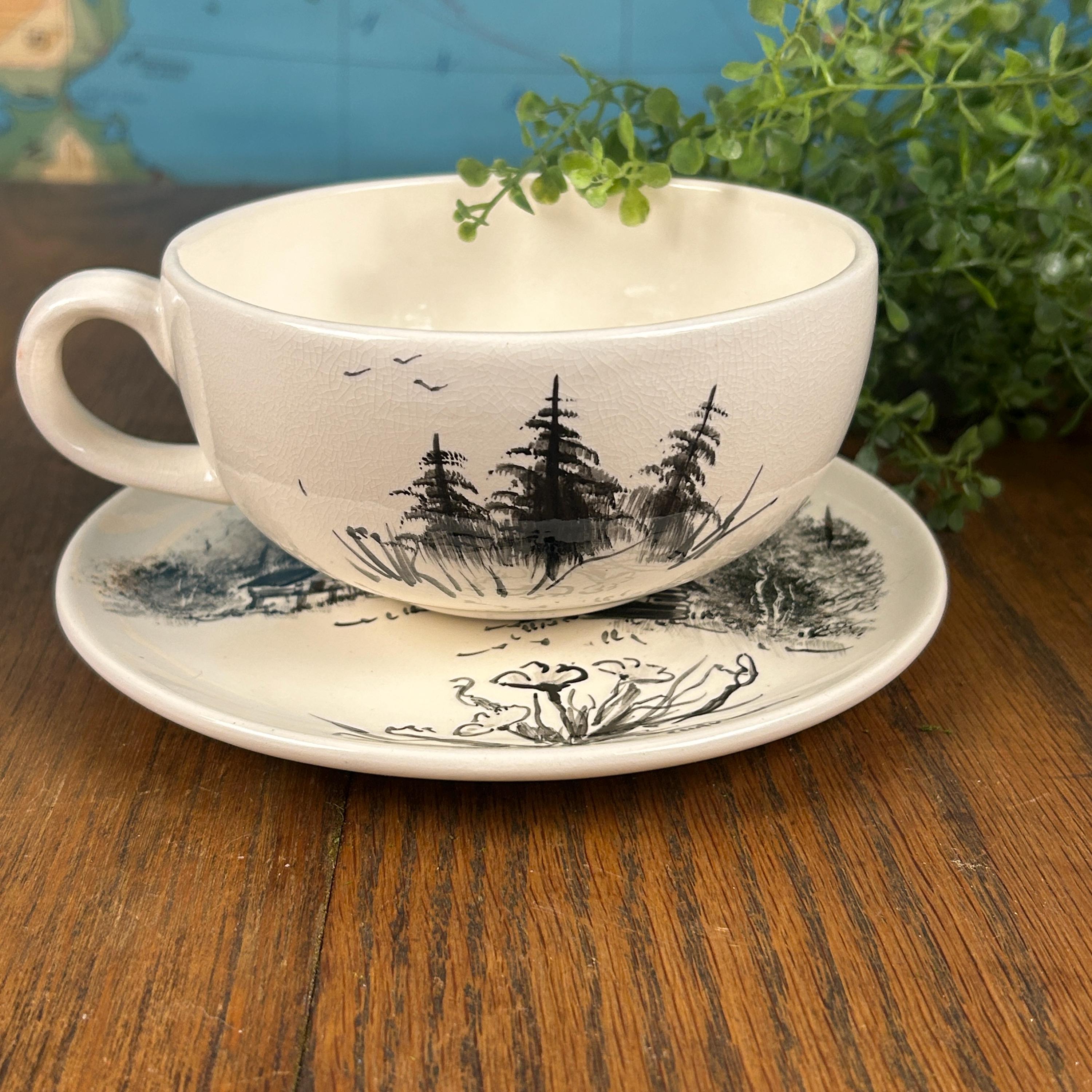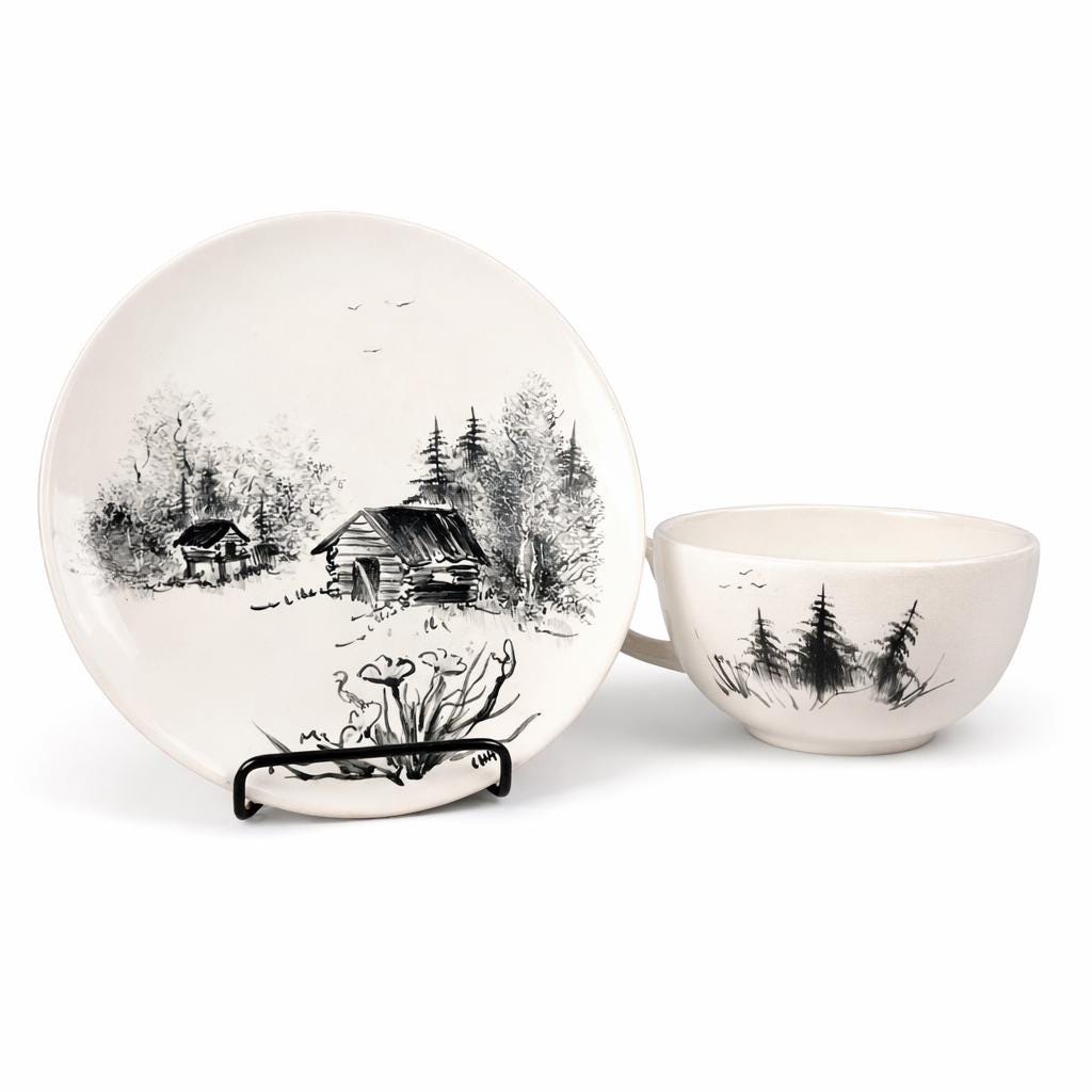 This set is a hand-painted original from a small Alaskan Pottery place called Bering Sea Originals. The artist CHAY has signed and numbered both pieces on the bottom. The scene on both is a log cabin among the trees with flowers and birds accented on both. These are both in excellent condition with no chips, cracks or defects. The paintings are bright and crisp. These were likely produced in the 1970s according to research.