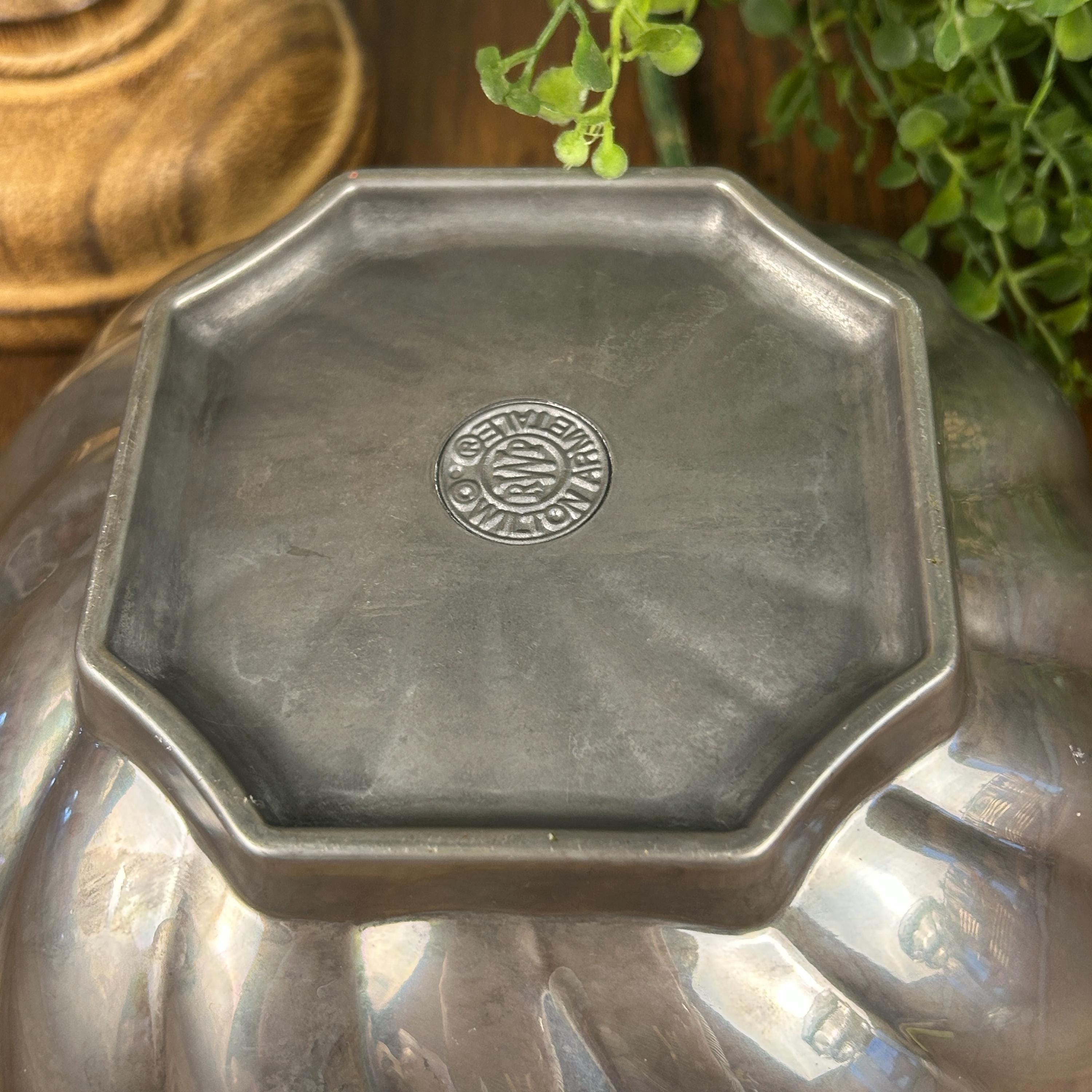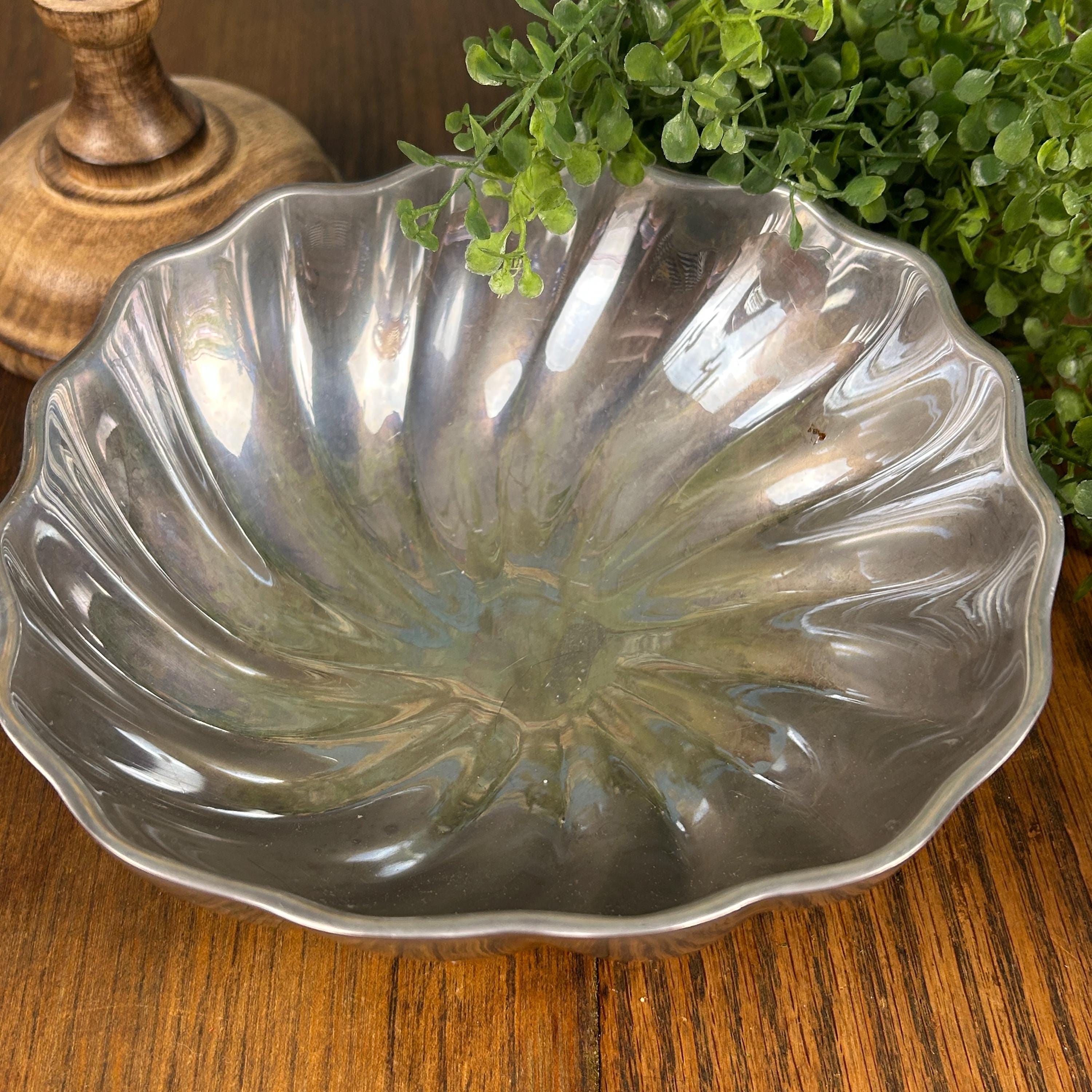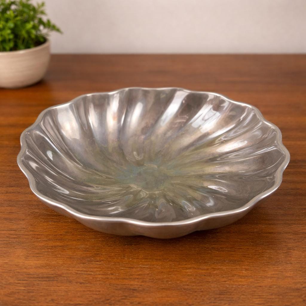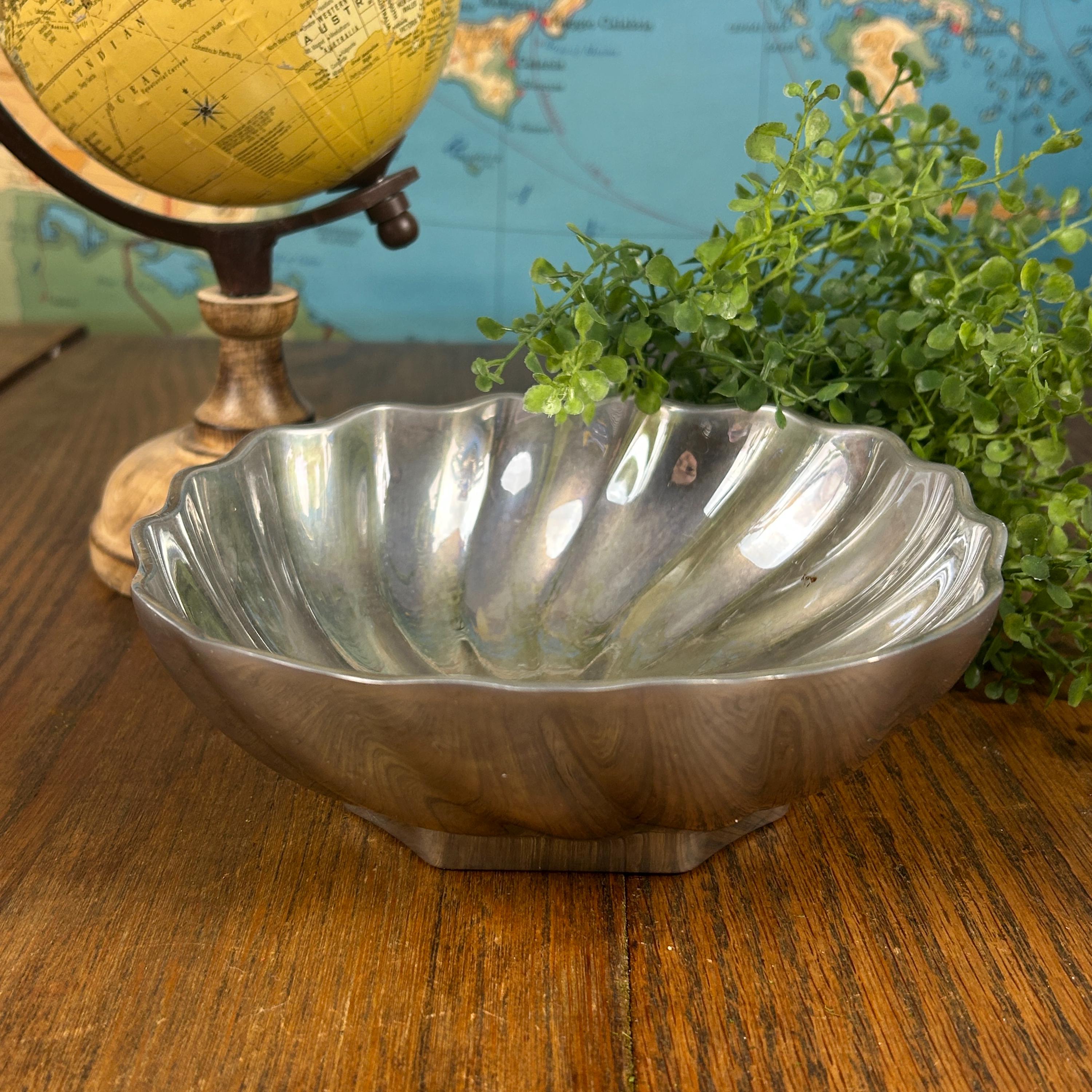 This is a Wilton Armetale Eddy Serving Bowl. It has a distinctive swirled or fluted design, a scalloped edge, and a square base. Made from a food-safe, recycled aluminum-based alloy. RWP pewter refers to metalware produced by The Wilton Company, a company based in Columbia, PA, and stamped with the "RWP" mark. While it resembles pewter, it is actually a food-safe, aluminum-based alloy called Armetale that is durable and heat-resistant. It is designed to be used from oven to table. Will not rust, break, crack, or chip under normal use. Hand washing with mild soap and hot water is recommended.
