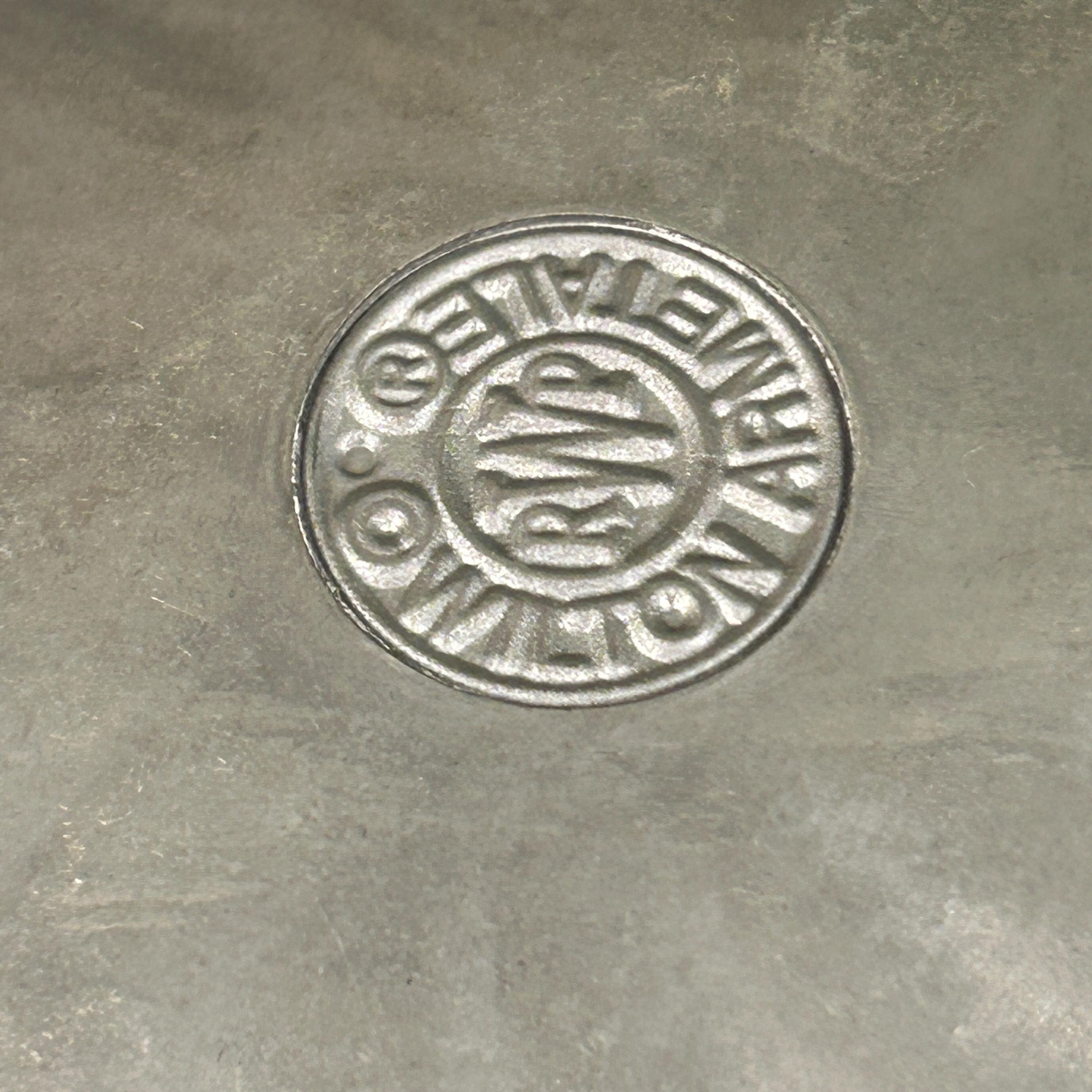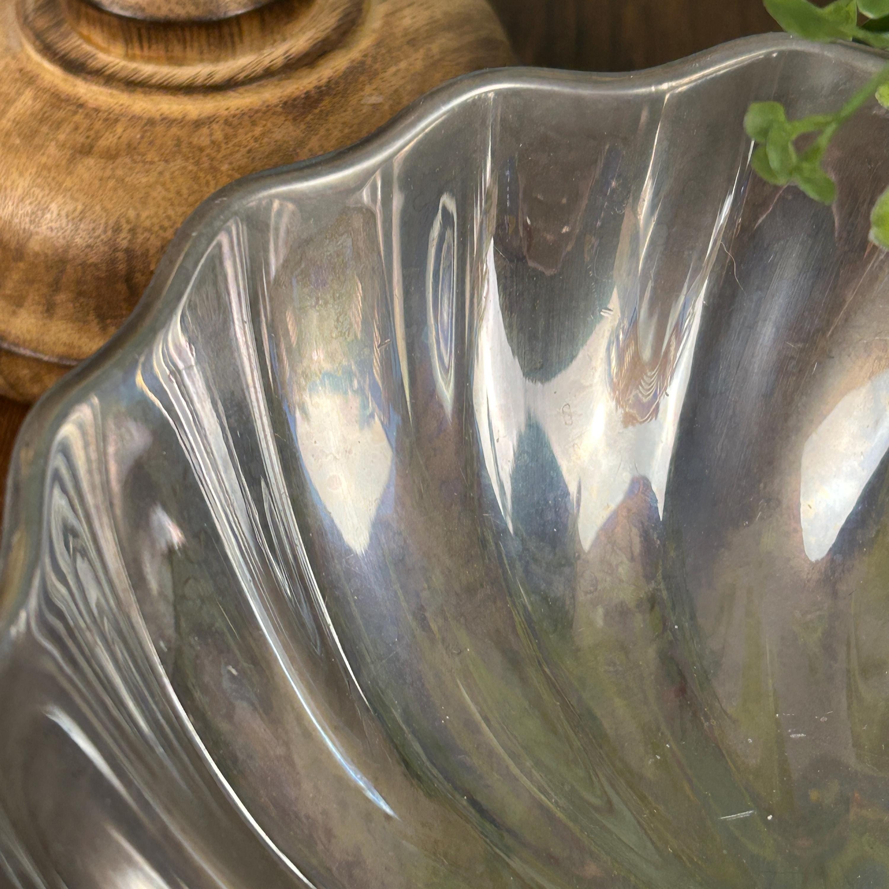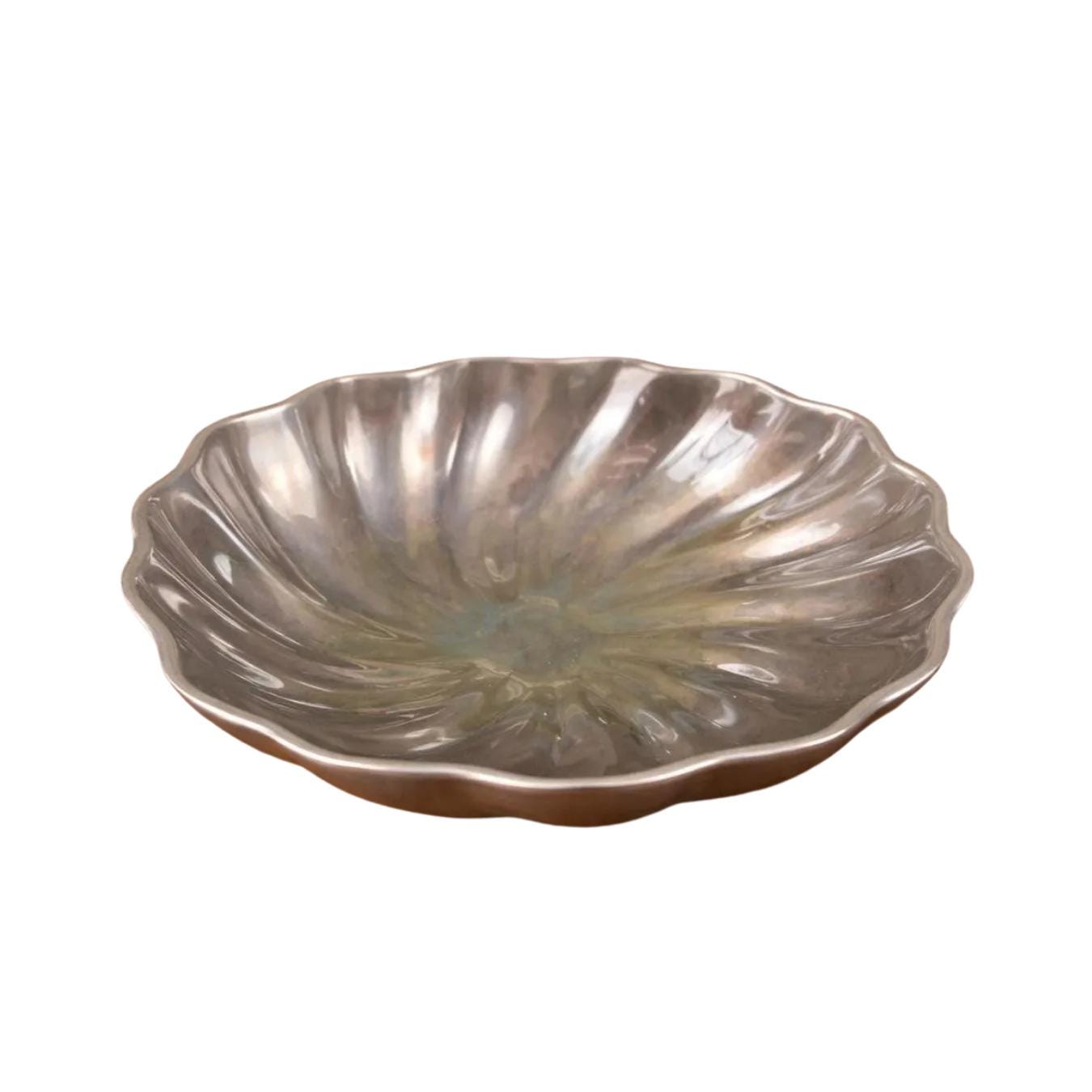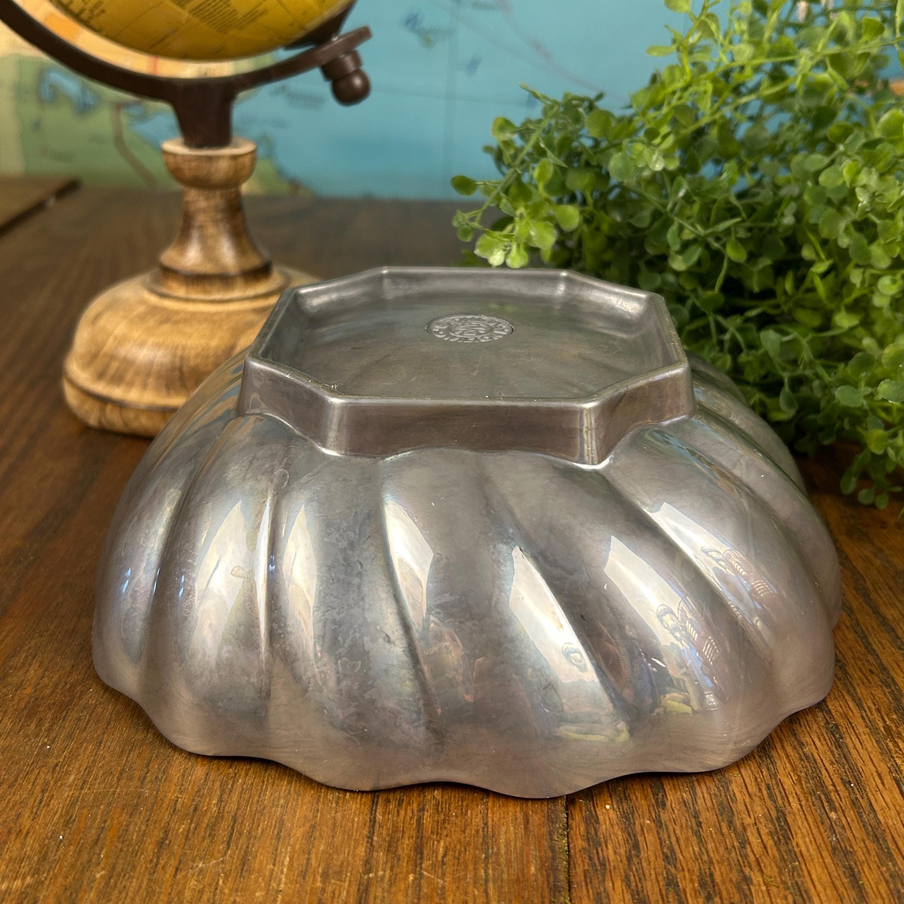 This is a Wilton Armetale Eddy Serving Bowl. It has a distinctive swirled or fluted design, a scalloped edge, and a square base. Made from a food-safe, recycled aluminum-based alloy. RWP pewter refers to metalware produced by The Wilton Company, a company based in Columbia, PA, and stamped with the "RWP" mark. While it resembles pewter, it is actually a food-safe, aluminum-based alloy called Armetale that is durable and heat-resistant. It is designed to be used from oven to table. Will not rust, break, crack, or chip under normal use. Hand washing with mild soap and hot water is recommended.