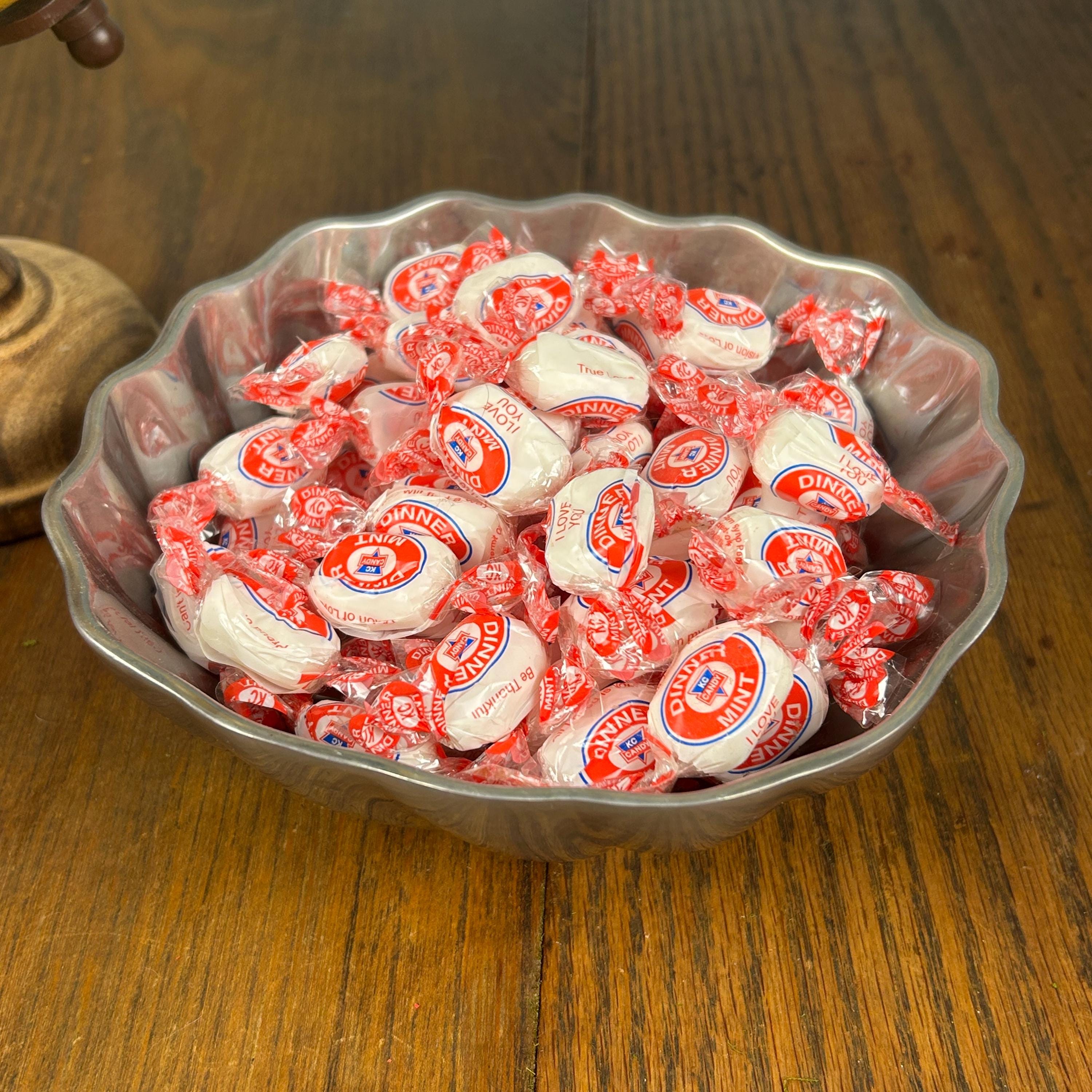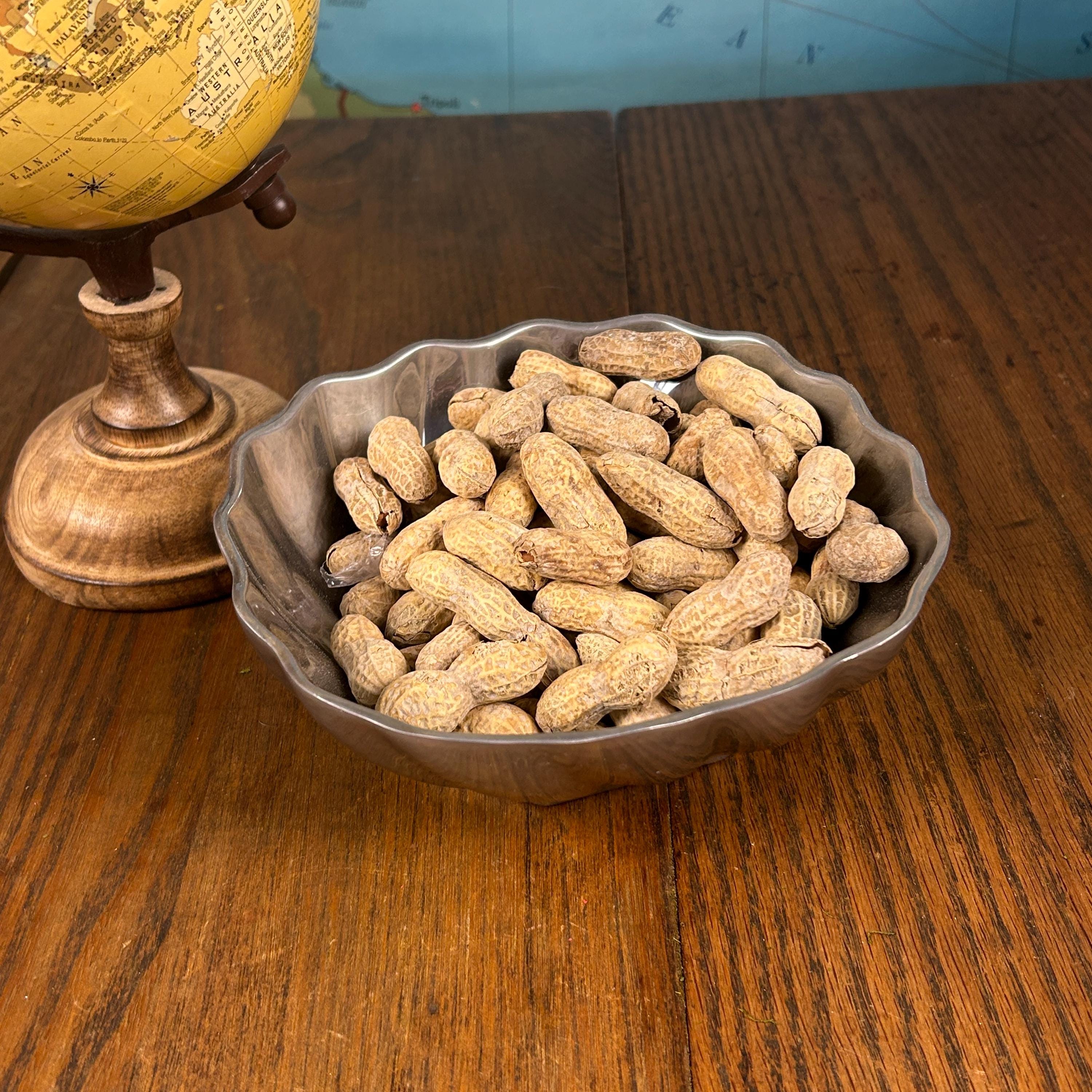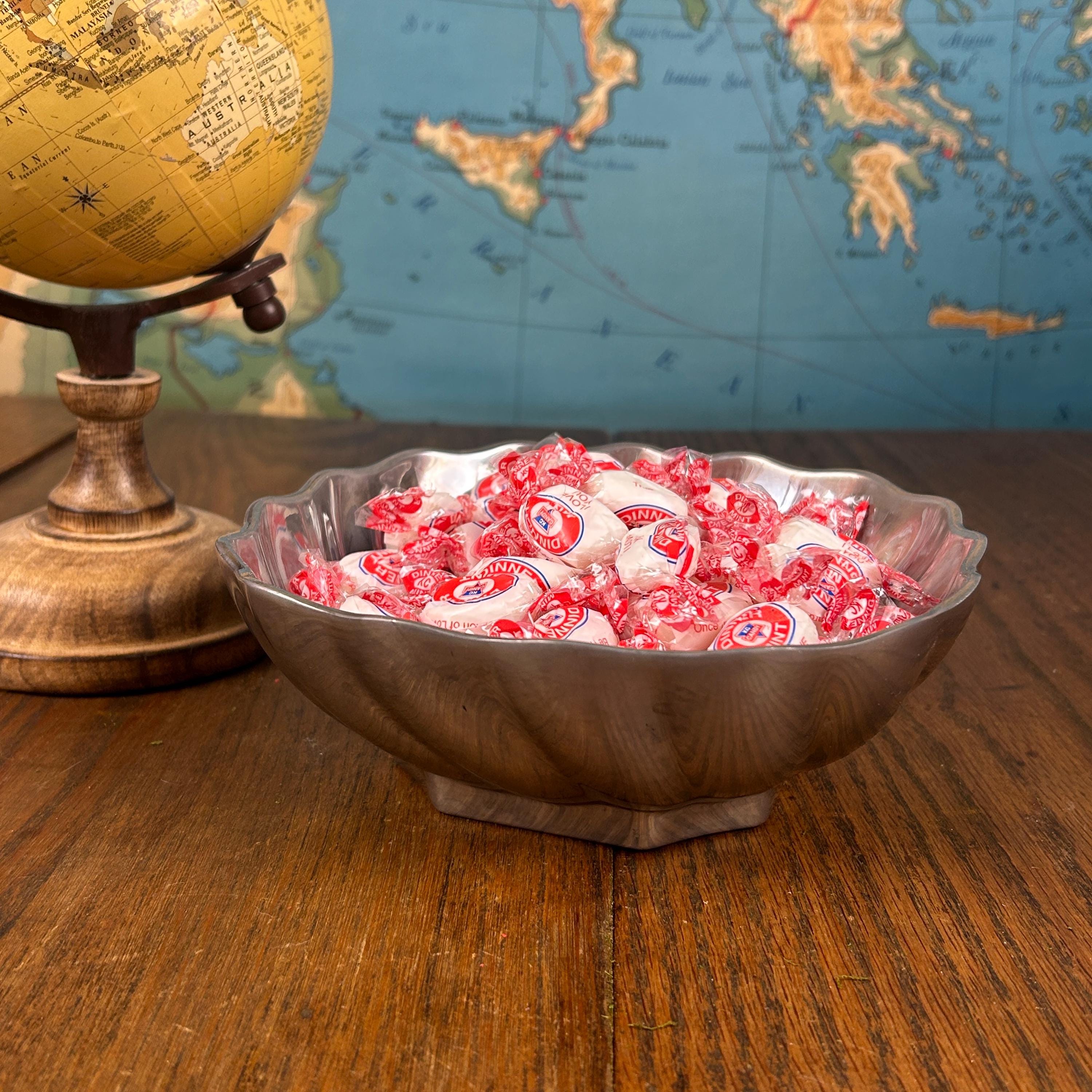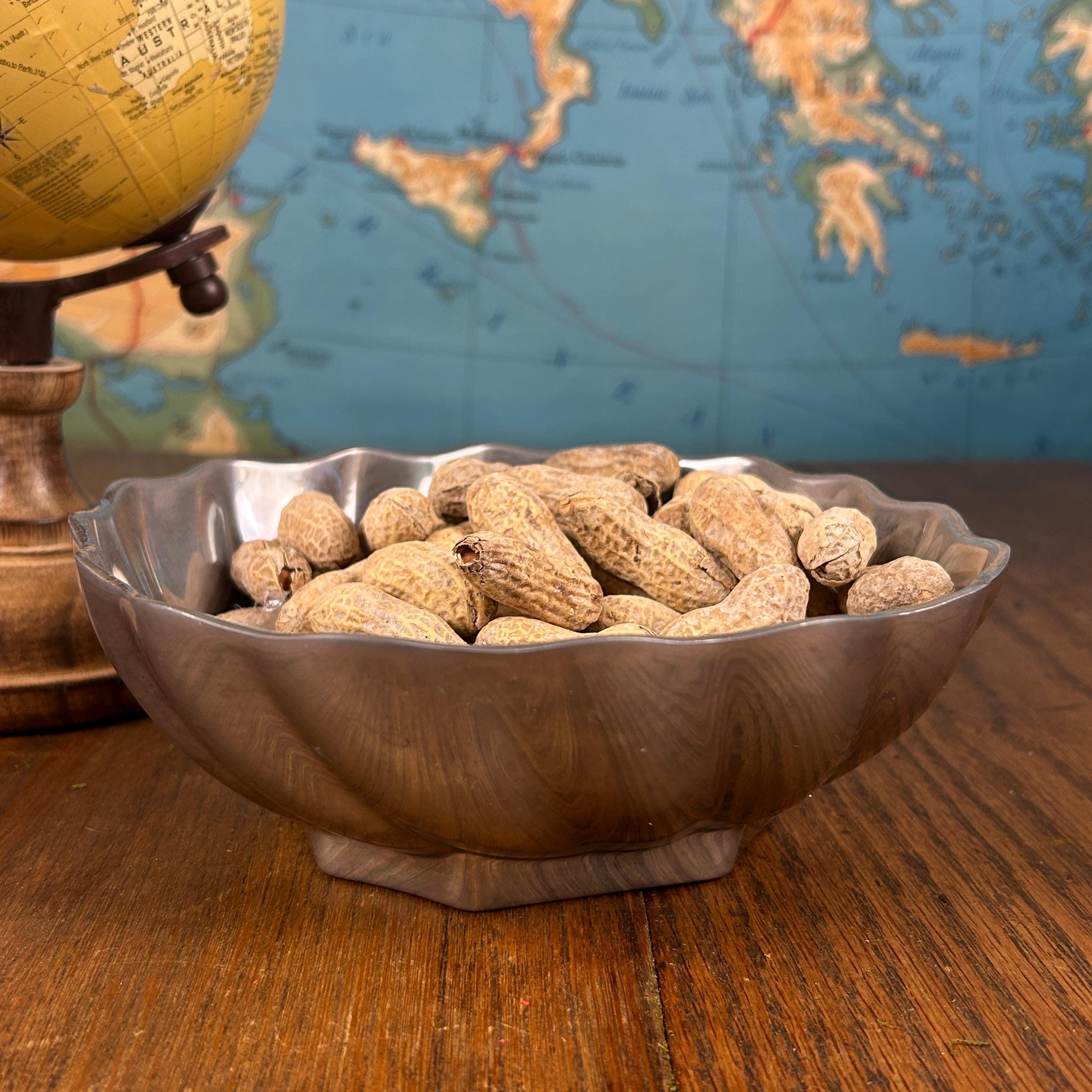 This is a Wilton Armetale Eddy Serving Bowl. It has a distinctive swirled or fluted design, a scalloped edge, and a square base. Made from a food-safe, recycled aluminum-based alloy. RWP pewter refers to metalware produced by The Wilton Company, a company based in Columbia, PA, and stamped with the "RWP" mark. While it resembles pewter, it is actually a food-safe, aluminum-based alloy called Armetale that is durable and heat-resistant. It is designed to be used from oven to table. Will not rust, break, crack, or chip under normal use. Hand washing with mild soap and hot water is recommended.