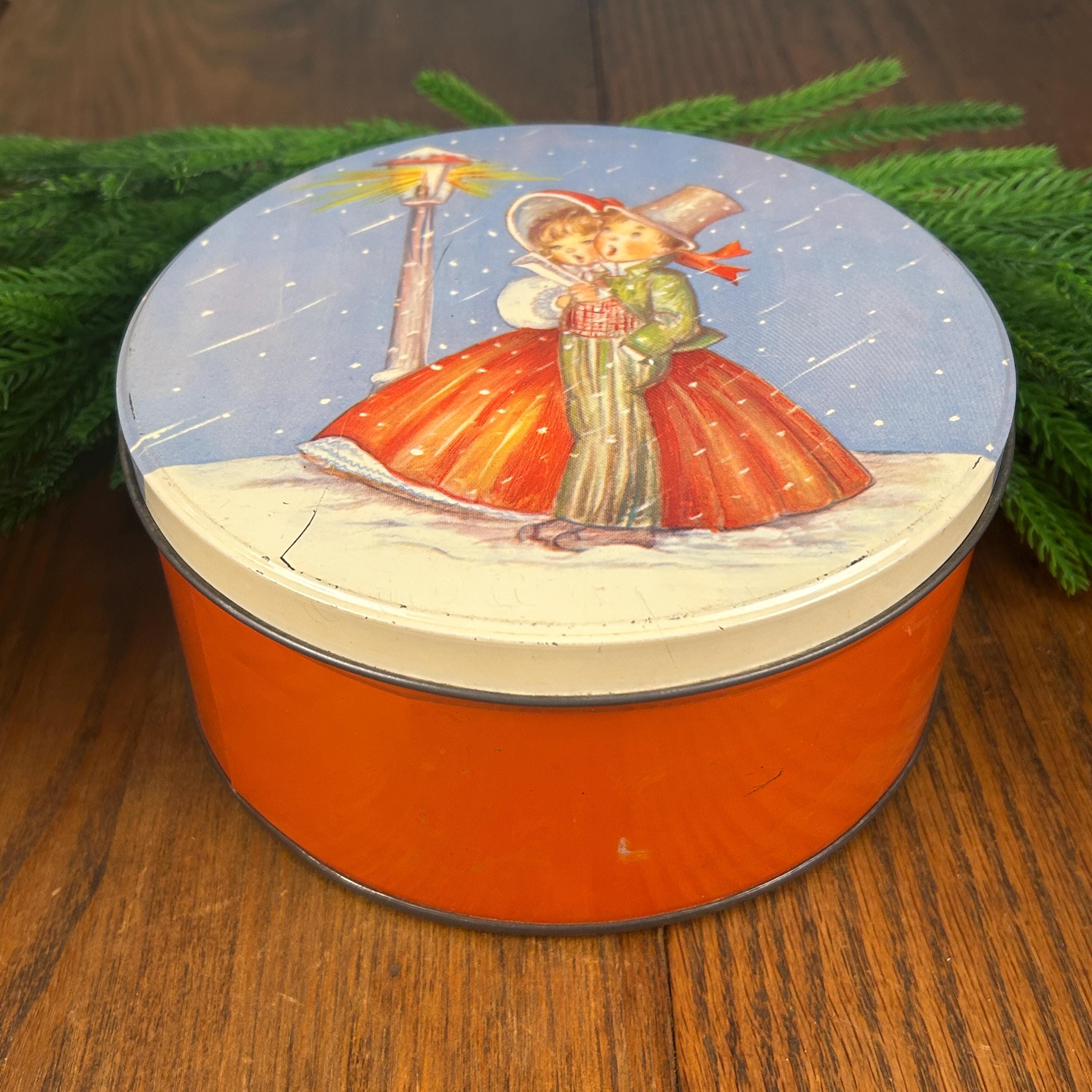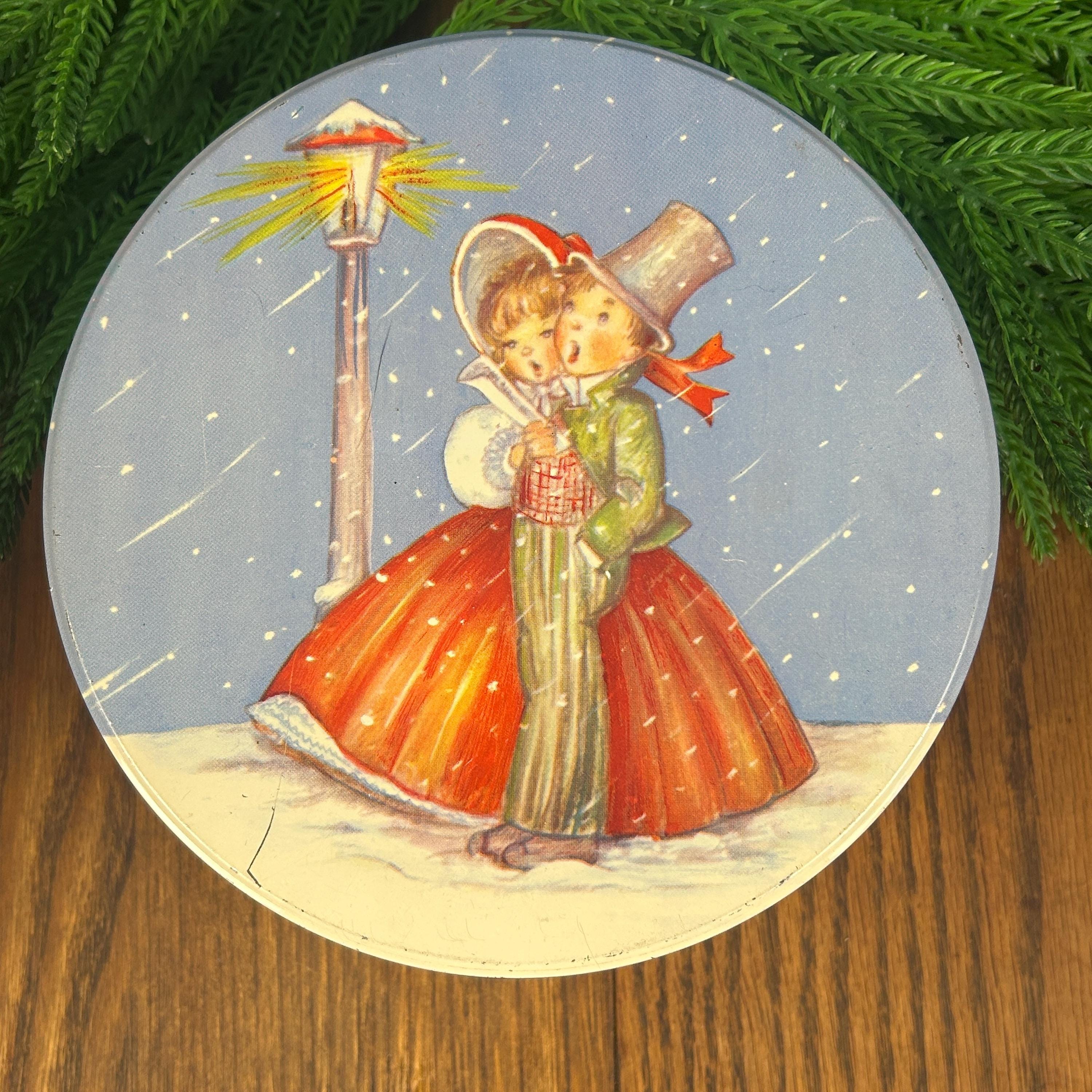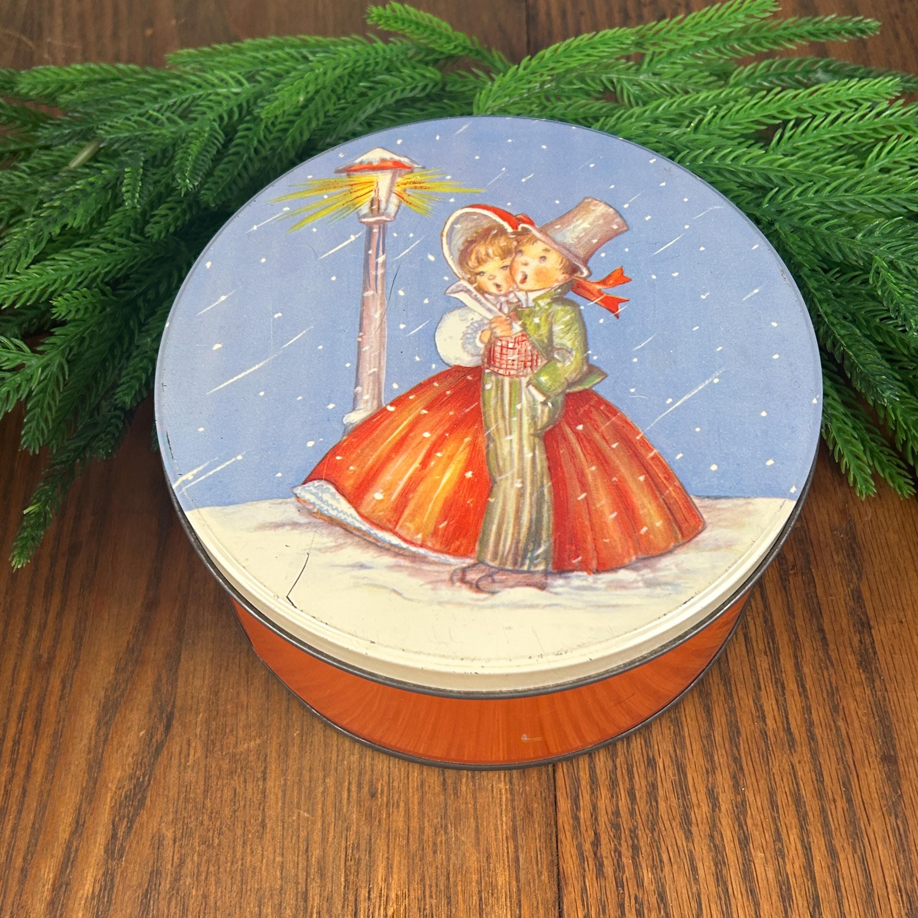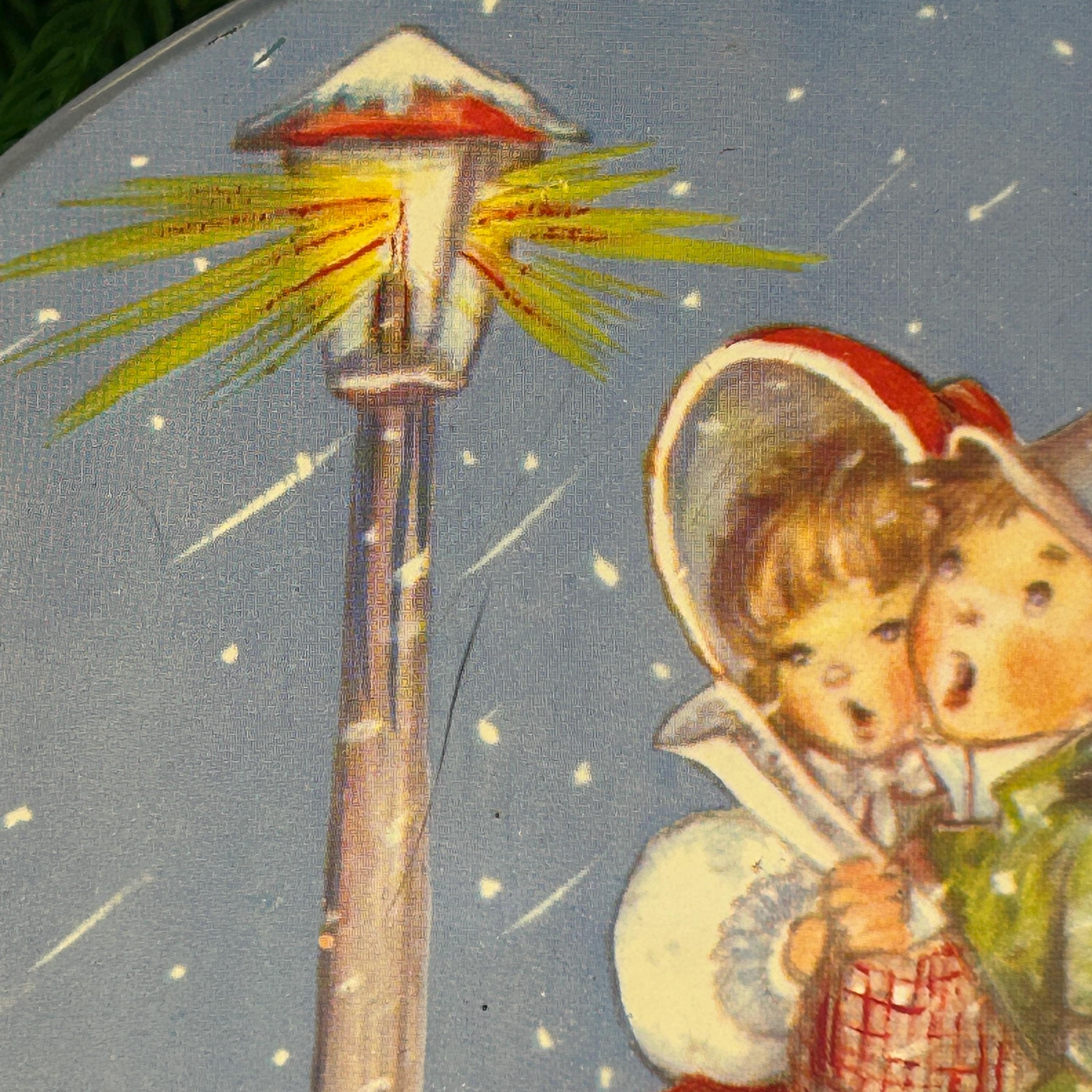This is a vintage Christmas collectible tin featuring an illustration of two children caroling by a lamppost in the snow. The tin has a round shape with a lid.
